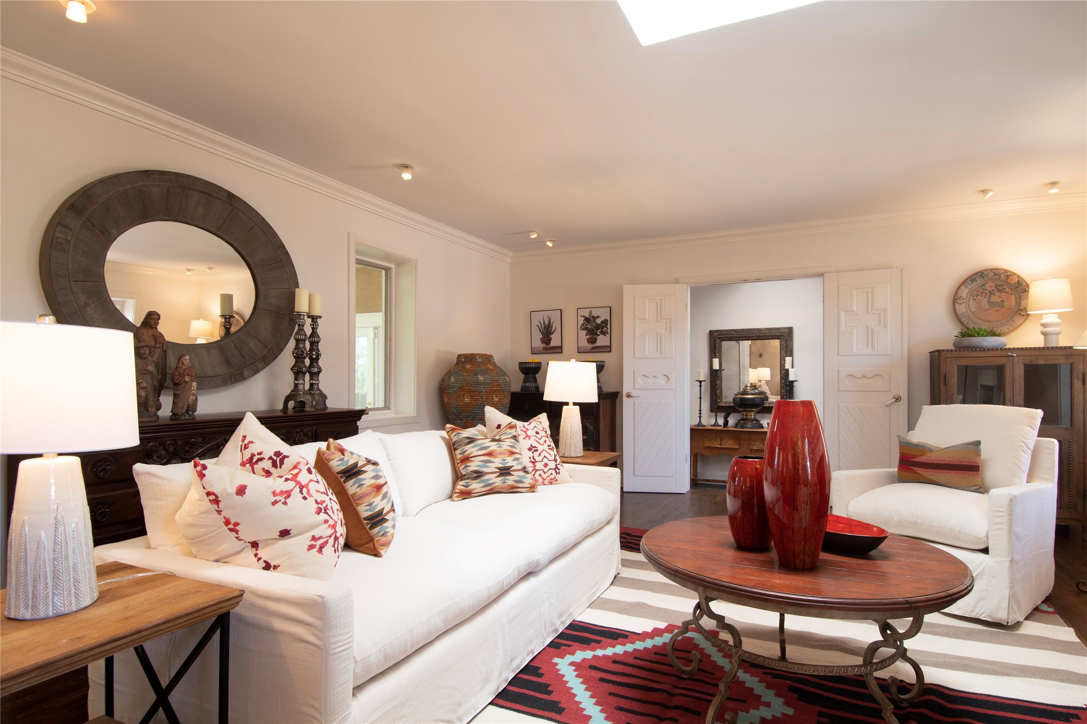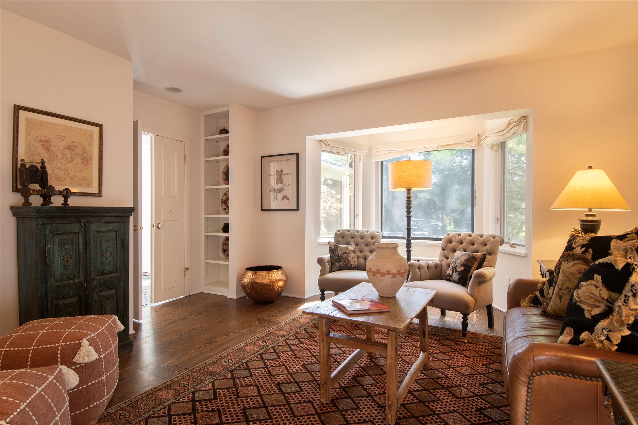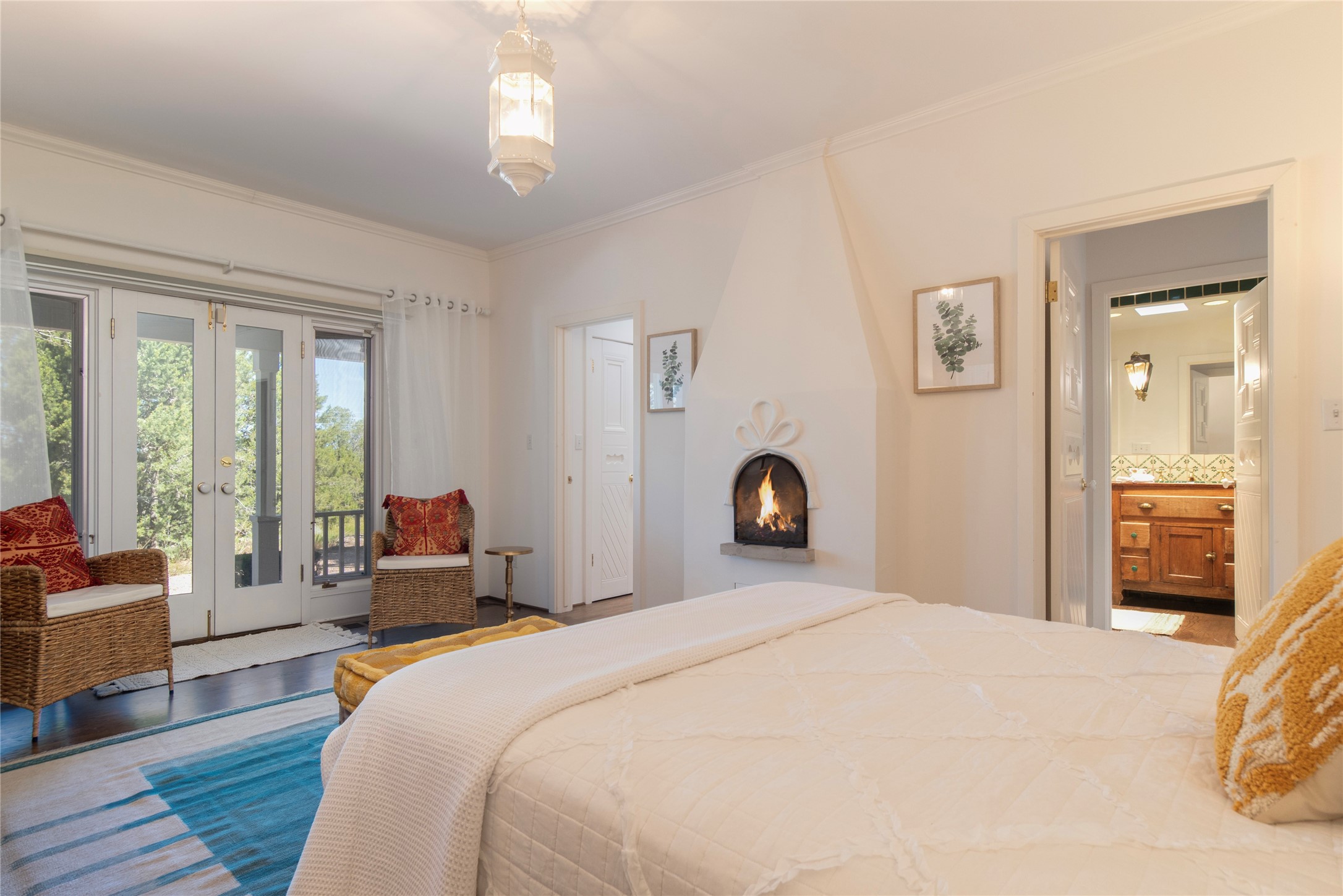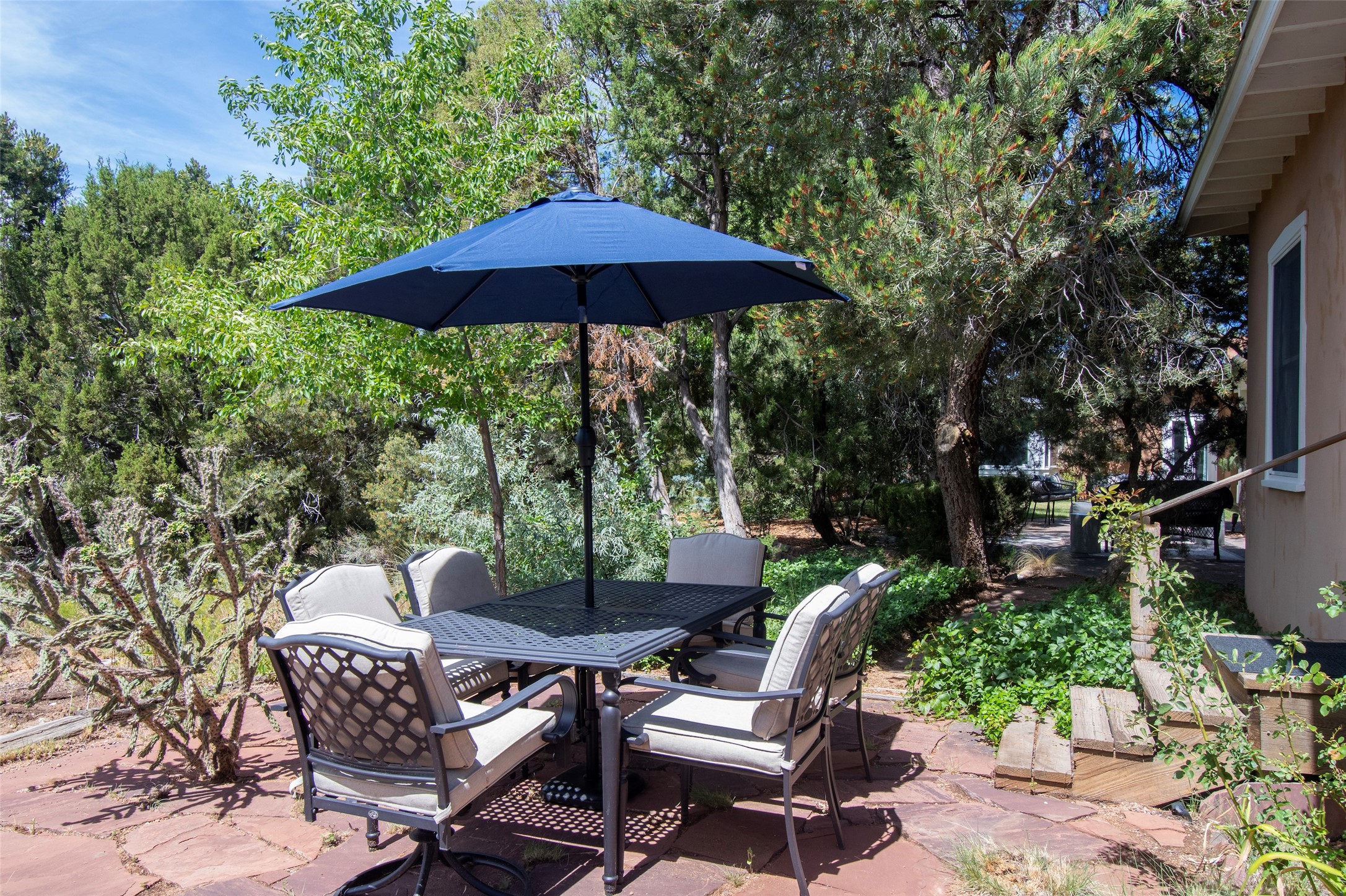 Nestled among mature trees, this classic New Mexico Territorial-style home rests on 2.788 acres of beautiful land with stellar views of Sangre de Cristo, Sandia and Ortiz Mountains. In the 3,600 sq. ft. main house a long, lovely, bricked entry hallway connects many of the rooms. Here there are 3 bedrooms, 4 bathrooms, separate office, living room, formal dining room, and a good-sized eat-in kitchen. The quiet, primary bedroom suite has a media room, full walk-in closet and private portal. There are 6 fireplaces, including one on a wide portal off the living room, so nearly every room is warm and inviting on cold winter nights. There are several portals to enjoy the views and the great Northern New Mexico weather. The guest house (753 sq. ft.) is a one bedroom, one bath home with a living/dining room, separate kitchen, and private patio. A covered brick walkway leads from the two houses to a 2-car garage. Nearby, a 1,059 sq. ft. detached garage/studio stands alone just waiting to make your dreams come true as a studio, shop, or an antique car showroom. Privately located in the historic Eastside of Santa Fe this home is just minutes from hiking trails, Museum Hill, Canyon Road and the Downtown Plaza.