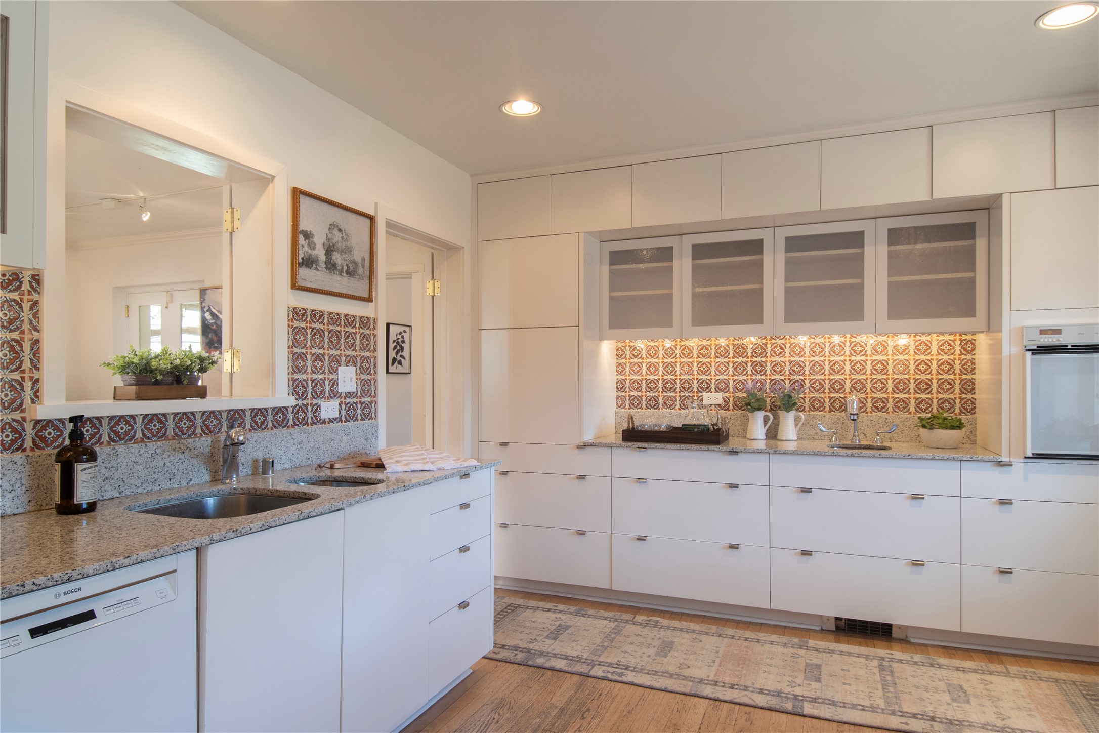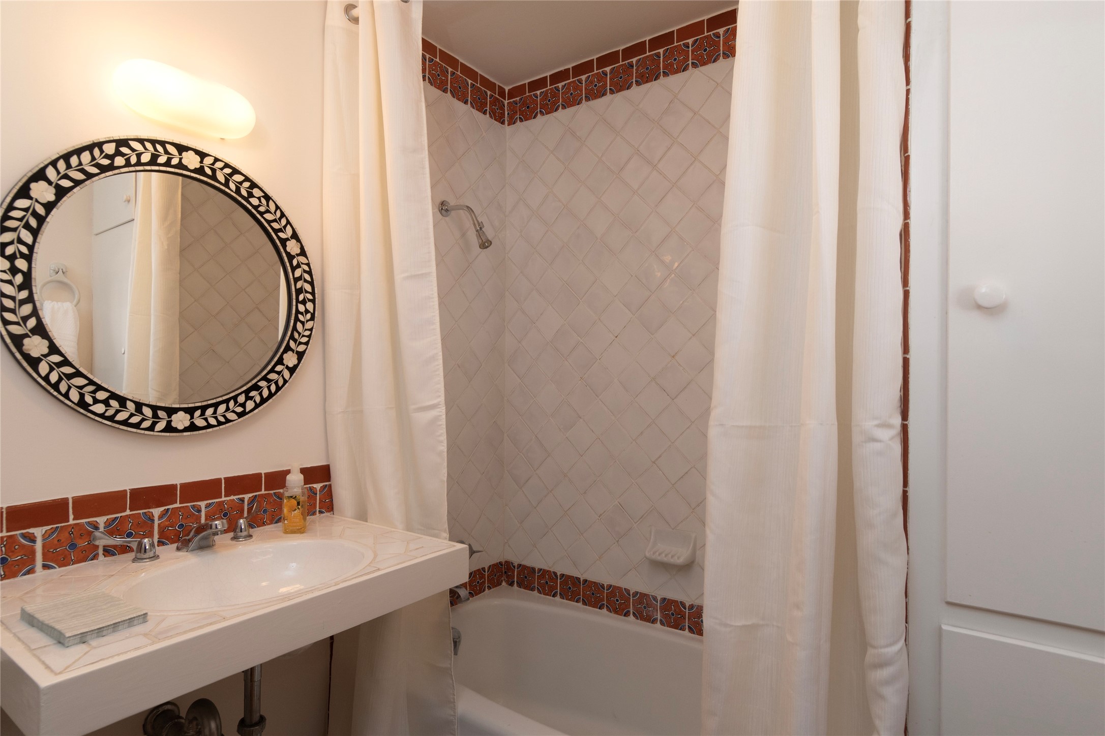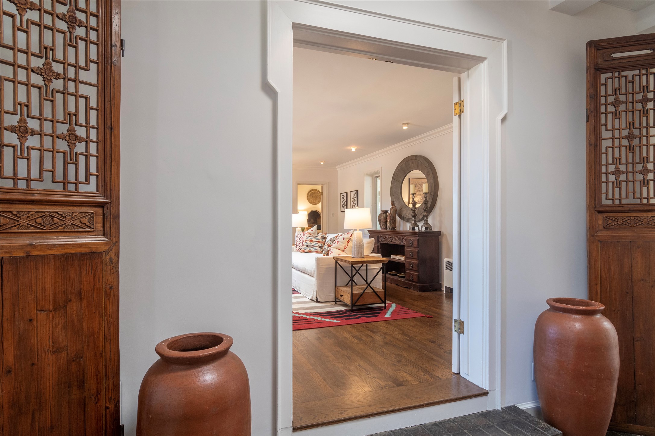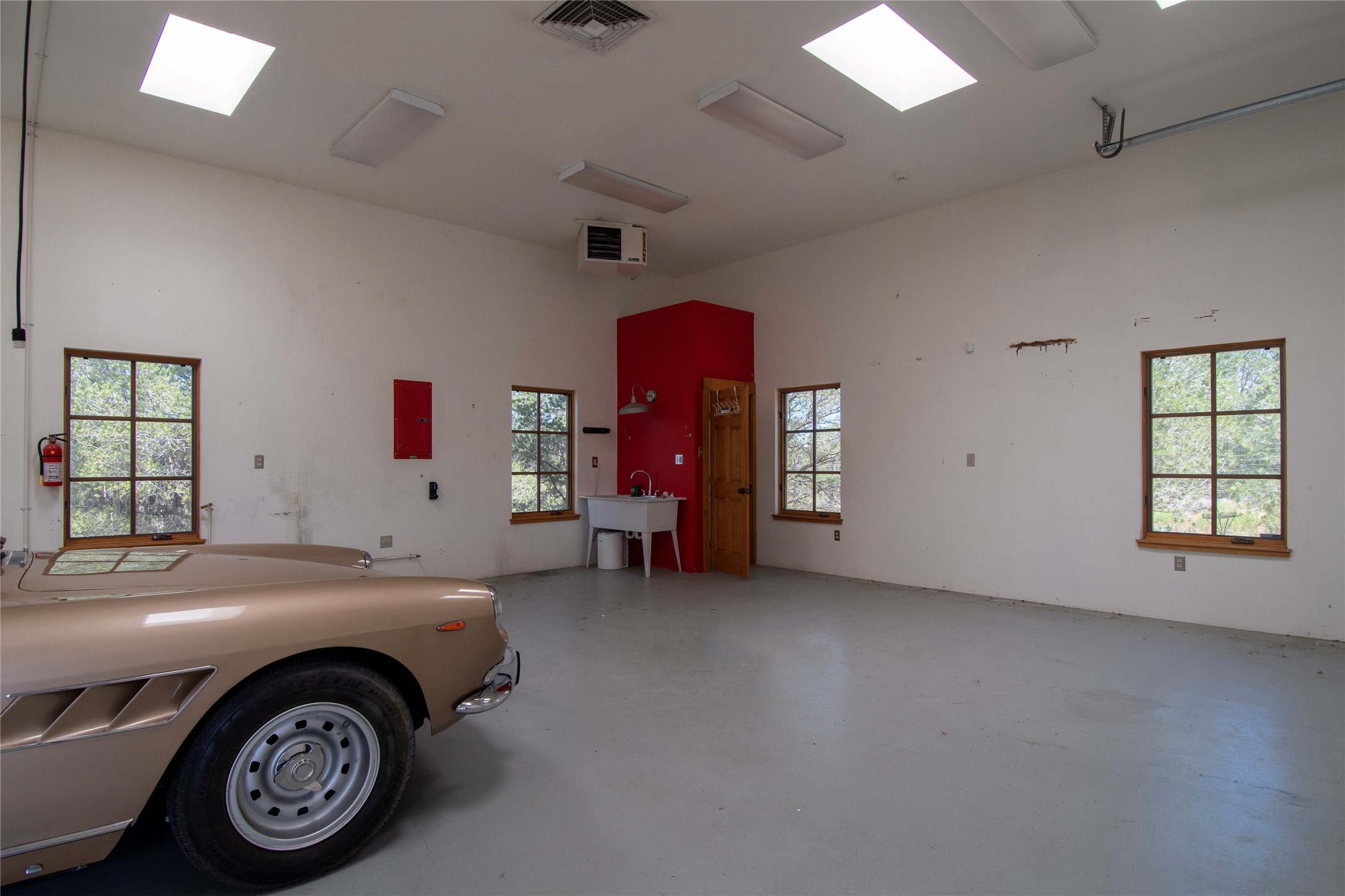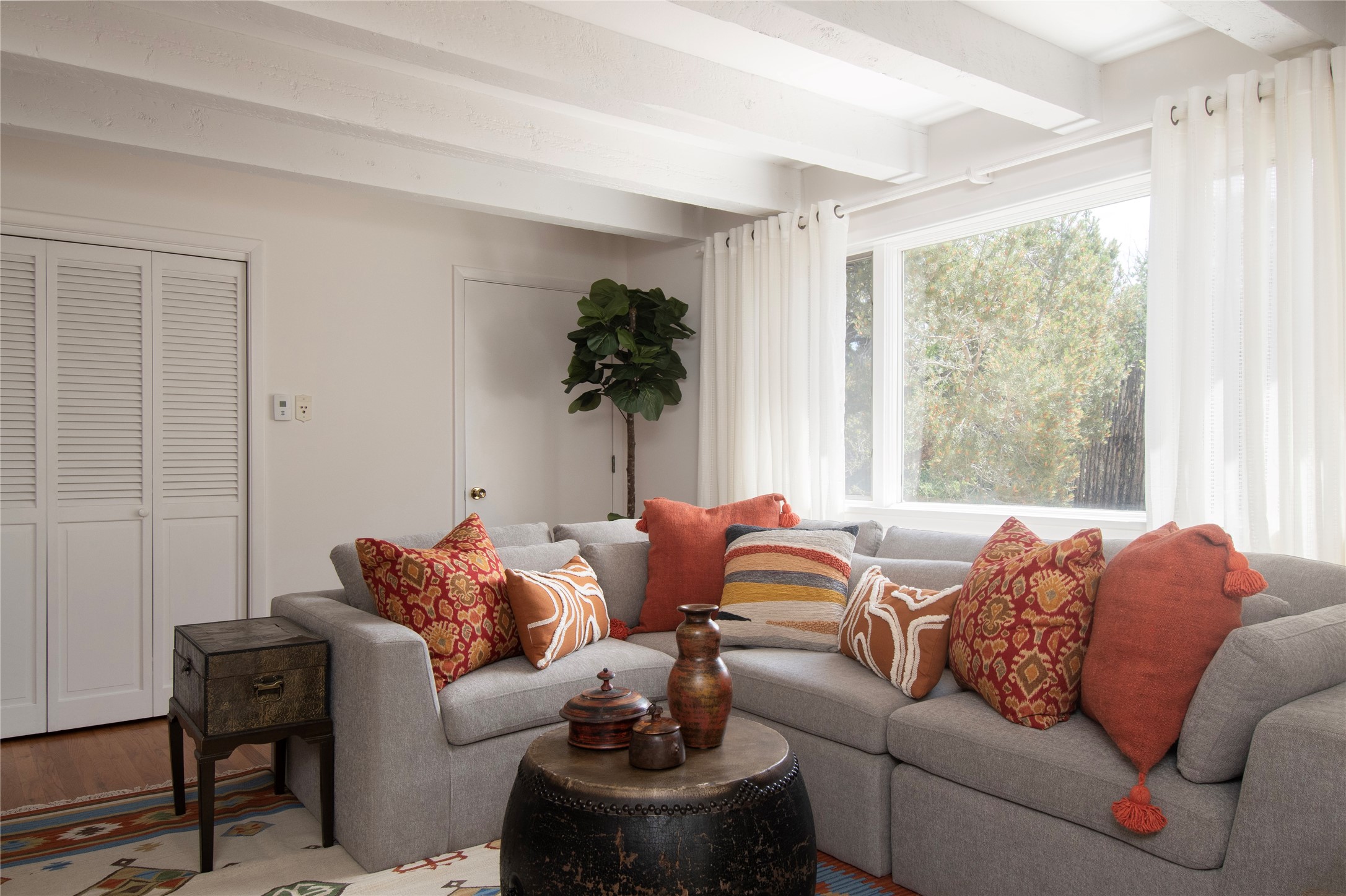 Nestled among mature trees, this classic New Mexico Territorial-style home rests on 2.788 acres of beautiful land with stellar views of Sangre de Cristo, Sandia and Ortiz Mountains. In the 3,600 sq. ft. main house a long, lovely, bricked entry hallway connects many of the rooms. Here there are 3 bedrooms, 4 bathrooms, separate office, living room, formal dining room, and a good-sized eat-in kitchen. The quiet, primary bedroom suite has a media room, full walk-in closet and private portal. There are 6 fireplaces, including one on a wide portal off the living room, so nearly every room is warm and inviting on cold winter nights. There are several portals to enjoy the views and the great Northern New Mexico weather. The guest house (753 sq. ft.) is a one bedroom, one bath home with a living/dining room, separate kitchen, and private patio. A covered brick walkway leads from the two houses to a 2-car garage. Nearby, a 1,059 sq. ft. detached garage/studio stands alone just waiting to make your dreams come true as a studio, shop, or an antique car showroom. Privately located in the historic Eastside of Santa Fe this home is just minutes from hiking trails, Museum Hill, Canyon Road and the Downtown Plaza.