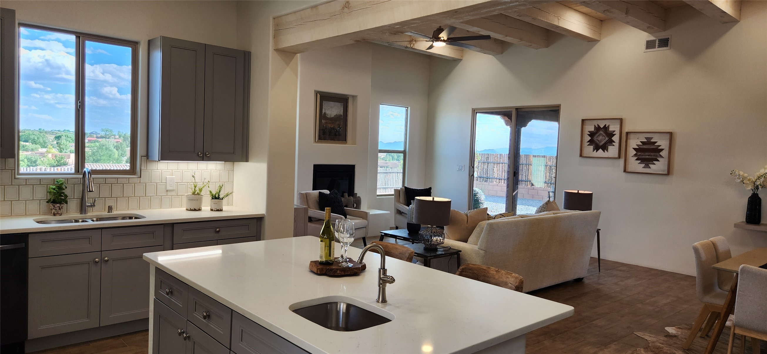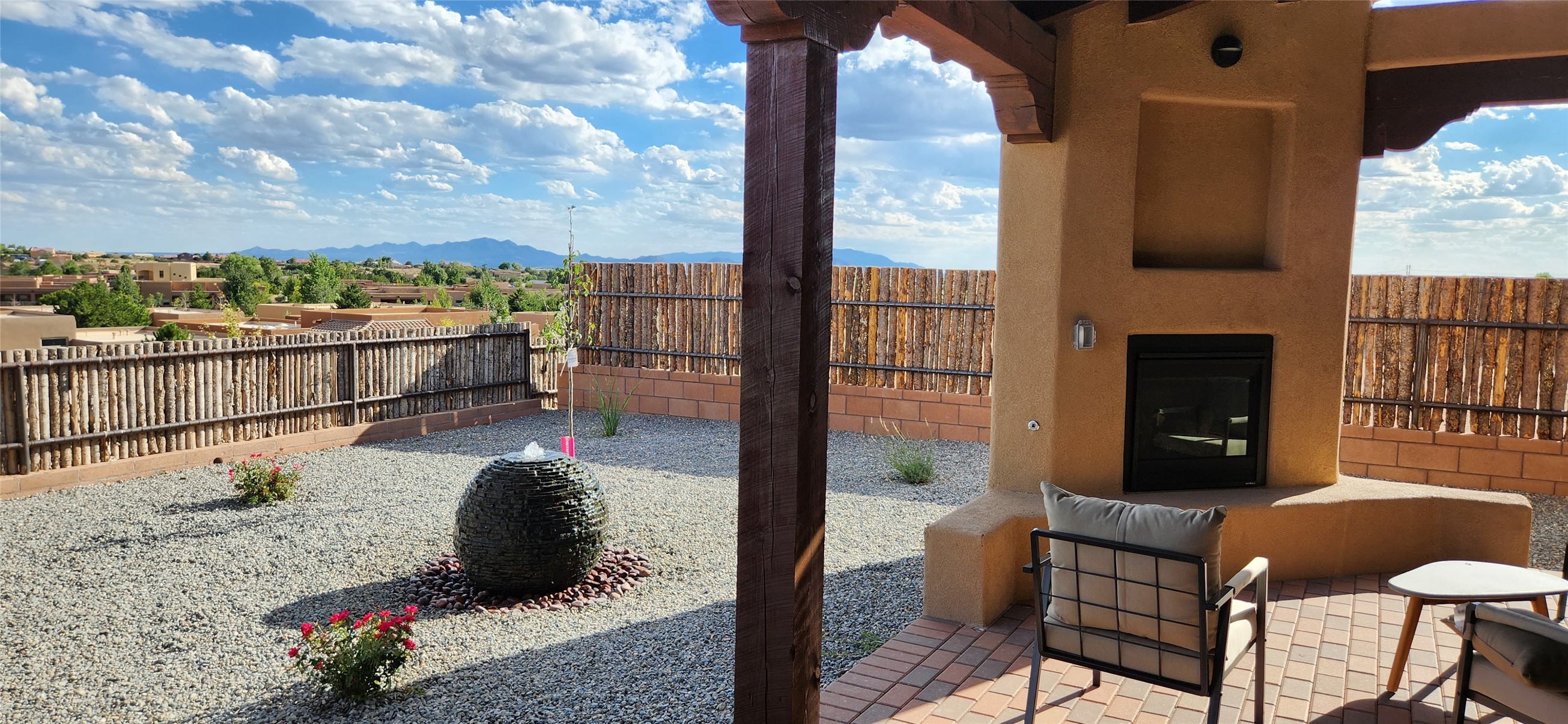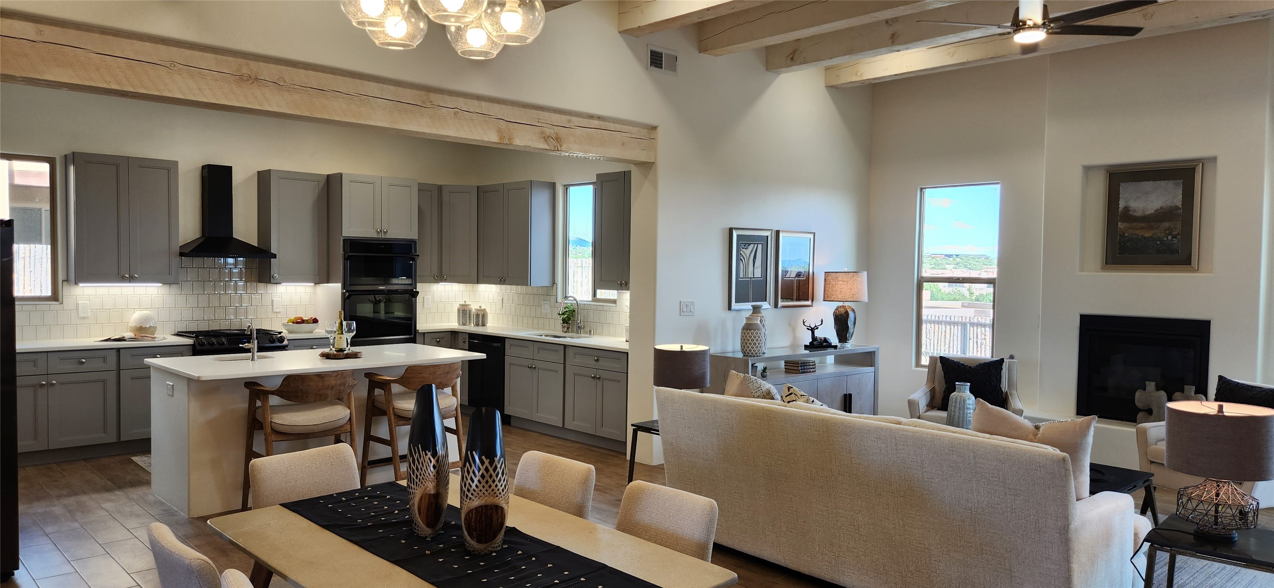 Just Completed!With a spectacular 180-degree view to the south, This San Antonio Plan contains 2260 sq. ft., 3 bedrooms and 2 1/2 baths. Located at 34 La Pradera in the La Pradera Subdivision, the exterior is a pitched roof Spanish design with clay-like tile roofs and covered portals with heavy wood beams and brick pavers. The 3-car driveway is a colored stamped-concrete design. The home is entered through an 8 ft. high door to light, wood-like porcelain floor tiles, with a powder room to the left and a hallway to the right with a nicho-accented wall leading to the two (2) guest bedrooms. The foyer leads into the living/dining room which has a 12-foot-high ceiling with white-stained wood beams and T & G trim and a gas fireplace. The living room and the owner's suite open out to a covered portal with brick pavers and a gas-fired fireplace. The open kitchen has unique blue/gray color cabinets. An exceptionally large pantry is directly off the kitchen. The utility room is then accessed from the pantry and has ample cabinets, a skylight, and a sink. The owner's bath has a large walk-in shower with euro-style shower fixtures and an overhead rain shower head. There is also an exceptionally large walk-in closet. The insulated garage includes a storage room and an epoxy-coated floor.