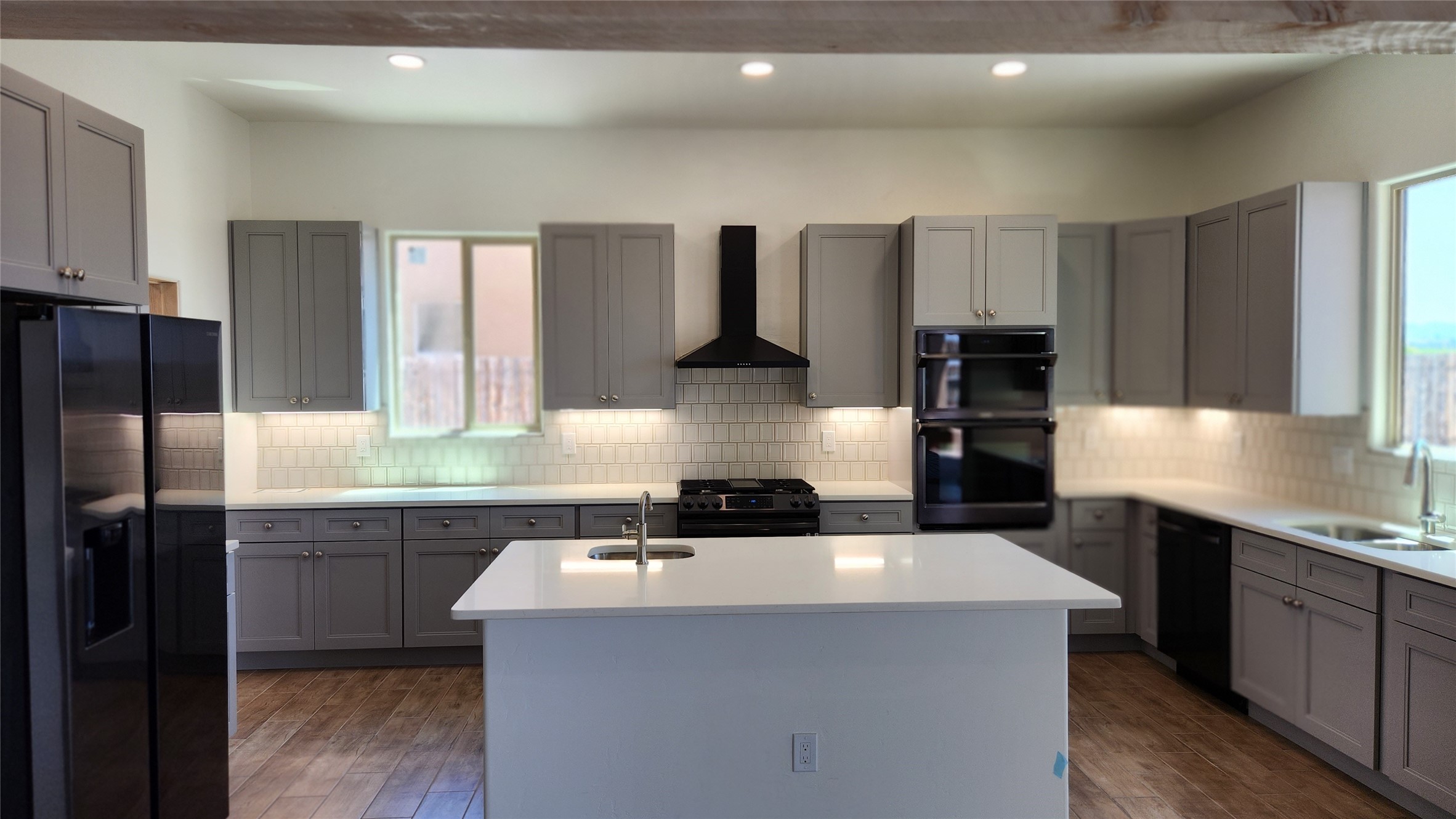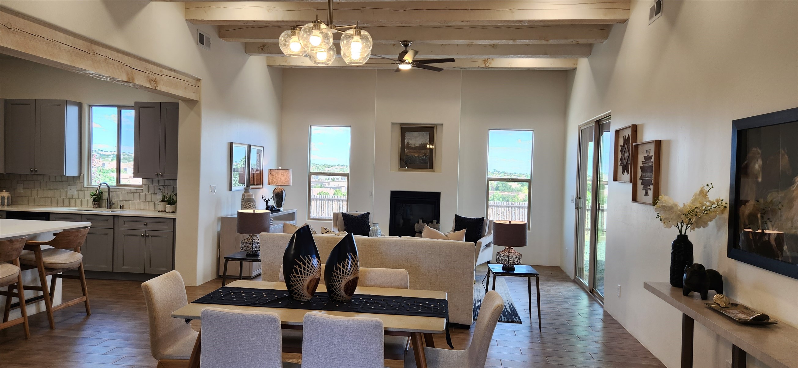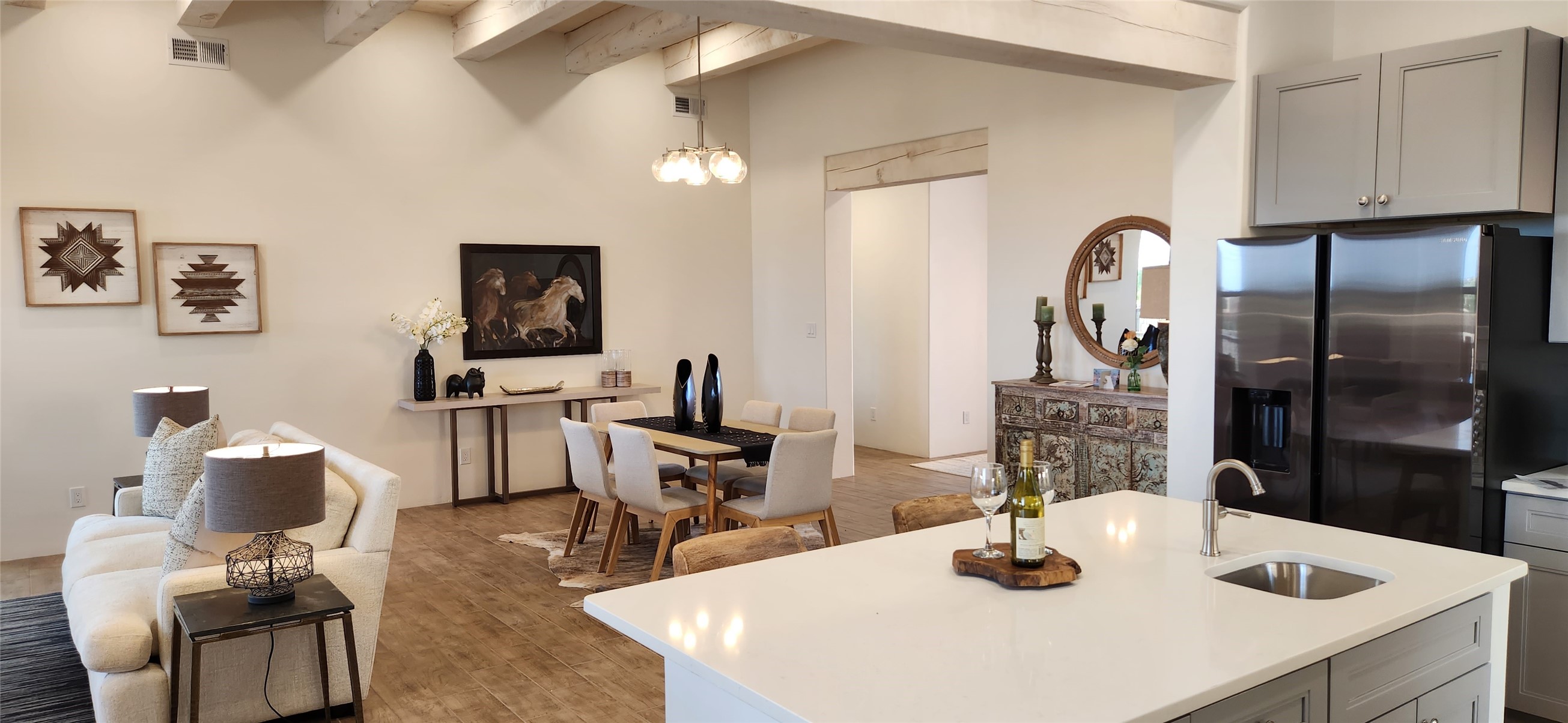 Just Completed!With a spectacular 180-degree view to the south, This San Antonio Plan contains 2260 sq. ft., 3 bedrooms and 2 1/2 baths. Located at 34 La Pradera in the La Pradera Subdivision, the exterior is a pitched roof Spanish design with clay-like tile roofs and covered portals with heavy wood beams and brick pavers. The 3-car driveway is a colored stamped-concrete design. The home is entered through an 8 ft. high door to light, wood-like porcelain floor tiles, with a powder room to the left and a hallway to the right with a nicho-accented wall leading to the two (2) guest bedrooms. The foyer leads into the living/dining room which has a 12-foot-high ceiling with white-stained wood beams and T & G trim and a gas fireplace. The living room and the owner's suite open out to a covered portal with brick pavers and a gas-fired fireplace. The open kitchen has unique blue/gray color cabinets. An exceptionally large pantry is directly off the kitchen. The utility room is then accessed from the pantry and has ample cabinets, a skylight, and a sink. The owner's bath has a large walk-in shower with euro-style shower fixtures and an overhead rain shower head. There is also an exceptionally large walk-in closet. The insulated garage includes a storage room and an epoxy-coated floor.