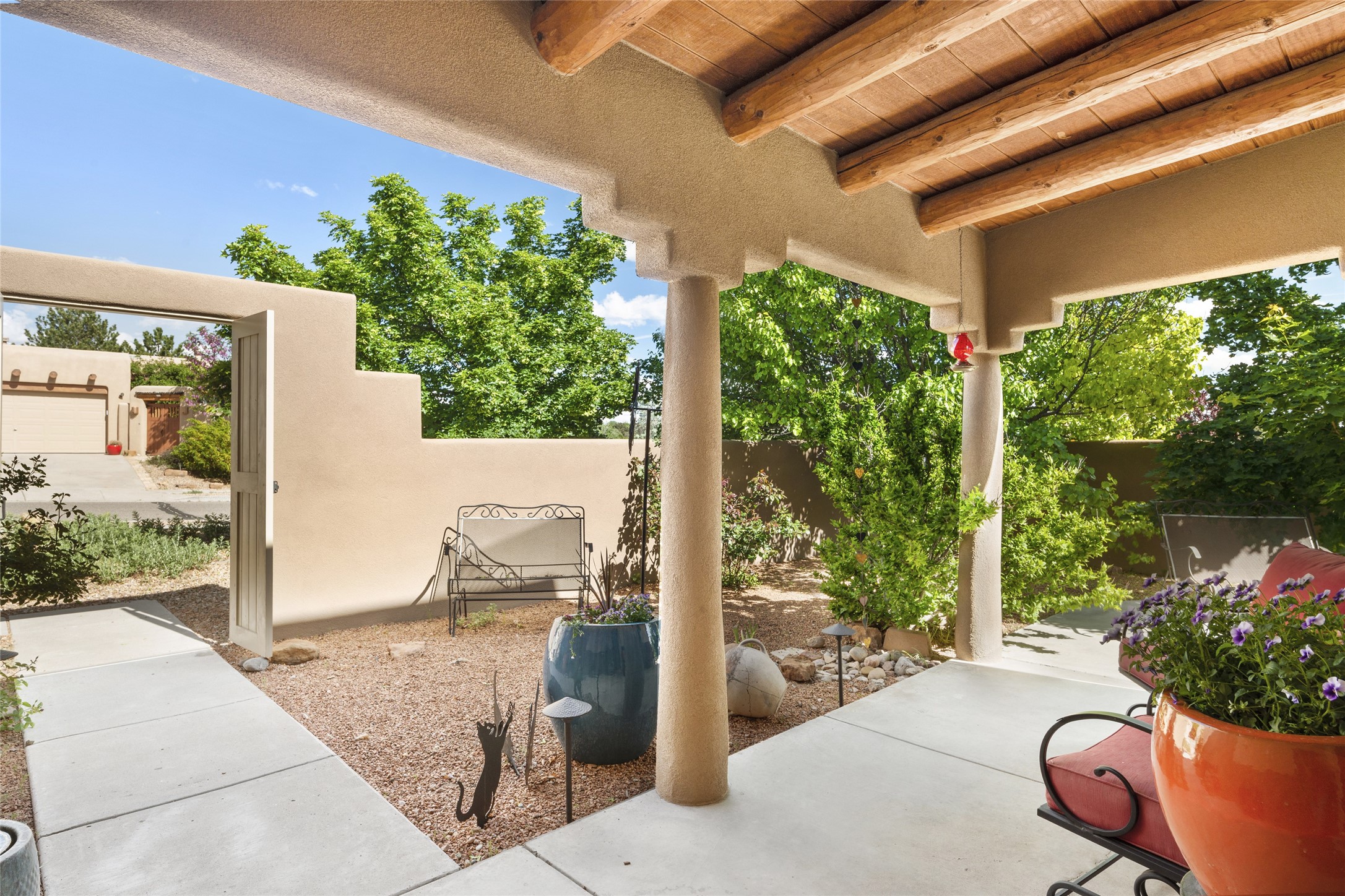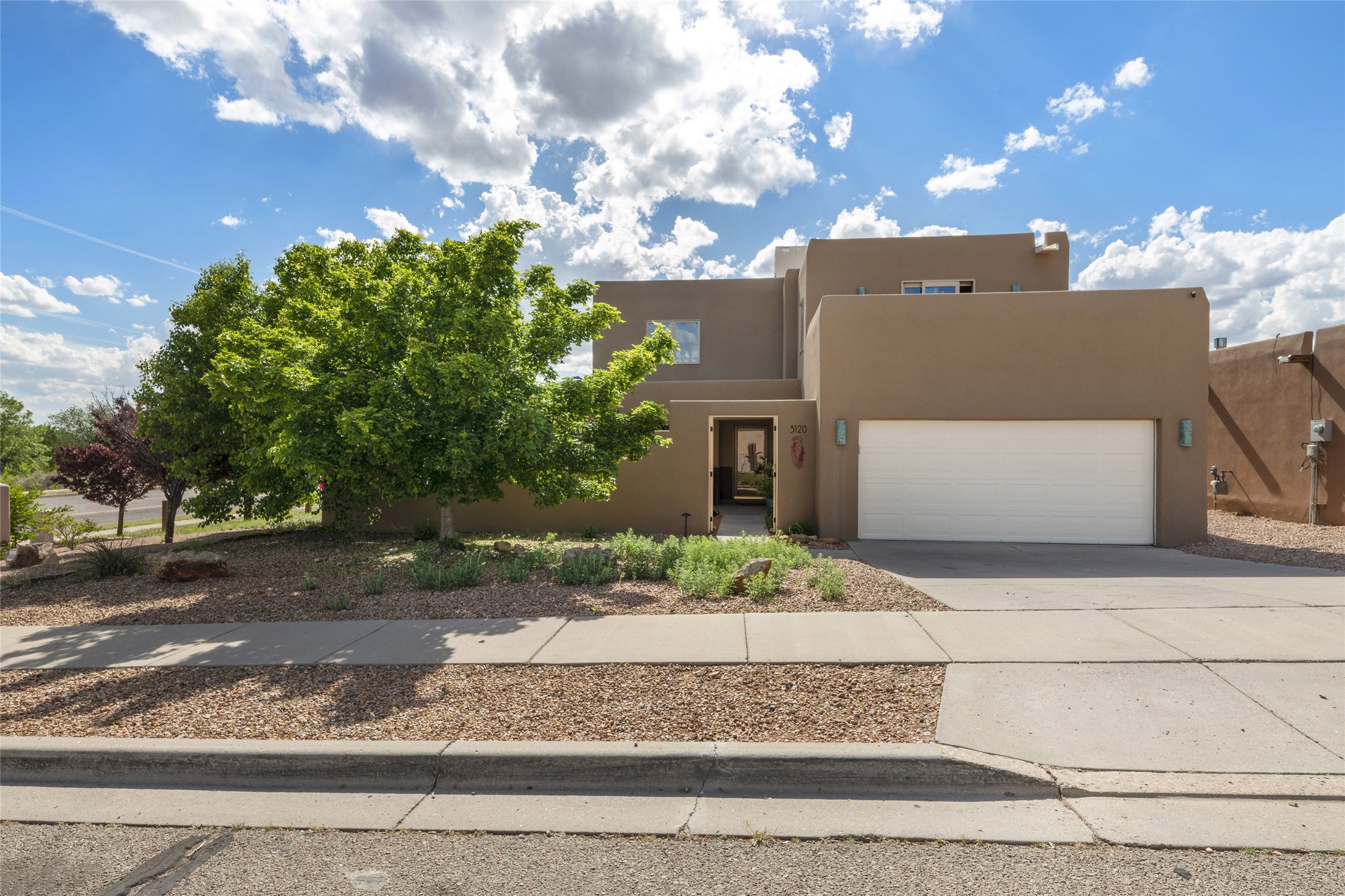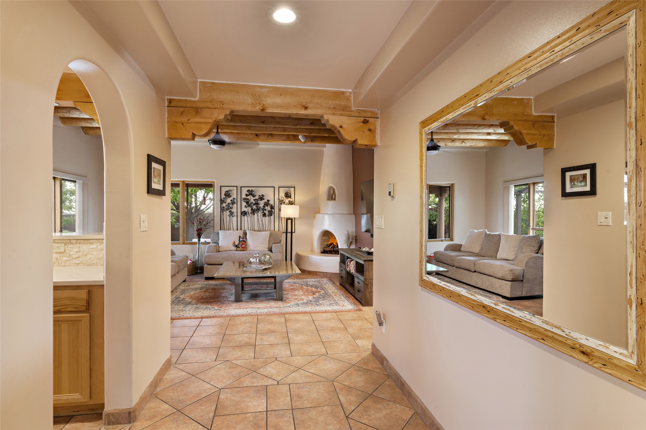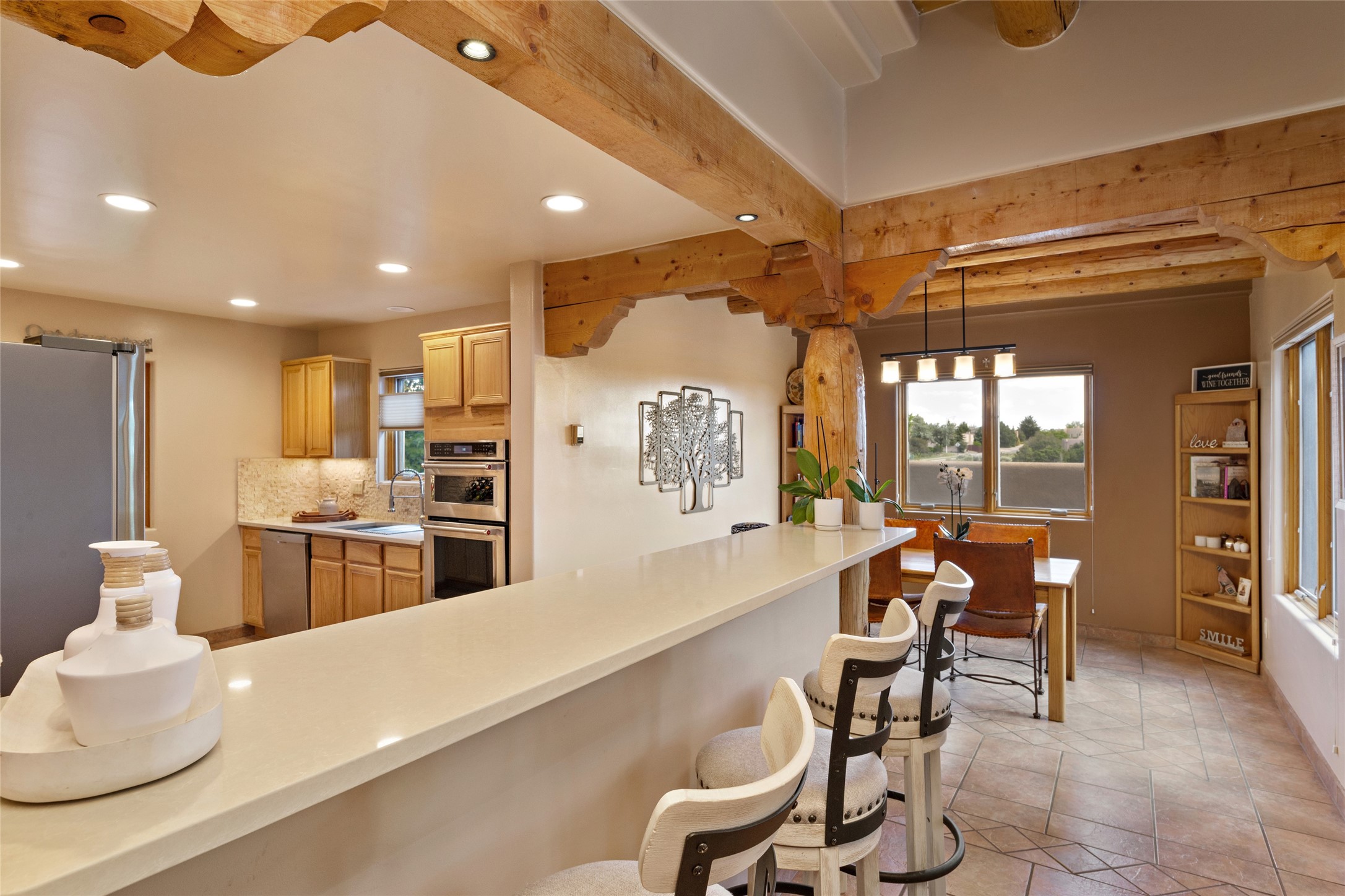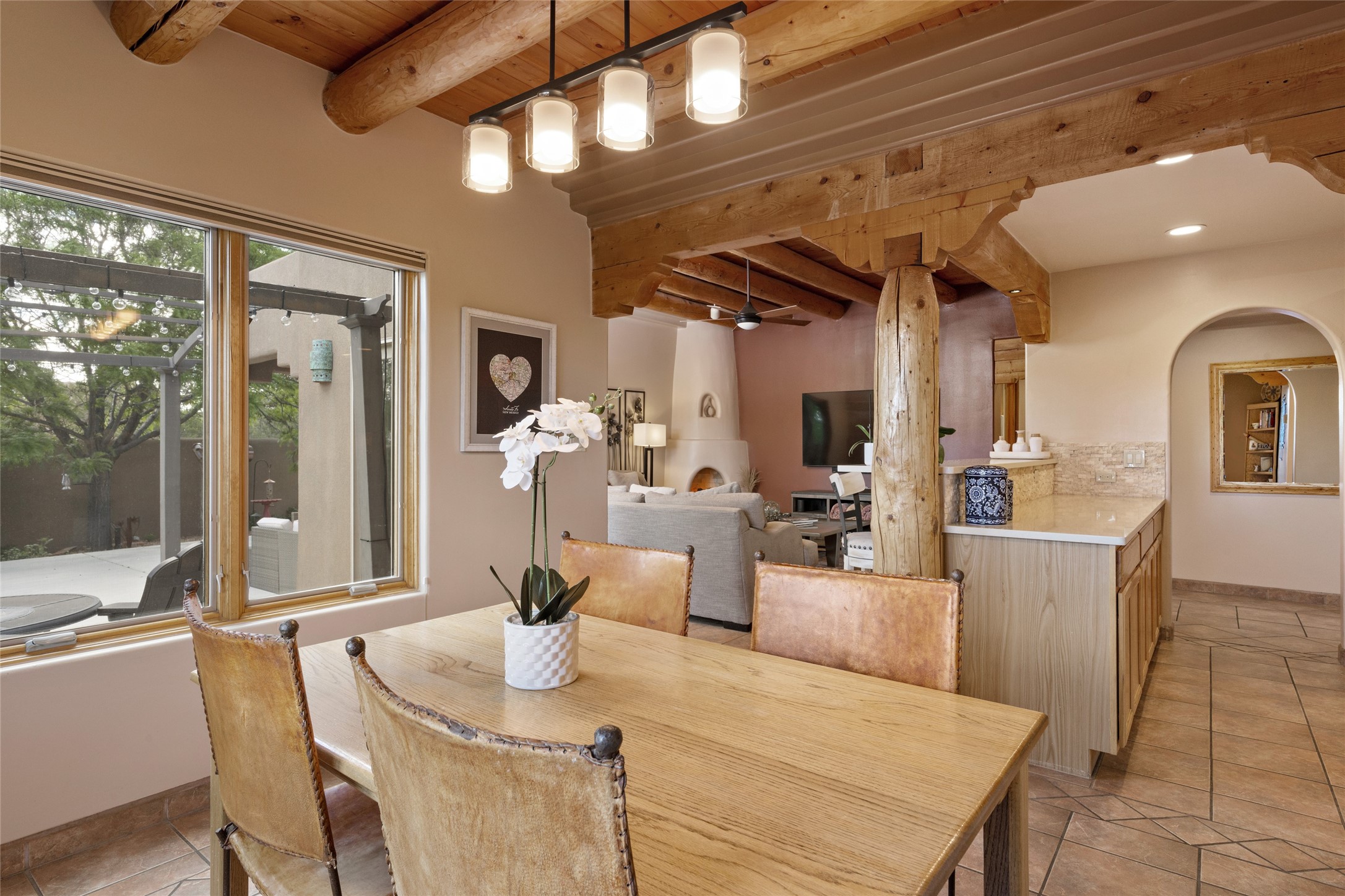 This immaculate residence, thoughtfully curated and lovingly maintained by its original owner can now be yours. Nestled in the coveted Pueblos Del Sol neighborhood, this remarkable home has been meticulously maintained. With freshly stucco, and a new roof (with a warranty) this property is like a brand new home. Immerse yourself in the authentic Santa Fe ambiance with artisan corbels, vigas, and a cozy kiva fireplace in the living space. The kitchen is a dream for culinary enthusiasts, featuring new appliances and an elegant white quartz countertop. You'll have the option of both a formal dining area and an informal breakfast bar, perfect for every dining occasion. This splendid home 3-bedroom, 3.5-bathroom residence is a masterpiece of comfort and style. Each bedroom boasts its own en-suite bathroom, offering unparalleled convenience and privacy. Radiant heating and easily maintainable tile floors ensure year-round comfort and simplicity.No detail has been spared in the meticulous updates throughout the home. The primary bathroom is a lavish sanctuary, featuring a luxurious soaking tub for moments of ultimate relaxation. Beyond the enchanting interior, this property sits on an exceptionally rare corner lot, meticulously landscaped to create outdoor living spaces designed to relish our delightful climate.Conveniently located, this home offers easy access to walking trails, restaurants, shopping, and top-notch schools. Discover the ultimate Pueblos Del Sol living experience in this unrivaled residence.