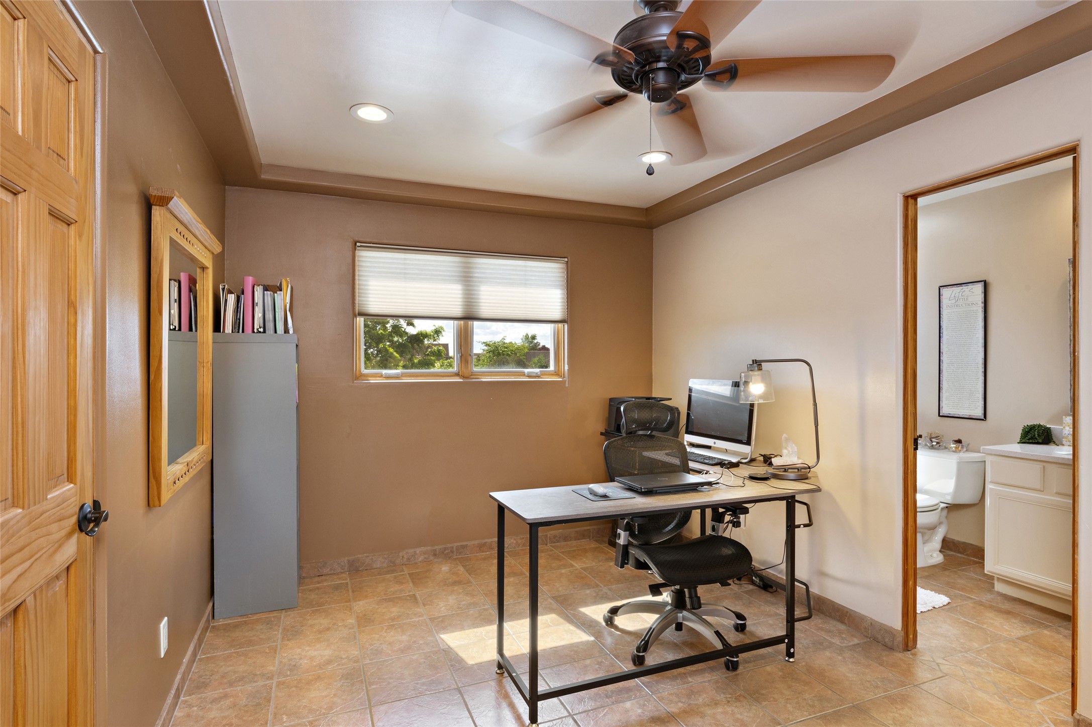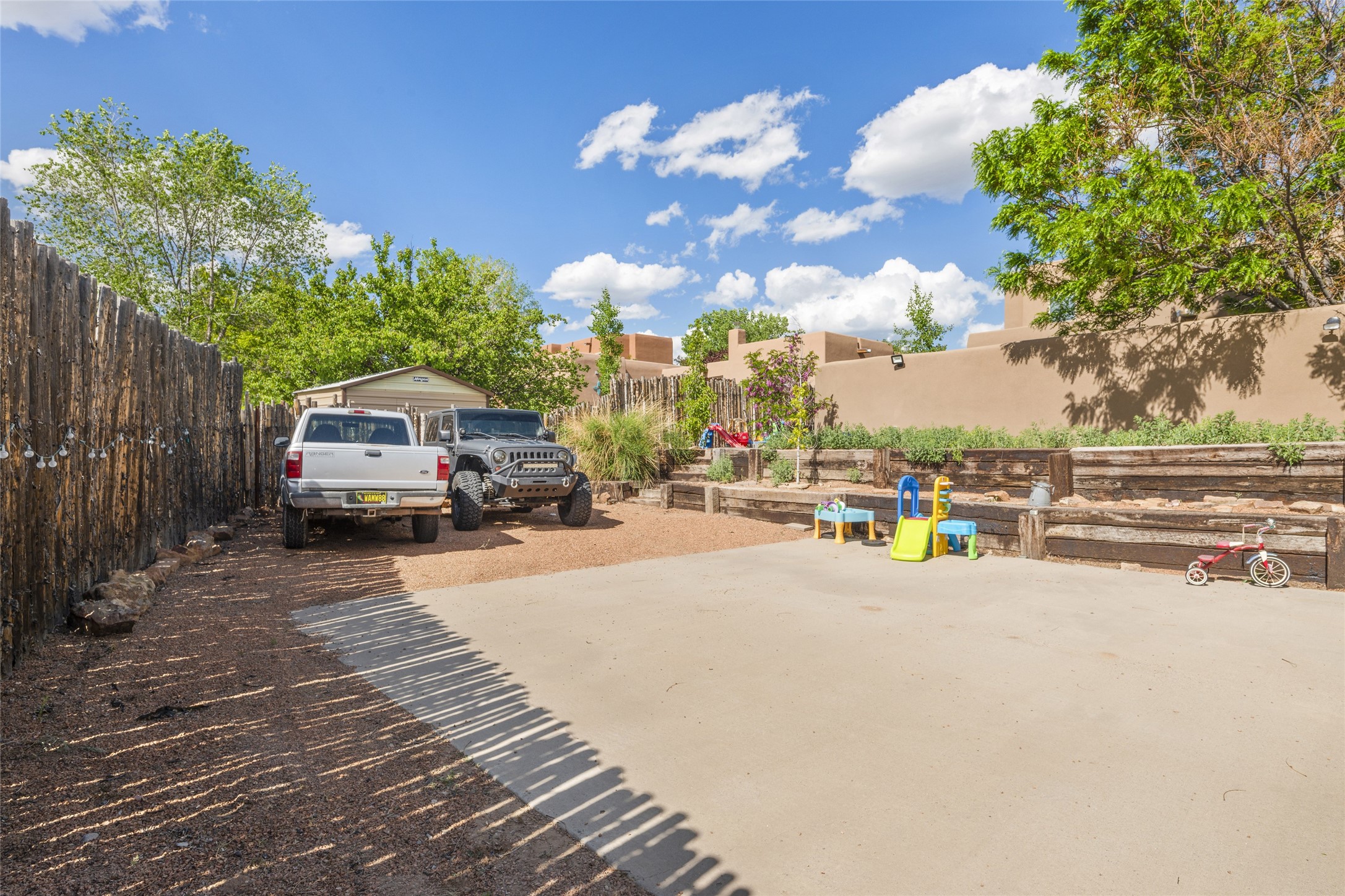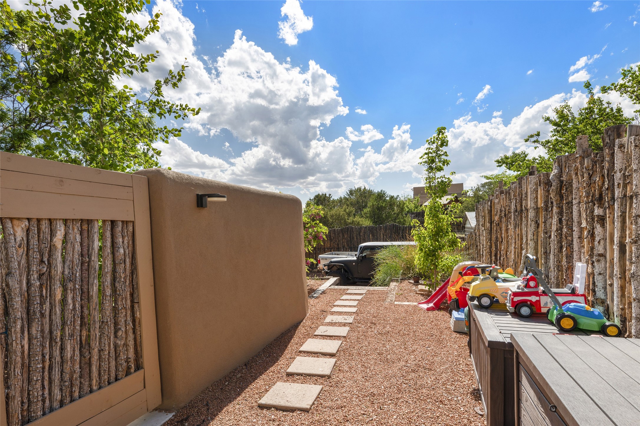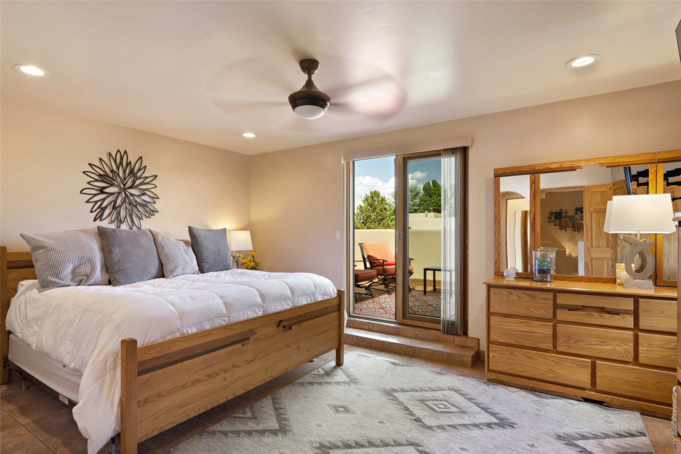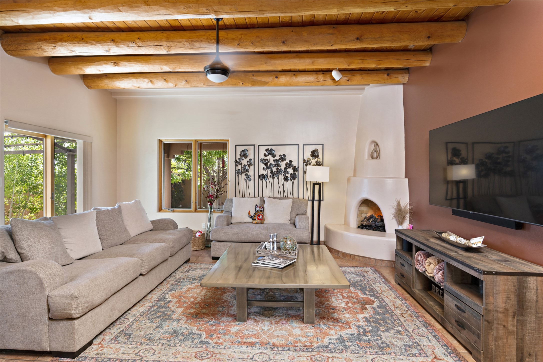 This immaculate residence, thoughtfully curated and lovingly maintained by its original owner can now be yours. Nestled in the coveted Pueblos Del Sol neighborhood, this remarkable home has been meticulously maintained. With freshly stucco, and a new roof (with a warranty) this property is like a brand new home. Immerse yourself in the authentic Santa Fe ambiance with artisan corbels, vigas, and a cozy kiva fireplace in the living space. The kitchen is a dream for culinary enthusiasts, featuring new appliances and an elegant white quartz countertop. You'll have the option of both a formal dining area and an informal breakfast bar, perfect for every dining occasion. This splendid home 3-bedroom, 3.5-bathroom residence is a masterpiece of comfort and style. Each bedroom boasts its own en-suite bathroom, offering unparalleled convenience and privacy. Radiant heating and easily maintainable tile floors ensure year-round comfort and simplicity.No detail has been spared in the meticulous updates throughout the home. The primary bathroom is a lavish sanctuary, featuring a luxurious soaking tub for moments of ultimate relaxation. Beyond the enchanting interior, this property sits on an exceptionally rare corner lot, meticulously landscaped to create outdoor living spaces designed to relish our delightful climate.Conveniently located, this home offers easy access to walking trails, restaurants, shopping, and top-notch schools. Discover the ultimate Pueblos Del Sol living experience in this unrivaled residence.