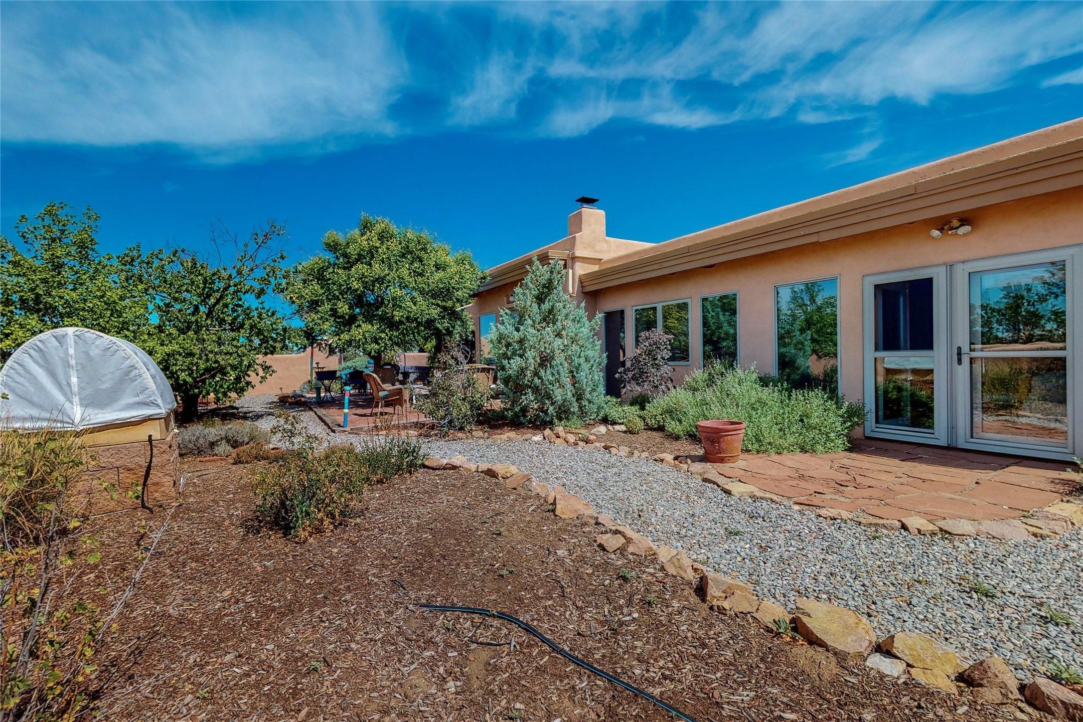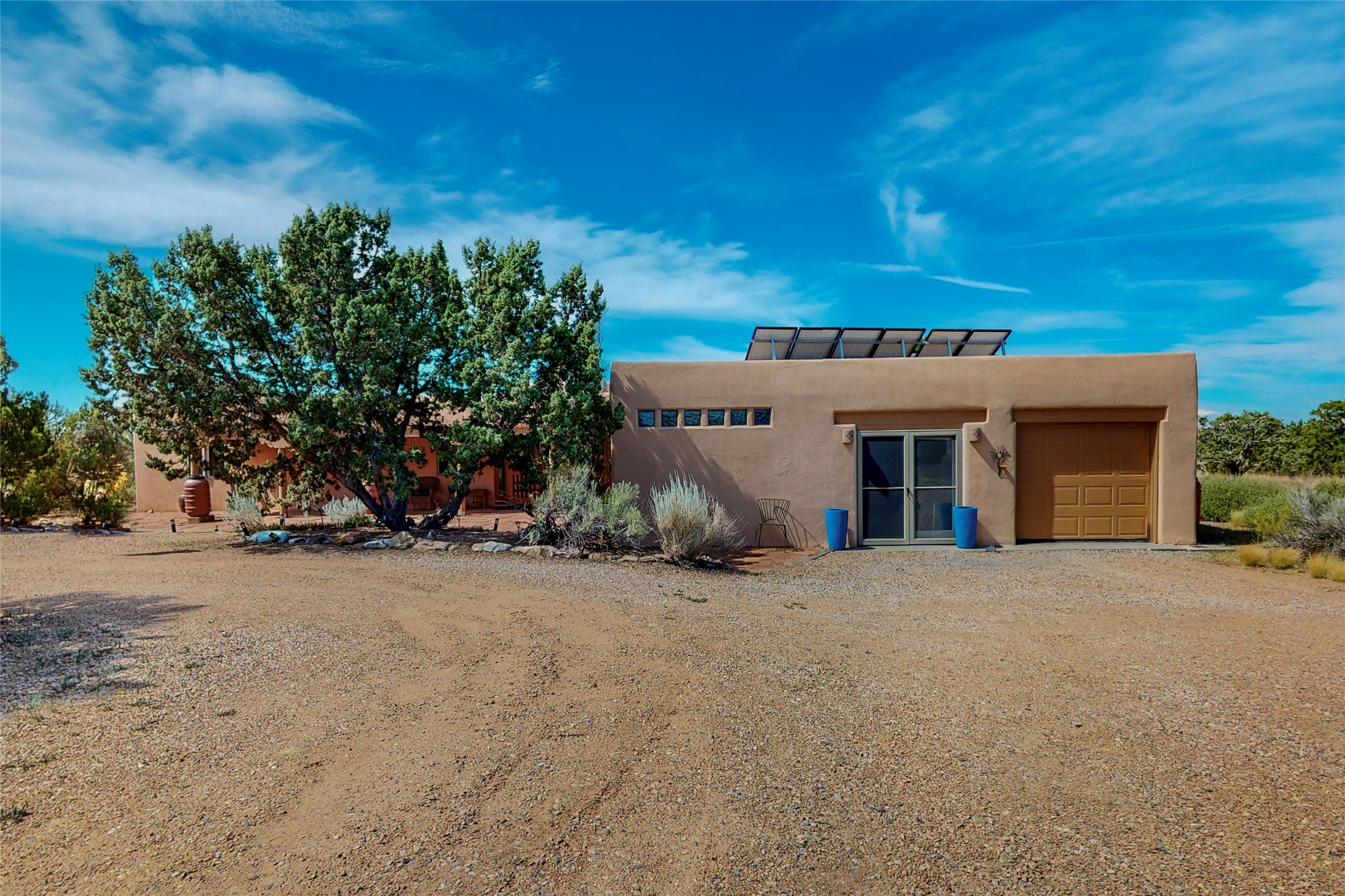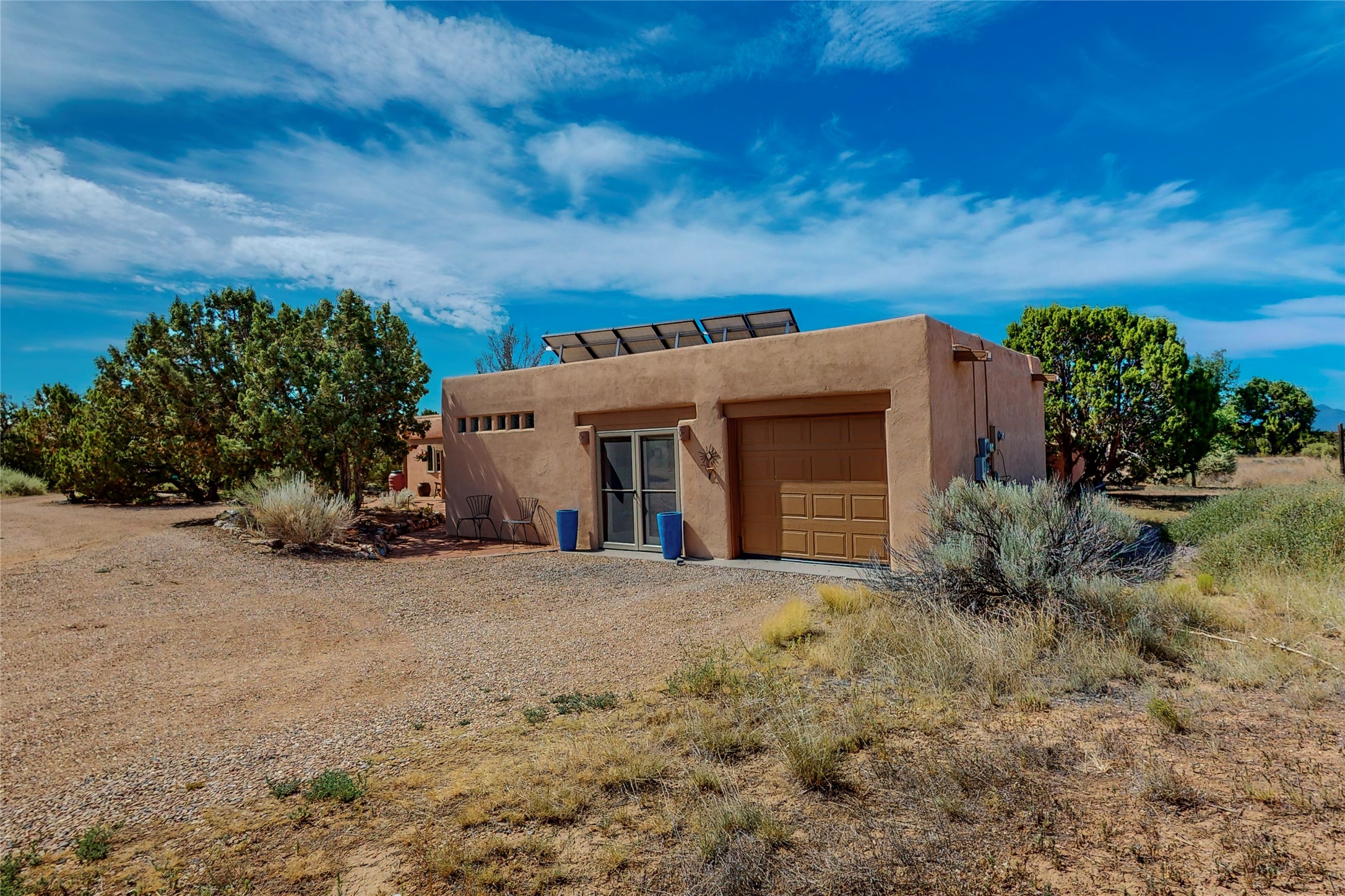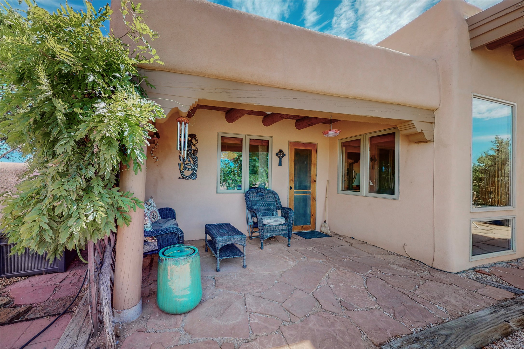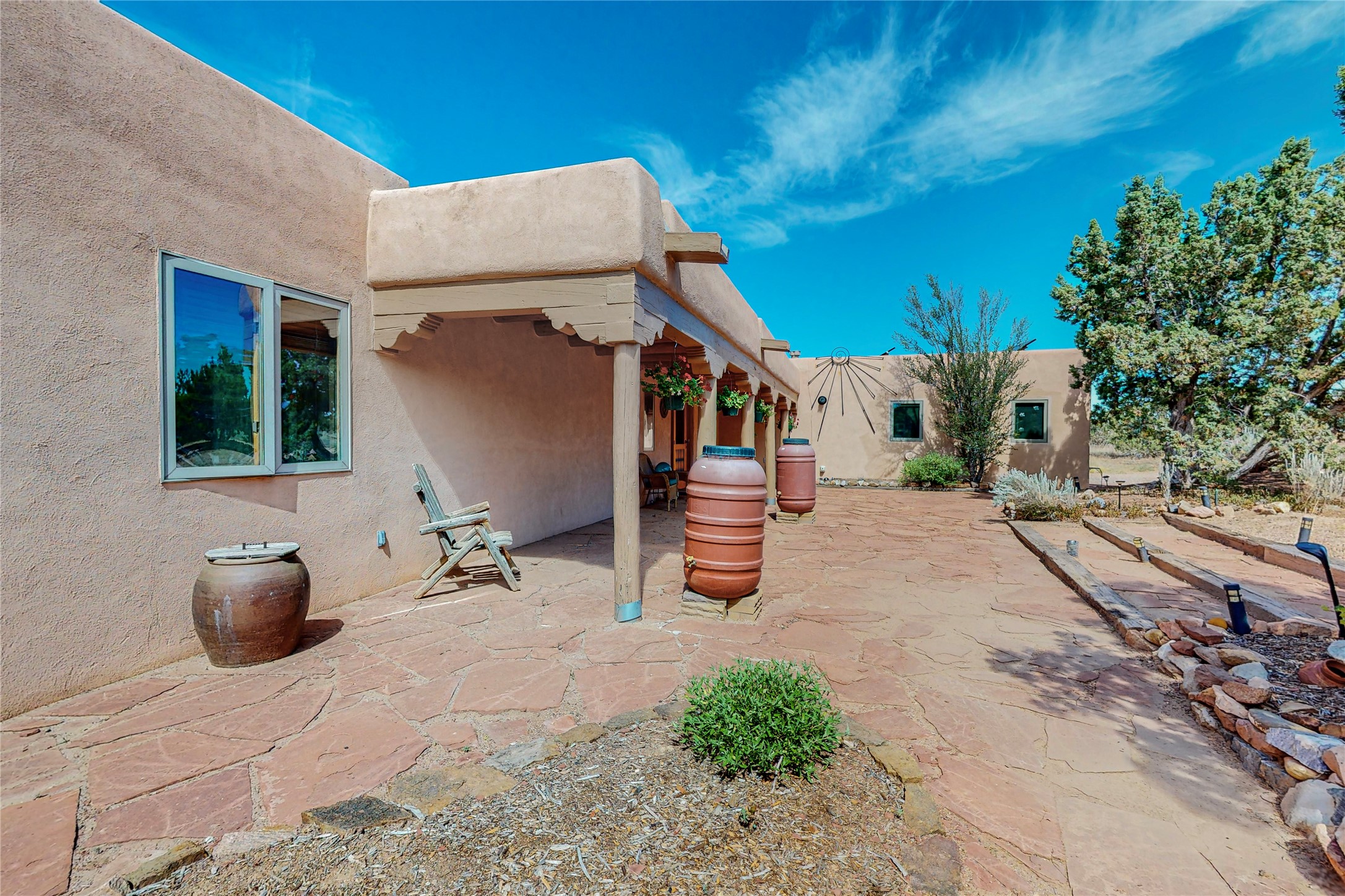 There is a lot to love about this delightful home custom built by Bowen & Picket Builders in the early 90's. Oozing with ambience and Santa Fe charm with Saltillo tile floors, viga ceilings, carved corbelled beams and kiva fireplace. A traditional pueblo design with added eco efficiency. Natural gas radiant heat, passive and active solar system, boiler and on demand hot water heater only 3 years old. A large multi purpose studio with storage room, 1 car garage, a sauna and hot tub. Fabulous privately walled gardens, water catchment cisterns and even a raised bed veggie patch. Privately located on a cul de sac with Eldorado views, access to the pool, tennis, pickleball, disc golf, parks and clubhouse activities yet only minutes into Santa Fe. This home is a must see.