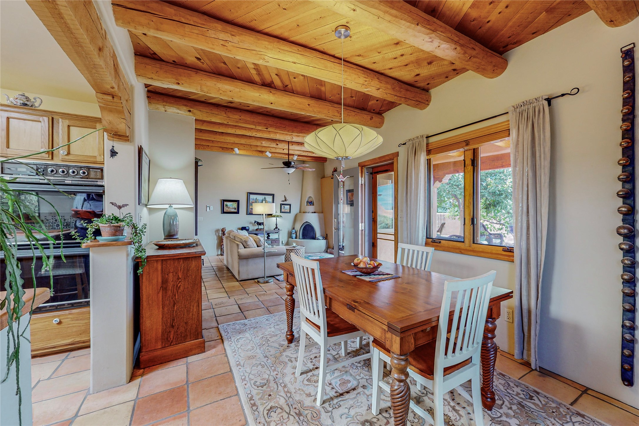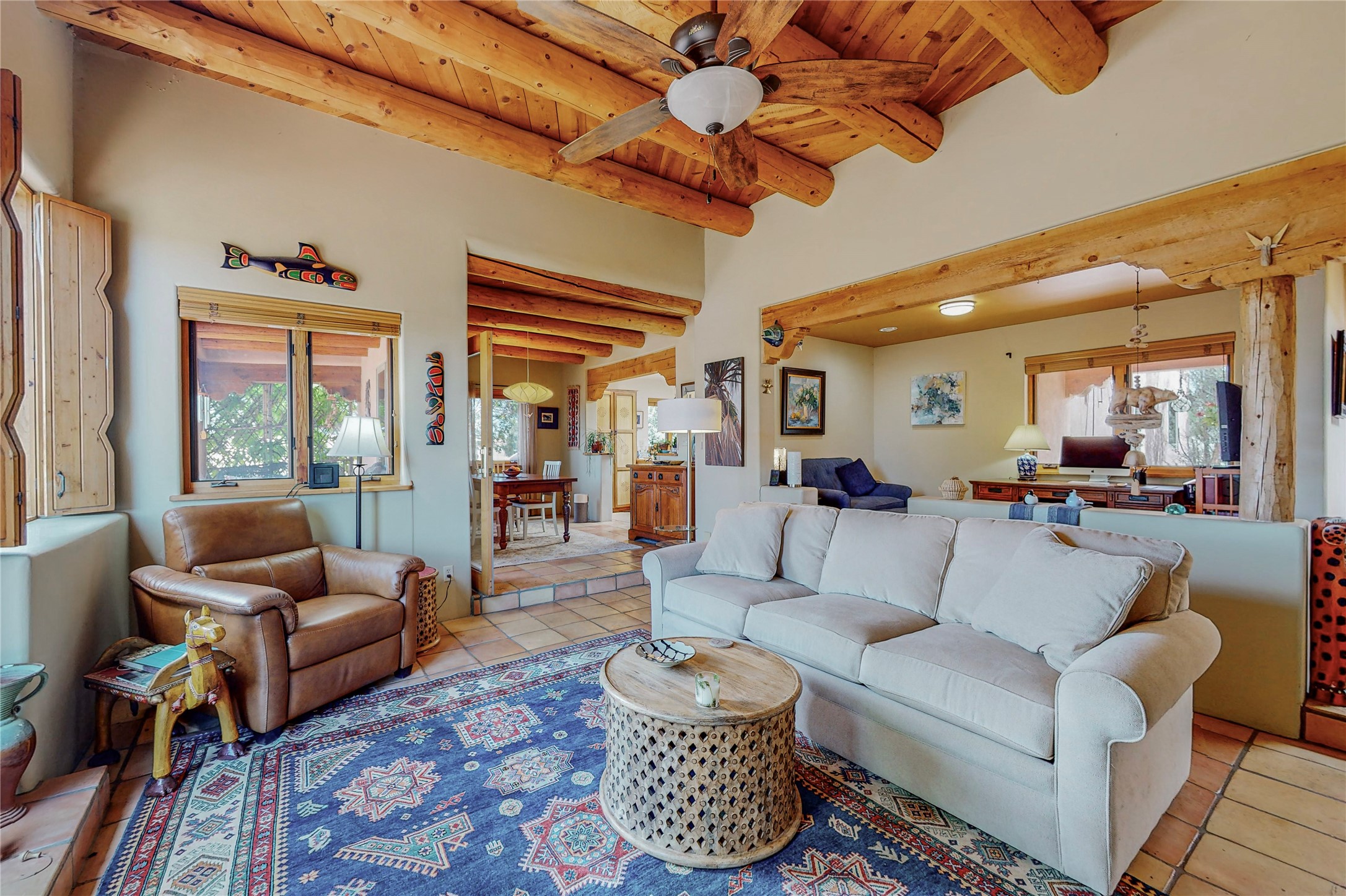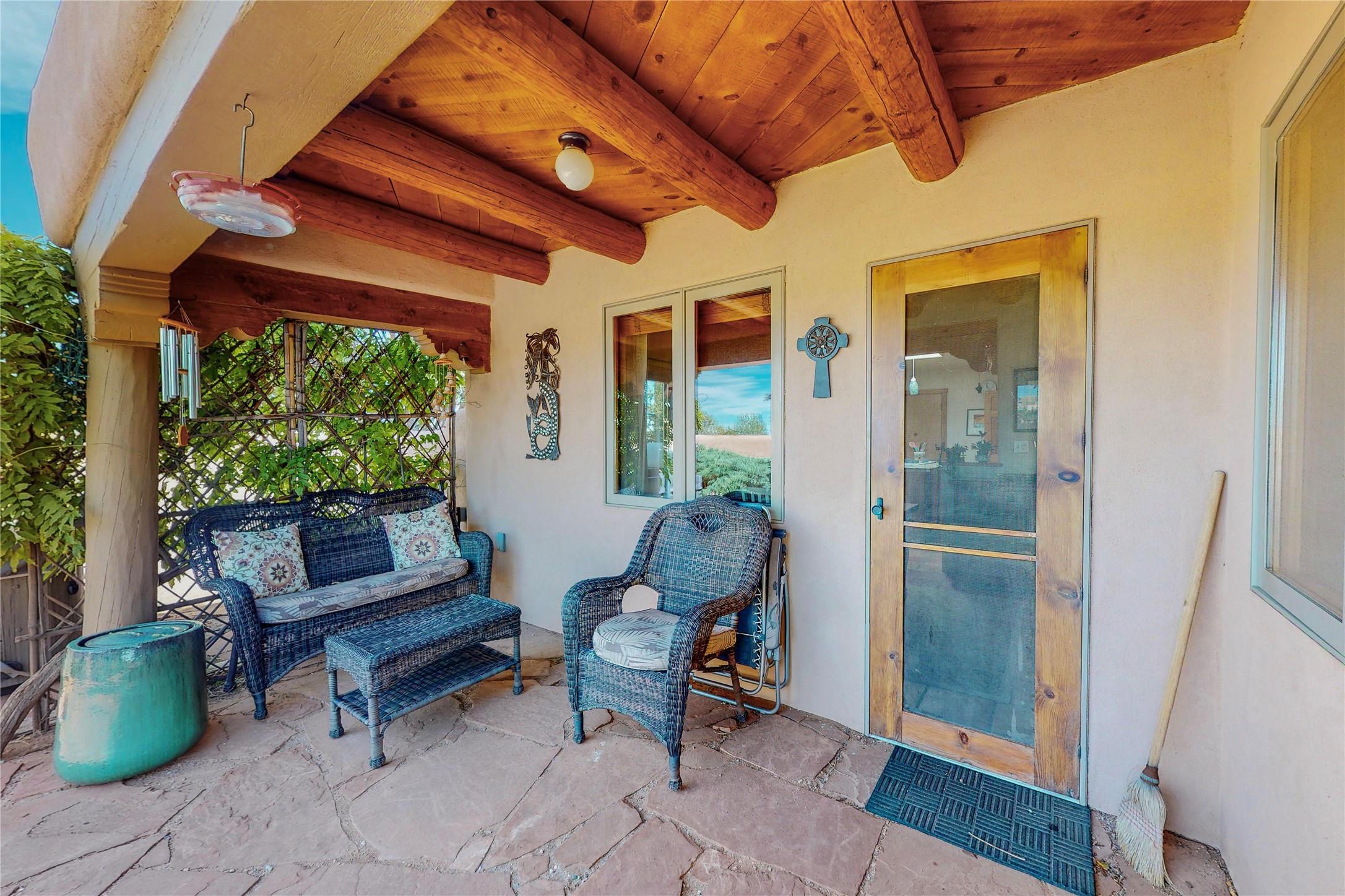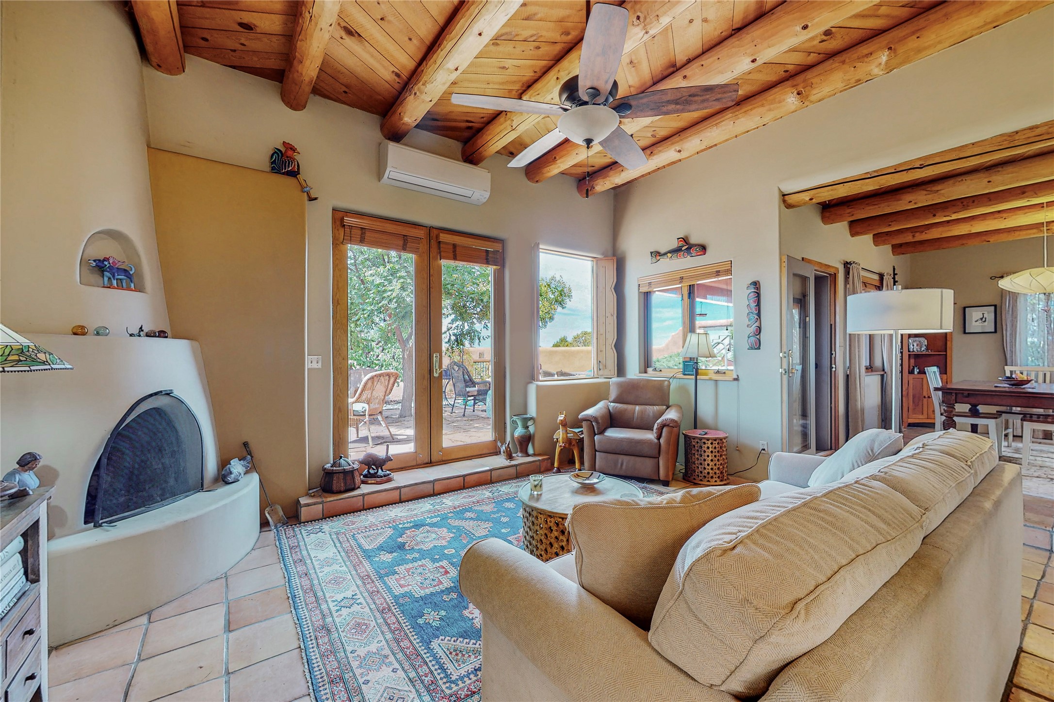 There is a lot to love about this delightful home custom built by Bowen & Picket Builders in the early 90's. Oozing with ambience and Santa Fe charm with Saltillo tile floors, viga ceilings, carved corbelled beams and kiva fireplace. A traditional pueblo design with added eco efficiency. Natural gas radiant heat, passive and active solar system, boiler and on demand hot water heater only 3 years old. A large multi purpose studio with storage room, 1 car garage, a sauna and hot tub. Fabulous privately walled gardens, water catchment cisterns and even a raised bed veggie patch. Privately located on a cul de sac with Eldorado views, access to the pool, tennis, pickleball, disc golf, parks and clubhouse activities yet only minutes into Santa Fe. This home is a must see.