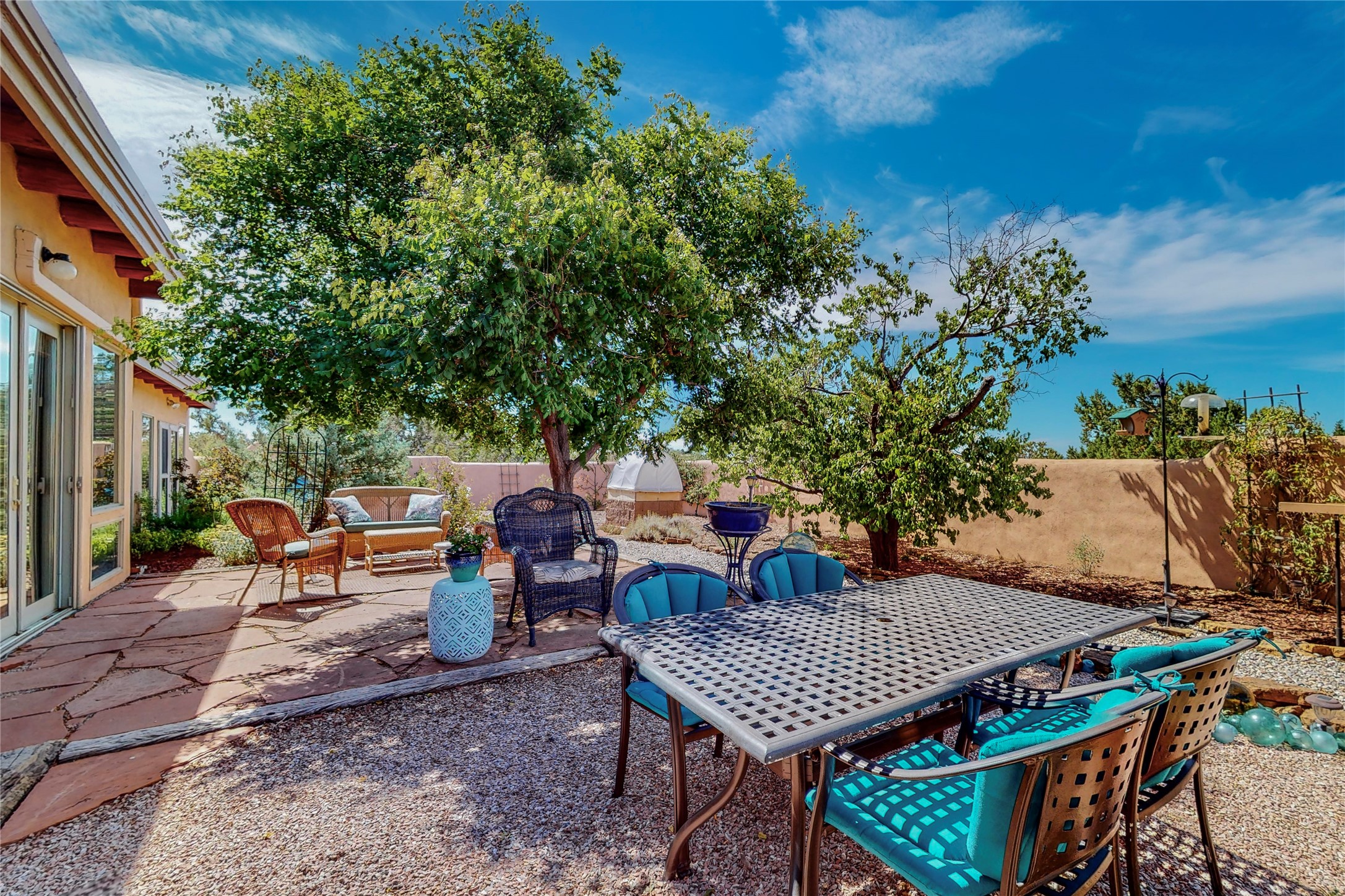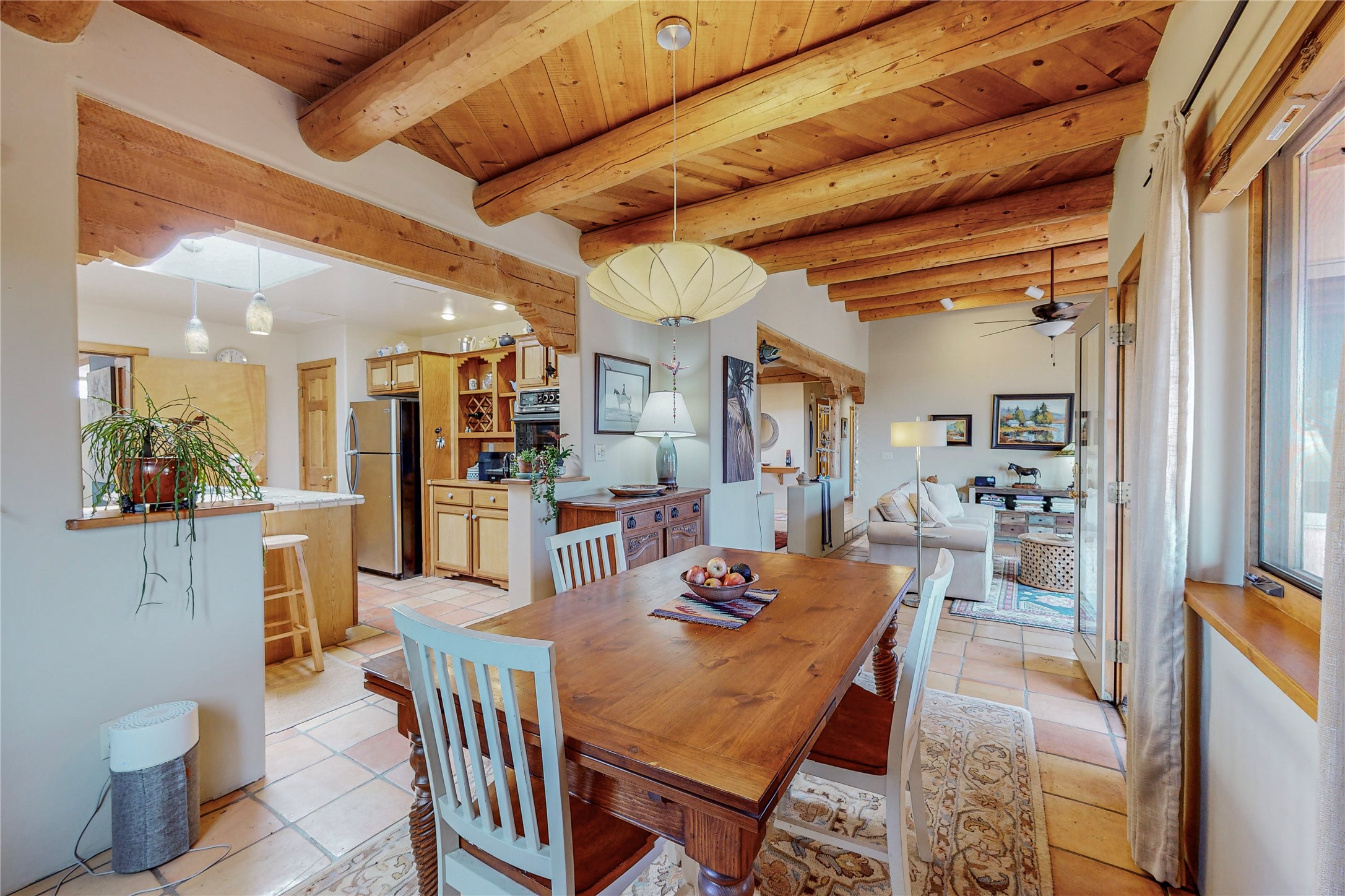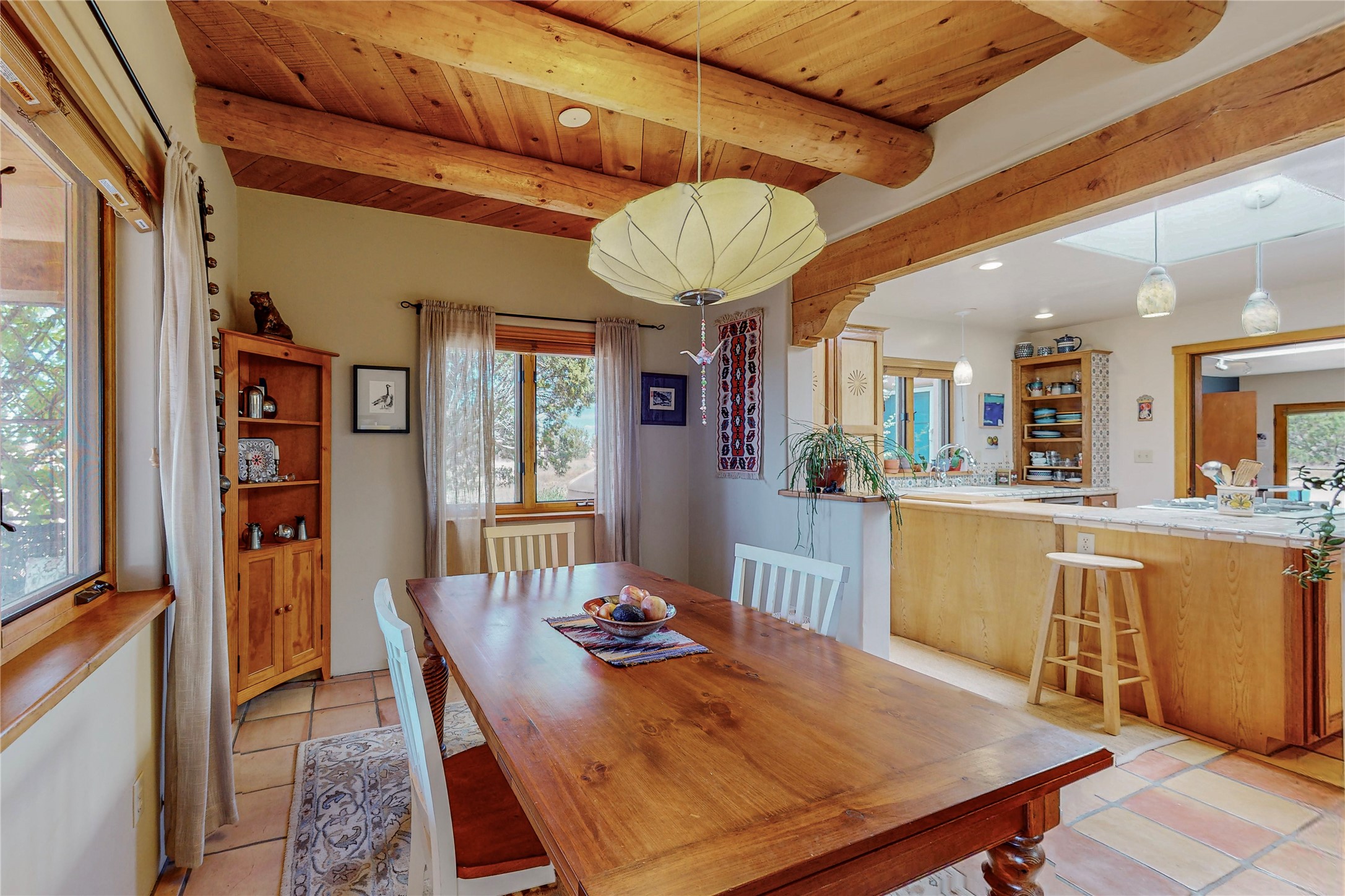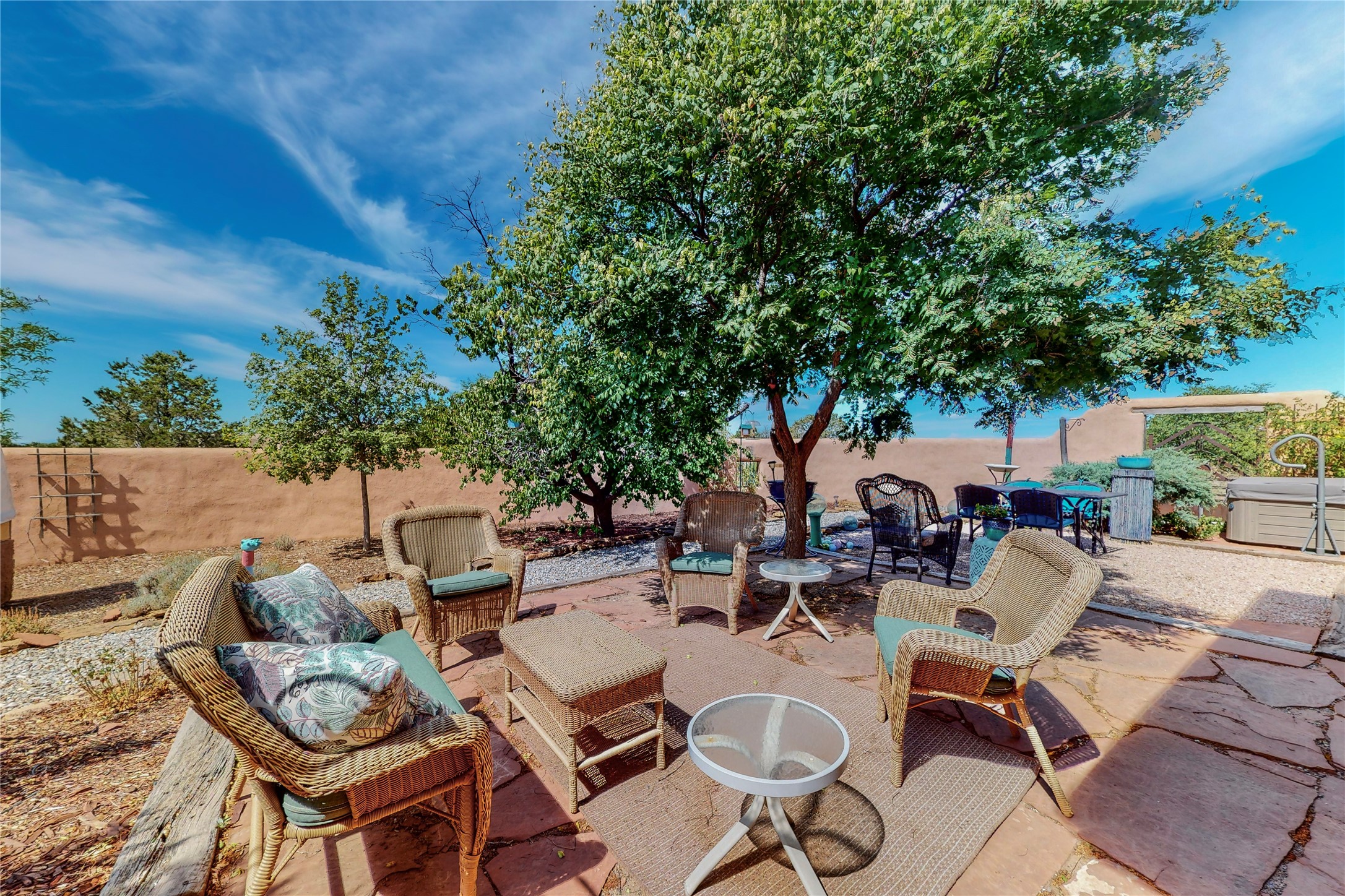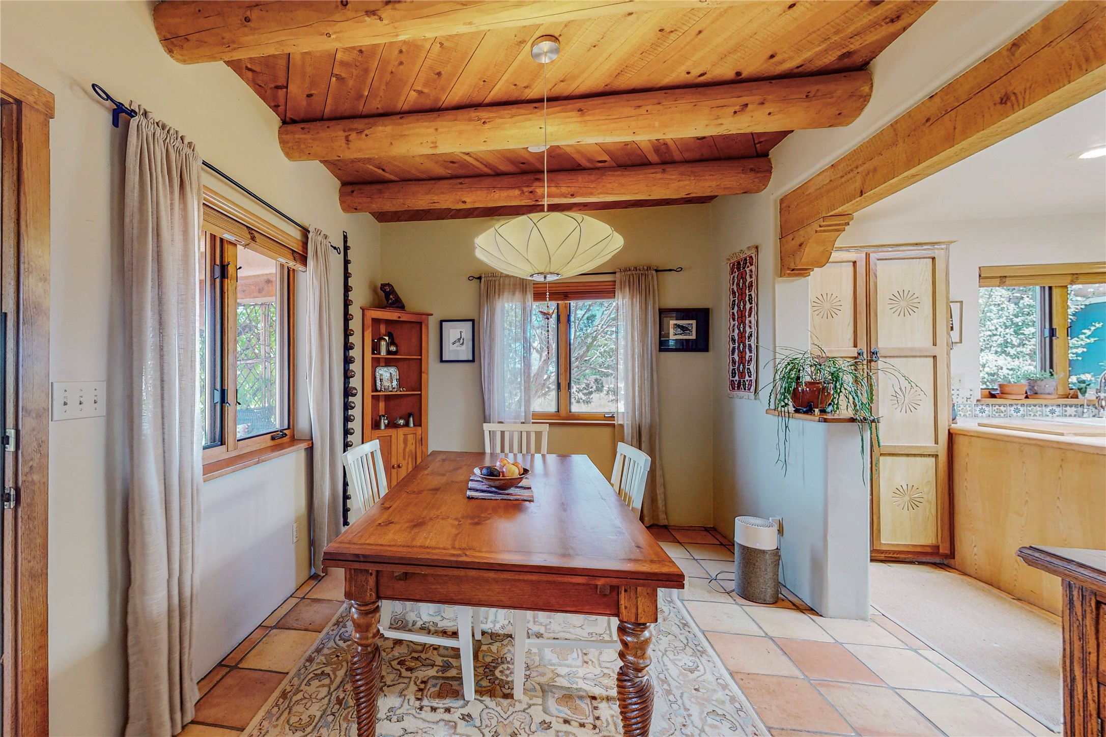 There is a lot to love about this delightful home custom built by Bowen & Picket Builders in the early 90's. Oozing with ambience and Santa Fe charm with Saltillo tile floors, viga ceilings, carved corbelled beams and kiva fireplace. A traditional pueblo design with added eco efficiency. Natural gas radiant heat, passive and active solar system, boiler and on demand hot water heater only 3 years old. A large multi purpose studio with storage room, 1 car garage, a sauna and hot tub. Fabulous privately walled gardens, water catchment cisterns and even a raised bed veggie patch. Privately located on a cul de sac with Eldorado views, access to the pool, tennis, pickleball, disc golf, parks and clubhouse activities yet only minutes into Santa Fe. This home is a must see.