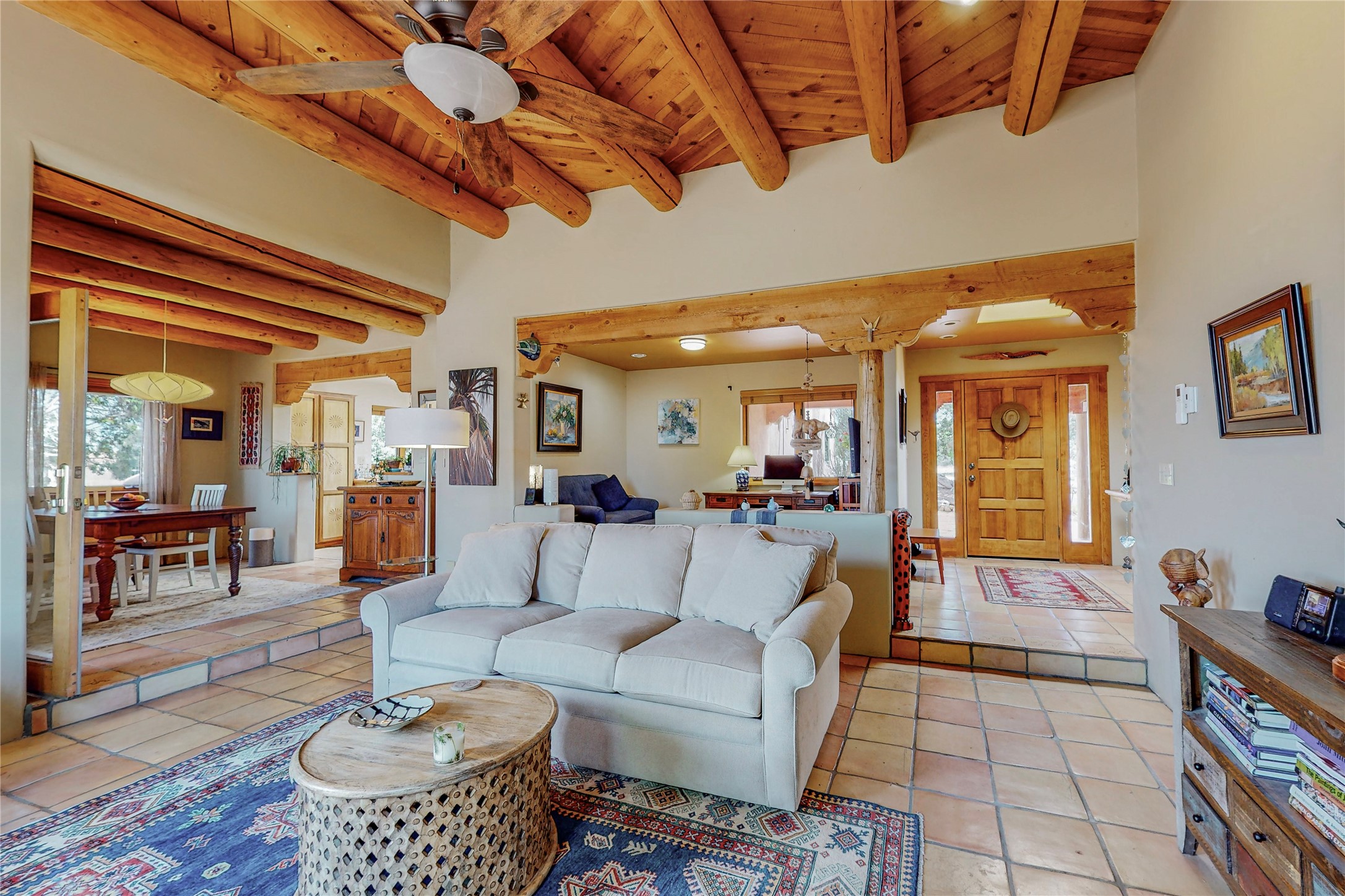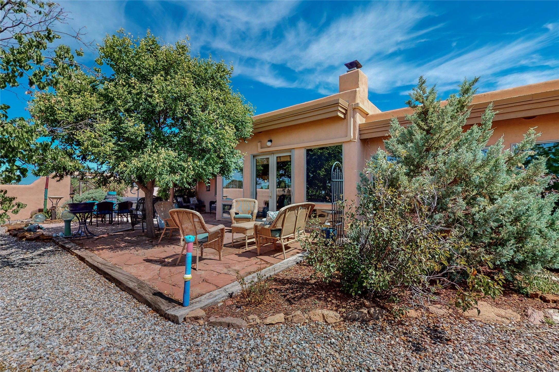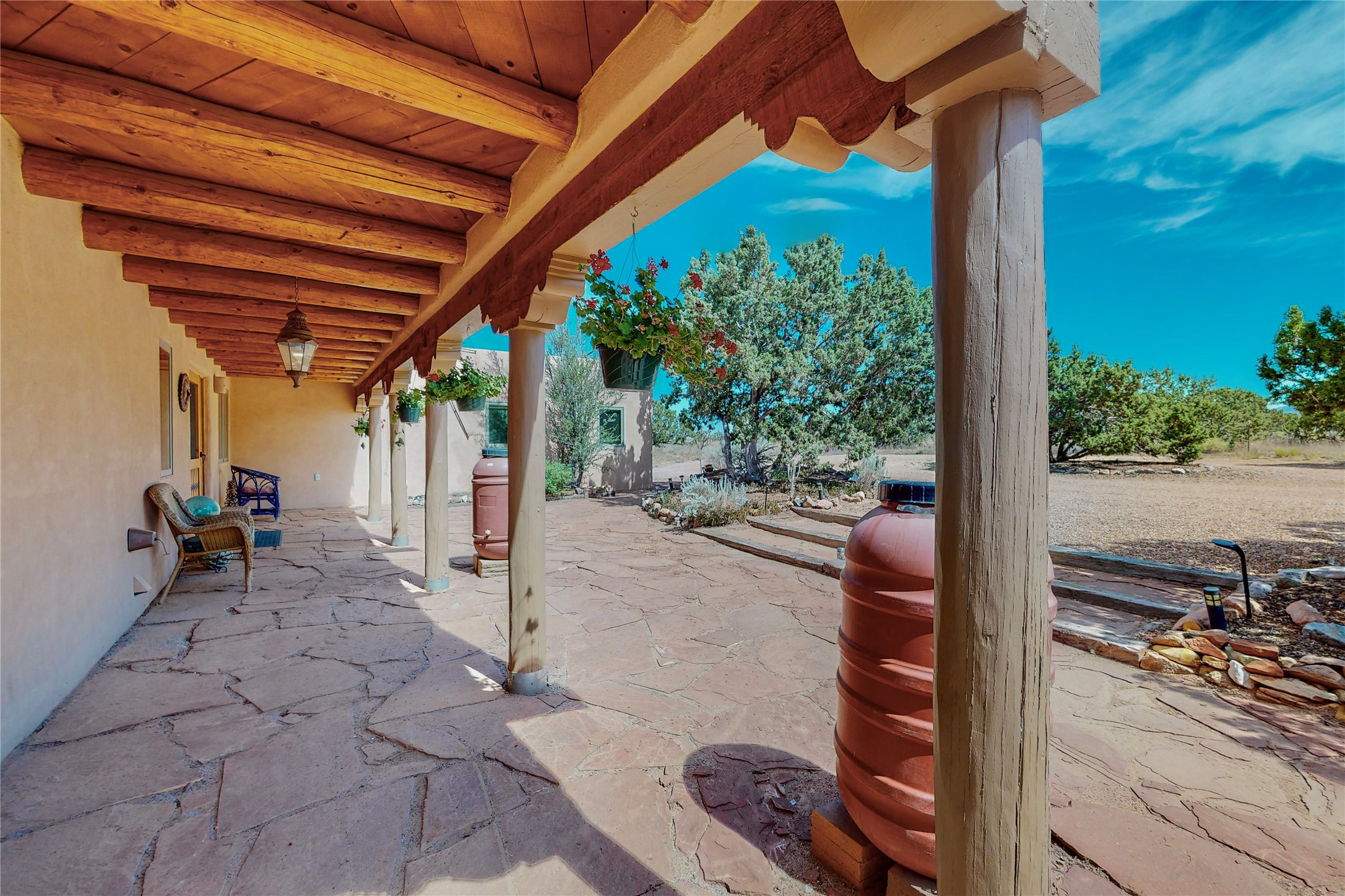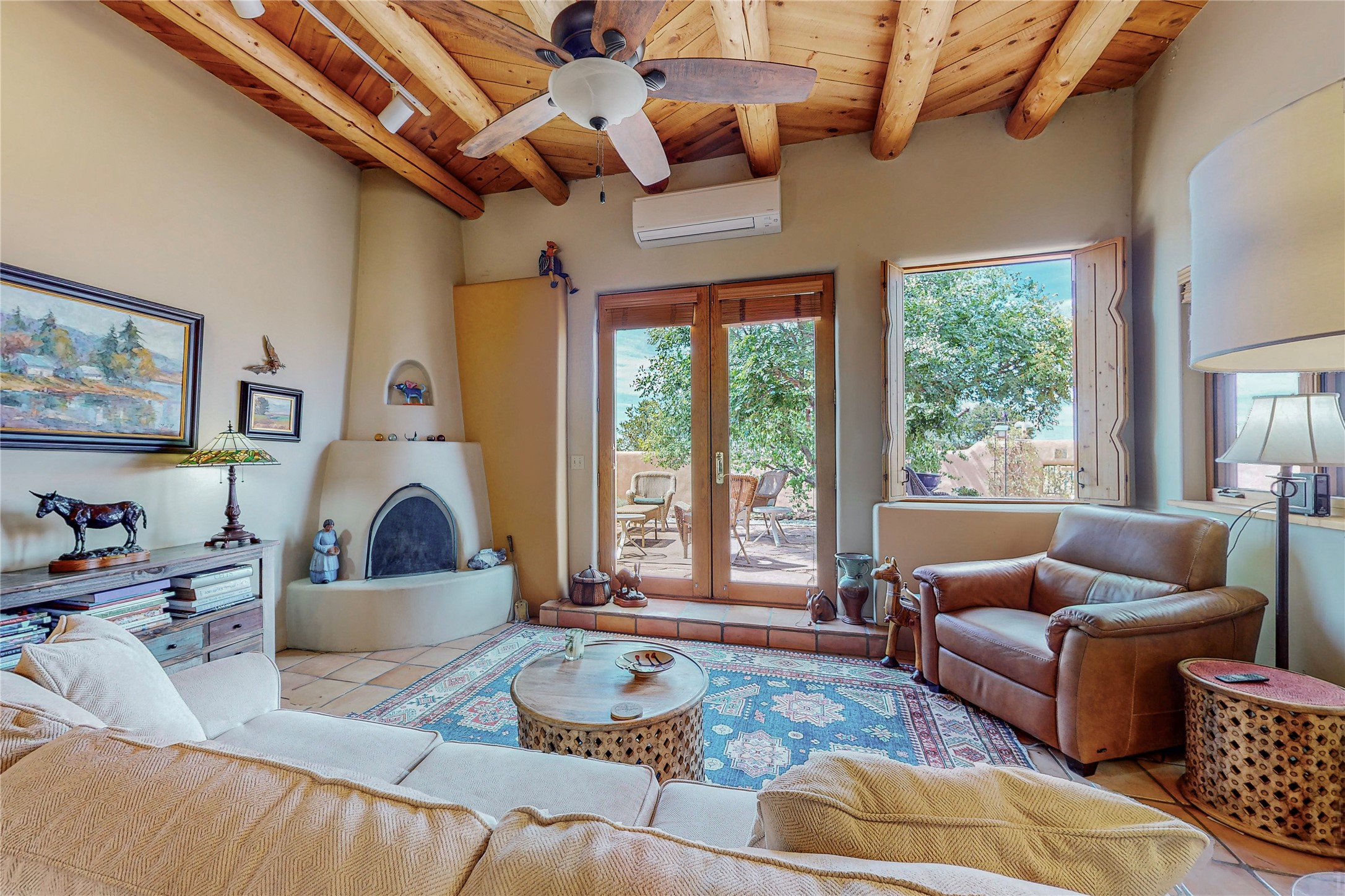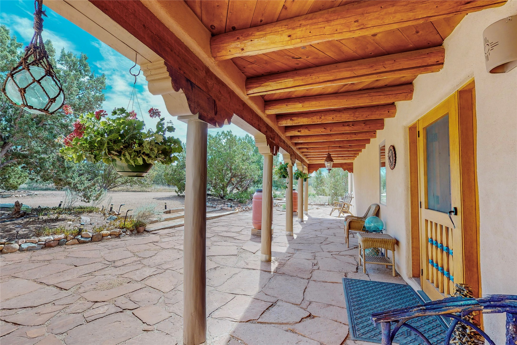 There is a lot to love about this delightful home custom built by Bowen & Picket Builders in the early 90's. Oozing with ambience and Santa Fe charm with Saltillo tile floors, viga ceilings, carved corbelled beams and kiva fireplace. A traditional pueblo design with added eco efficiency. Natural gas radiant heat, passive and active solar system, boiler and on demand hot water heater only 3 years old. A large multi purpose studio with storage room, 1 car garage, a sauna and hot tub. Fabulous privately walled gardens, water catchment cisterns and even a raised bed veggie patch. Privately located on a cul de sac with Eldorado views, access to the pool, tennis, pickleball, disc golf, parks and clubhouse activities yet only minutes into Santa Fe. This home is a must see.