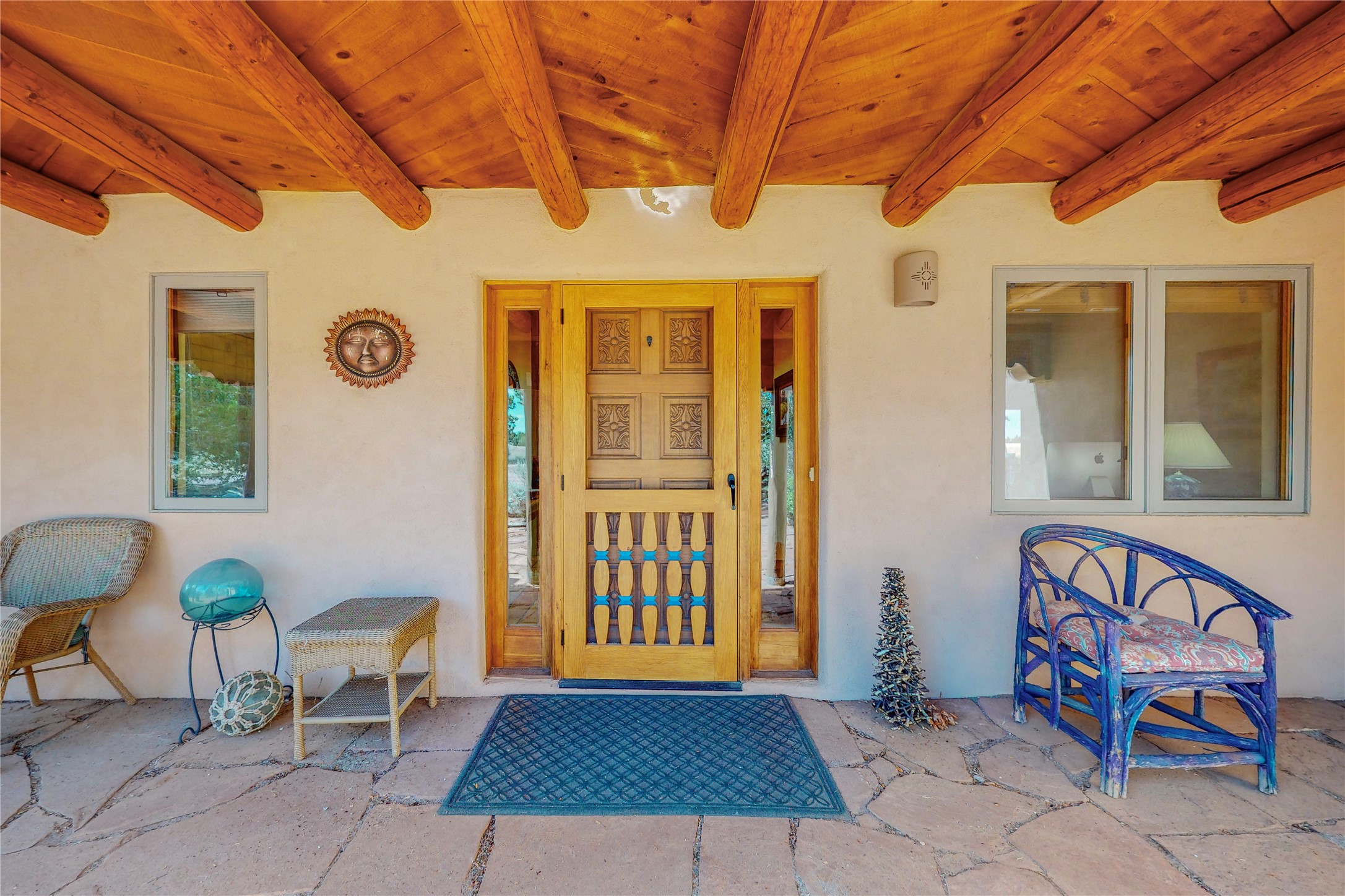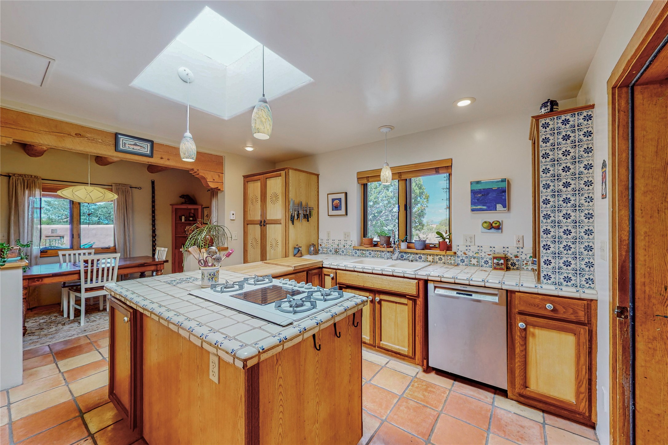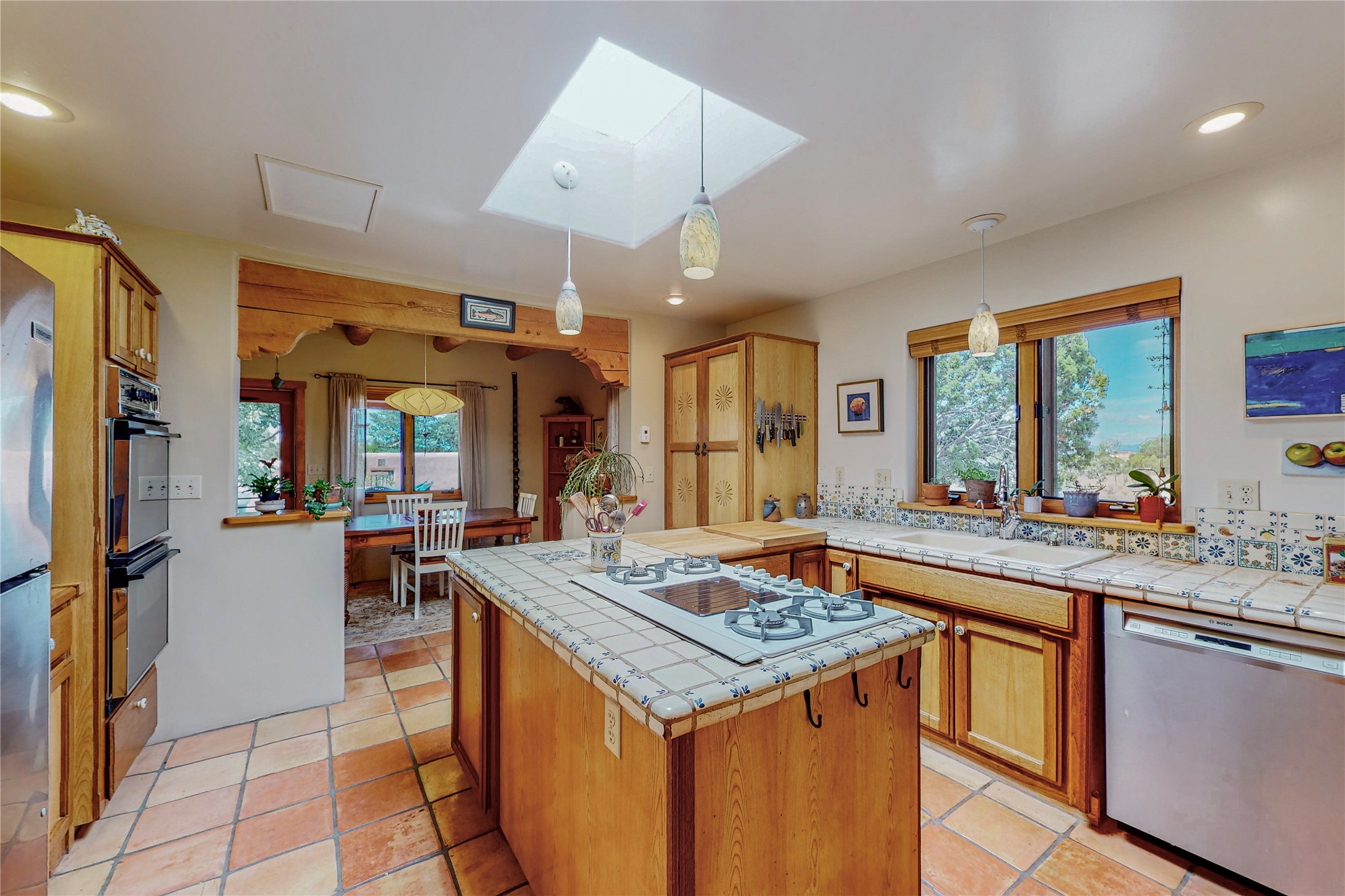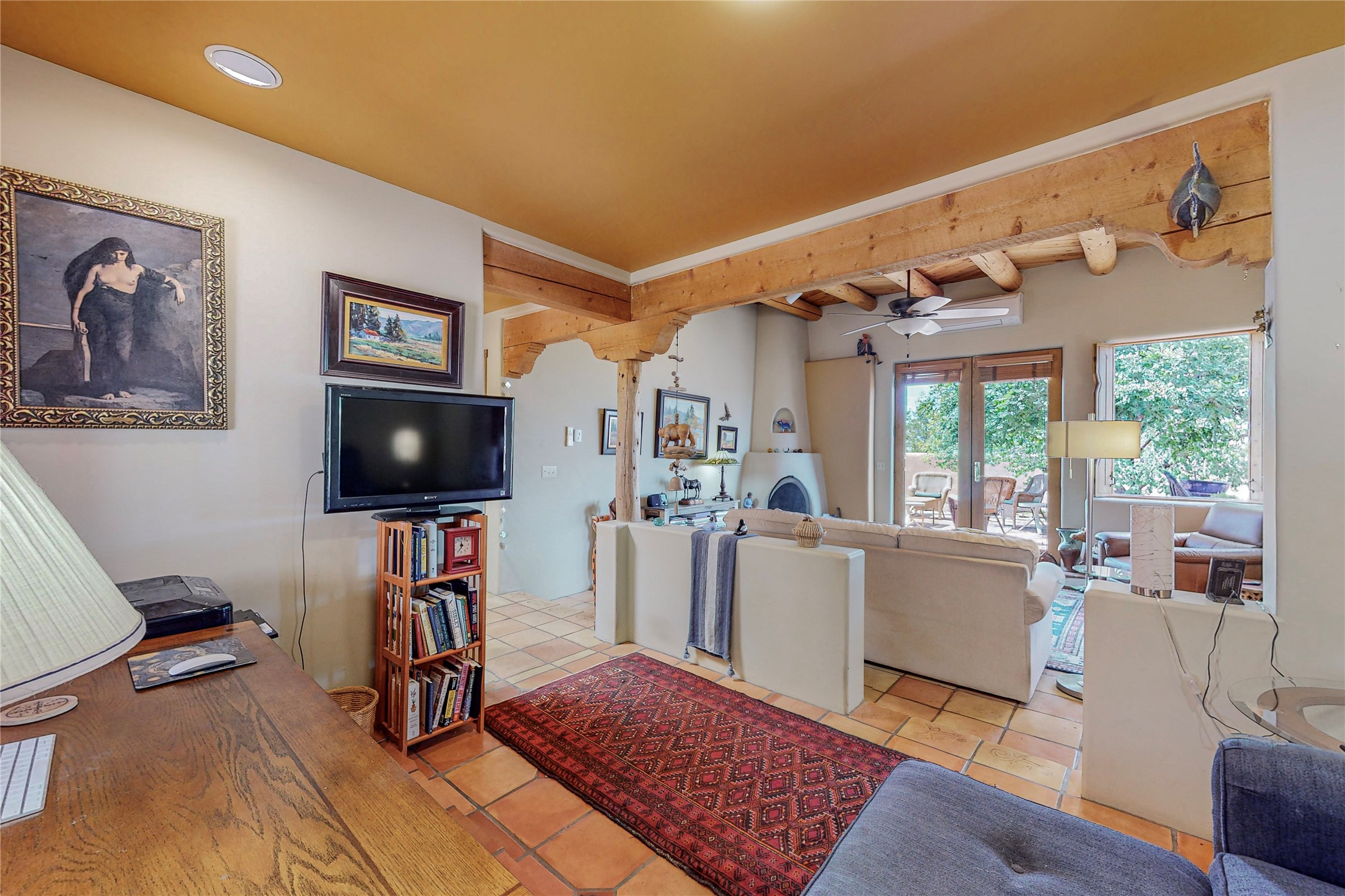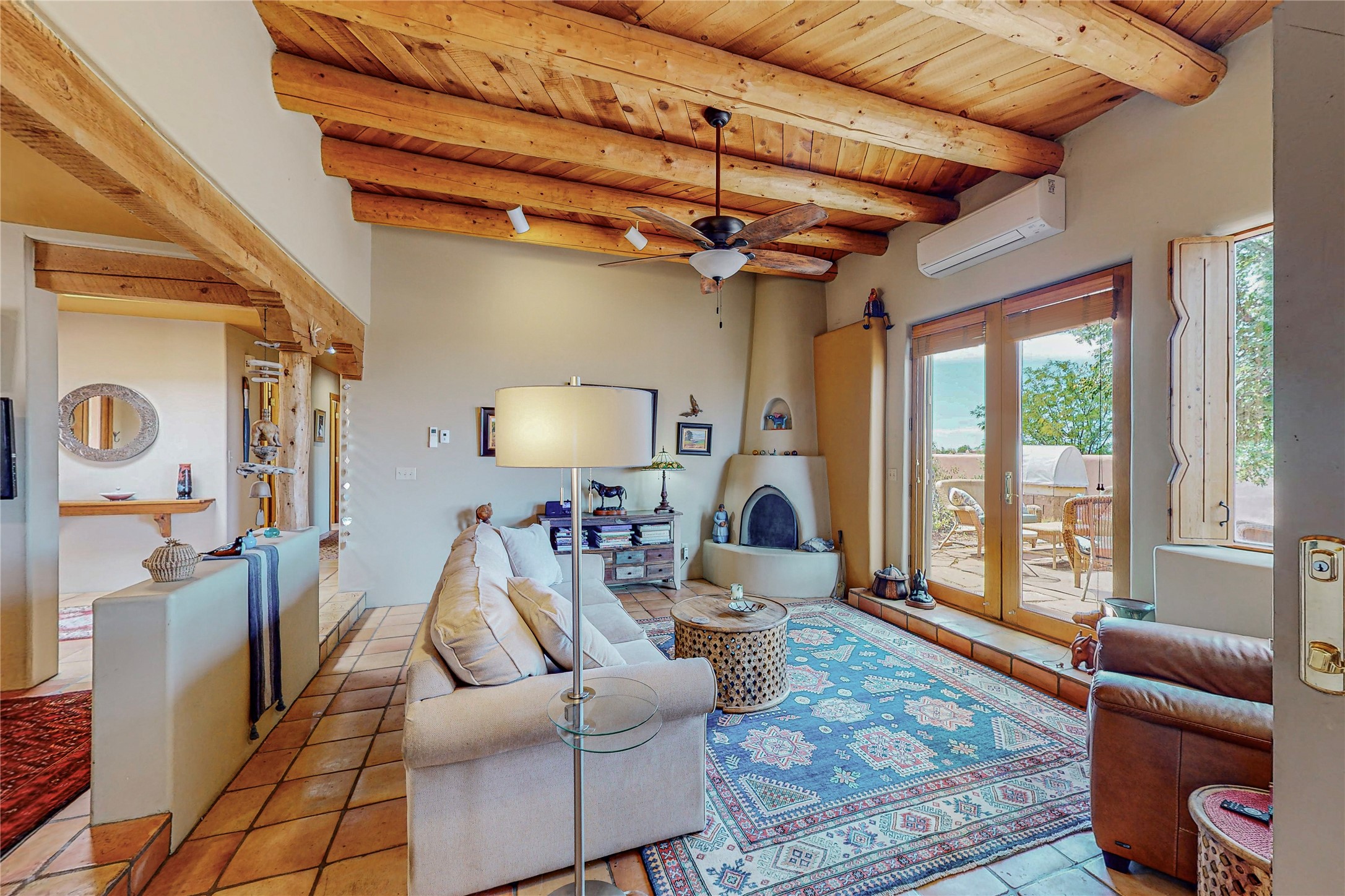 There is a lot to love about this delightful home custom built by Bowen & Picket Builders in the early 90's. Oozing with ambience and Santa Fe charm with Saltillo tile floors, viga ceilings, carved corbelled beams and kiva fireplace. A traditional pueblo design with added eco efficiency. Natural gas radiant heat, passive and active solar system, boiler and on demand hot water heater only 3 years old. A large multi purpose studio with storage room, 1 car garage, a sauna and hot tub. Fabulous privately walled gardens, water catchment cisterns and even a raised bed veggie patch. Privately located on a cul de sac with Eldorado views, access to the pool, tennis, pickleball, disc golf, parks and clubhouse activities yet only minutes into Santa Fe. This home is a must see.