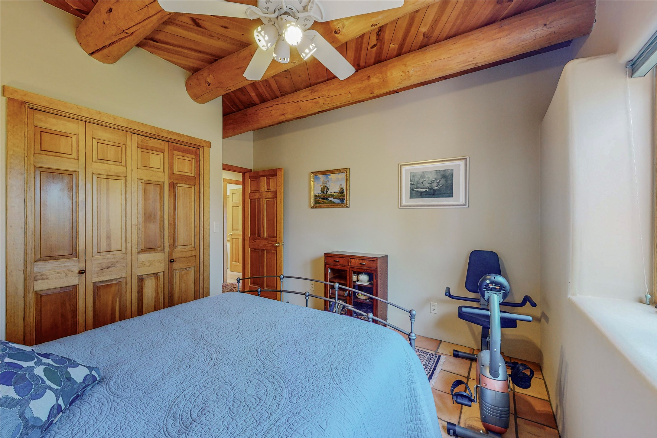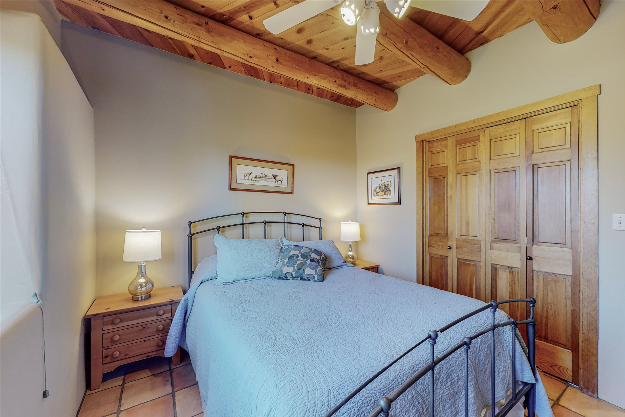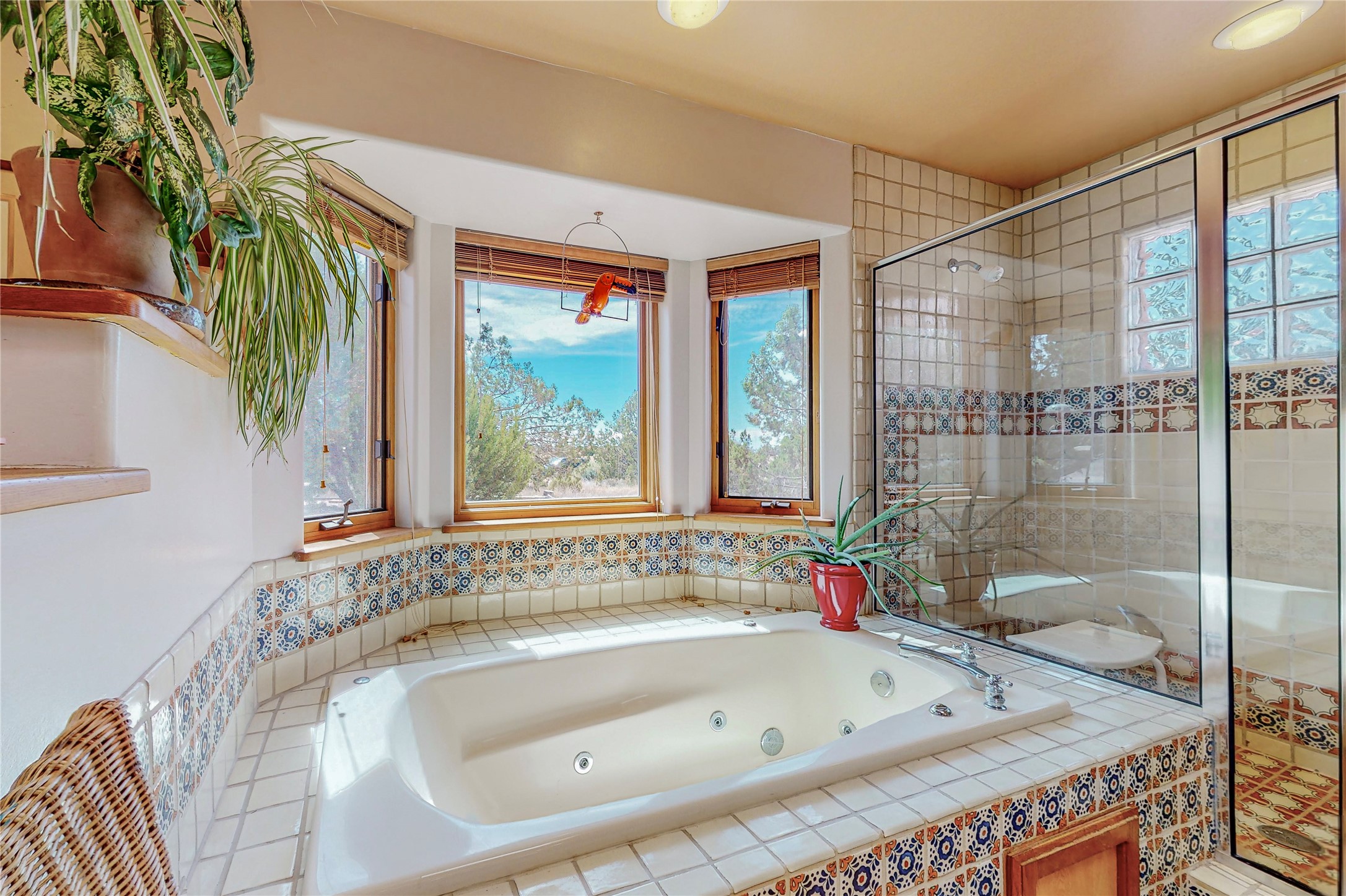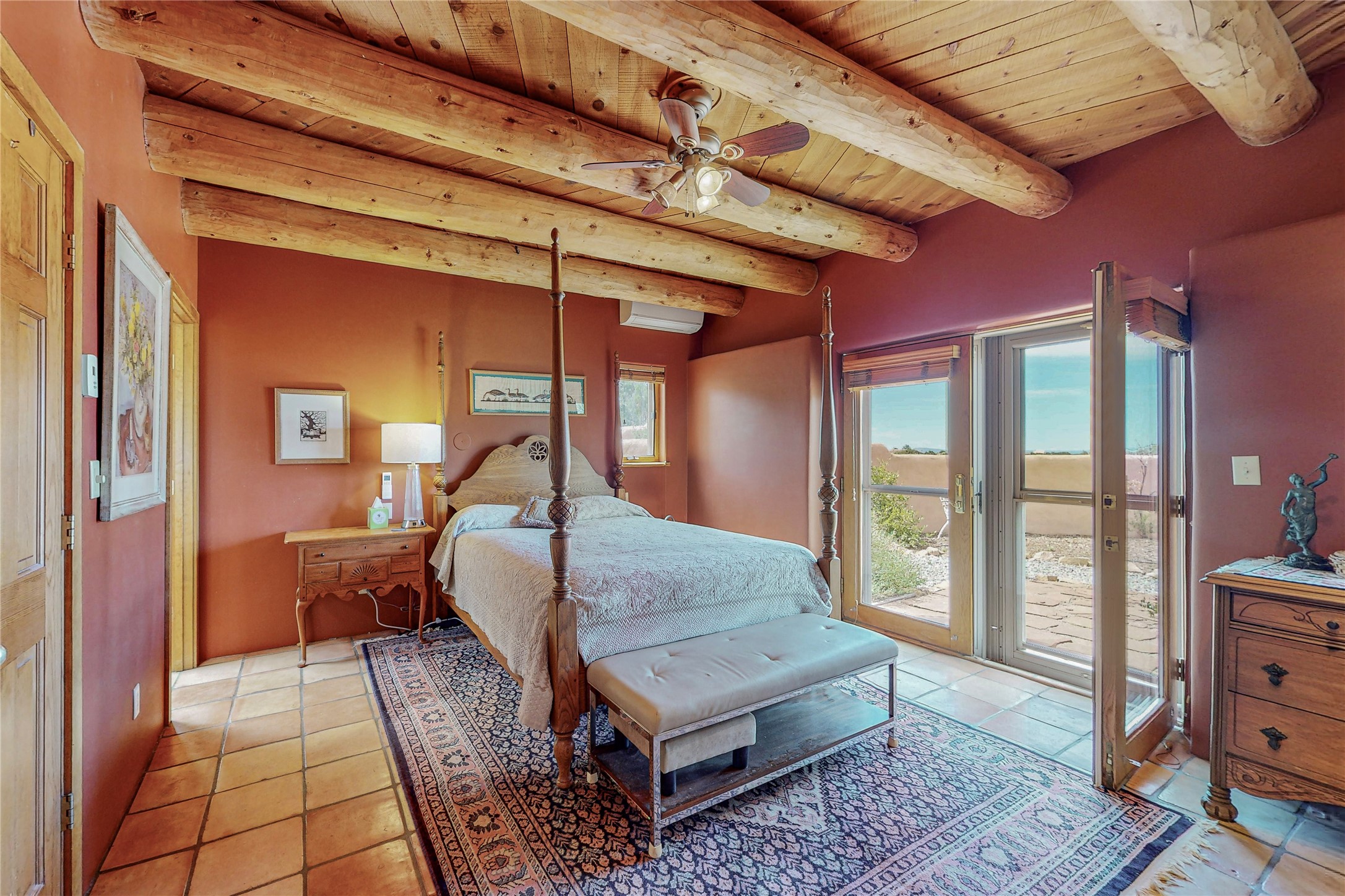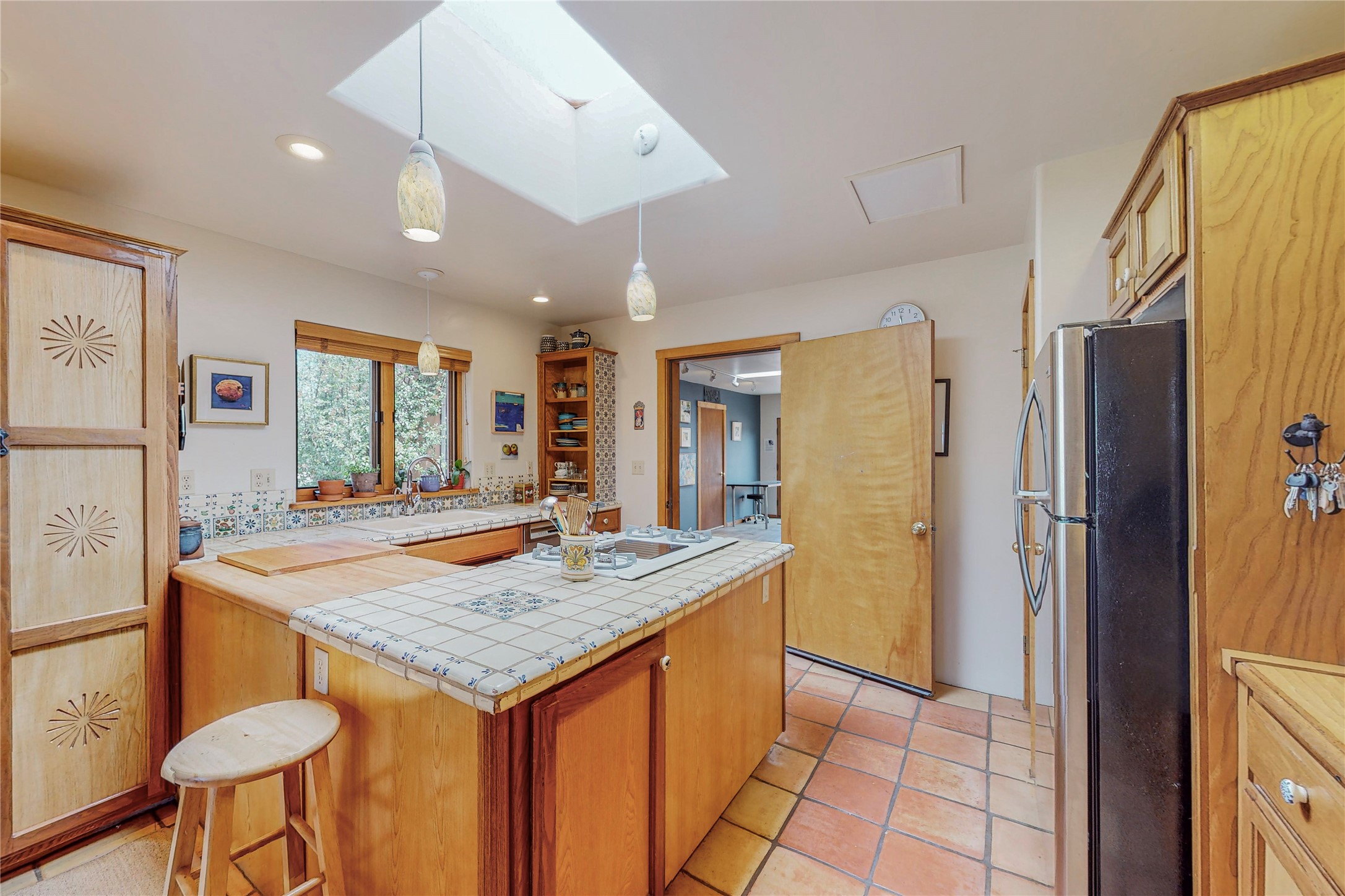 There is a lot to love about this delightful home custom built by Bowen & Picket Builders in the early 90's. Oozing with ambience and Santa Fe charm with Saltillo tile floors, viga ceilings, carved corbelled beams and kiva fireplace. A traditional pueblo design with added eco efficiency. Natural gas radiant heat, passive and active solar system, boiler and on demand hot water heater only 3 years old. A large multi purpose studio with storage room, 1 car garage, a sauna and hot tub. Fabulous privately walled gardens, water catchment cisterns and even a raised bed veggie patch. Privately located on a cul de sac with Eldorado views, access to the pool, tennis, pickleball, disc golf, parks and clubhouse activities yet only minutes into Santa Fe. This home is a must see.