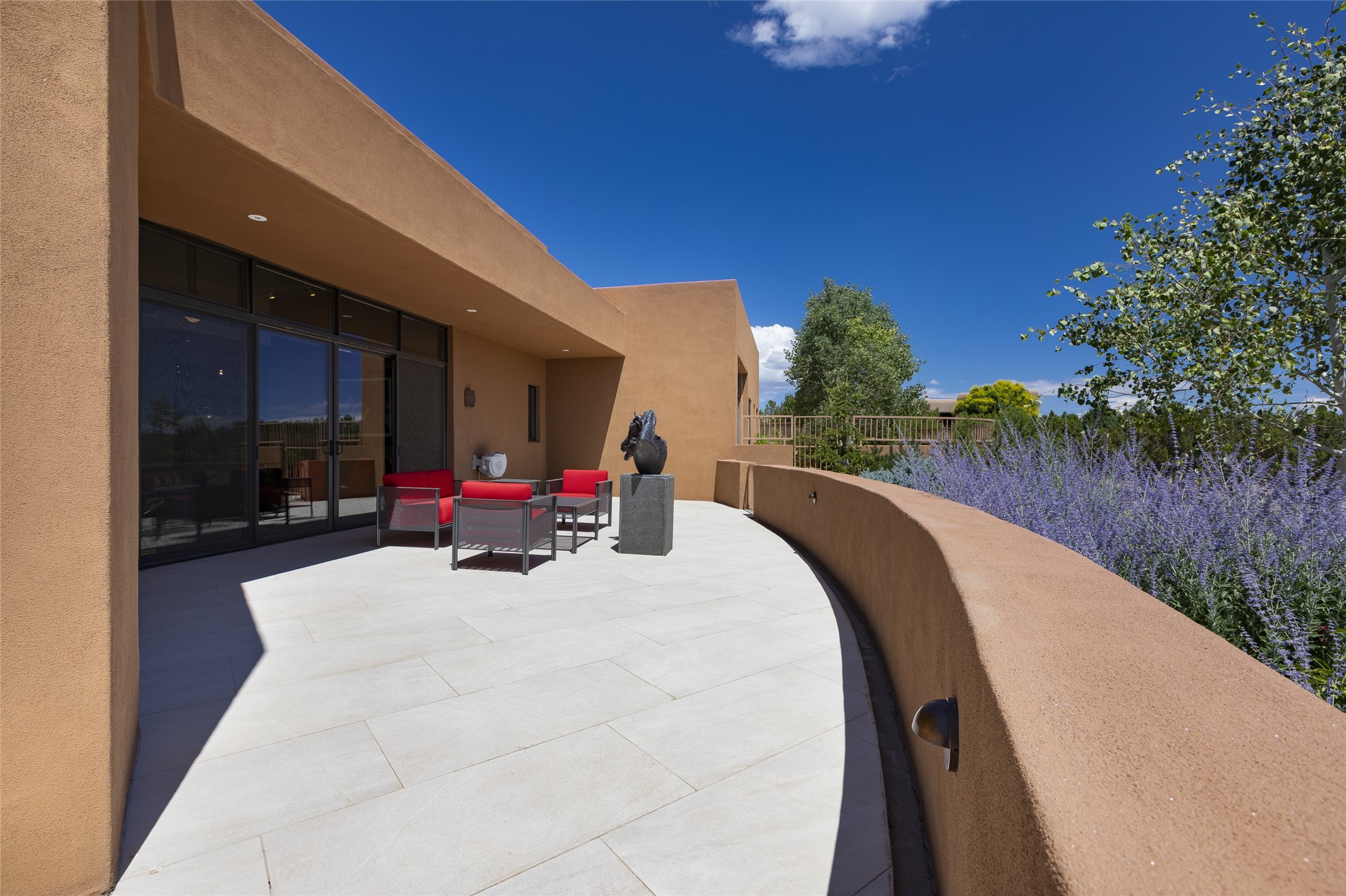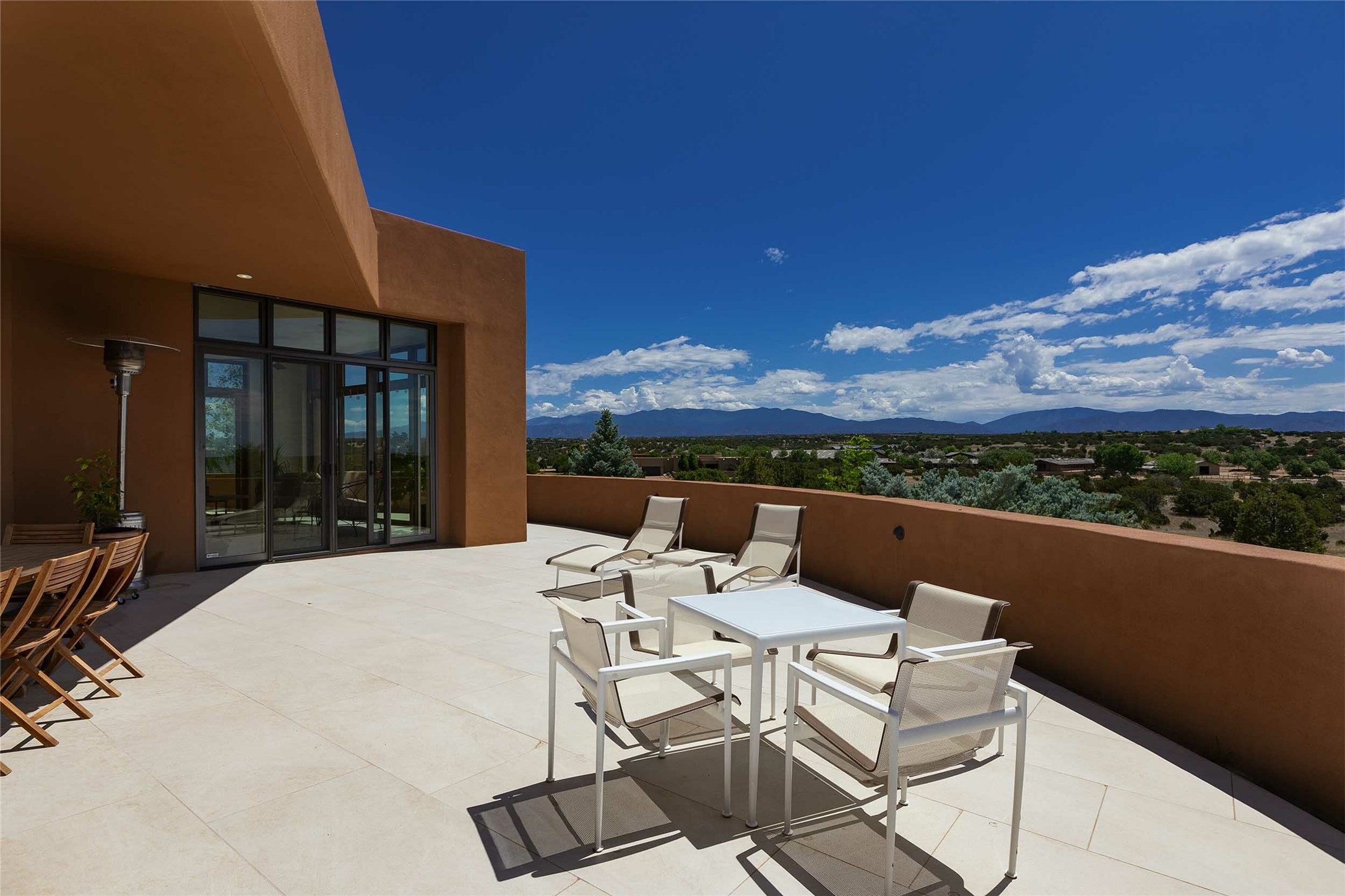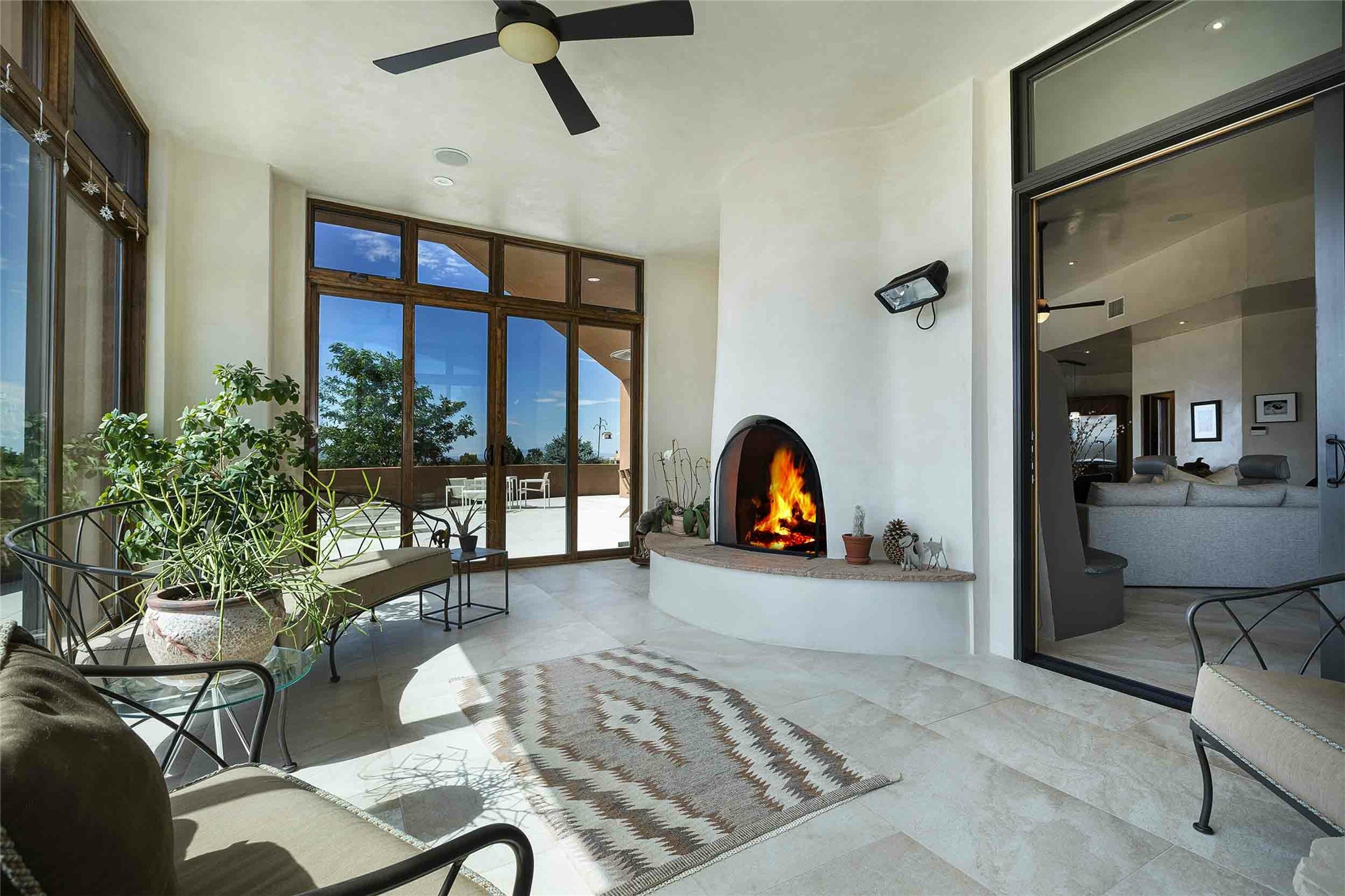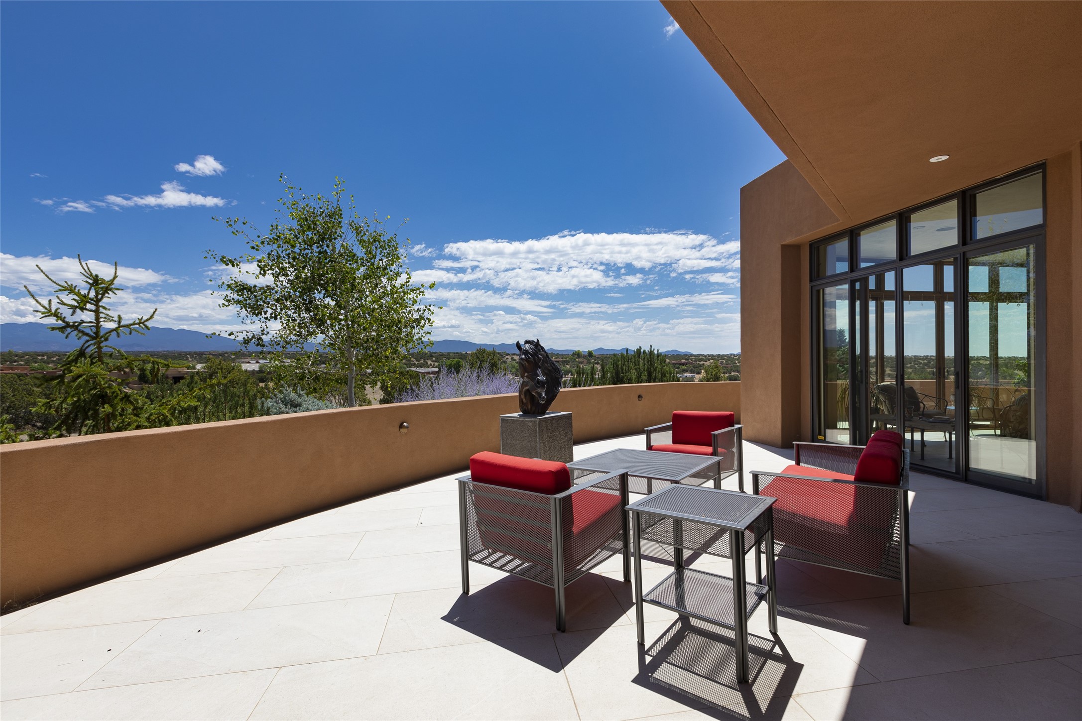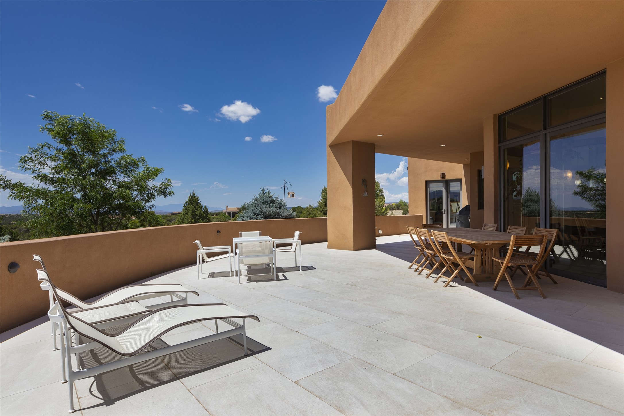 Experience the ultimate Santa Fe lifestyle. This rare, triumphant Tour de Force residence excites with the ultimate blend of sophisticated design and spectacular Sangre De Cristo, Ortiz and Sandia Mountain views. Perfectly sited on an elevated 1.8 acre view lot, this exquisite, single level residence with an independent guest house, roof deck, and a 5-car garage, built by renowned builder, Dave Jansen, designed by Richard Martinez, exemplifies the unique blend of extraordinary modern design with the true essence of Santa Fe. Upon entering through the welcoming, front entrance courtyard with a tranquil water feature, this home impresses and captivates with the stunning surround mountain views and a flexible floor plan, which seamlessly incorporates indoor and outdoor living at its finest. Ideal for guests and entertaining, the main residence offers 4,448 square feet, featuring a spacious open concept living room and dining room, with surround view windows, a glassed viewing room with a fireplace, and a well-appointed island kitchen complete with Wolf and Sub Zero appliances, a breakfast bar, butler's pantry, and an ideal wine room located directly off of the kitchen. The owner's suite delights with an intimate sitting room, fireplace, a private enclosed patio, and an updated luxurious bath with a soaking tub, walk-in shower, towel warming bars, and two large walk-in closets. The separate guest wing features its own living room with two private guest bedrooms, each with their own portal and a shared bath. Detached from the main residence is a spacious two-bedroom guest house, complete with its own bath, barista area, two enclosed patios and access to the roof deck. Exceptional features include 3,000 square feet of walled portal spaces, plaster walls, updated modern porcelain flooring throughout the main living areas and located within minutes to all facilities at The Club at Las Campanas.