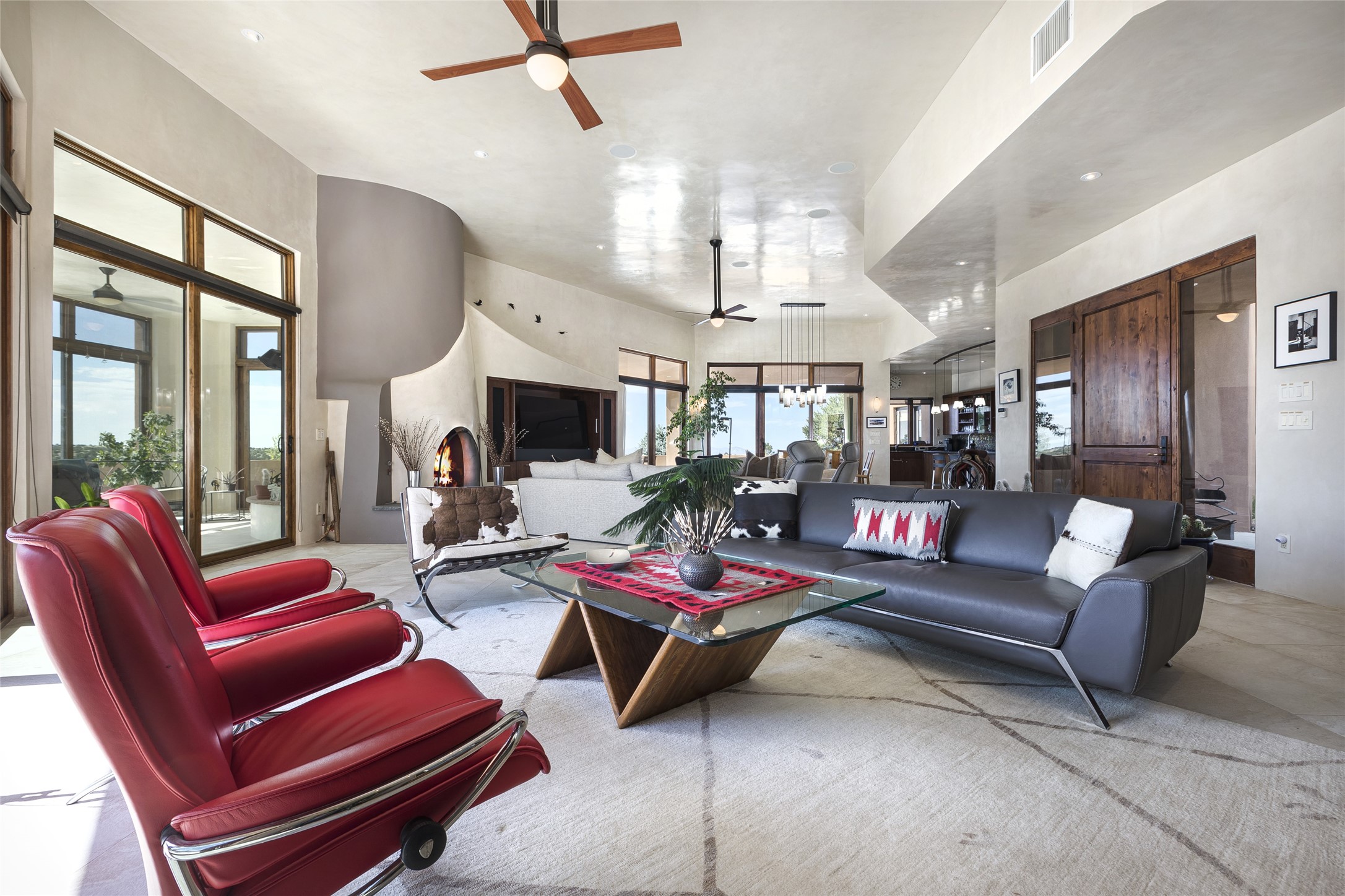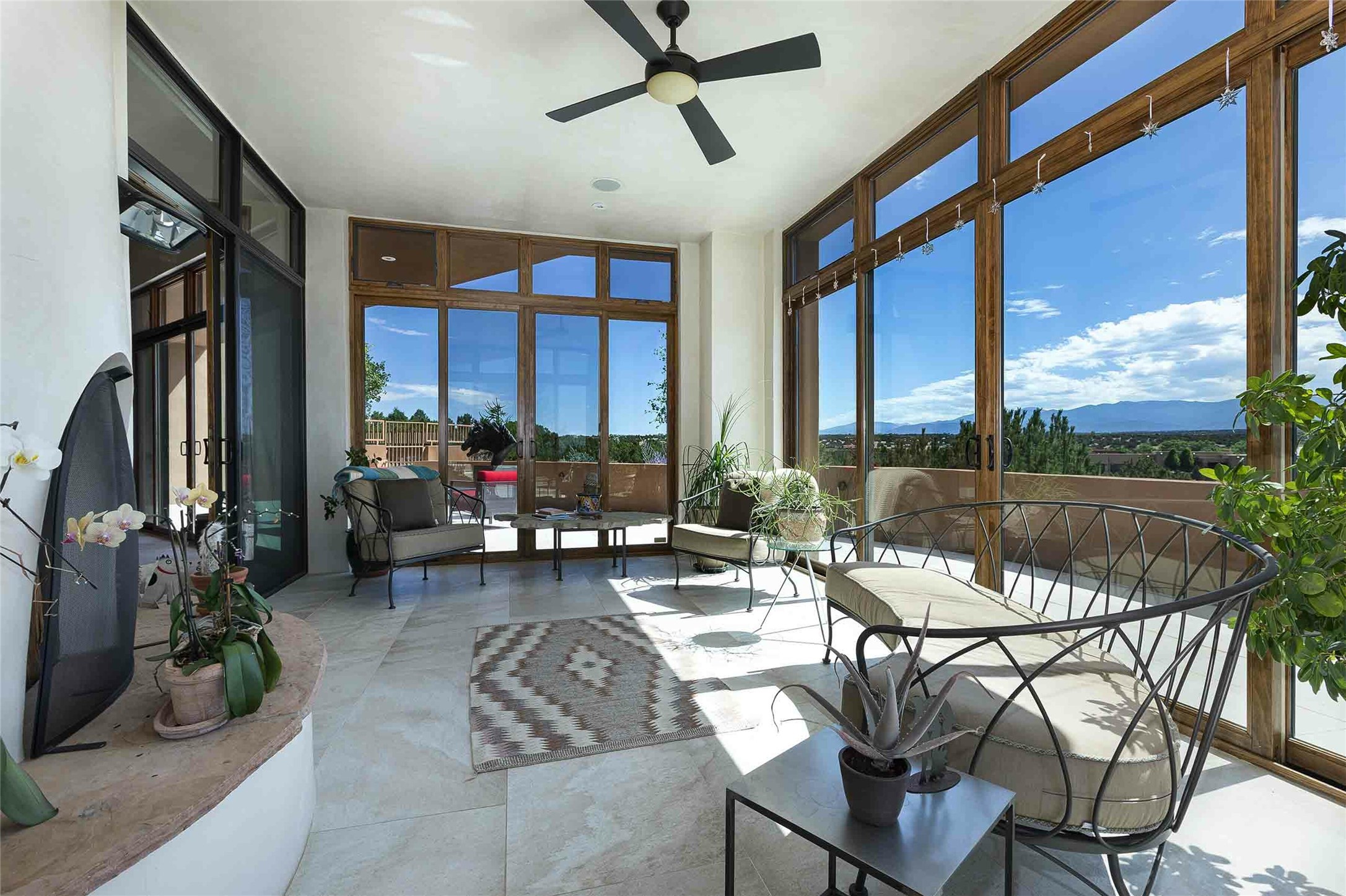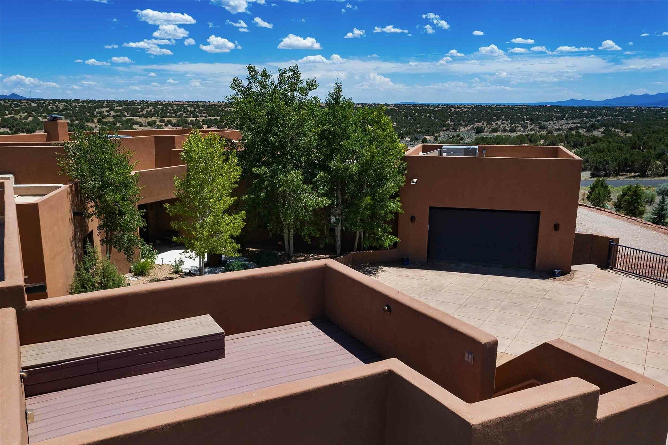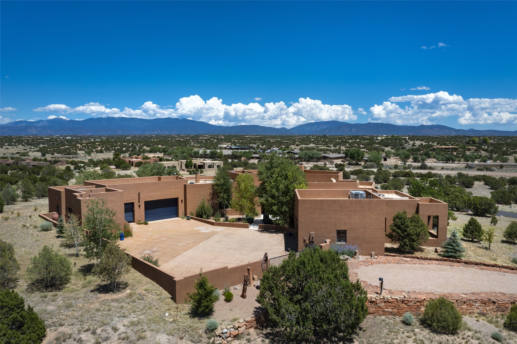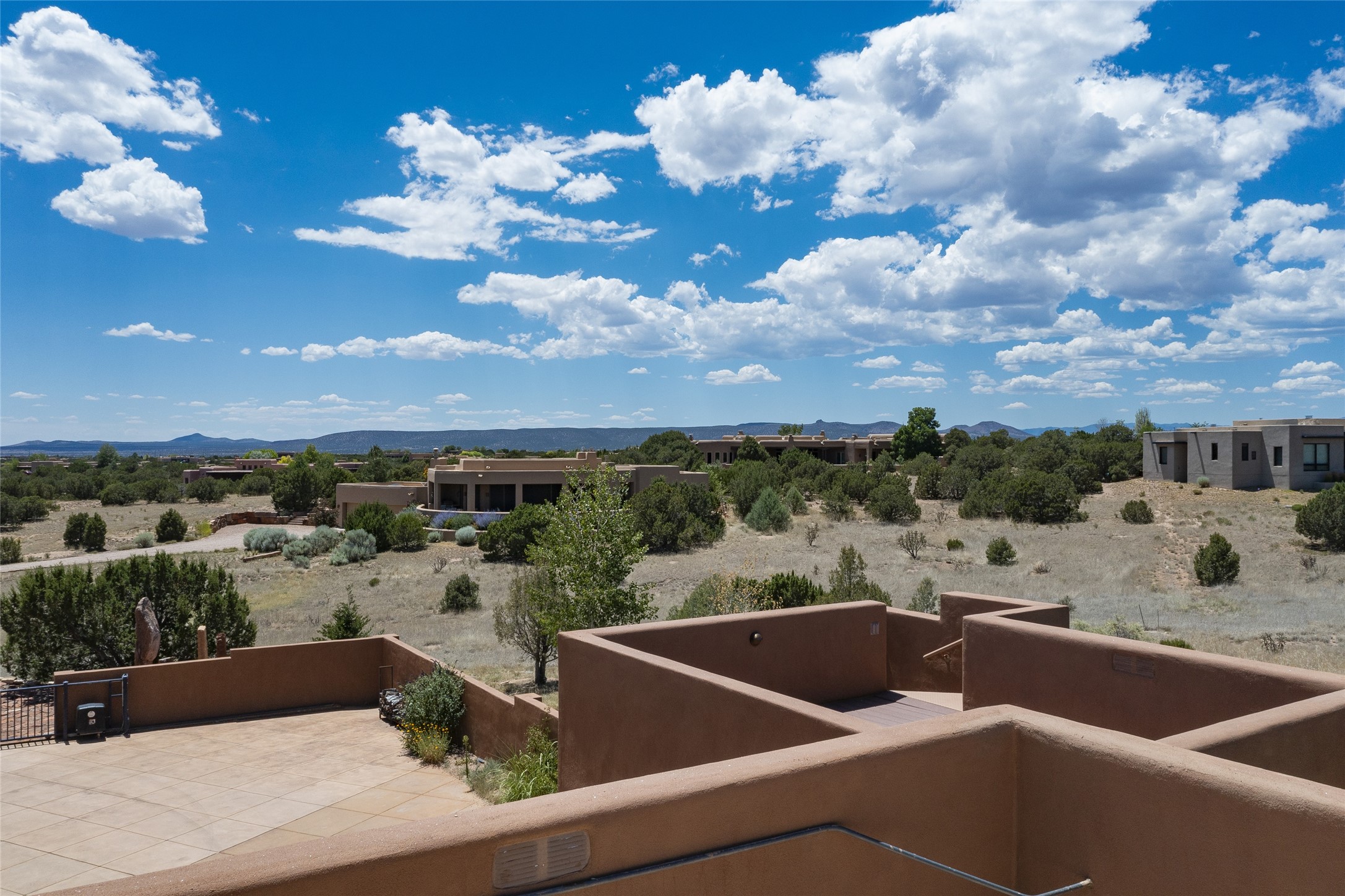 Experience the ultimate Santa Fe lifestyle. This rare, triumphant Tour de Force residence excites with the ultimate blend of sophisticated design and spectacular Sangre De Cristo, Ortiz and Sandia Mountain views. Perfectly sited on an elevated 1.8 acre view lot, this exquisite, single level residence with an independent guest house, roof deck, and a 5-car garage, built by renowned builder, Dave Jansen, designed by Richard Martinez, exemplifies the unique blend of extraordinary modern design with the true essence of Santa Fe. Upon entering through the welcoming, front entrance courtyard with a tranquil water feature, this home impresses and captivates with the stunning surround mountain views and a flexible floor plan, which seamlessly incorporates indoor and outdoor living at its finest. Ideal for guests and entertaining, the main residence offers 4,448 square feet, featuring a spacious open concept living room and dining room, with surround view windows, a glassed viewing room with a fireplace, and a well-appointed island kitchen complete with Wolf and Sub Zero appliances, a breakfast bar, butler's pantry, and an ideal wine room located directly off of the kitchen. The owner's suite delights with an intimate sitting room, fireplace, a private enclosed patio, and an updated luxurious bath with a soaking tub, walk-in shower, towel warming bars, and two large walk-in closets. The separate guest wing features its own living room with two private guest bedrooms, each with their own portal and a shared bath. Detached from the main residence is a spacious two-bedroom guest house, complete with its own bath, barista area, two enclosed patios and access to the roof deck. Exceptional features include 3,000 square feet of walled portal spaces, plaster walls, updated modern porcelain flooring throughout the main living areas and located within minutes to all facilities at The Club at Las Campanas.