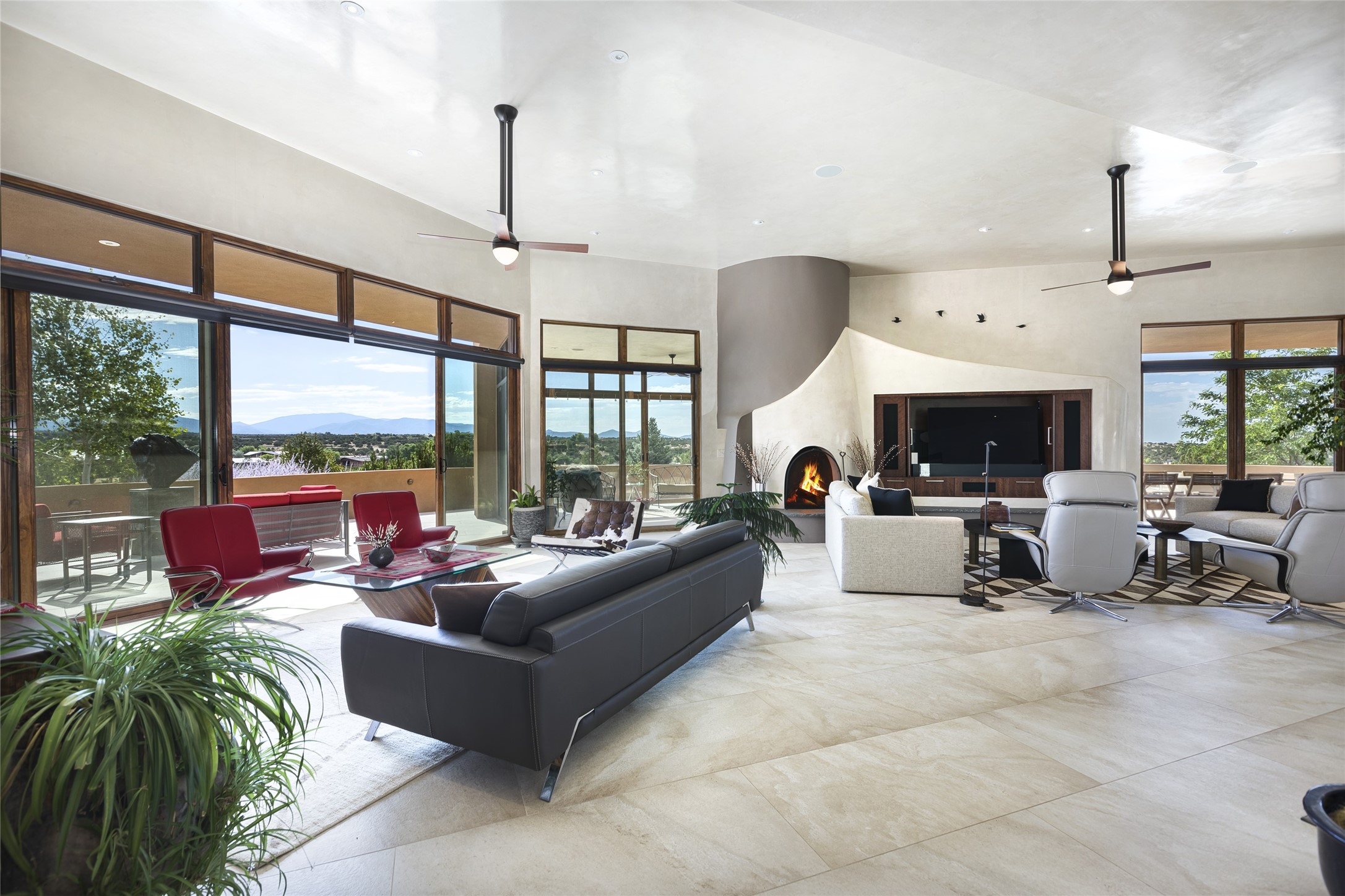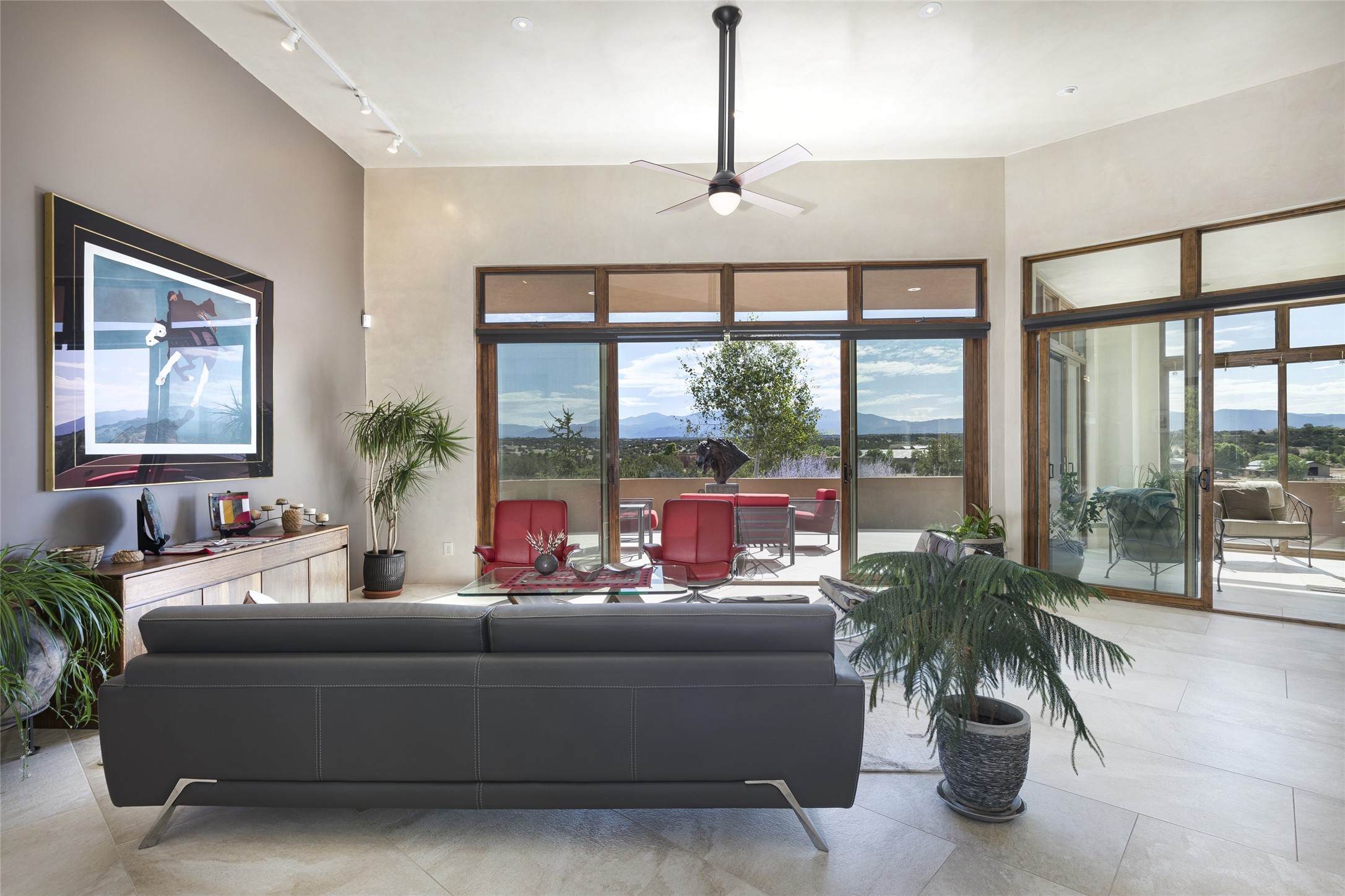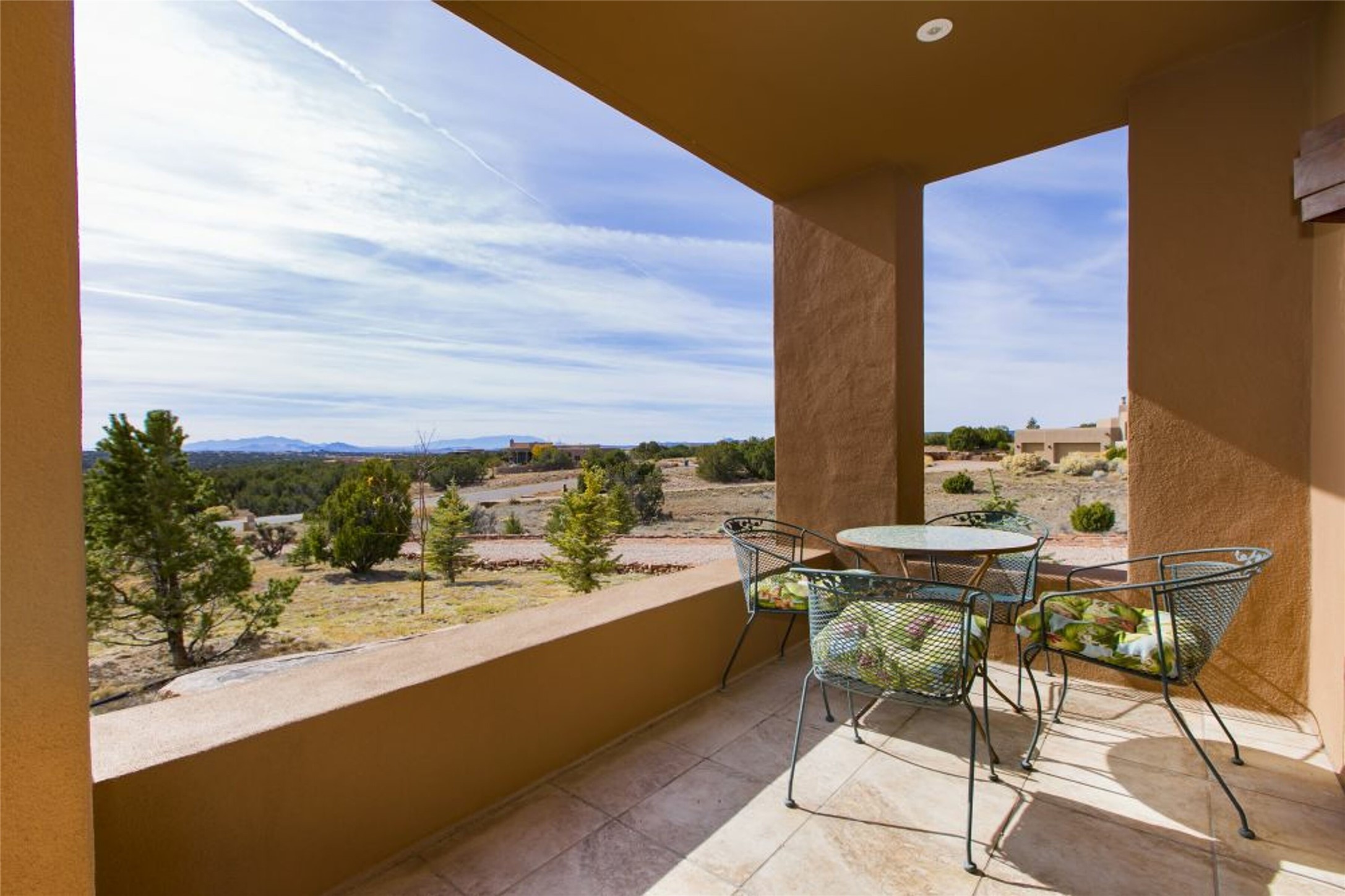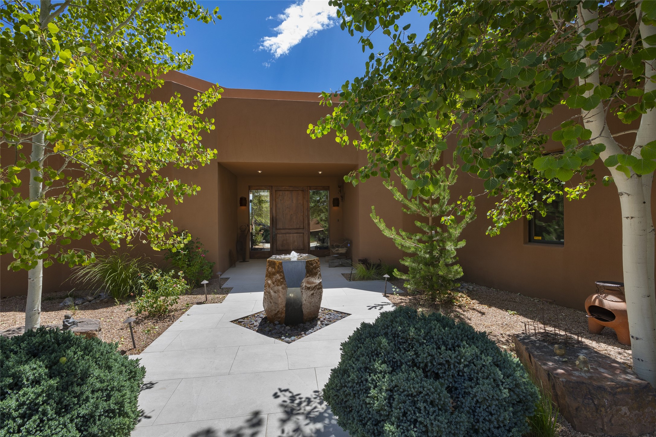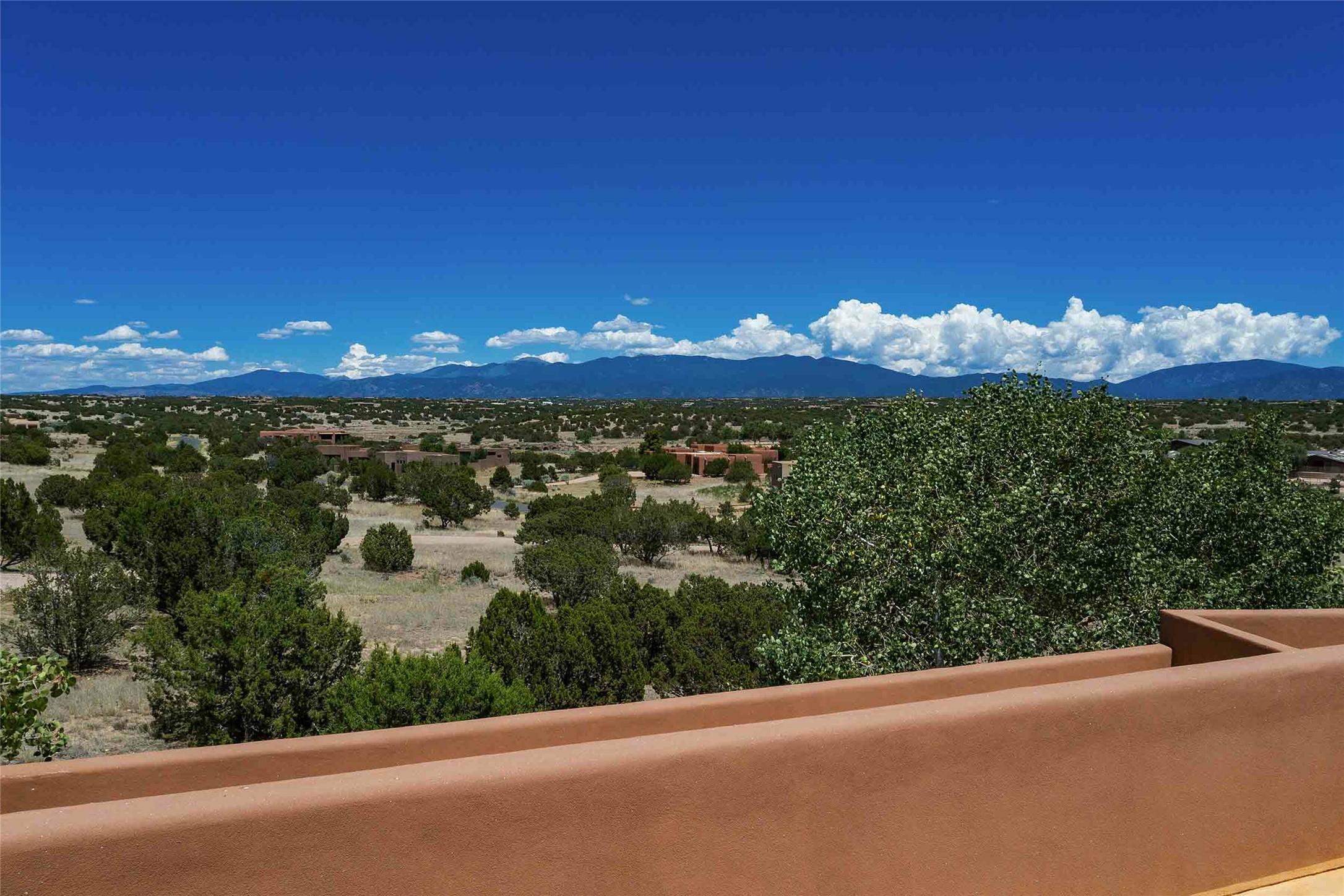 Experience the ultimate Santa Fe lifestyle. This rare, triumphant Tour de Force residence excites with the ultimate blend of sophisticated design and spectacular Sangre De Cristo, Ortiz and Sandia Mountain views. Perfectly sited on an elevated 1.8 acre view lot, this exquisite, single level residence with an independent guest house, roof deck, and a 5-car garage, built by renowned builder, Dave Jansen, designed by Richard Martinez, exemplifies the unique blend of extraordinary modern design with the true essence of Santa Fe. Upon entering through the welcoming, front entrance courtyard with a tranquil water feature, this home impresses and captivates with the stunning surround mountain views and a flexible floor plan, which seamlessly incorporates indoor and outdoor living at its finest. Ideal for guests and entertaining, the main residence offers 4,448 square feet, featuring a spacious open concept living room and dining room, with surround view windows, a glassed viewing room with a fireplace, and a well-appointed island kitchen complete with Wolf and Sub Zero appliances, a breakfast bar, butler's pantry, and an ideal wine room located directly off of the kitchen. The owner's suite delights with an intimate sitting room, fireplace, a private enclosed patio, and an updated luxurious bath with a soaking tub, walk-in shower, towel warming bars, and two large walk-in closets. The separate guest wing features its own living room with two private guest bedrooms, each with their own portal and a shared bath. Detached from the main residence is a spacious two-bedroom guest house, complete with its own bath, barista area, two enclosed patios and access to the roof deck. Exceptional features include 3,000 square feet of walled portal spaces, plaster walls, updated modern porcelain flooring throughout the main living areas and located within minutes to all facilities at The Club at Las Campanas.