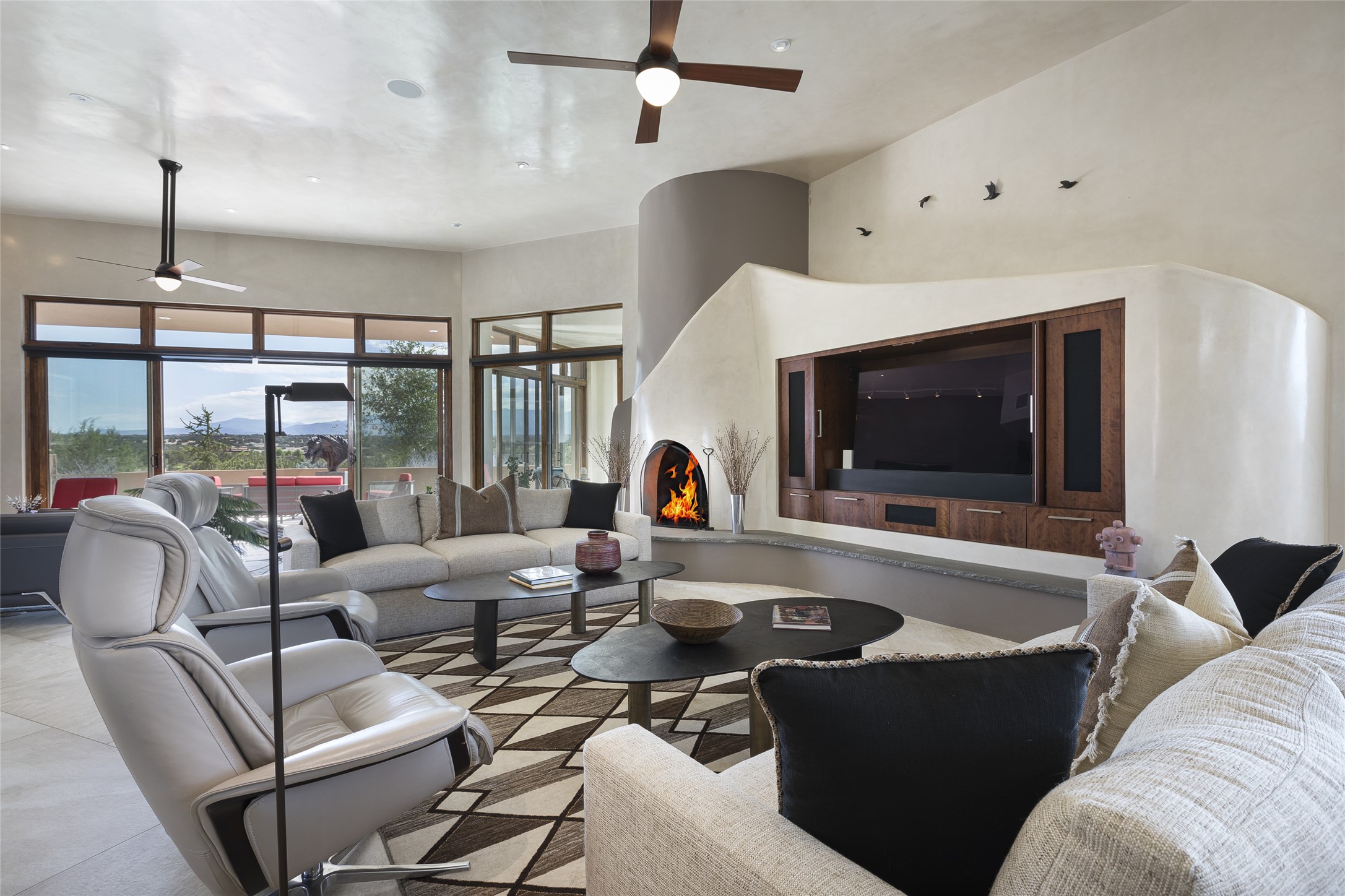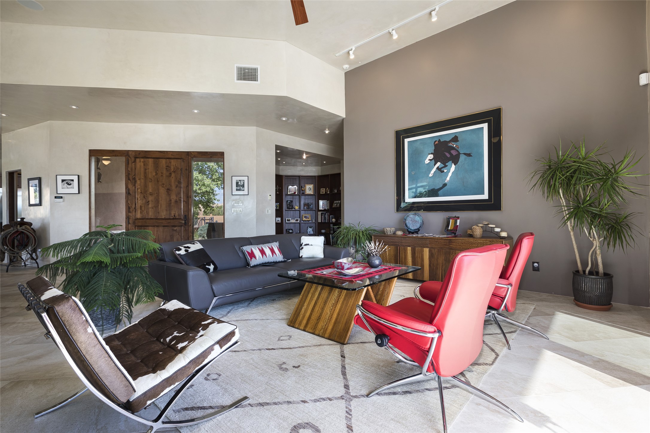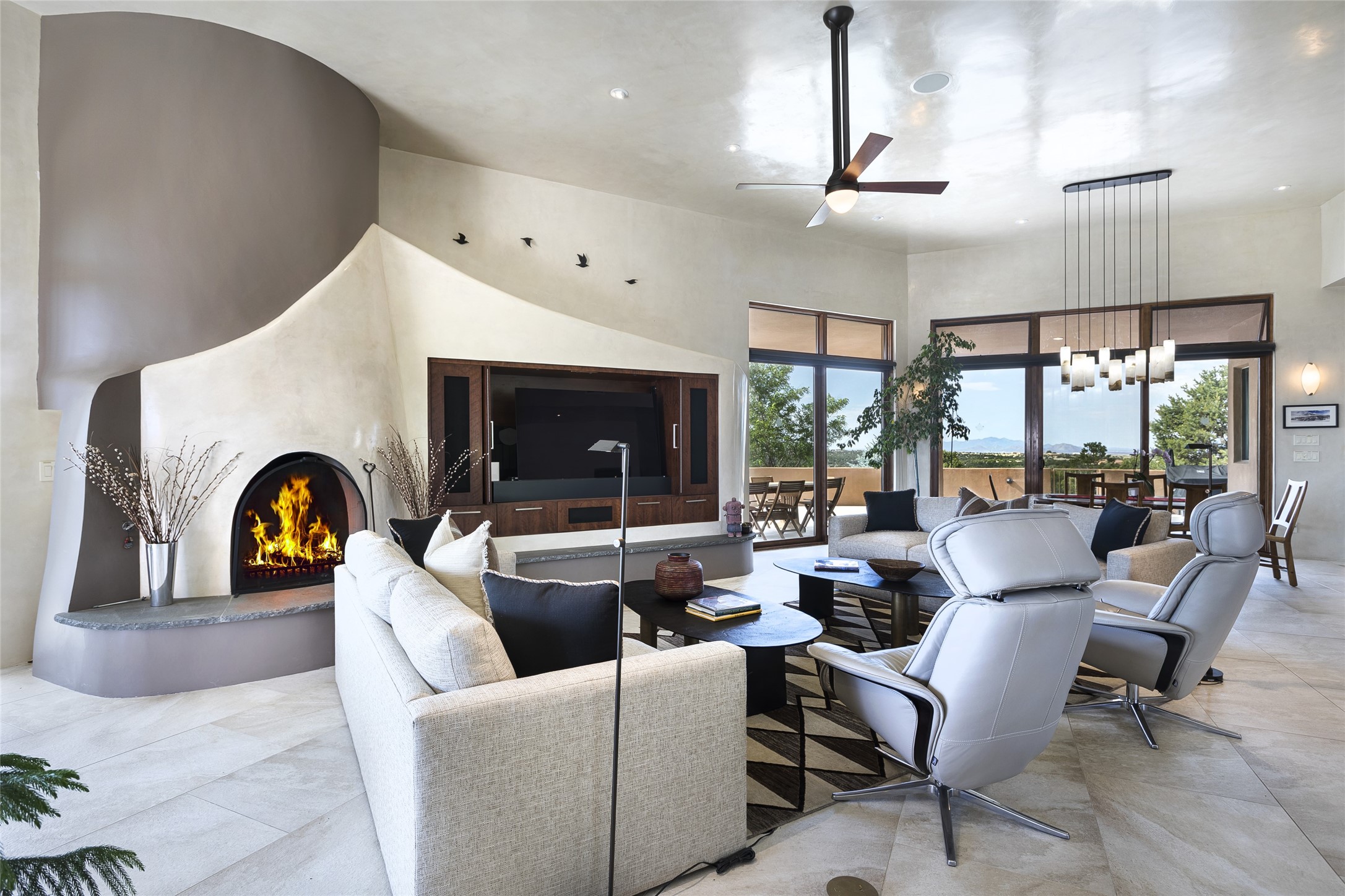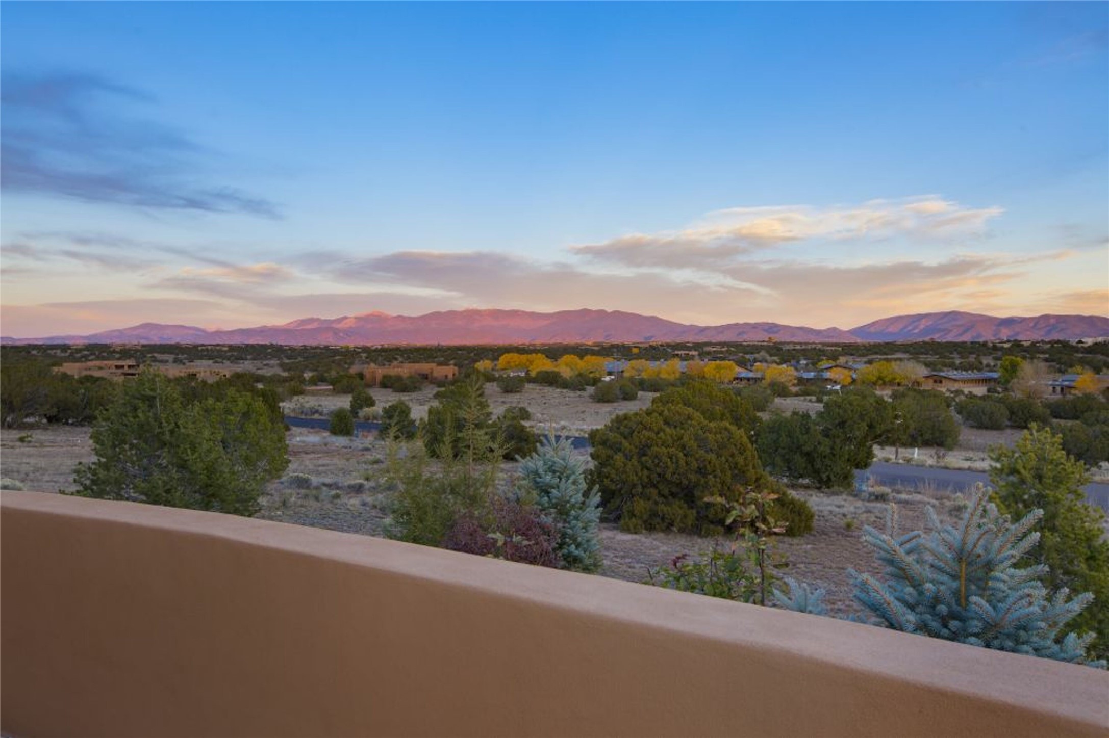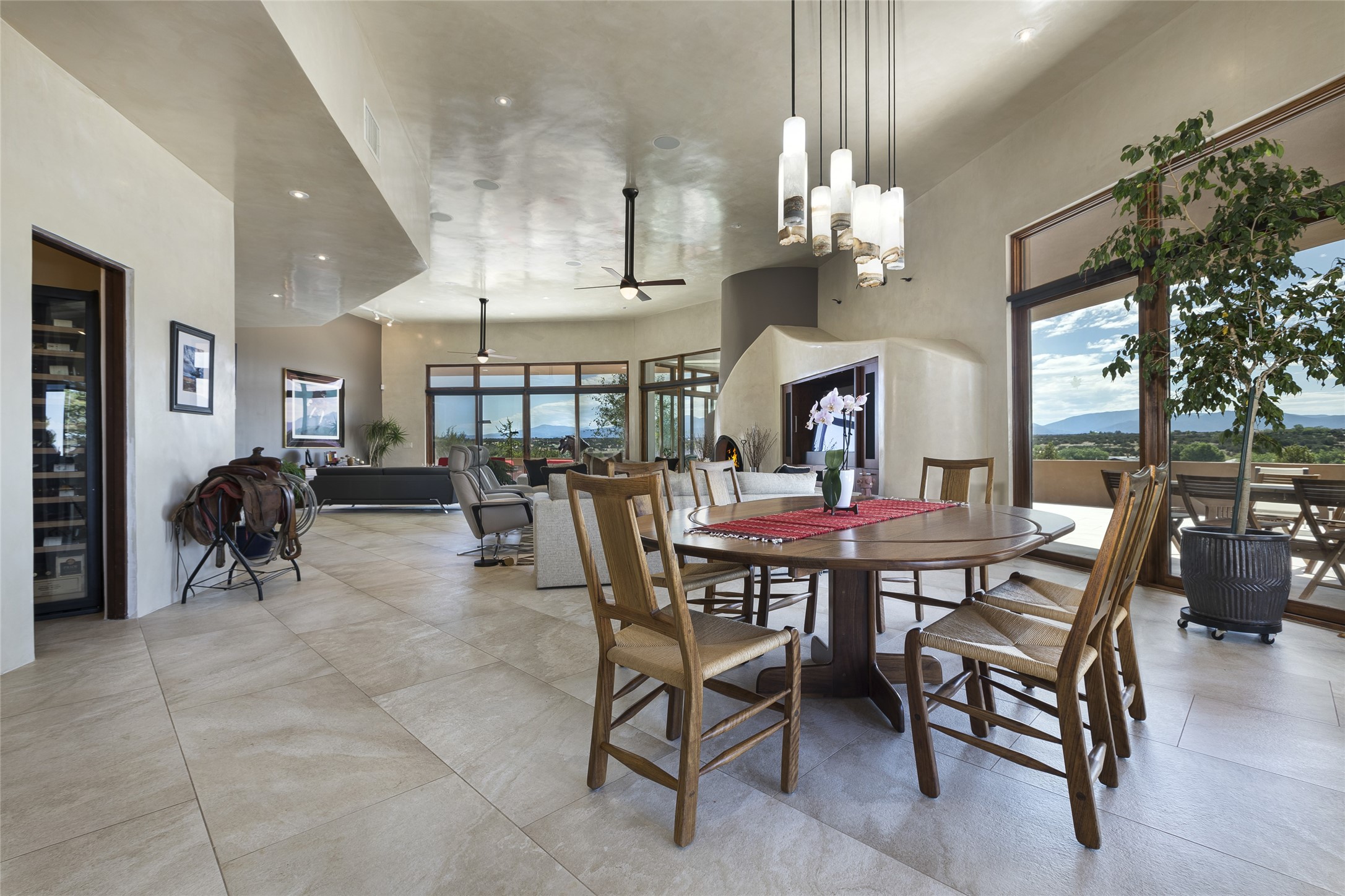 Experience the ultimate Santa Fe lifestyle. This rare, triumphant Tour de Force residence excites with the ultimate blend of sophisticated design and spectacular Sangre De Cristo, Ortiz and Sandia Mountain views. Perfectly sited on an elevated 1.8 acre view lot, this exquisite, single level residence with an independent guest house, roof deck, and a 5-car garage, built by renowned builder, Dave Jansen, designed by Richard Martinez, exemplifies the unique blend of extraordinary modern design with the true essence of Santa Fe. Upon entering through the welcoming, front entrance courtyard with a tranquil water feature, this home impresses and captivates with the stunning surround mountain views and a flexible floor plan, which seamlessly incorporates indoor and outdoor living at its finest. Ideal for guests and entertaining, the main residence offers 4,448 square feet, featuring a spacious open concept living room and dining room, with surround view windows, a glassed viewing room with a fireplace, and a well-appointed island kitchen complete with Wolf and Sub Zero appliances, a breakfast bar, butler's pantry, and an ideal wine room located directly off of the kitchen. The owner's suite delights with an intimate sitting room, fireplace, a private enclosed patio, and an updated luxurious bath with a soaking tub, walk-in shower, towel warming bars, and two large walk-in closets. The separate guest wing features its own living room with two private guest bedrooms, each with their own portal and a shared bath. Detached from the main residence is a spacious two-bedroom guest house, complete with its own bath, barista area, two enclosed patios and access to the roof deck. Exceptional features include 3,000 square feet of walled portal spaces, plaster walls, updated modern porcelain flooring throughout the main living areas and located within minutes to all facilities at The Club at Las Campanas.