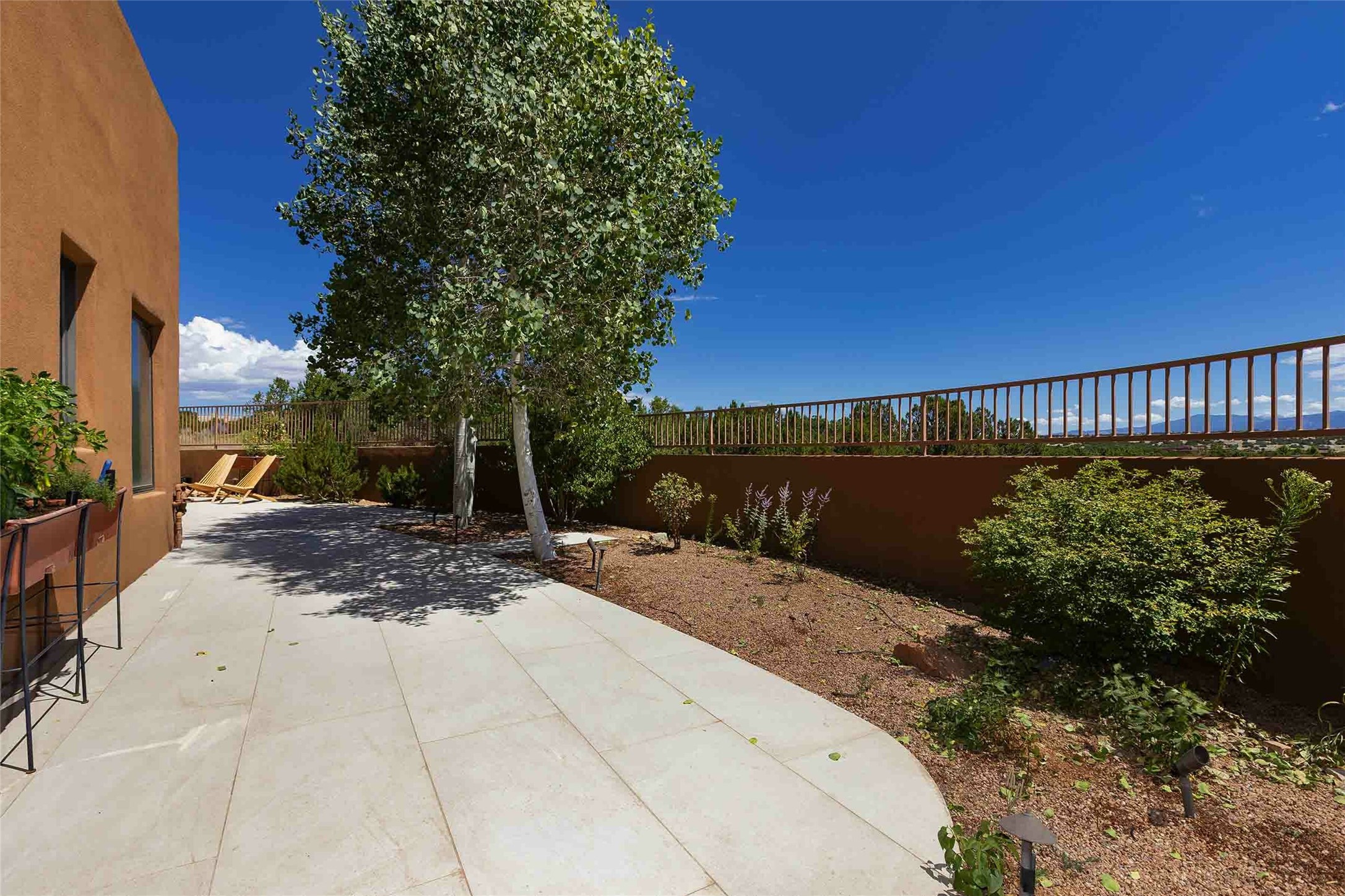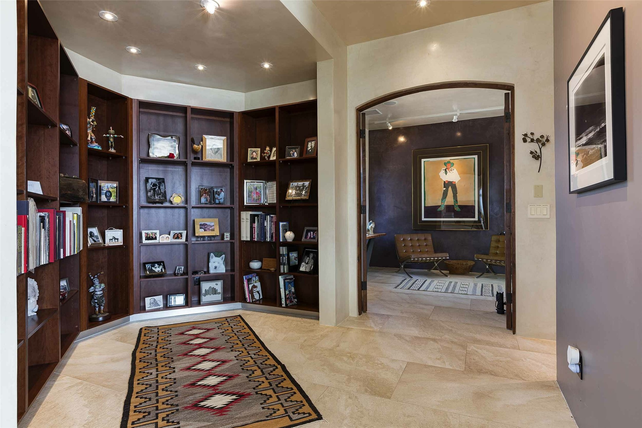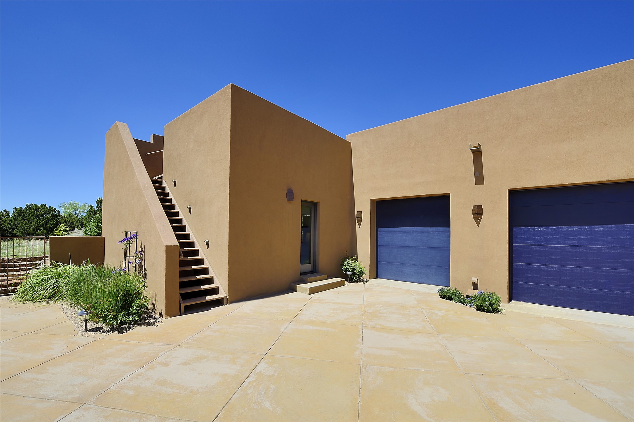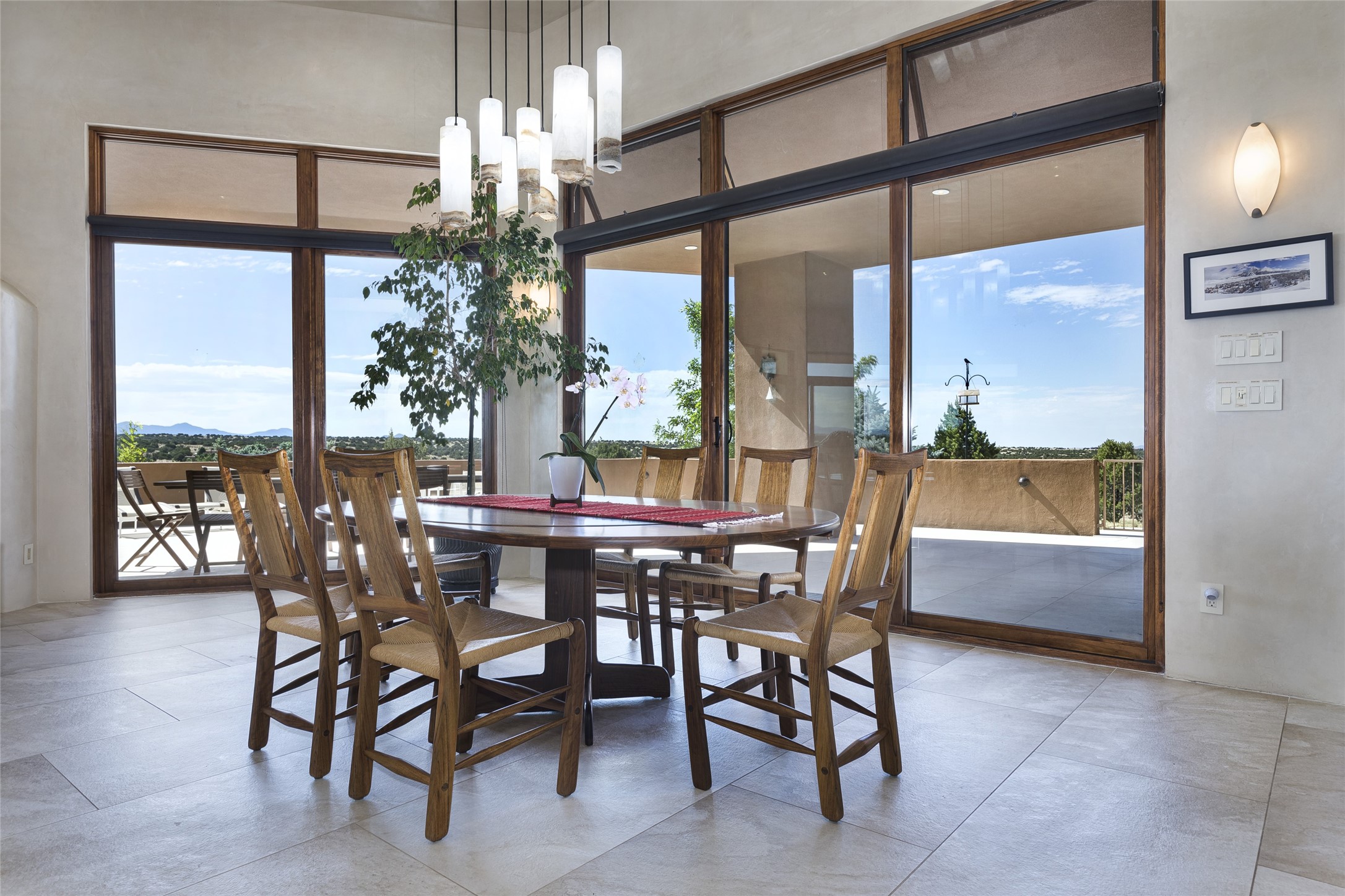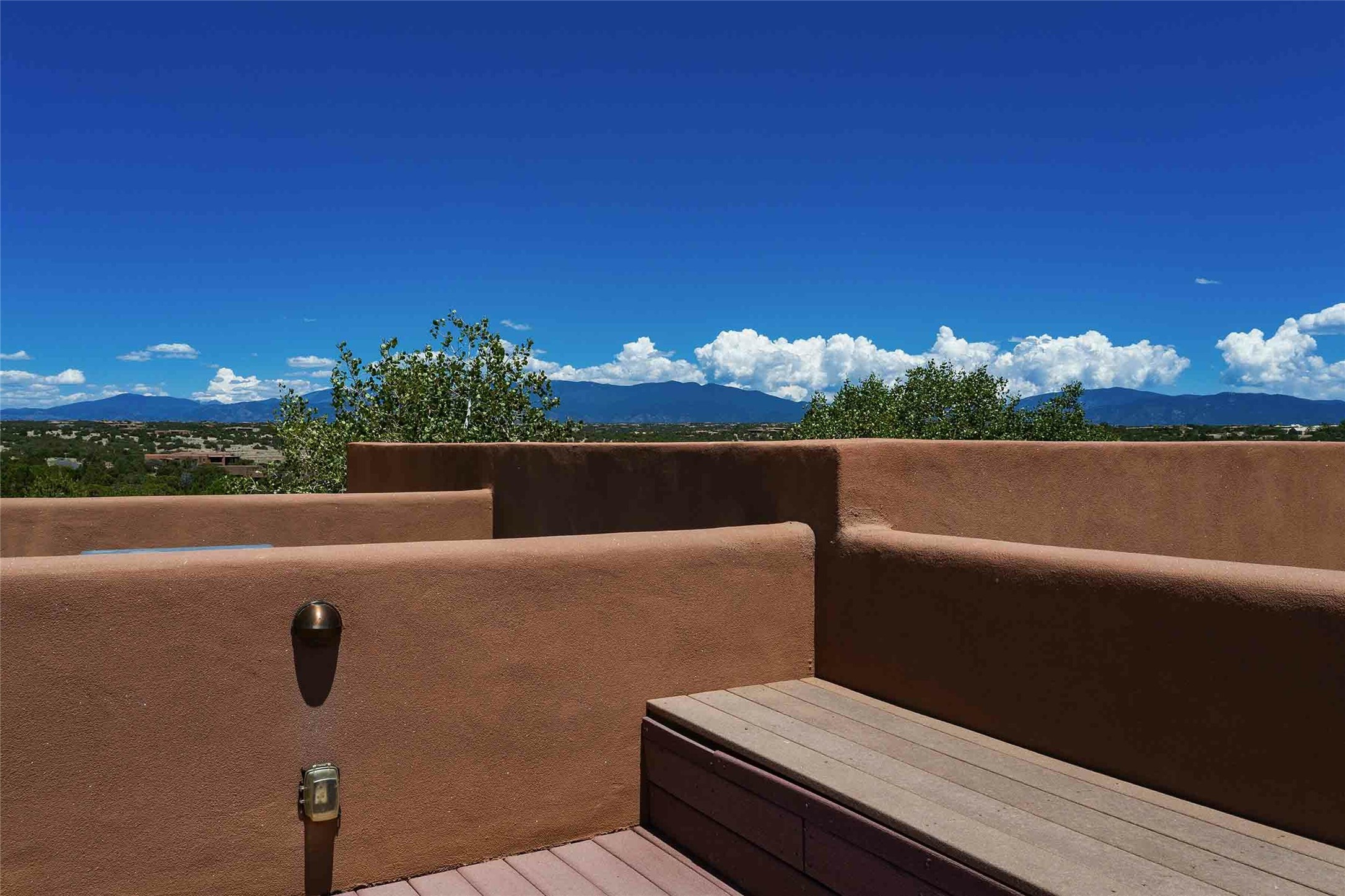 Experience the ultimate Santa Fe lifestyle. This rare, triumphant Tour de Force residence excites with the ultimate blend of sophisticated design and spectacular Sangre De Cristo, Ortiz and Sandia Mountain views. Perfectly sited on an elevated 1.8 acre view lot, this exquisite, single level residence with an independent guest house, roof deck, and a 5-car garage, built by renowned builder, Dave Jansen, designed by Richard Martinez, exemplifies the unique blend of extraordinary modern design with the true essence of Santa Fe. Upon entering through the welcoming, front entrance courtyard with a tranquil water feature, this home impresses and captivates with the stunning surround mountain views and a flexible floor plan, which seamlessly incorporates indoor and outdoor living at its finest. Ideal for guests and entertaining, the main residence offers 4,448 square feet, featuring a spacious open concept living room and dining room, with surround view windows, a glassed viewing room with a fireplace, and a well-appointed island kitchen complete with Wolf and Sub Zero appliances, a breakfast bar, butler's pantry, and an ideal wine room located directly off of the kitchen. The owner's suite delights with an intimate sitting room, fireplace, a private enclosed patio, and an updated luxurious bath with a soaking tub, walk-in shower, towel warming bars, and two large walk-in closets. The separate guest wing features its own living room with two private guest bedrooms, each with their own portal and a shared bath. Detached from the main residence is a spacious two-bedroom guest house, complete with its own bath, barista area, two enclosed patios and access to the roof deck. Exceptional features include 3,000 square feet of walled portal spaces, plaster walls, updated modern porcelain flooring throughout the main living areas and located within minutes to all facilities at The Club at Las Campanas.