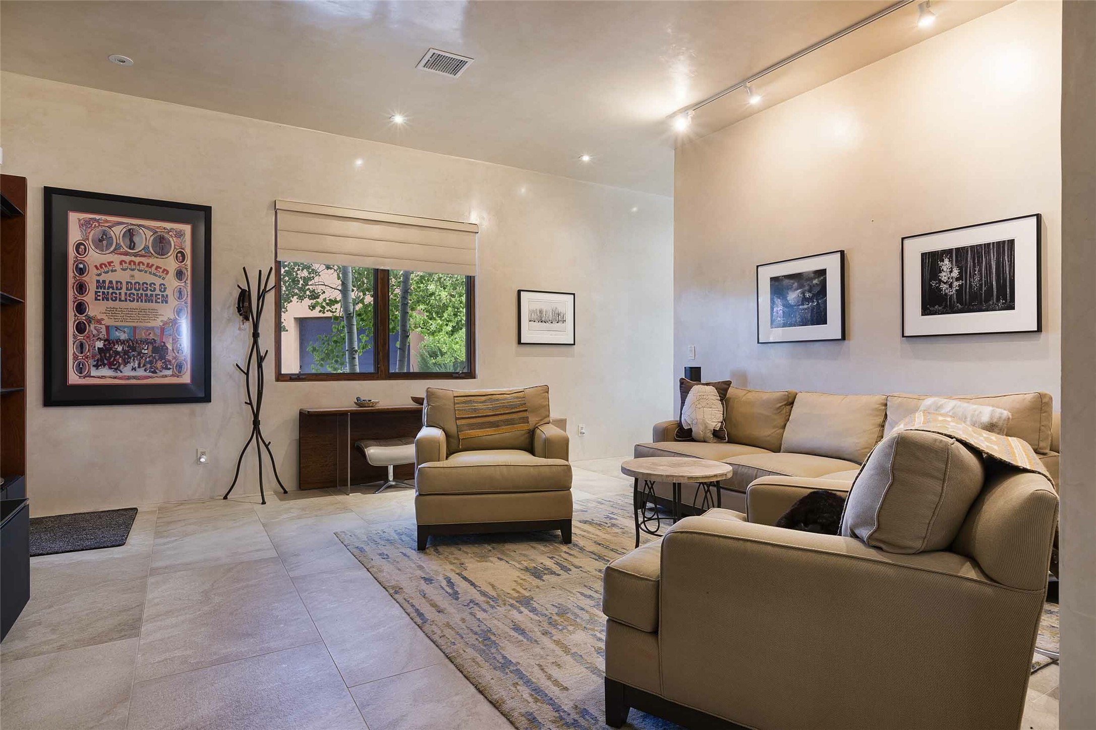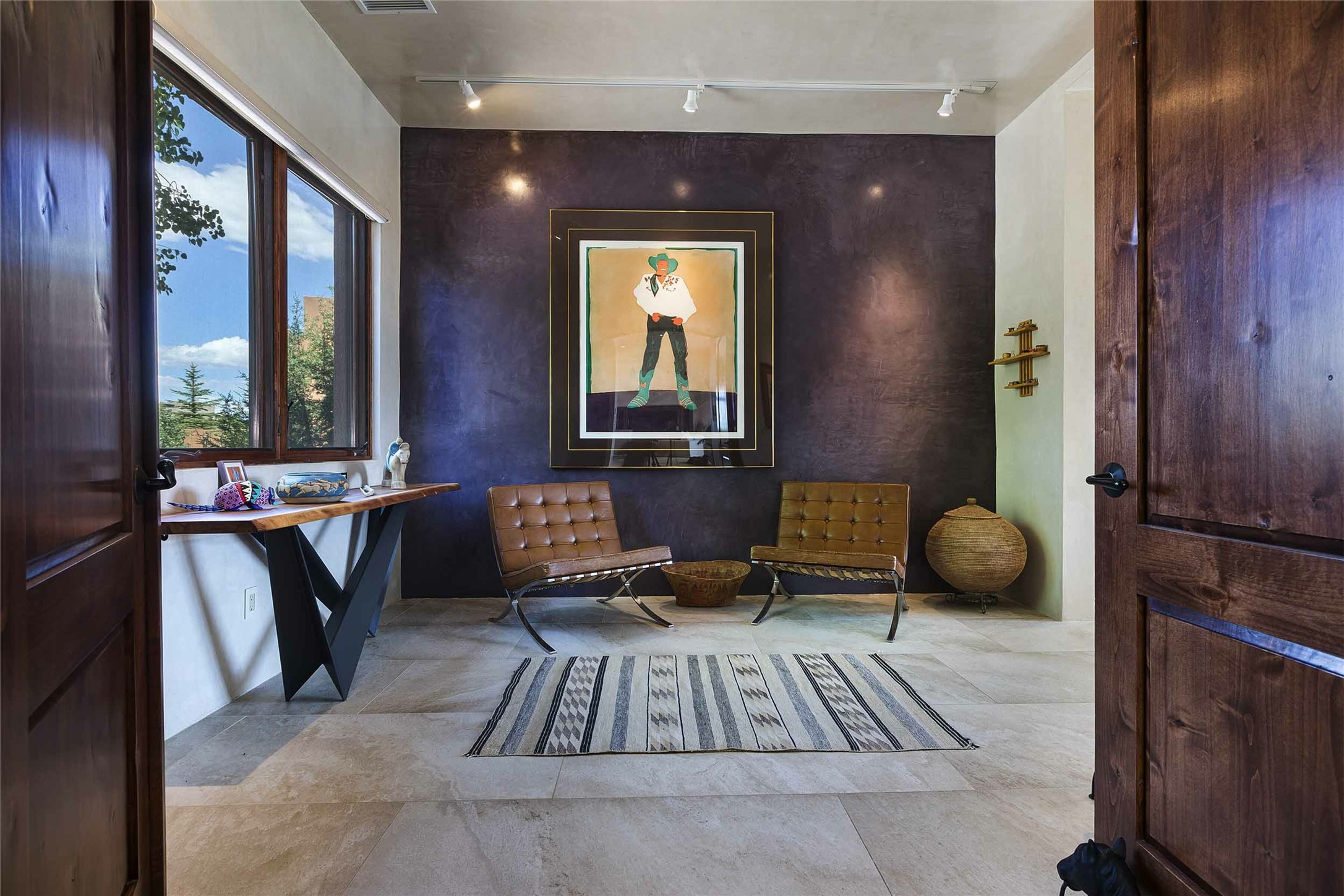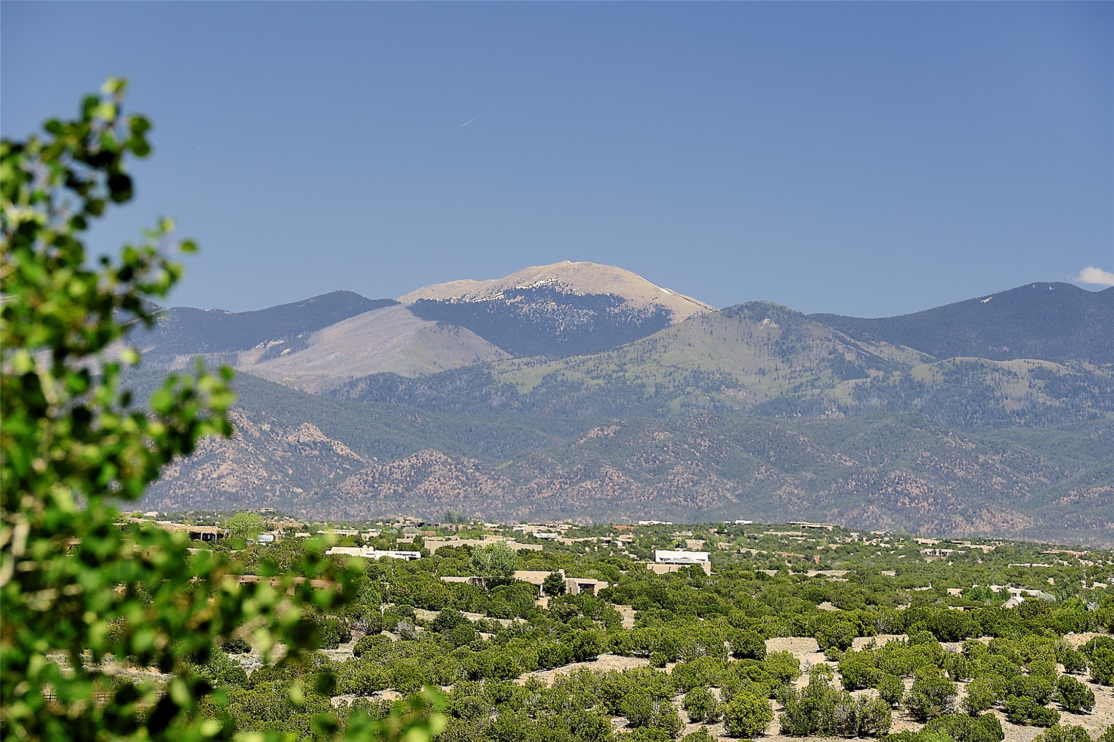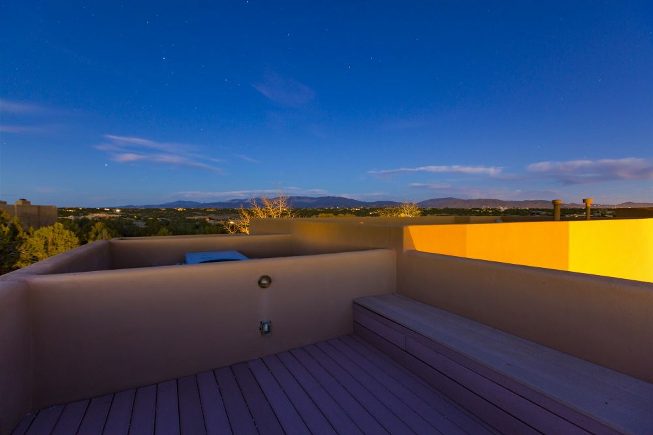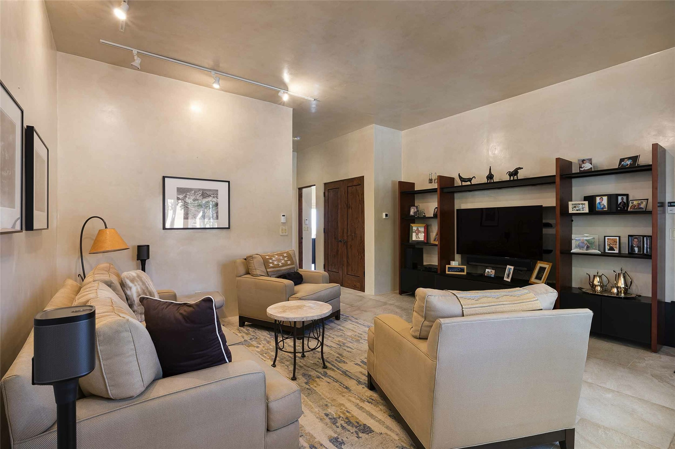 Experience the ultimate Santa Fe lifestyle. This rare, triumphant Tour de Force residence excites with the ultimate blend of sophisticated design and spectacular Sangre De Cristo, Ortiz and Sandia Mountain views. Perfectly sited on an elevated 1.8 acre view lot, this exquisite, single level residence with an independent guest house, roof deck, and a 5-car garage, built by renowned builder, Dave Jansen, designed by Richard Martinez, exemplifies the unique blend of extraordinary modern design with the true essence of Santa Fe. Upon entering through the welcoming, front entrance courtyard with a tranquil water feature, this home impresses and captivates with the stunning surround mountain views and a flexible floor plan, which seamlessly incorporates indoor and outdoor living at its finest. Ideal for guests and entertaining, the main residence offers 4,448 square feet, featuring a spacious open concept living room and dining room, with surround view windows, a glassed viewing room with a fireplace, and a well-appointed island kitchen complete with Wolf and Sub Zero appliances, a breakfast bar, butler's pantry, and an ideal wine room located directly off of the kitchen. The owner's suite delights with an intimate sitting room, fireplace, a private enclosed patio, and an updated luxurious bath with a soaking tub, walk-in shower, towel warming bars, and two large walk-in closets. The separate guest wing features its own living room with two private guest bedrooms, each with their own portal and a shared bath. Detached from the main residence is a spacious two-bedroom guest house, complete with its own bath, barista area, two enclosed patios and access to the roof deck. Exceptional features include 3,000 square feet of walled portal spaces, plaster walls, updated modern porcelain flooring throughout the main living areas and located within minutes to all facilities at The Club at Las Campanas.