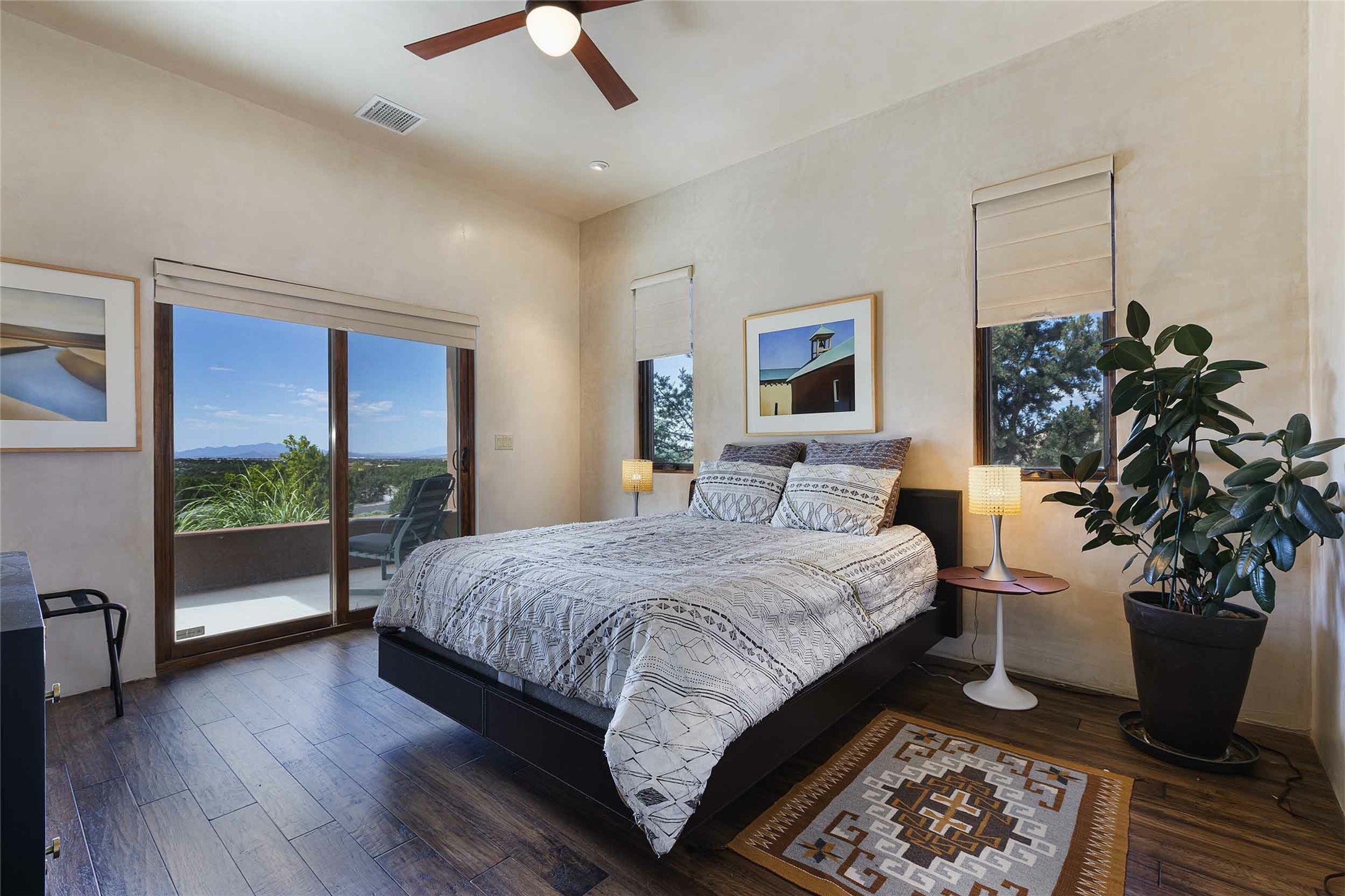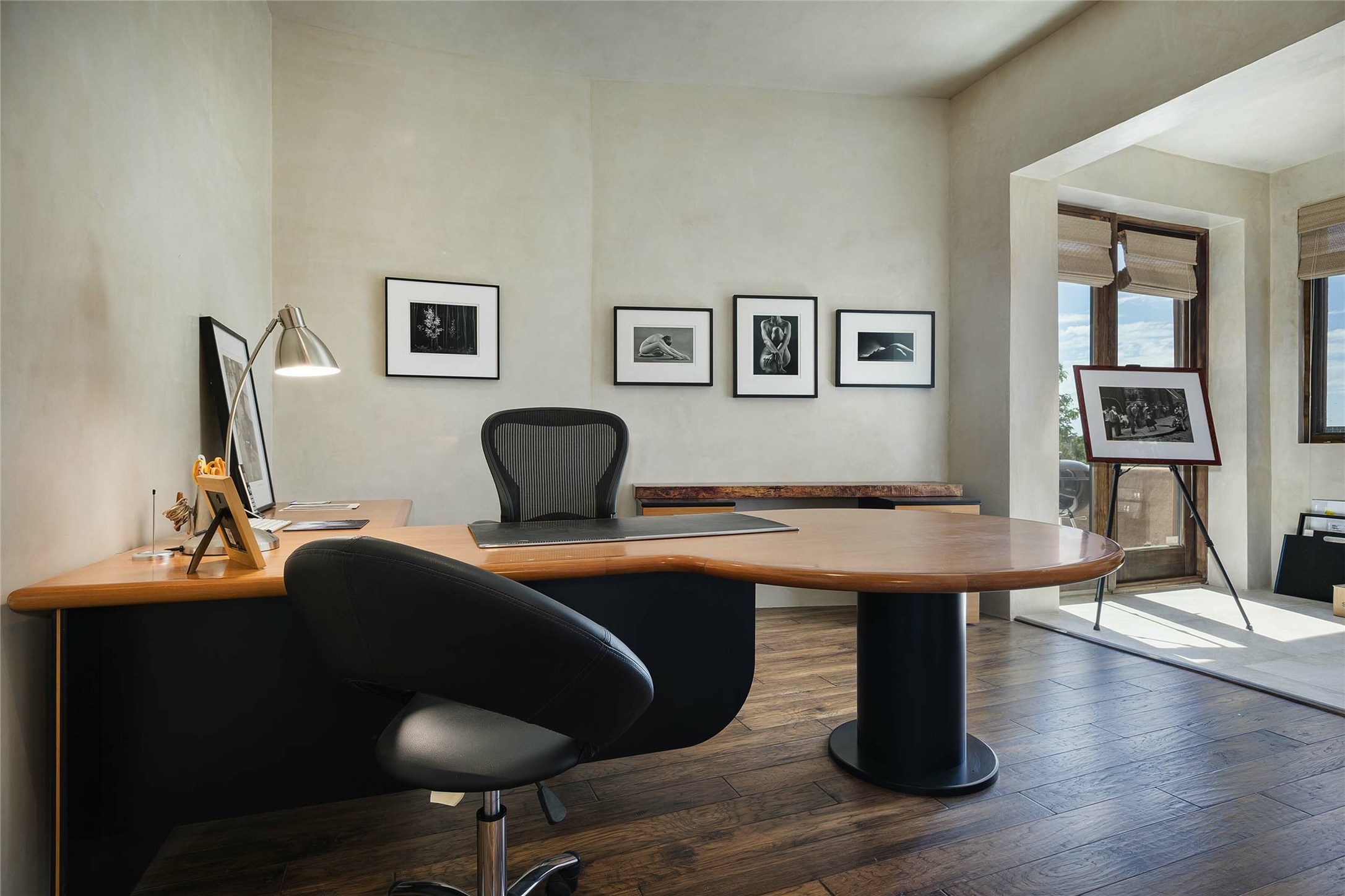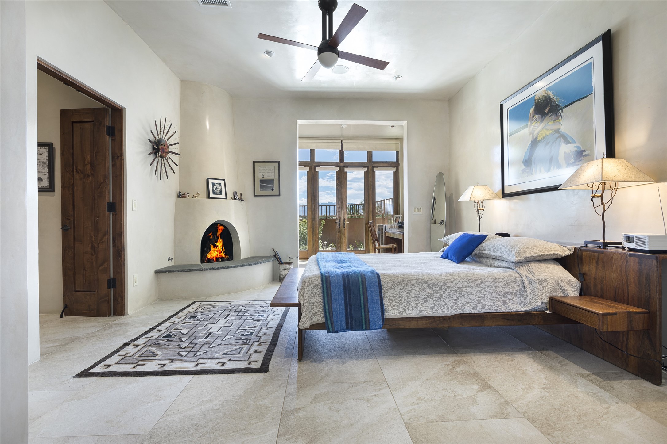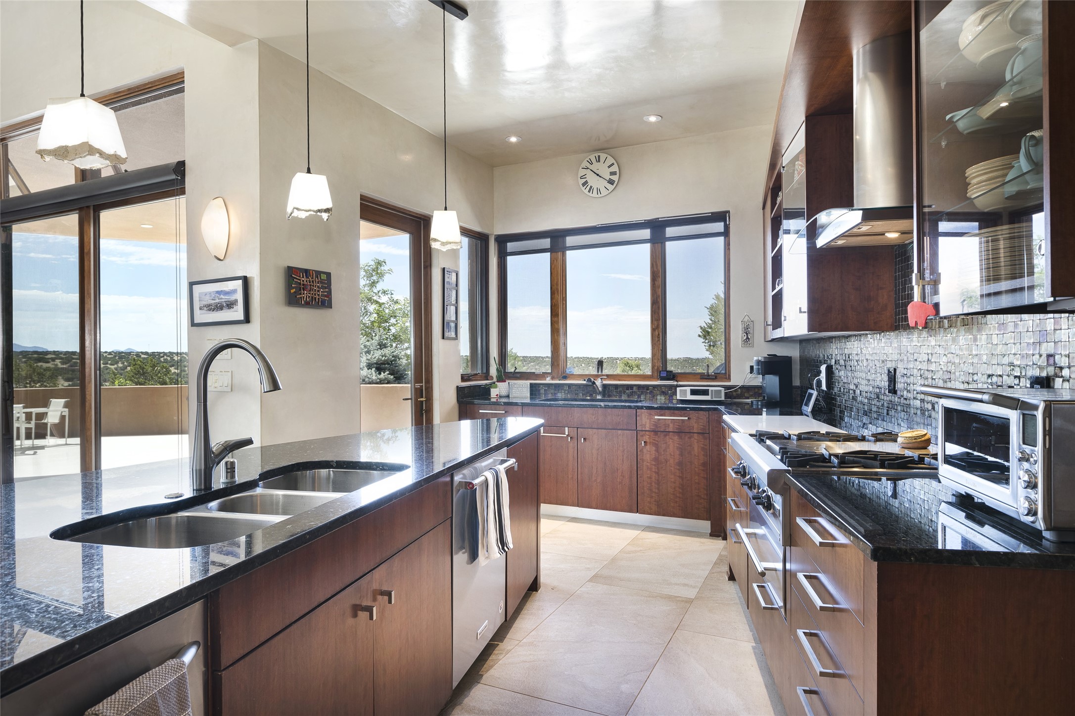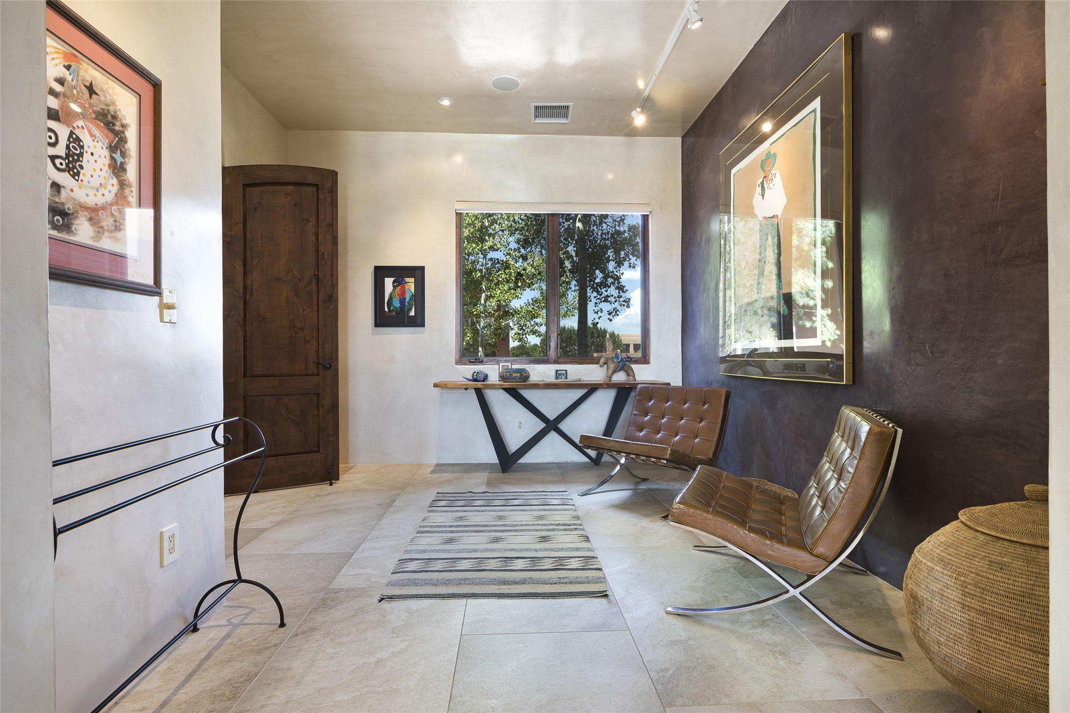 Experience the ultimate Santa Fe lifestyle. This rare, triumphant Tour de Force residence excites with the ultimate blend of sophisticated design and spectacular Sangre De Cristo, Ortiz and Sandia Mountain views. Perfectly sited on an elevated 1.8 acre view lot, this exquisite, single level residence with an independent guest house, roof deck, and a 5-car garage, built by renowned builder, Dave Jansen, designed by Richard Martinez, exemplifies the unique blend of extraordinary modern design with the true essence of Santa Fe. Upon entering through the welcoming, front entrance courtyard with a tranquil water feature, this home impresses and captivates with the stunning surround mountain views and a flexible floor plan, which seamlessly incorporates indoor and outdoor living at its finest. Ideal for guests and entertaining, the main residence offers 4,448 square feet, featuring a spacious open concept living room and dining room, with surround view windows, a glassed viewing room with a fireplace, and a well-appointed island kitchen complete with Wolf and Sub Zero appliances, a breakfast bar, butler's pantry, and an ideal wine room located directly off of the kitchen. The owner's suite delights with an intimate sitting room, fireplace, a private enclosed patio, and an updated luxurious bath with a soaking tub, walk-in shower, towel warming bars, and two large walk-in closets. The separate guest wing features its own living room with two private guest bedrooms, each with their own portal and a shared bath. Detached from the main residence is a spacious two-bedroom guest house, complete with its own bath, barista area, two enclosed patios and access to the roof deck. Exceptional features include 3,000 square feet of walled portal spaces, plaster walls, updated modern porcelain flooring throughout the main living areas and located within minutes to all facilities at The Club at Las Campanas.
