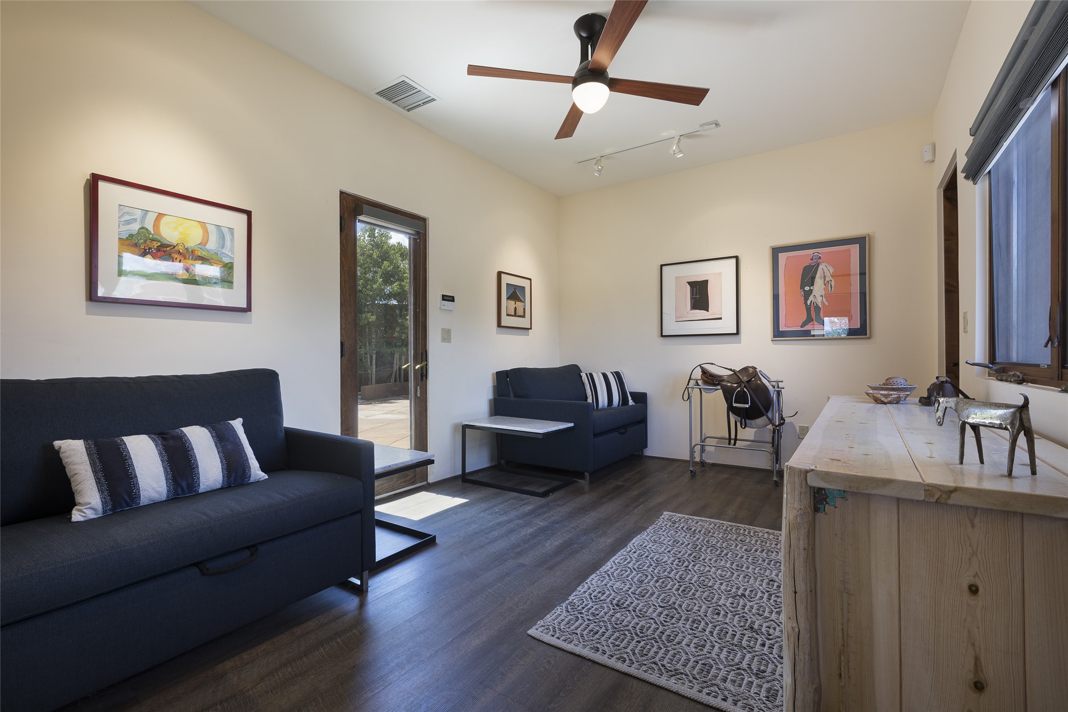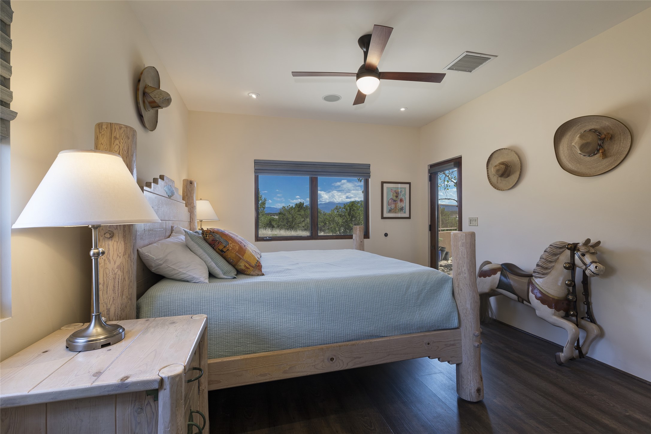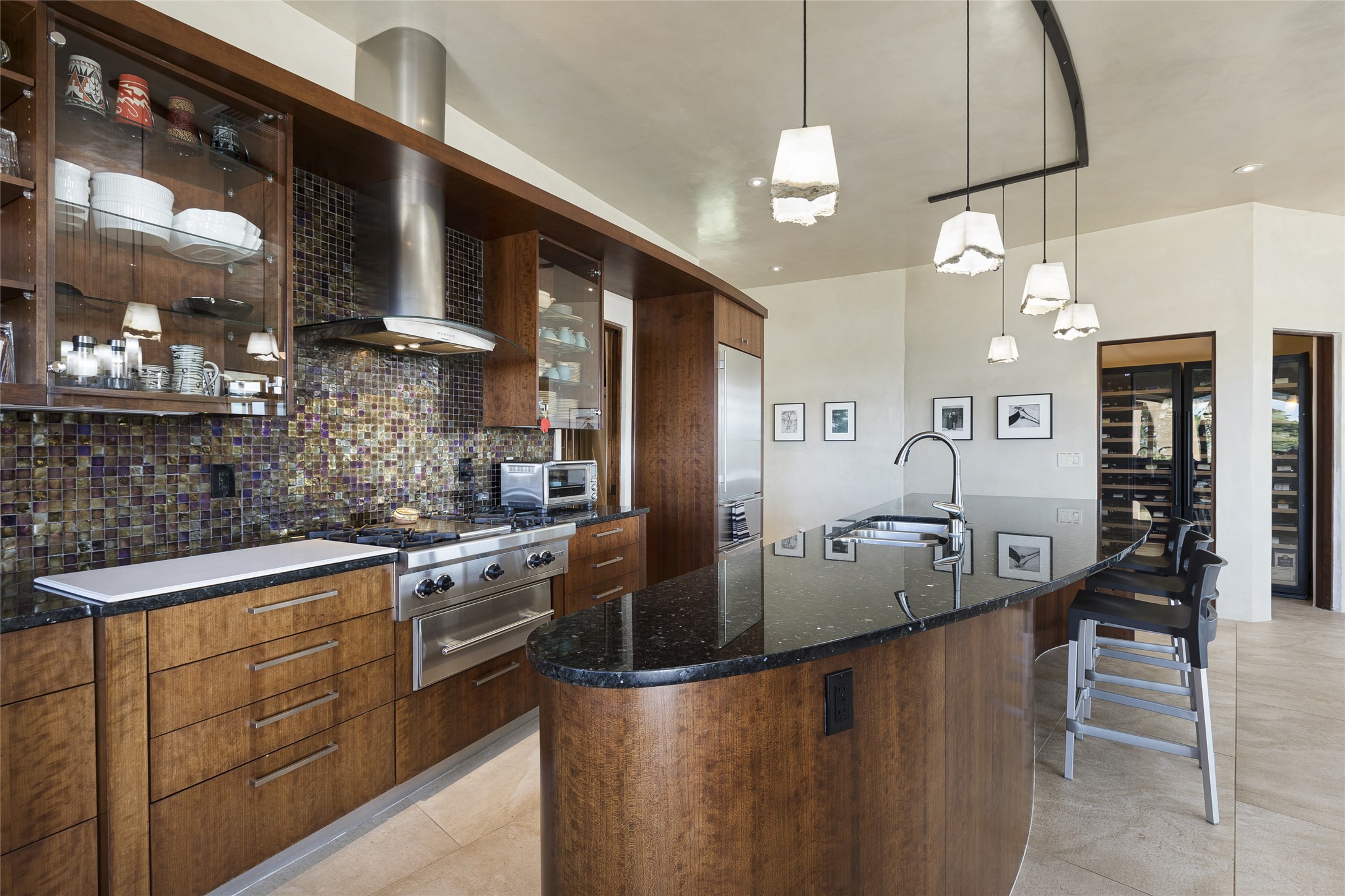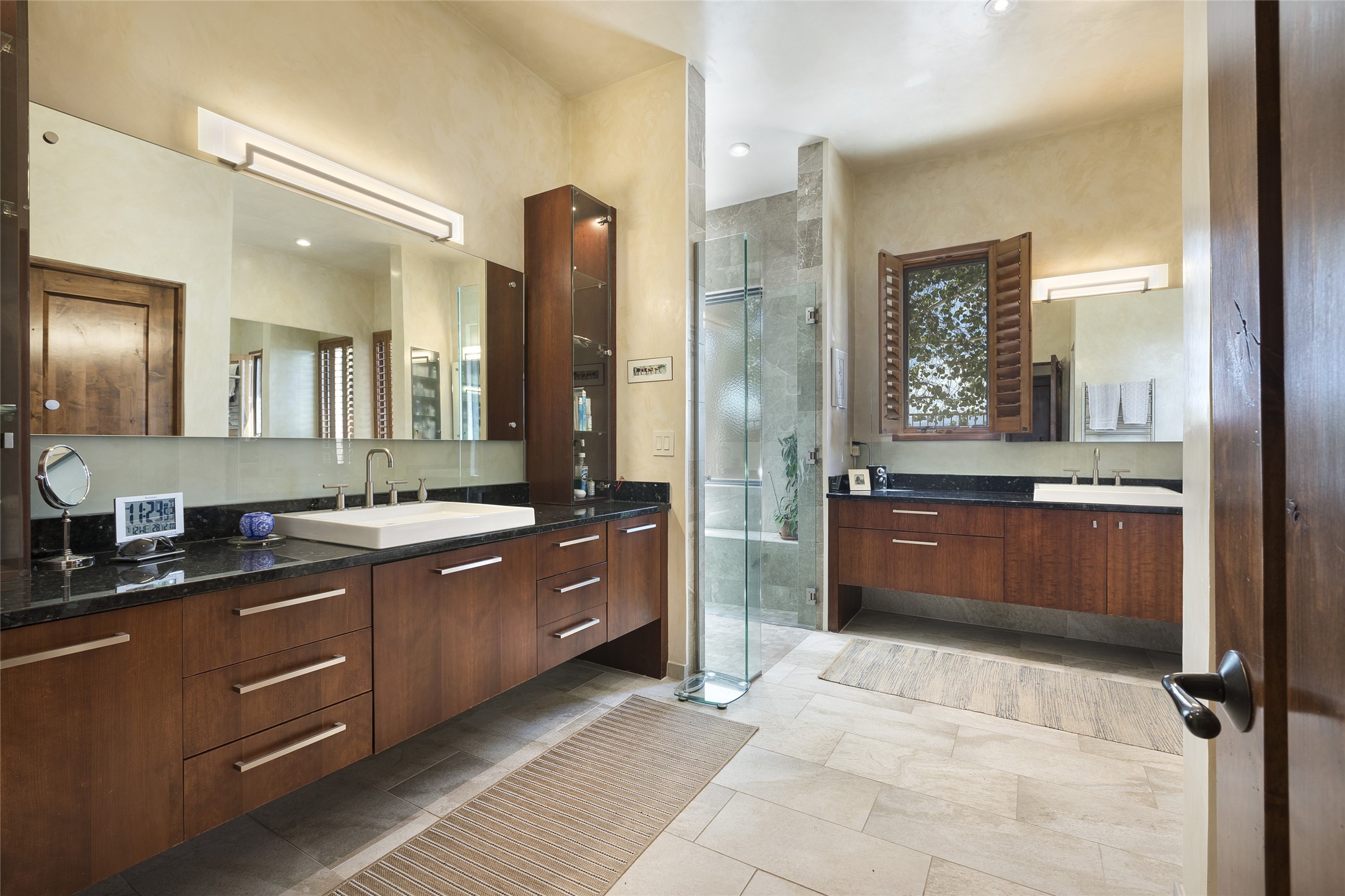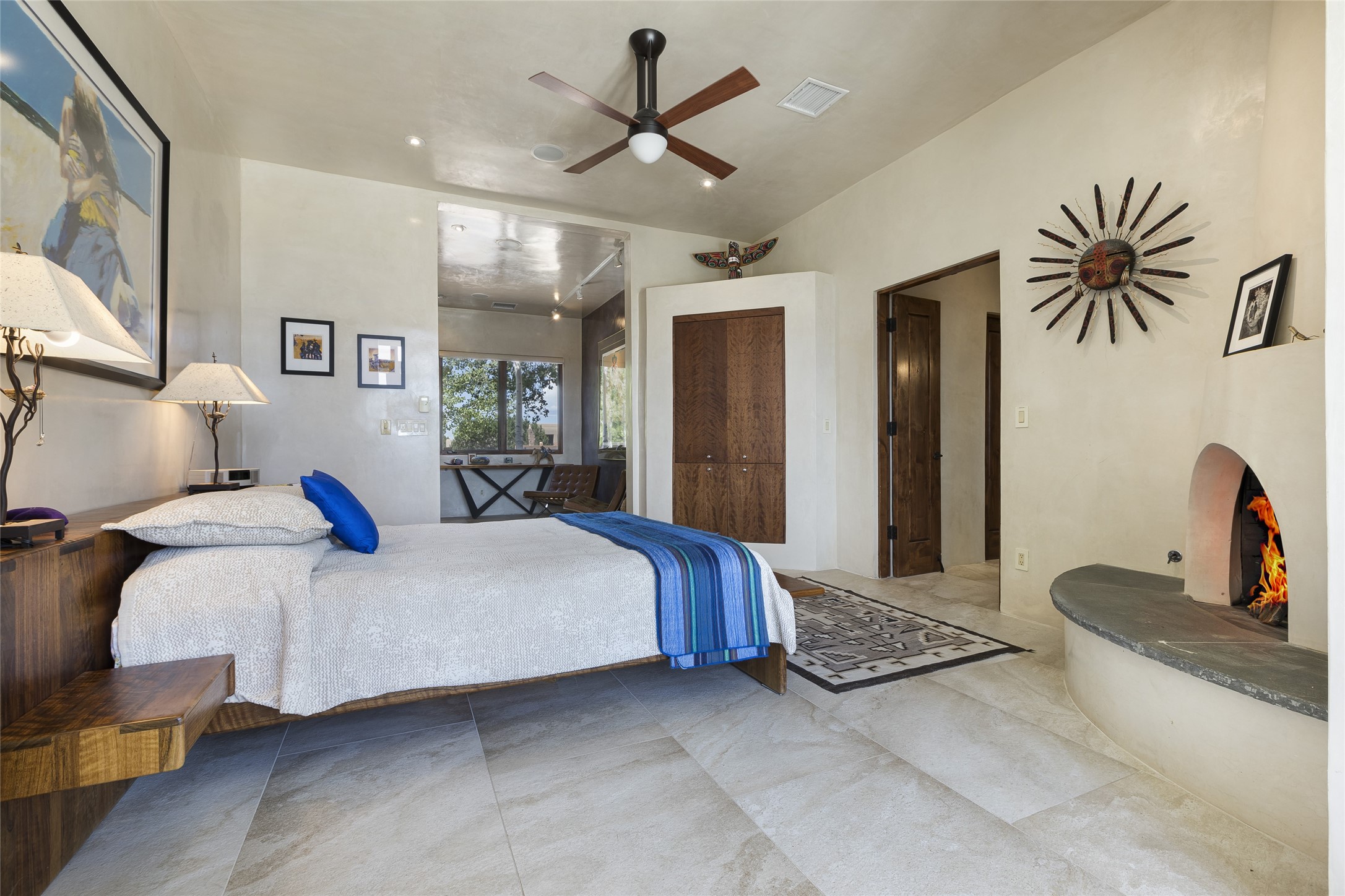 Experience the ultimate Santa Fe lifestyle. This rare, triumphant Tour de Force residence excites with the ultimate blend of sophisticated design and spectacular Sangre De Cristo, Ortiz and Sandia Mountain views. Perfectly sited on an elevated 1.8 acre view lot, this exquisite, single level residence with an independent guest house, roof deck, and a 5-car garage, built by renowned builder, Dave Jansen, designed by Richard Martinez, exemplifies the unique blend of extraordinary modern design with the true essence of Santa Fe. Upon entering through the welcoming, front entrance courtyard with a tranquil water feature, this home impresses and captivates with the stunning surround mountain views and a flexible floor plan, which seamlessly incorporates indoor and outdoor living at its finest. Ideal for guests and entertaining, the main residence offers 4,448 square feet, featuring a spacious open concept living room and dining room, with surround view windows, a glassed viewing room with a fireplace, and a well-appointed island kitchen complete with Wolf and Sub Zero appliances, a breakfast bar, butler's pantry, and an ideal wine room located directly off of the kitchen. The owner's suite delights with an intimate sitting room, fireplace, a private enclosed patio, and an updated luxurious bath with a soaking tub, walk-in shower, towel warming bars, and two large walk-in closets. The separate guest wing features its own living room with two private guest bedrooms, each with their own portal and a shared bath. Detached from the main residence is a spacious two-bedroom guest house, complete with its own bath, barista area, two enclosed patios and access to the roof deck. Exceptional features include 3,000 square feet of walled portal spaces, plaster walls, updated modern porcelain flooring throughout the main living areas and located within minutes to all facilities at The Club at Las Campanas.