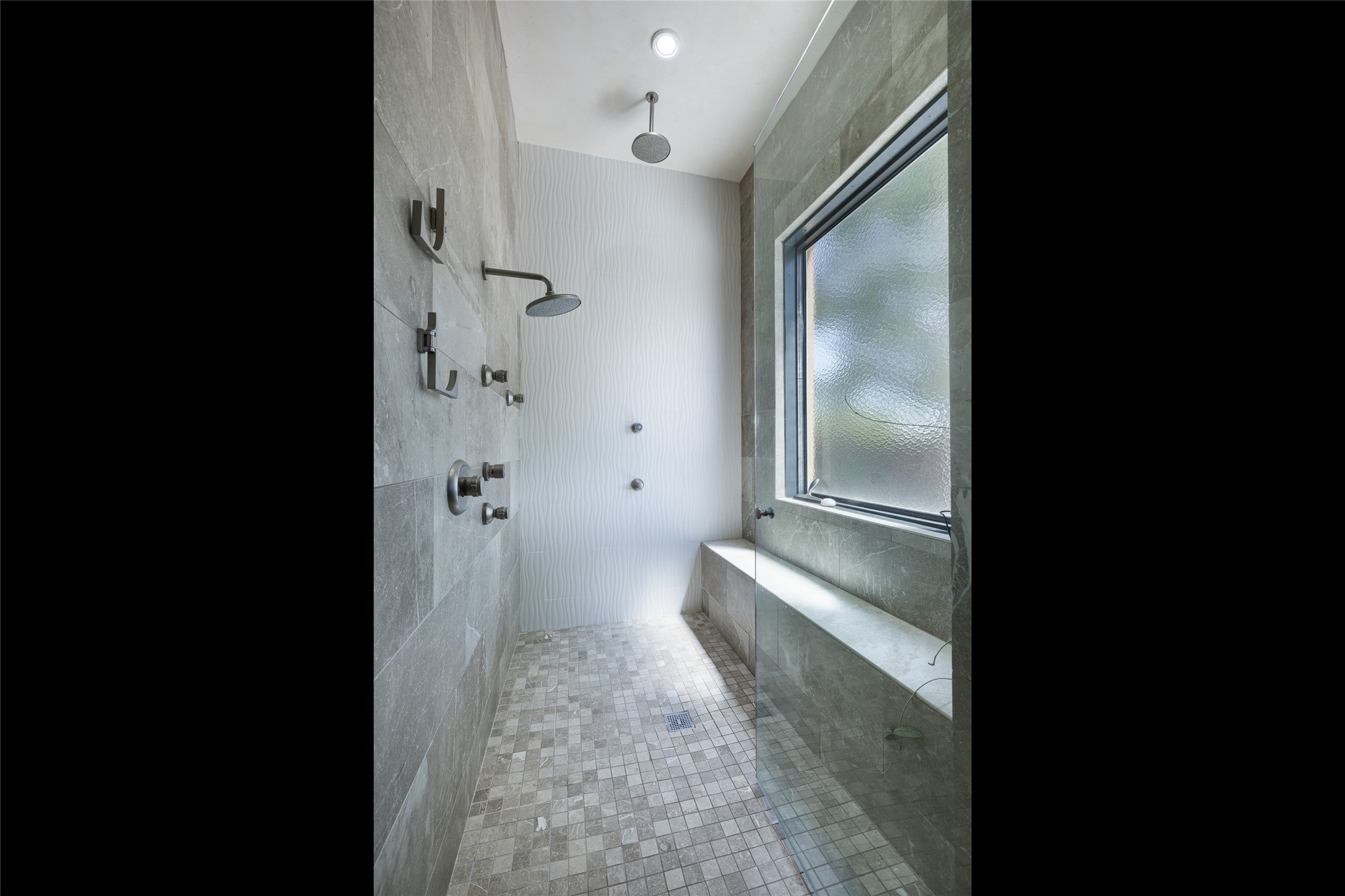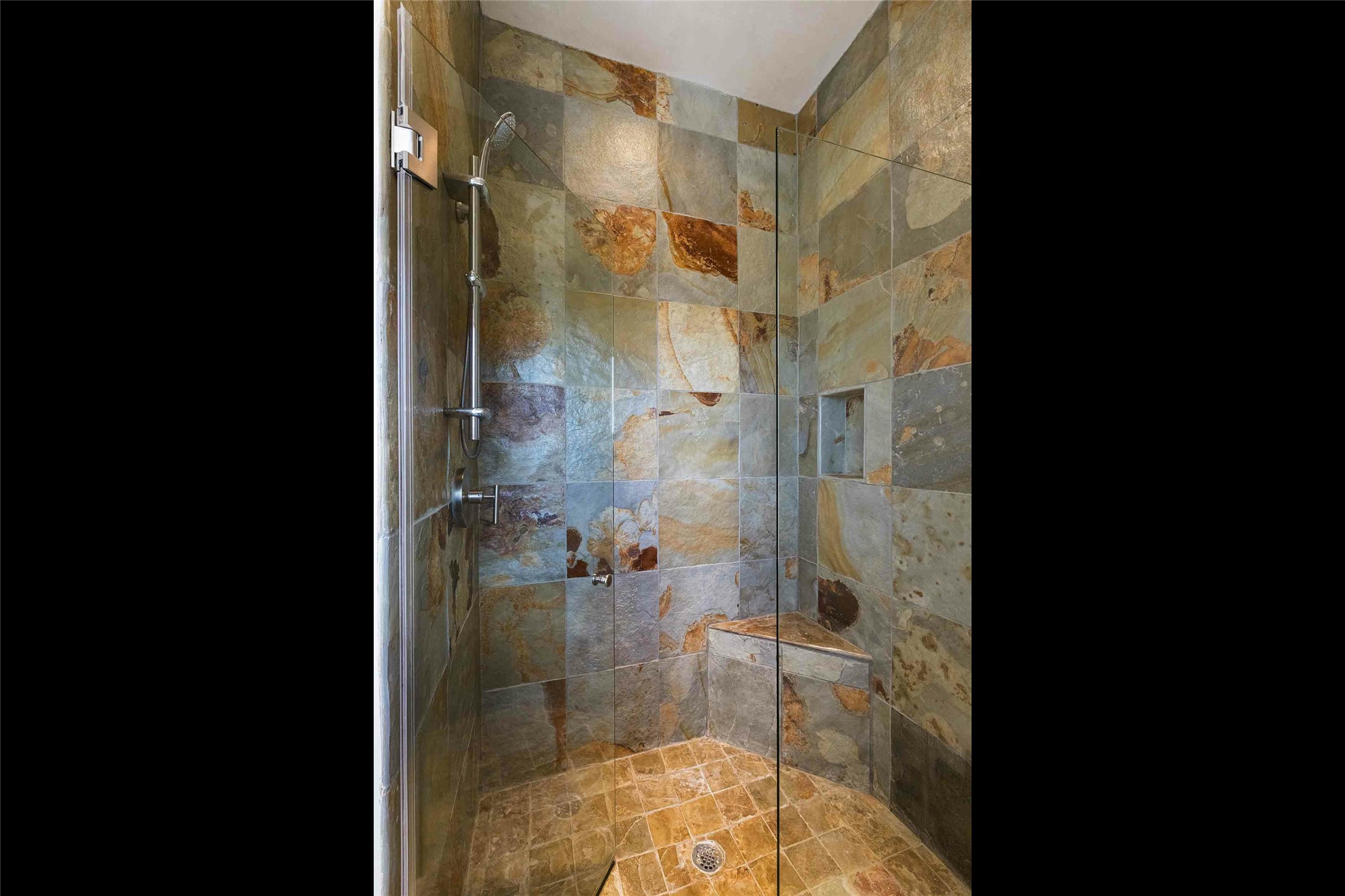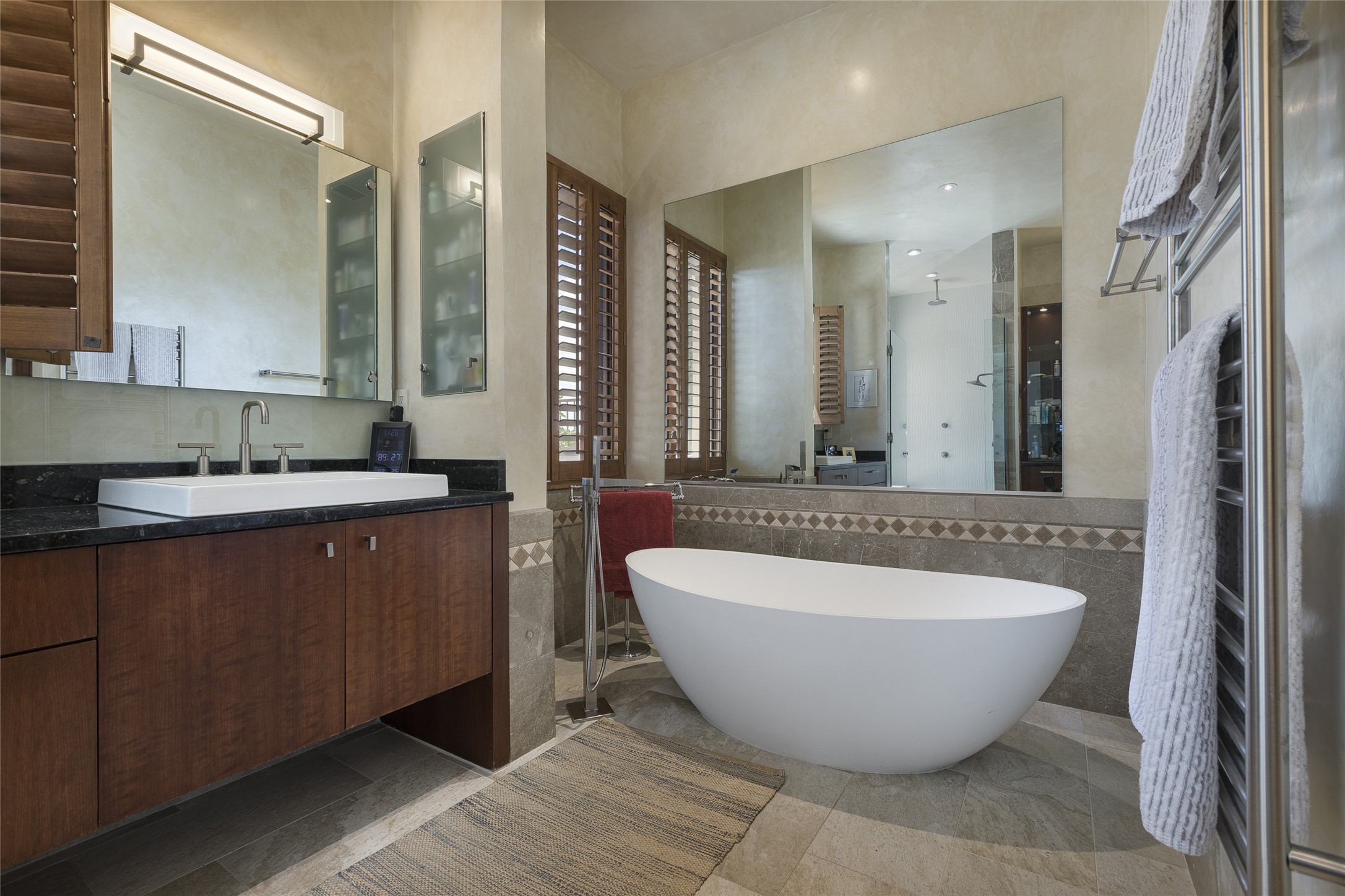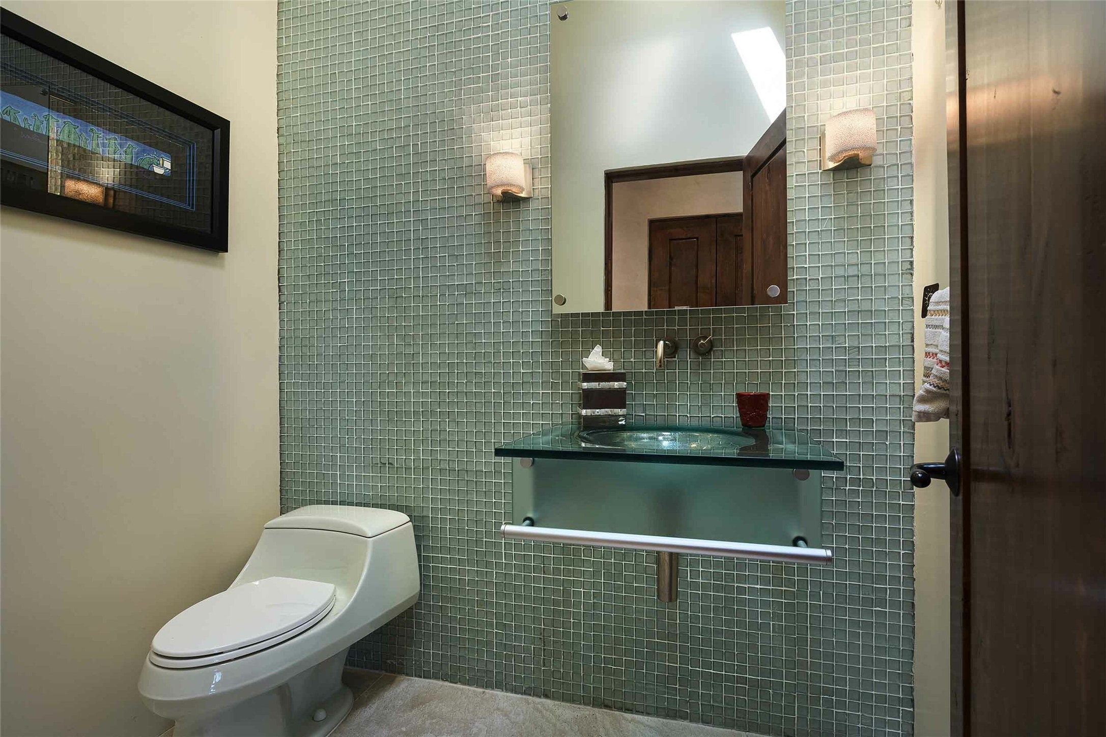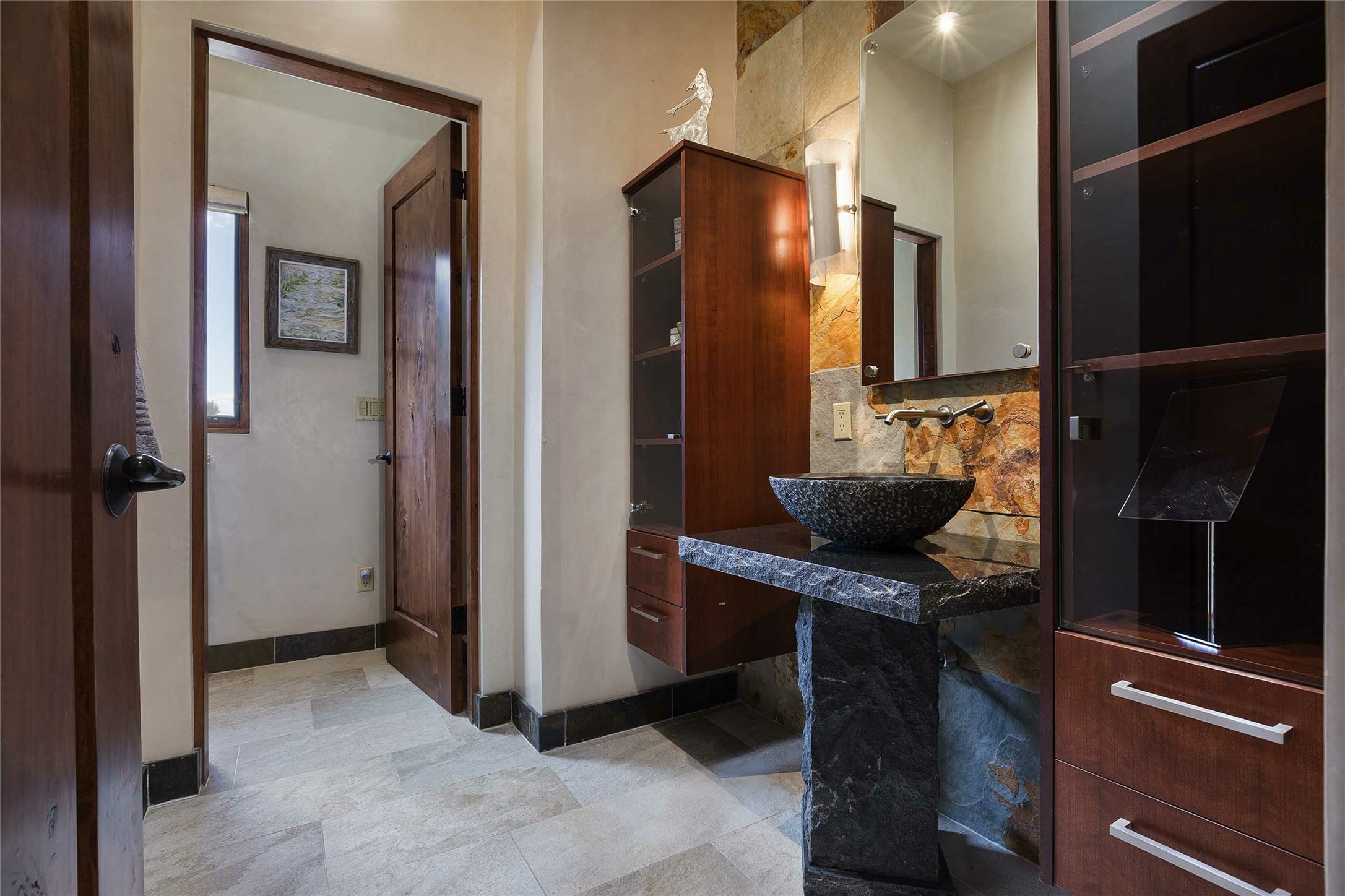 Experience the ultimate Santa Fe lifestyle. This rare, triumphant Tour de Force residence excites with the ultimate blend of sophisticated design and spectacular Sangre De Cristo, Ortiz and Sandia Mountain views. Perfectly sited on an elevated 1.8 acre view lot, this exquisite, single level residence with an independent guest house, roof deck, and a 5-car garage, built by renowned builder, Dave Jansen, designed by Richard Martinez, exemplifies the unique blend of extraordinary modern design with the true essence of Santa Fe. Upon entering through the welcoming, front entrance courtyard with a tranquil water feature, this home impresses and captivates with the stunning surround mountain views and a flexible floor plan, which seamlessly incorporates indoor and outdoor living at its finest. Ideal for guests and entertaining, the main residence offers 4,448 square feet, featuring a spacious open concept living room and dining room, with surround view windows, a glassed viewing room with a fireplace, and a well-appointed island kitchen complete with Wolf and Sub Zero appliances, a breakfast bar, butler's pantry, and an ideal wine room located directly off of the kitchen. The owner's suite delights with an intimate sitting room, fireplace, a private enclosed patio, and an updated luxurious bath with a soaking tub, walk-in shower, towel warming bars, and two large walk-in closets. The separate guest wing features its own living room with two private guest bedrooms, each with their own portal and a shared bath. Detached from the main residence is a spacious two-bedroom guest house, complete with its own bath, barista area, two enclosed patios and access to the roof deck. Exceptional features include 3,000 square feet of walled portal spaces, plaster walls, updated modern porcelain flooring throughout the main living areas and located within minutes to all facilities at The Club at Las Campanas.