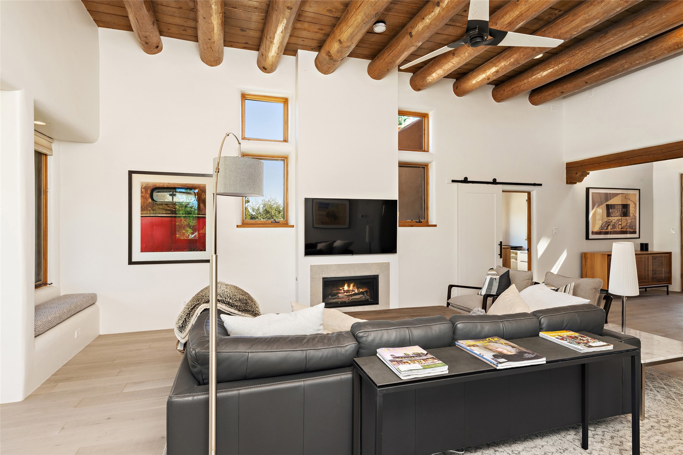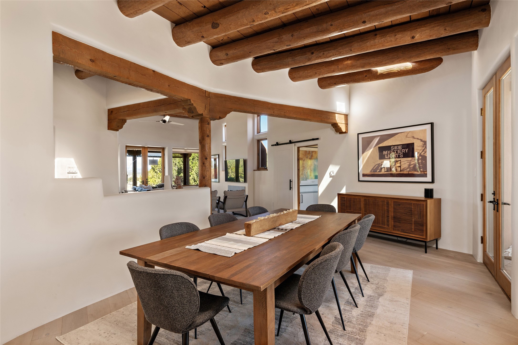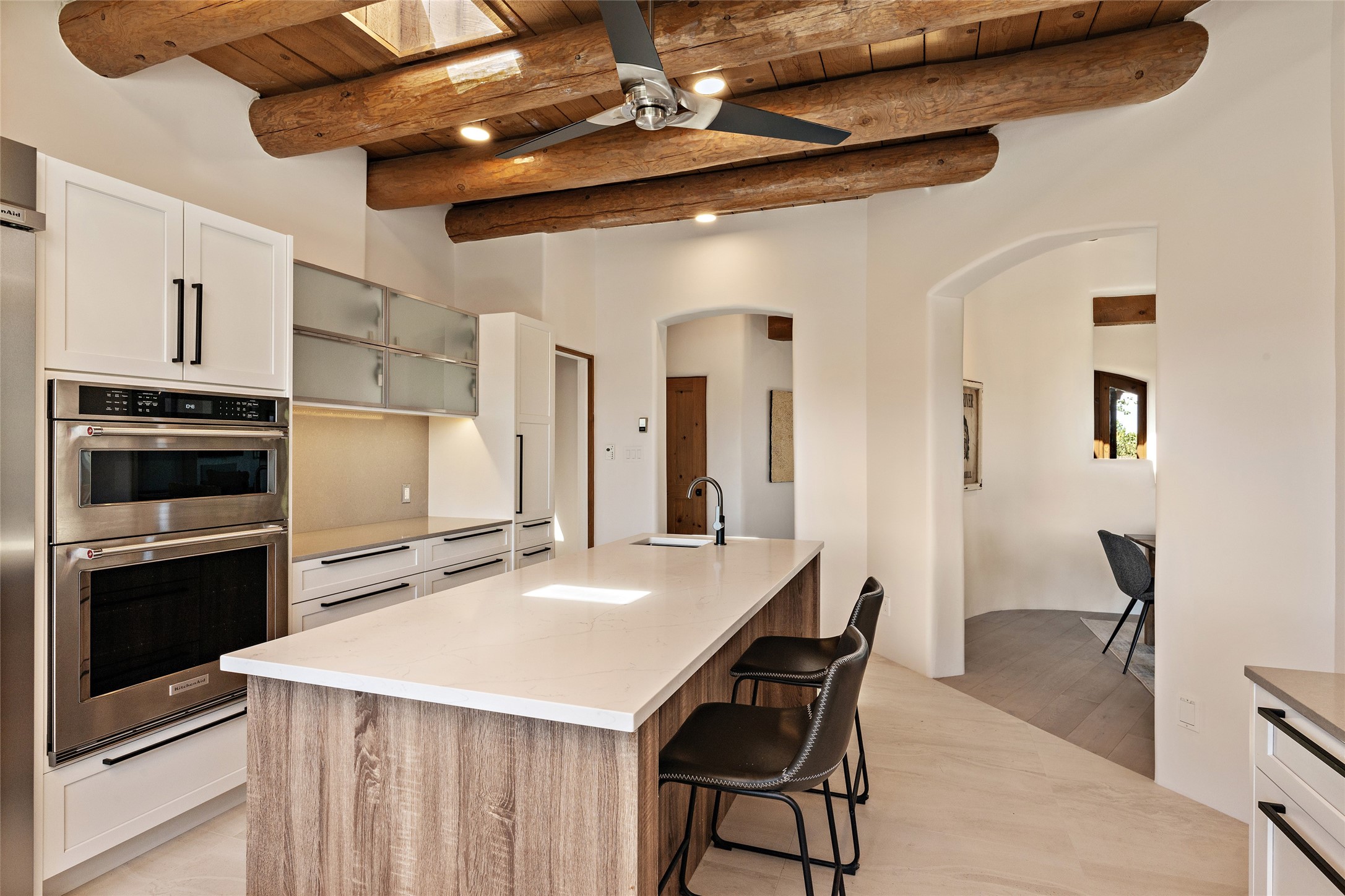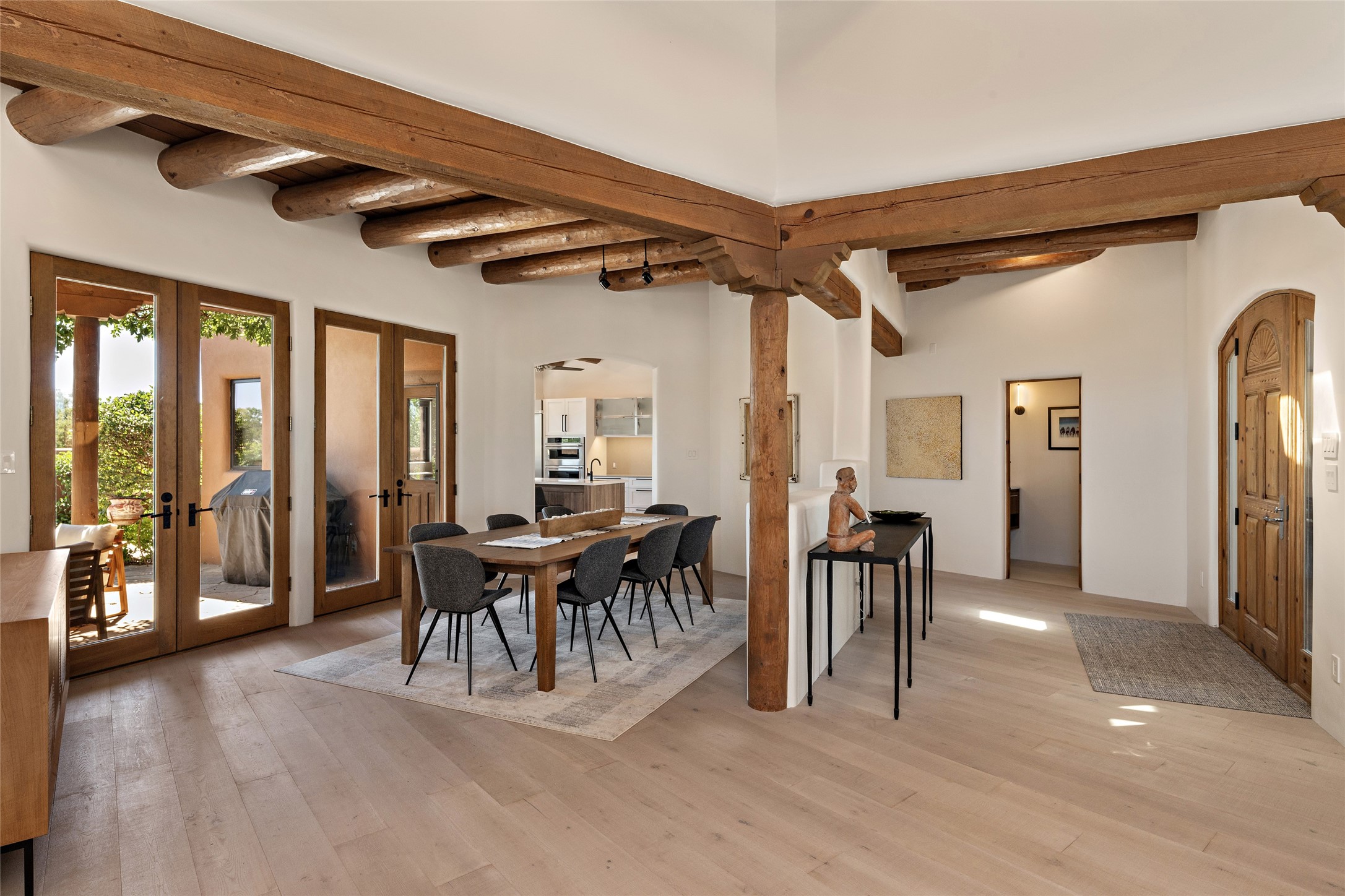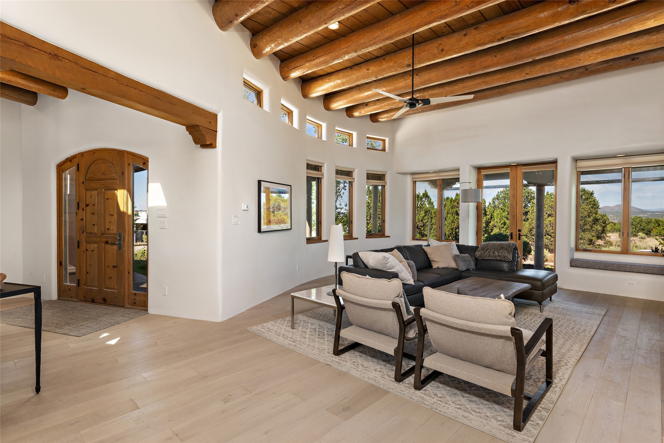 The best of Southwestern style and contemporary design have been masterfully combined in this completely reimagined and renovated Las Campanas residence. With classic features that include high ceilings, large vigas and square cut beam ceilings and many windows that bring in the wonderful mountain and surrounding views, every room has been transformed to create a fresh and light feeling. This 3 bedroom/3 bath home now boasts a beautifully equipped kitchen and pantry, the ultimate home office, an opulent primary suite, a sumptuous guest wing and a laundry room that will cause you to stop and admire it. With finish details that include French wide-plank oak flooring, sleek cabinetry, quartz countertops, new lights and skylights throughout and going as far as all new electrical outlets and switches. The result of this complete transformation is a clean, straight forward, minimalist silhouette and a neutral canvas conducive to a host of decorative lifestyle interpretations. With the Sangre de Cristo mountains to the east and the Jemez Mountains on the west, every room is set up to capture the views that all want. A rear patio with a wisteria-covered ramada for outdoor entertaining and leisure is accessed from the kitchen and dining room. The living, entertainment areas, work and lounging spaces of this home flow together seamlessly offering not only high functionality, but superior design expressed with an understated elegance and passionate simplicity.