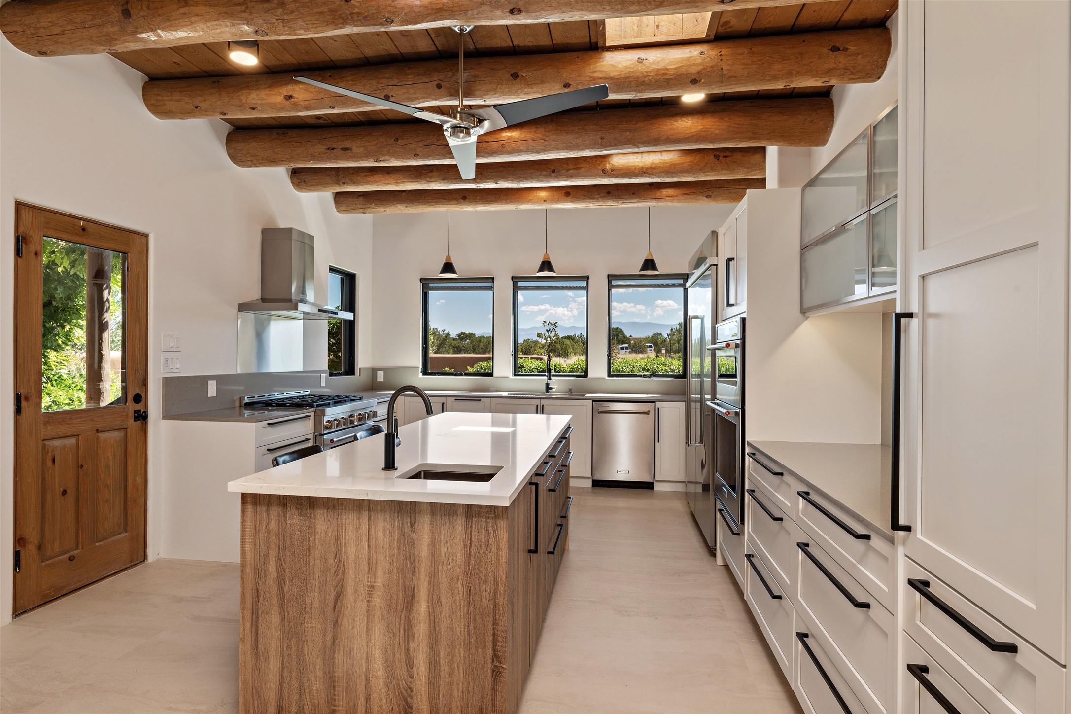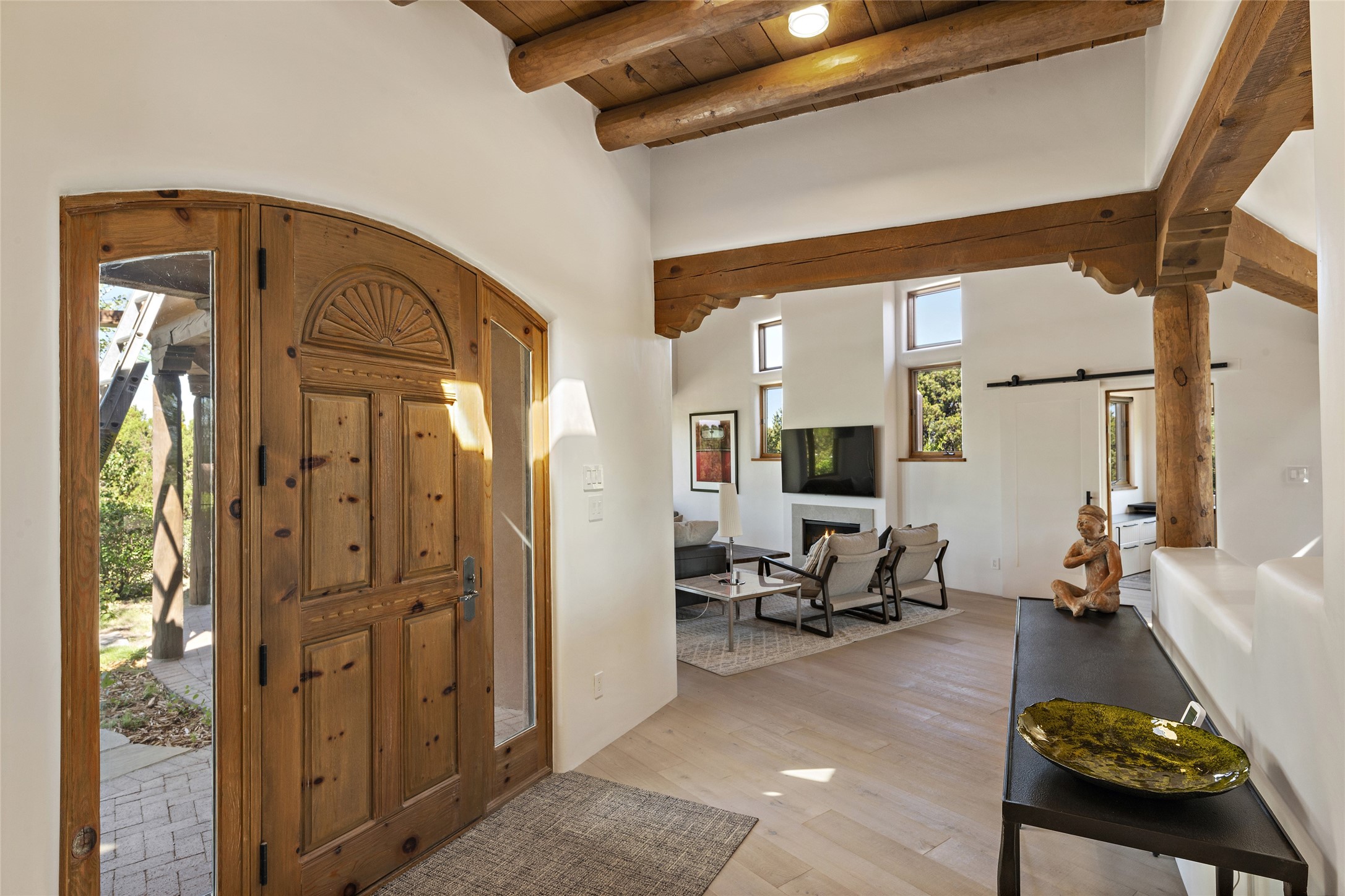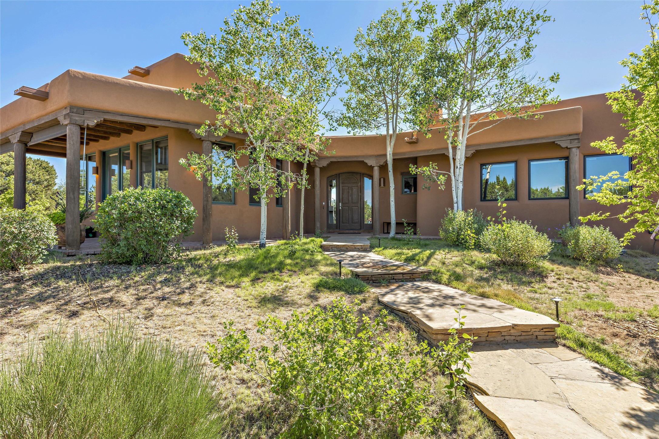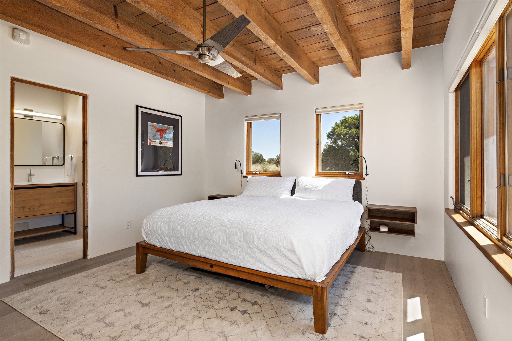 The best of Southwestern style and contemporary design have been masterfully combined in this completely reimagined and renovated Las Campanas residence. With classic features that include high ceilings, large vigas and square cut beam ceilings and many windows that bring in the wonderful mountain and surrounding views, every room has been transformed to create a fresh and light feeling. This 3 bedroom/3 bath home now boasts a beautifully equipped kitchen and pantry, the ultimate home office, an opulent primary suite, a sumptuous guest wing and a laundry room that will cause you to stop and admire it. With finish details that include French wide-plank oak flooring, sleek cabinetry, quartz countertops, new lights and skylights throughout and going as far as all new electrical outlets and switches. The result of this complete transformation is a clean, straight forward, minimalist silhouette and a neutral canvas conducive to a host of decorative lifestyle interpretations. With the Sangre de Cristo mountains to the east and the Jemez Mountains on the west, every room is set up to capture the views that all want. A rear patio with a wisteria-covered ramada for outdoor entertaining and leisure is accessed from the kitchen and dining room. The living, entertainment areas, work and lounging spaces of this home flow together seamlessly offering not only high functionality, but superior design expressed with an understated elegance and passionate simplicity.