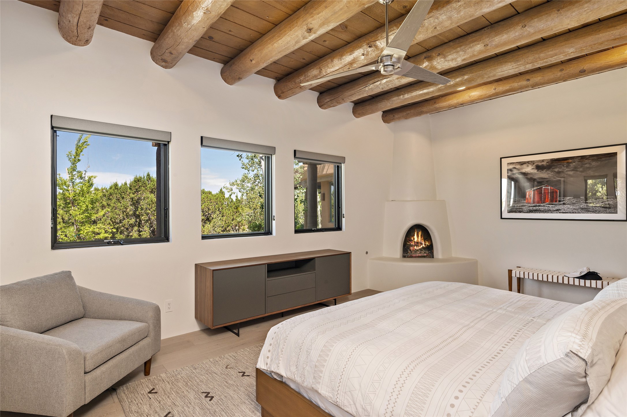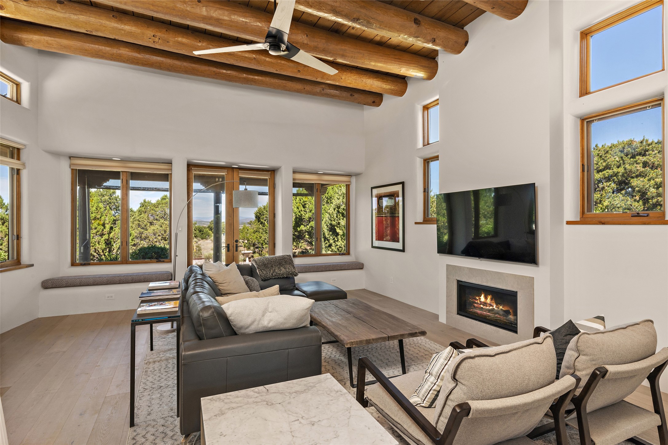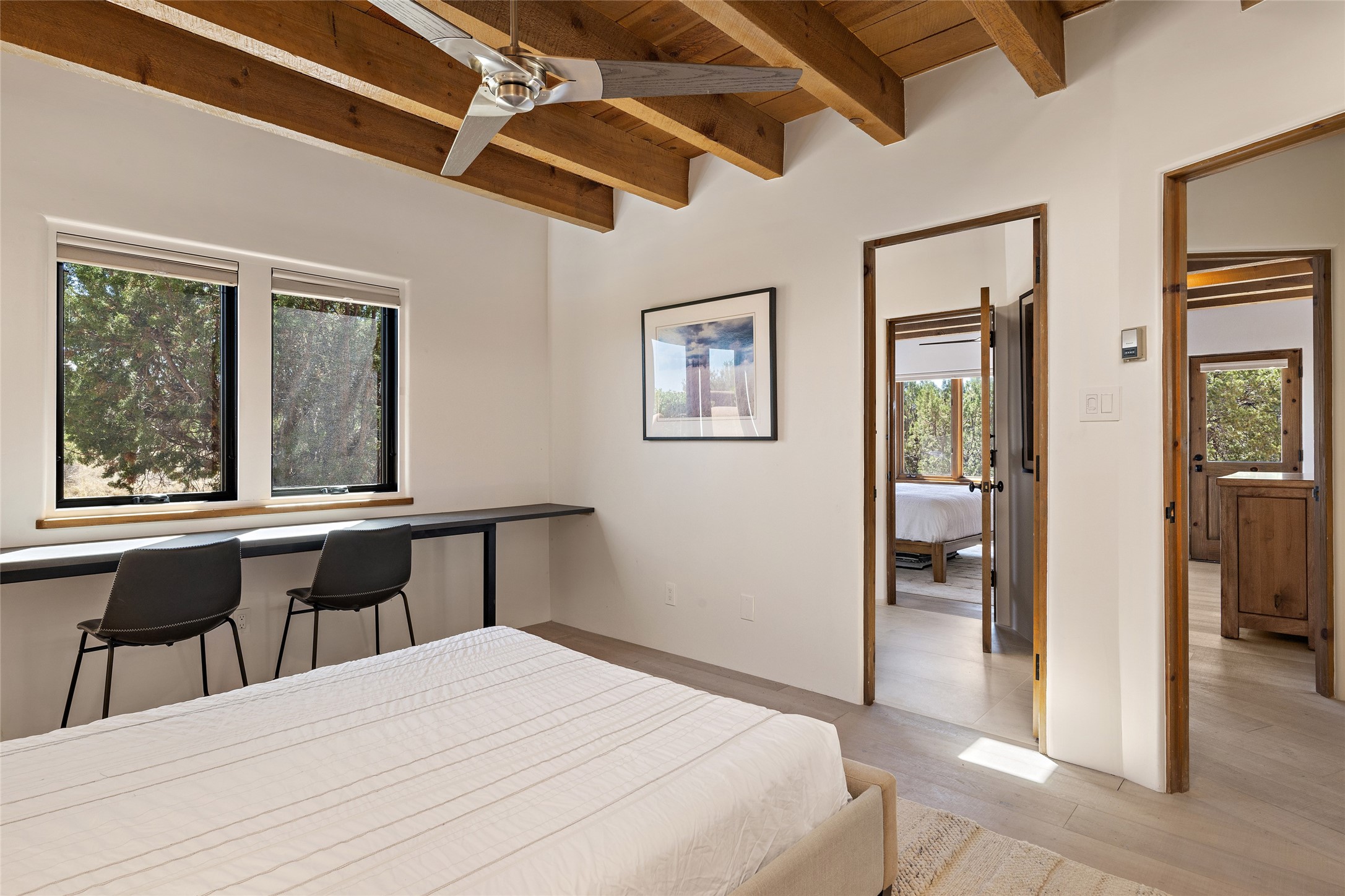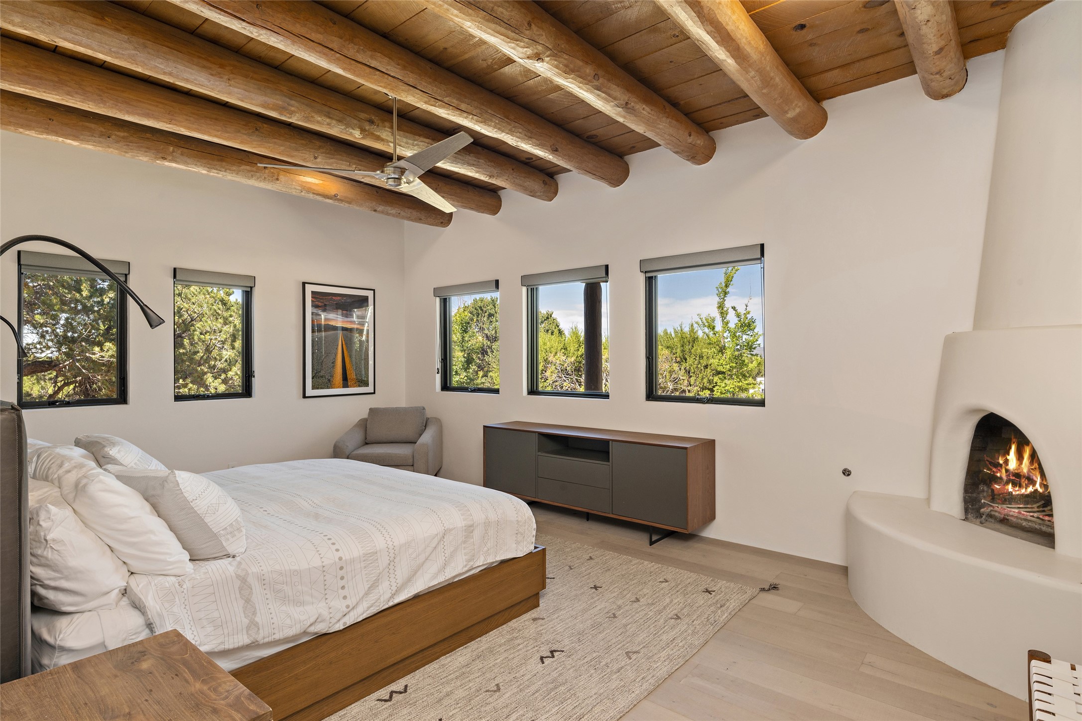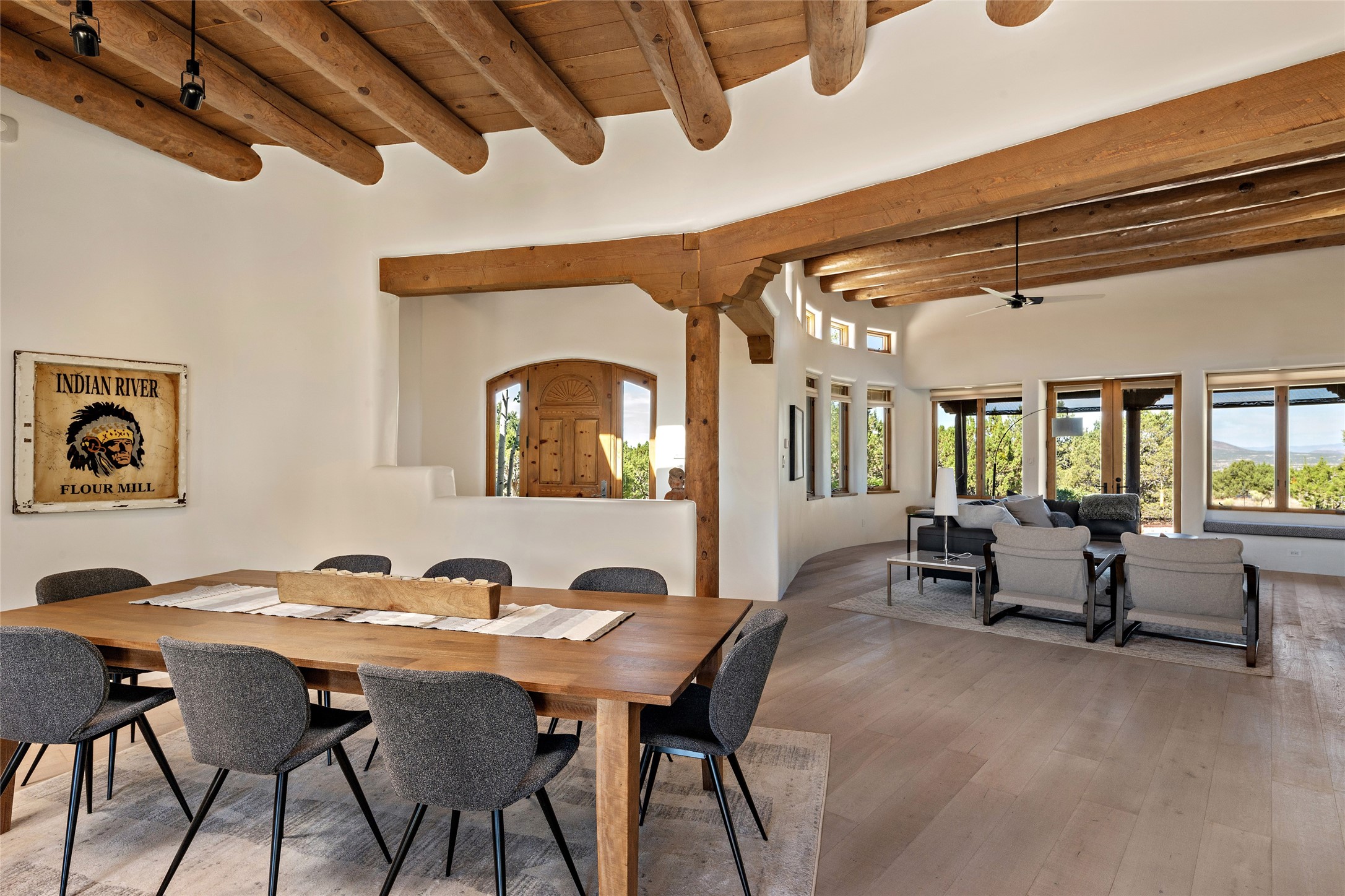 The best of Southwestern style and contemporary design have been masterfully combined in this completely reimagined and renovated Las Campanas residence. With classic features that include high ceilings, large vigas and square cut beam ceilings and many windows that bring in the wonderful mountain and surrounding views, every room has been transformed to create a fresh and light feeling. This 3 bedroom/3 bath home now boasts a beautifully equipped kitchen and pantry, the ultimate home office, an opulent primary suite, a sumptuous guest wing and a laundry room that will cause you to stop and admire it. With finish details that include French wide-plank oak flooring, sleek cabinetry, quartz countertops, new lights and skylights throughout and going as far as all new electrical outlets and switches. The result of this complete transformation is a clean, straight forward, minimalist silhouette and a neutral canvas conducive to a host of decorative lifestyle interpretations. With the Sangre de Cristo mountains to the east and the Jemez Mountains on the west, every room is set up to capture the views that all want. A rear patio with a wisteria-covered ramada for outdoor entertaining and leisure is accessed from the kitchen and dining room. The living, entertainment areas, work and lounging spaces of this home flow together seamlessly offering not only high functionality, but superior design expressed with an understated elegance and passionate simplicity.