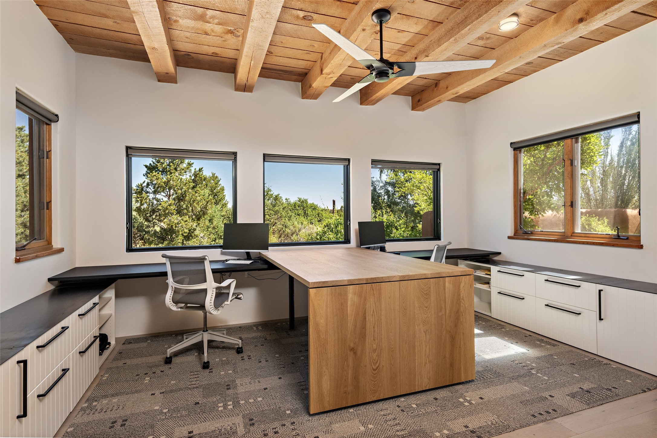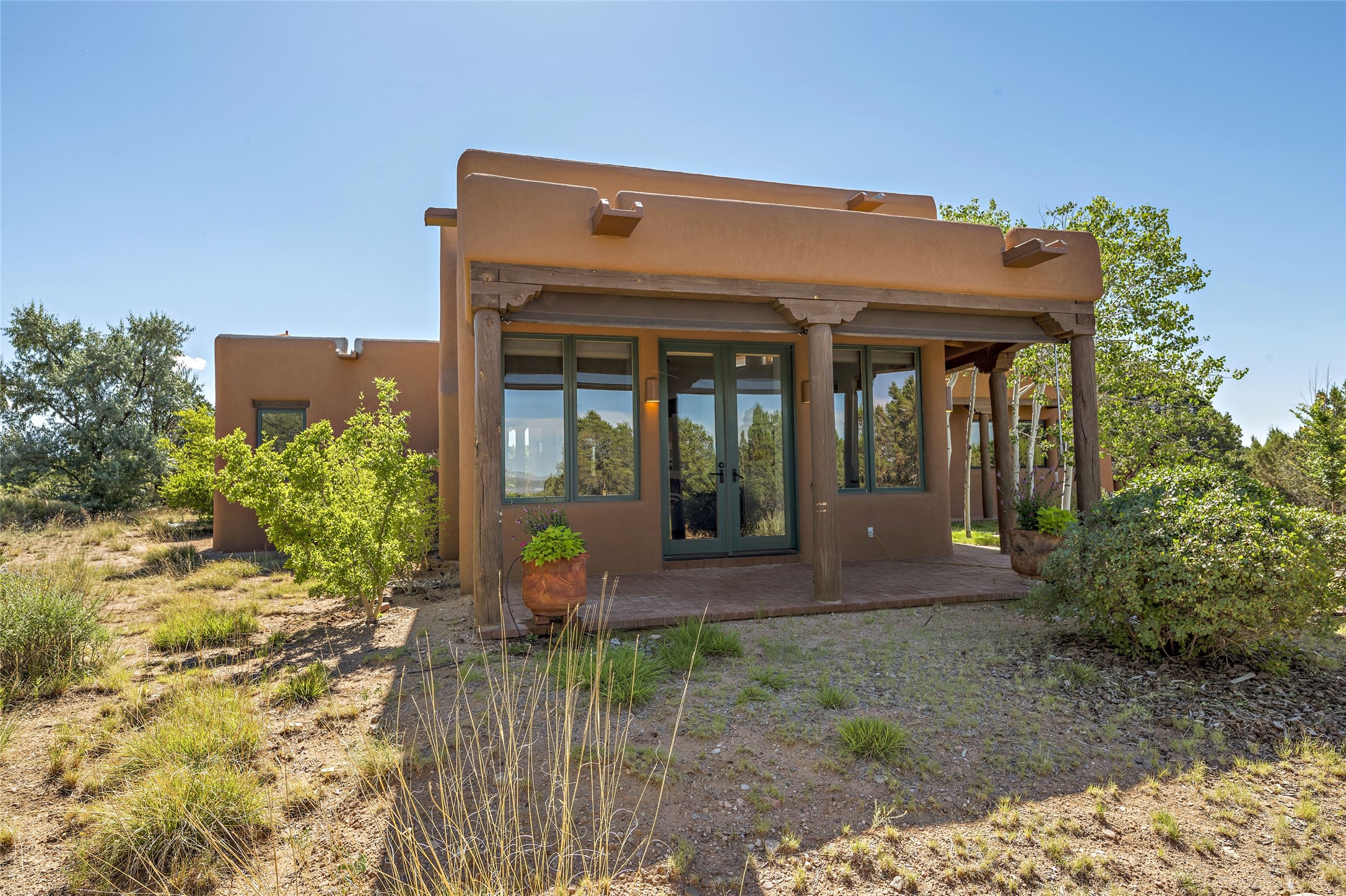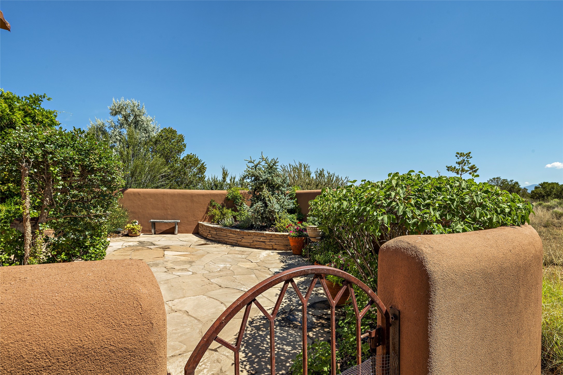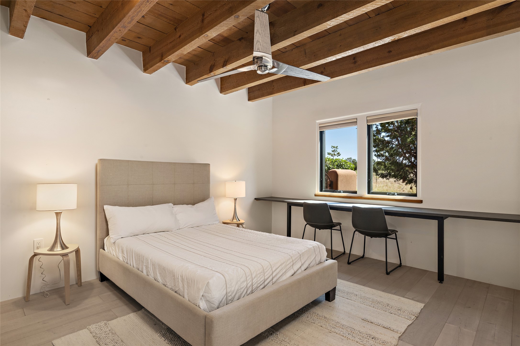 The best of Southwestern style and contemporary design have been masterfully combined in this completely reimagined and renovated Las Campanas residence. With classic features that include high ceilings, large vigas and square cut beam ceilings and many windows that bring in the wonderful mountain and surrounding views, every room has been transformed to create a fresh and light feeling. This 3 bedroom/3 bath home now boasts a beautifully equipped kitchen and pantry, the ultimate home office, an opulent primary suite, a sumptuous guest wing and a laundry room that will cause you to stop and admire it. With finish details that include French wide-plank oak flooring, sleek cabinetry, quartz countertops, new lights and skylights throughout and going as far as all new electrical outlets and switches. The result of this complete transformation is a clean, straight forward, minimalist silhouette and a neutral canvas conducive to a host of decorative lifestyle interpretations. With the Sangre de Cristo mountains to the east and the Jemez Mountains on the west, every room is set up to capture the views that all want. A rear patio with a wisteria-covered ramada for outdoor entertaining and leisure is accessed from the kitchen and dining room. The living, entertainment areas, work and lounging spaces of this home flow together seamlessly offering not only high functionality, but superior design expressed with an understated elegance and passionate simplicity.