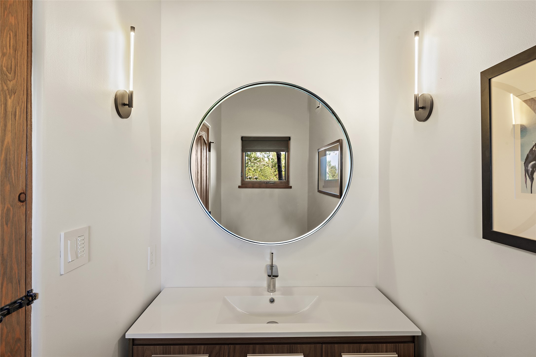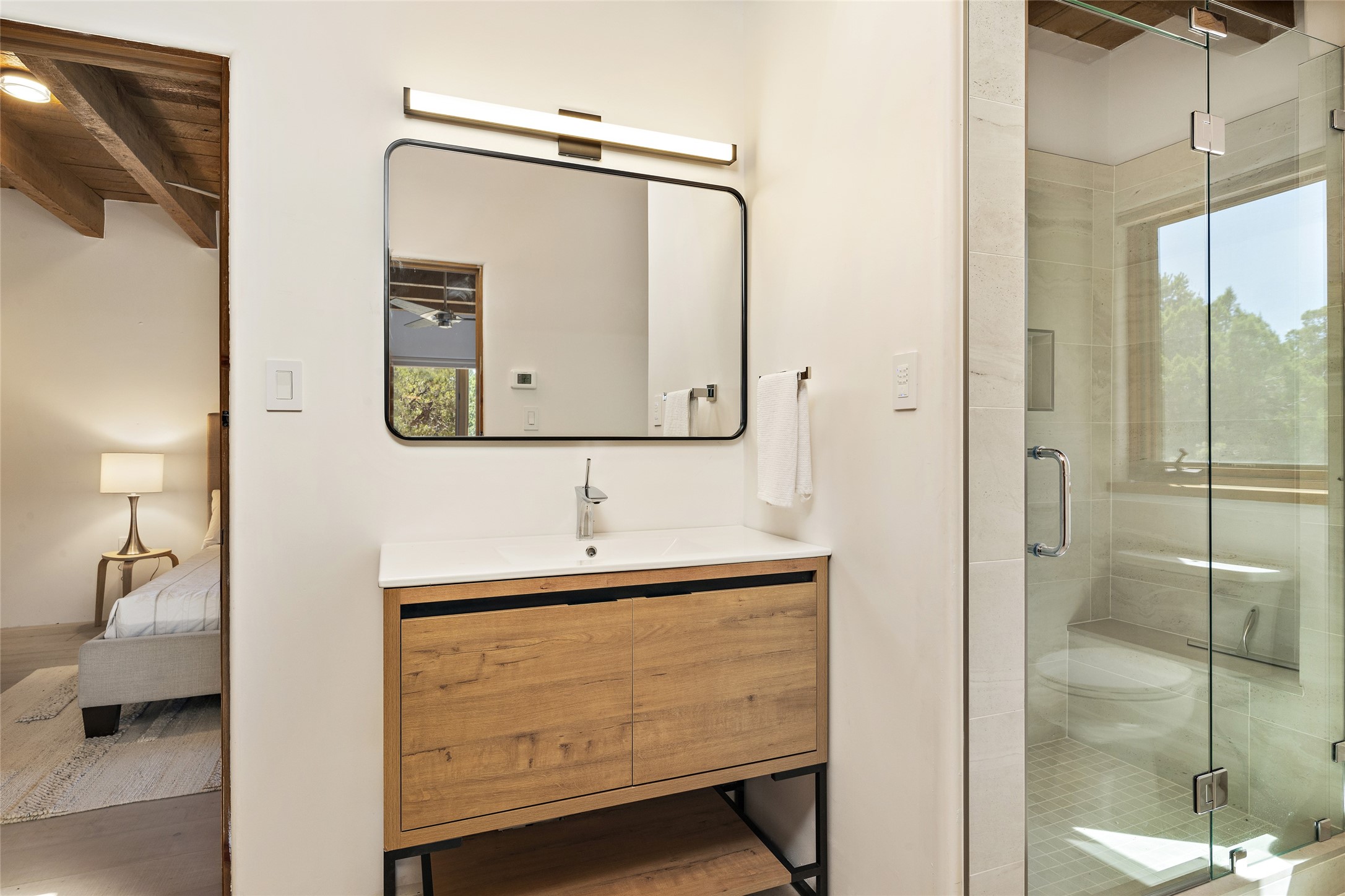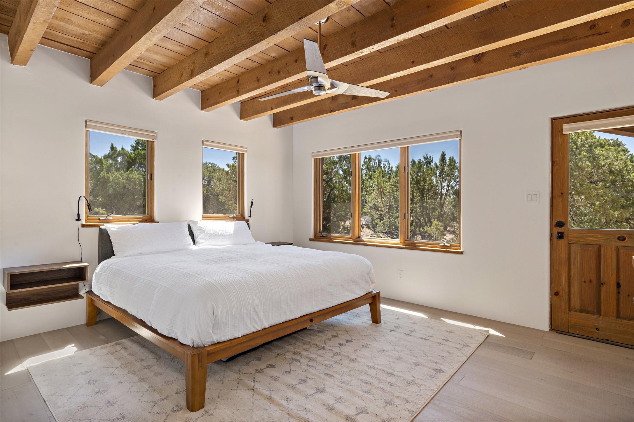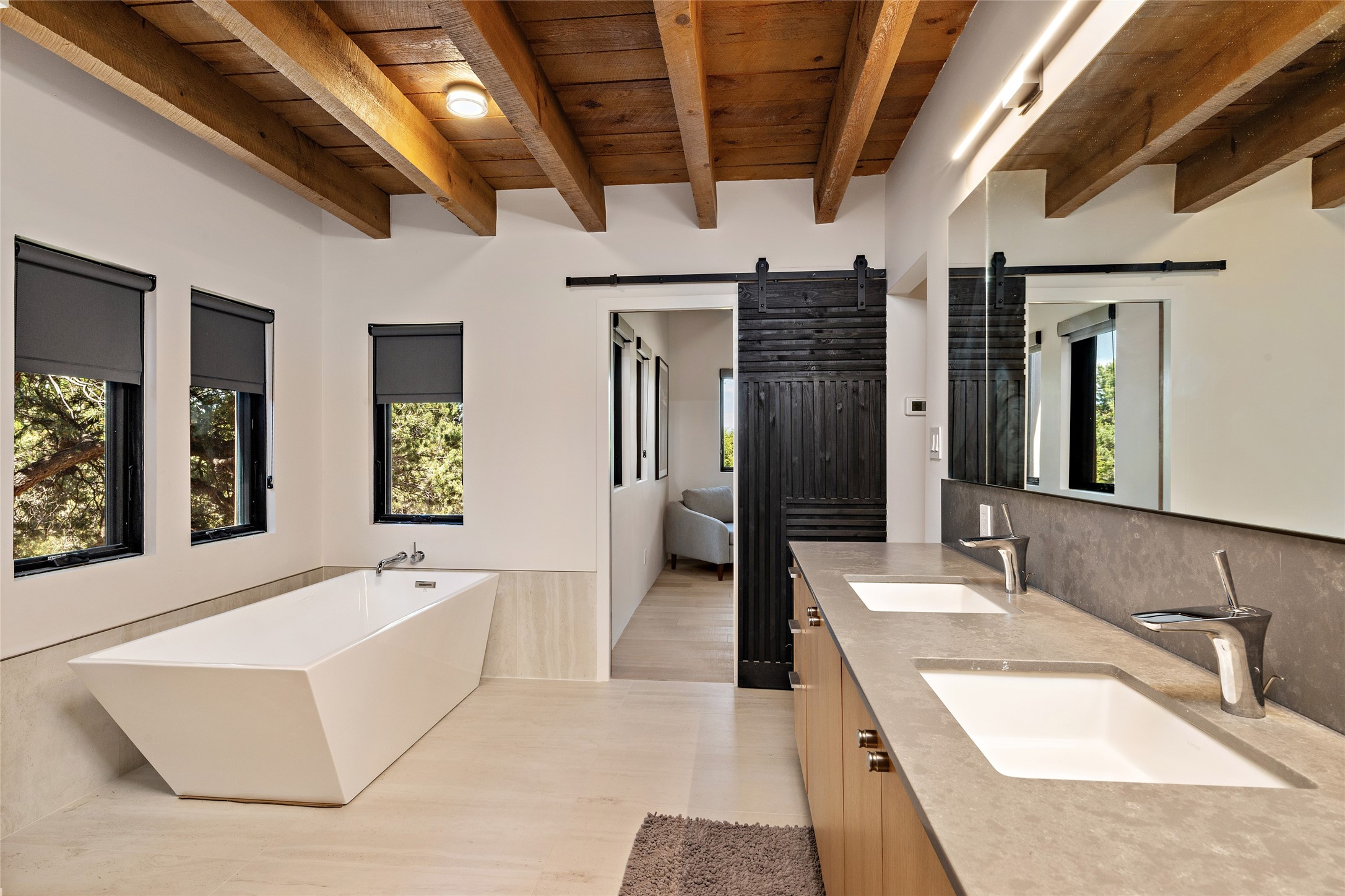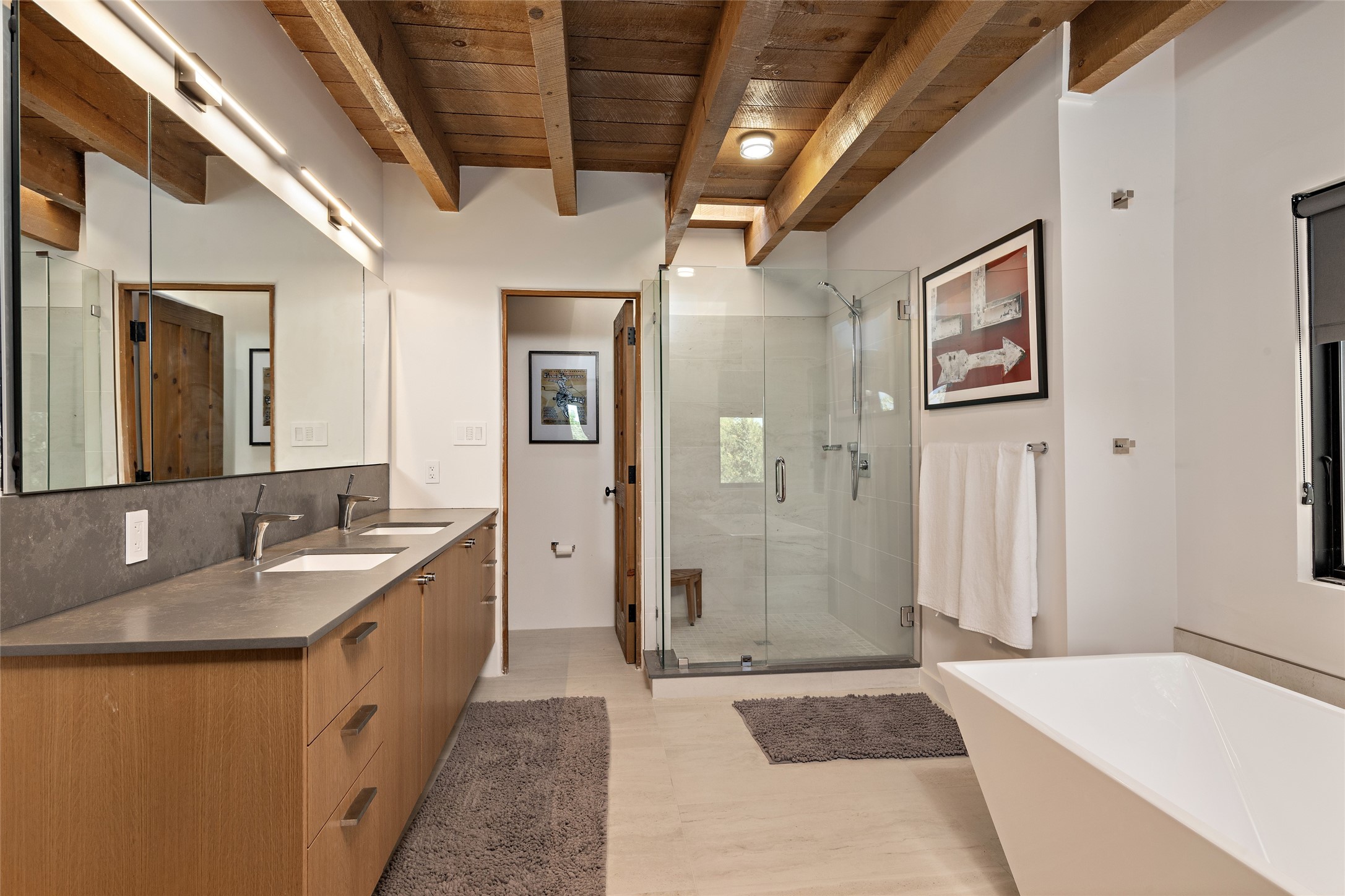 The best of Southwestern style and contemporary design have been masterfully combined in this completely reimagined and renovated Las Campanas residence. With classic features that include high ceilings, large vigas and square cut beam ceilings and many windows that bring in the wonderful mountain and surrounding views, every room has been transformed to create a fresh and light feeling. This 3 bedroom/3 bath home now boasts a beautifully equipped kitchen and pantry, the ultimate home office, an opulent primary suite, a sumptuous guest wing and a laundry room that will cause you to stop and admire it. With finish details that include French wide-plank oak flooring, sleek cabinetry, quartz countertops, new lights and skylights throughout and going as far as all new electrical outlets and switches. The result of this complete transformation is a clean, straight forward, minimalist silhouette and a neutral canvas conducive to a host of decorative lifestyle interpretations. With the Sangre de Cristo mountains to the east and the Jemez Mountains on the west, every room is set up to capture the views that all want. A rear patio with a wisteria-covered ramada for outdoor entertaining and leisure is accessed from the kitchen and dining room. The living, entertainment areas, work and lounging spaces of this home flow together seamlessly offering not only high functionality, but superior design expressed with an understated elegance and passionate simplicity.