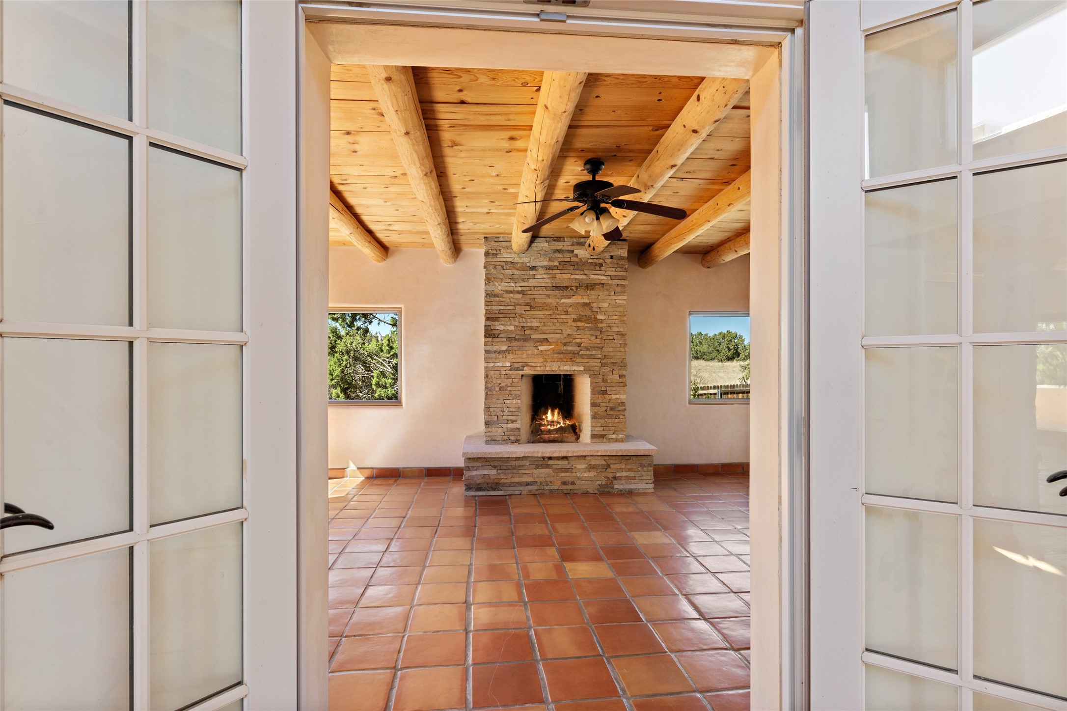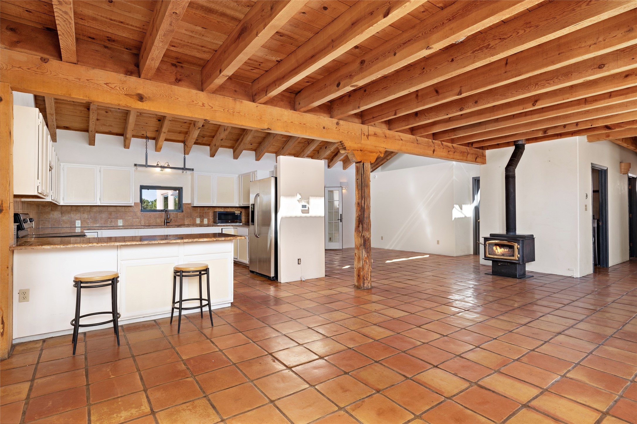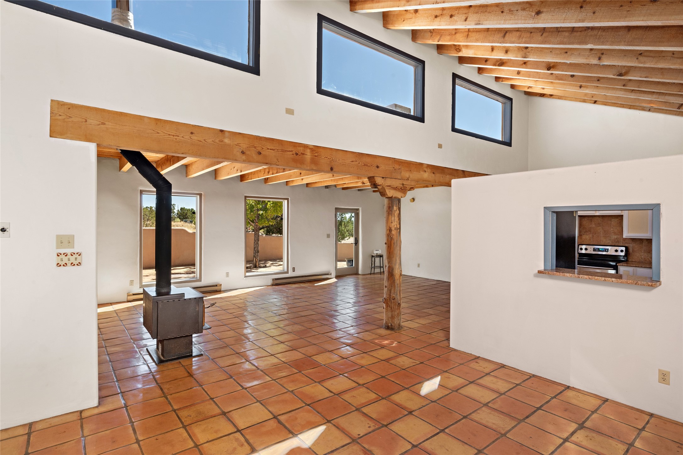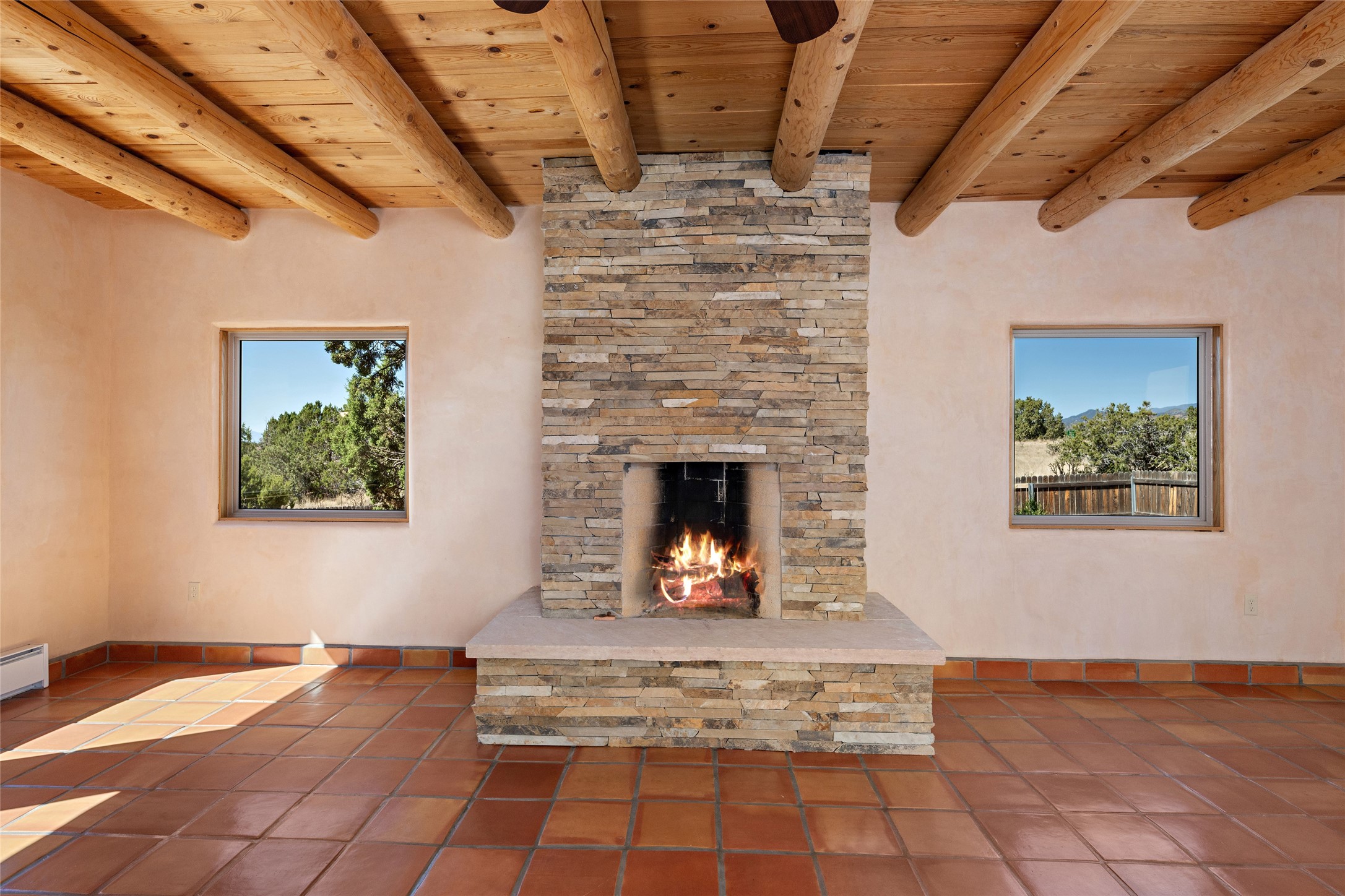 GRAB THIS DEAL! SINGLE OWNER - "As Is" passive solar charmer with views, privacy, wide open floorplan all located on a cul-de-sac and near a greenbelt. Spacious kitchen with great storage and two generous living areas, one opens to living and dining rooms and the other behind french doors with a stacked stone wood-burning fireplace. Beautiful beamed ceilings and Saltillo tile throughout. Nice bedroom separation. Primary bedroom has large walk-in closet. Updated guest bath. Walled front courtyard with Kiva fireplace and large fully fenced backyard. Lot corners have been flagged. Septic inspection in supplements. Two steps down to primary bedroom, one step down to den. Two woodstoves - one in primary bedroom and one in great room. New water heater in 2017. There is an evaporative cooler - seller does not guarantee functionality. Most exterior walls and some interior walls are Adobe or block. If of material interest, buyer is encouraged to determine. Super clean and ready to go!