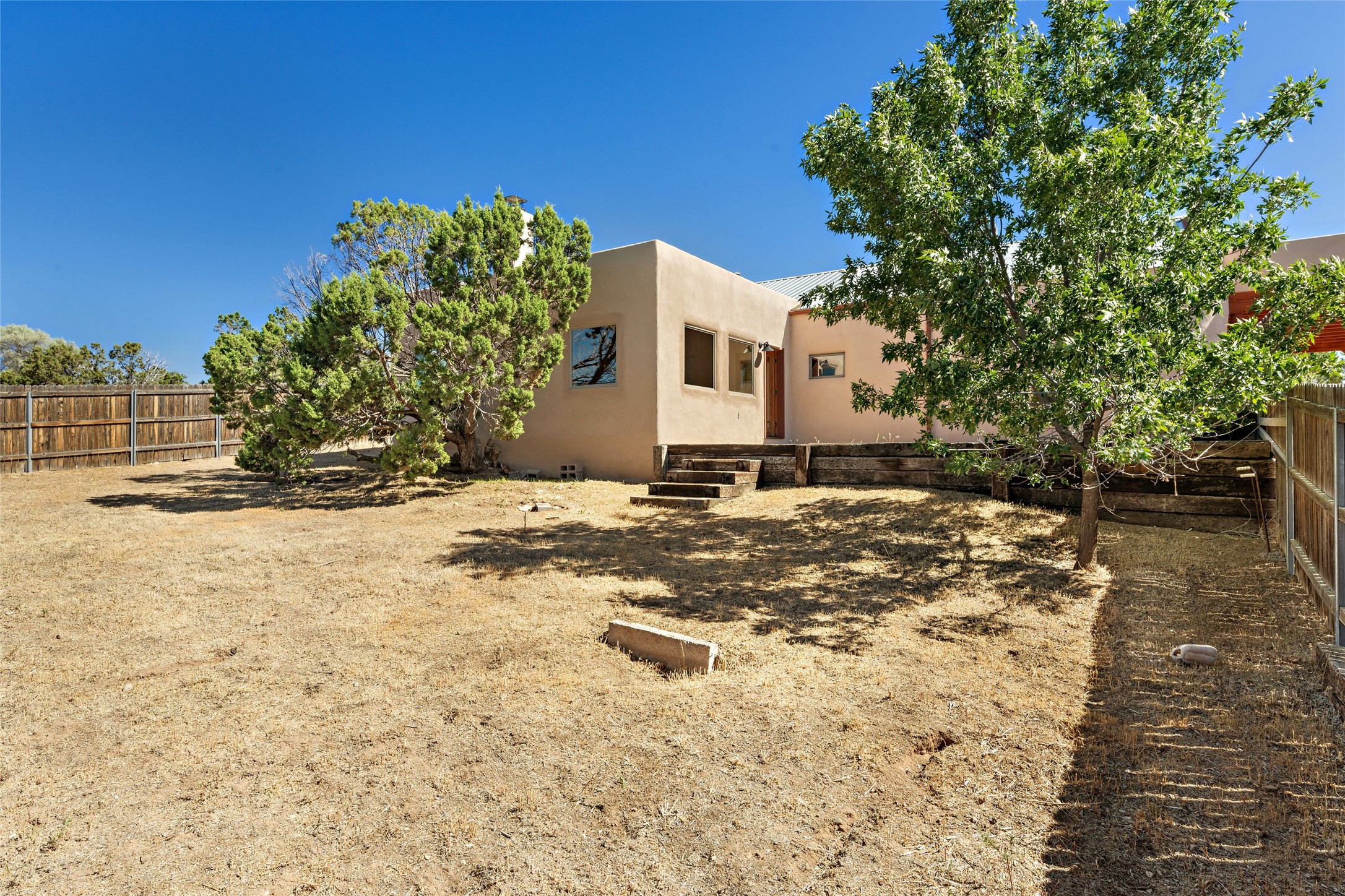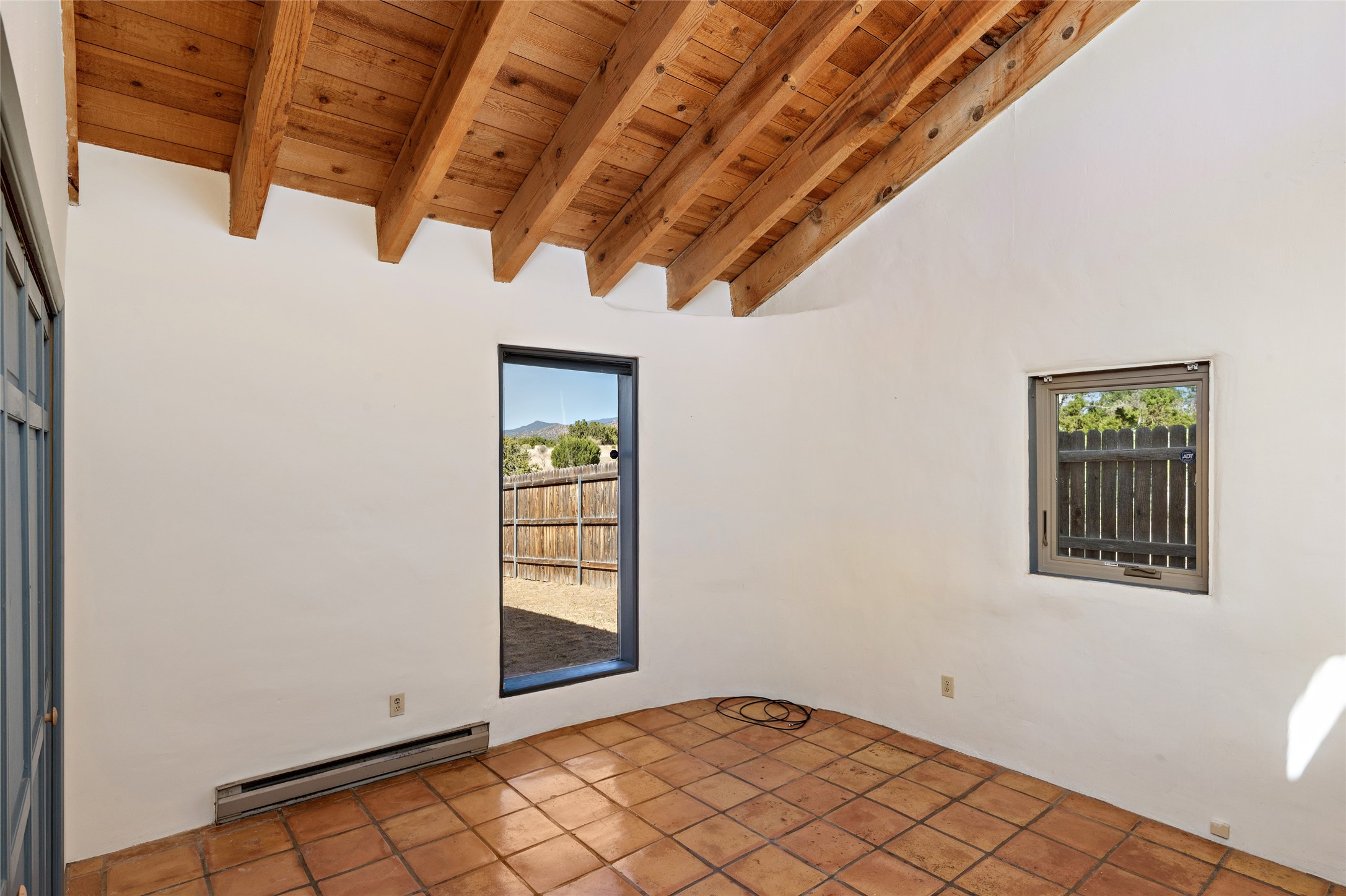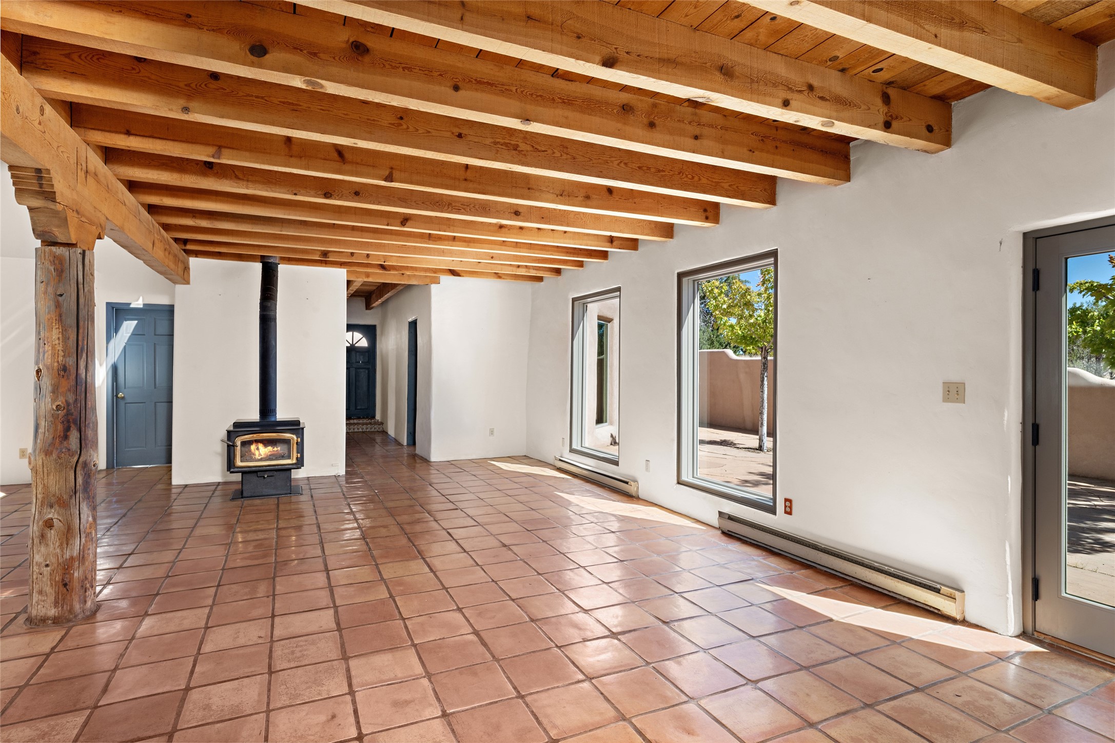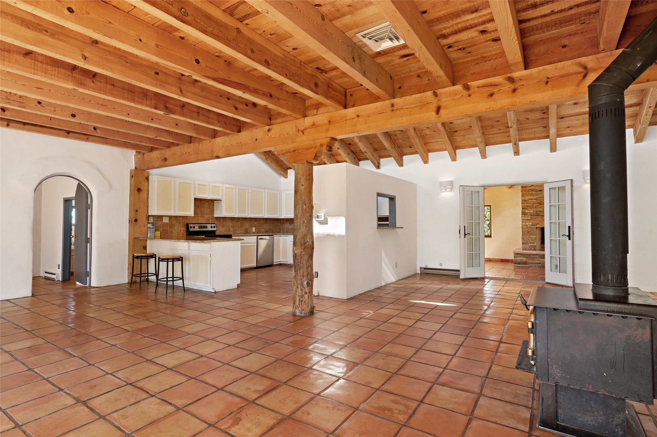 GRAB THIS DEAL! SINGLE OWNER - "As Is" passive solar charmer with views, privacy, wide open floorplan all located on a cul-de-sac and near a greenbelt. Spacious kitchen with great storage and two generous living areas, one opens to living and dining rooms and the other behind french doors with a stacked stone wood-burning fireplace. Beautiful beamed ceilings and Saltillo tile throughout. Nice bedroom separation. Primary bedroom has large walk-in closet. Updated guest bath. Walled front courtyard with Kiva fireplace and large fully fenced backyard. Lot corners have been flagged. Septic inspection in supplements. Two steps down to primary bedroom, one step down to den. Two woodstoves - one in primary bedroom and one in great room. New water heater in 2017. There is an evaporative cooler - seller does not guarantee functionality. Most exterior walls and some interior walls are Adobe or block. If of material interest, buyer is encouraged to determine. Super clean and ready to go!