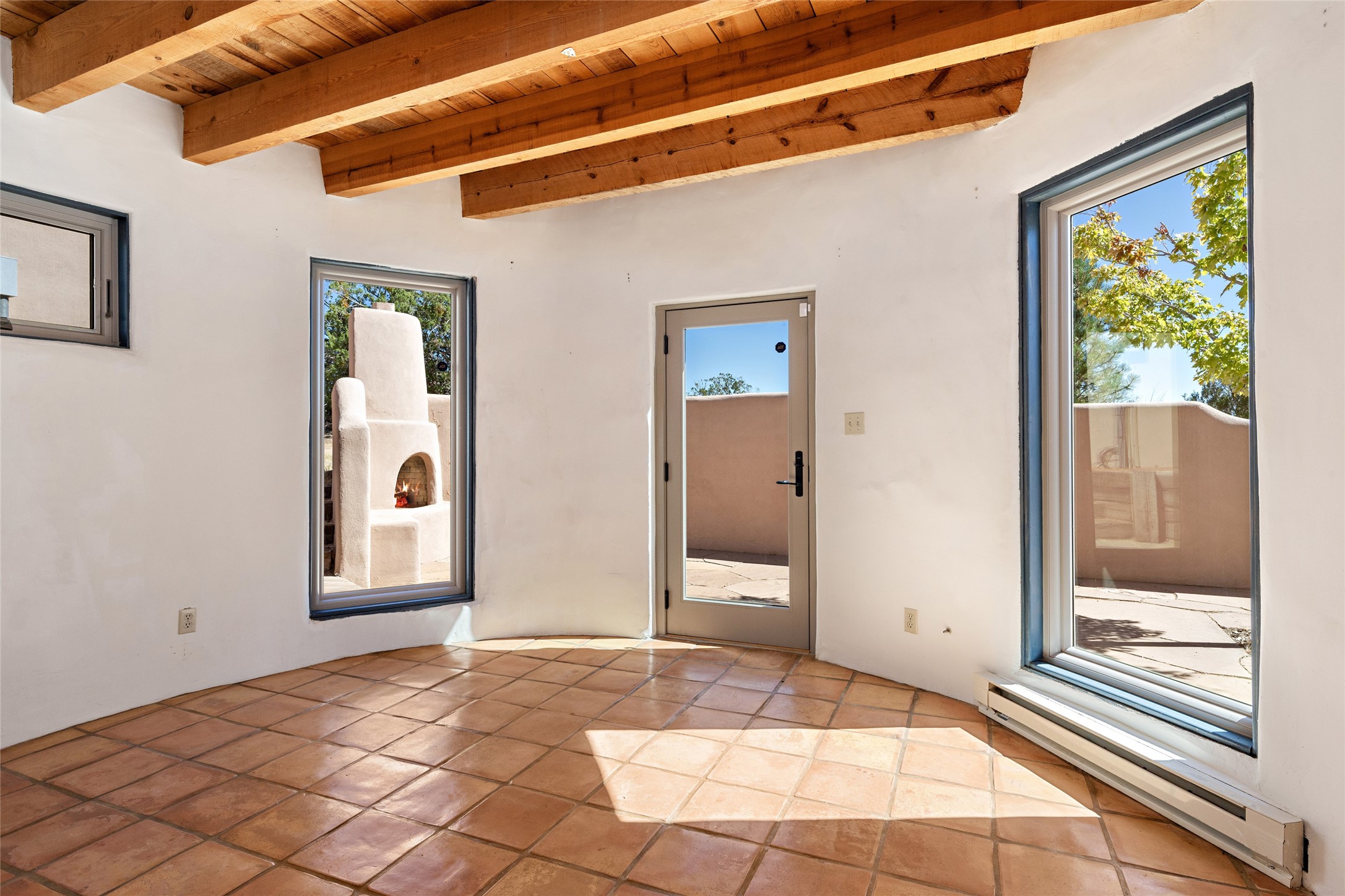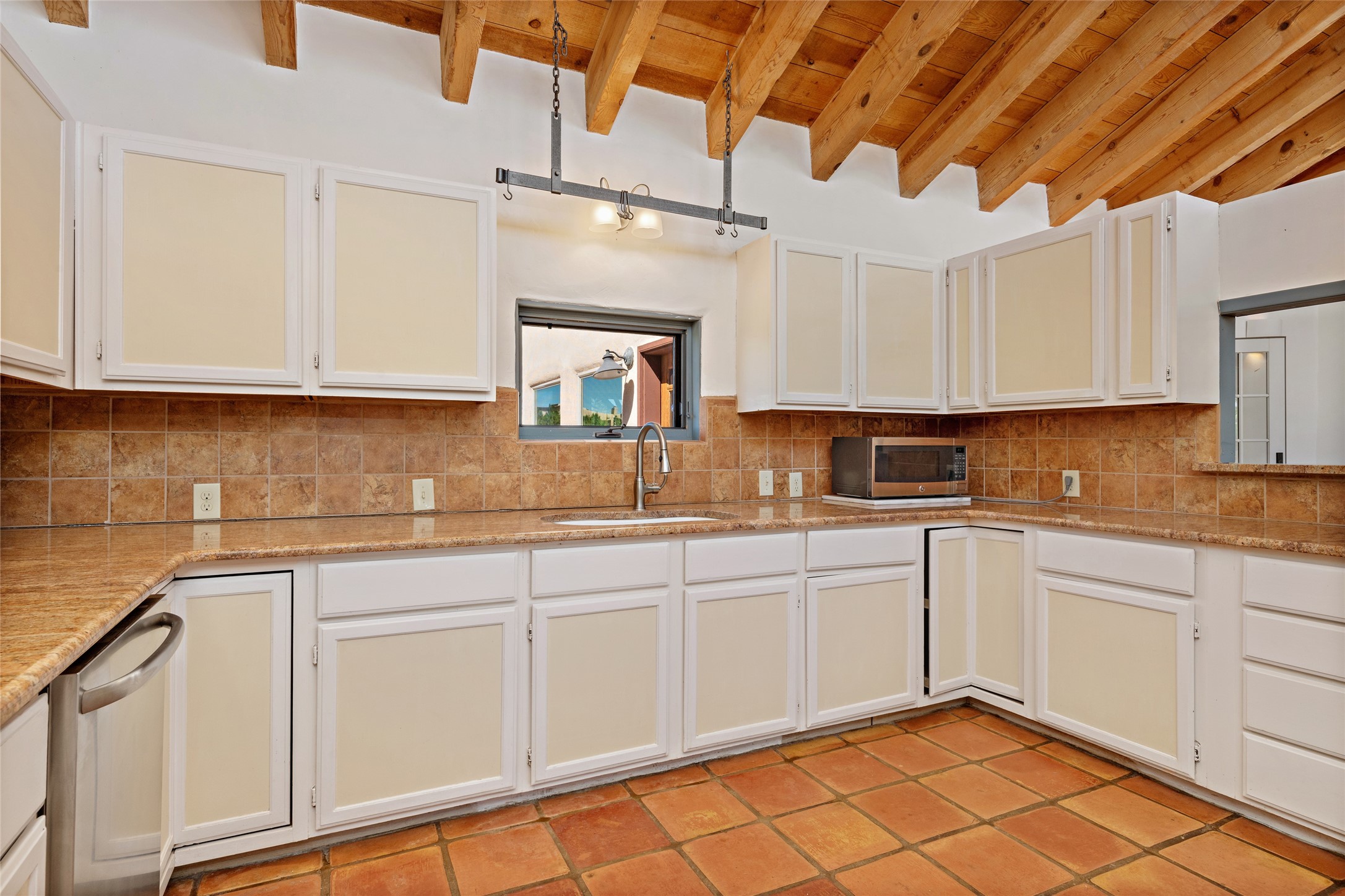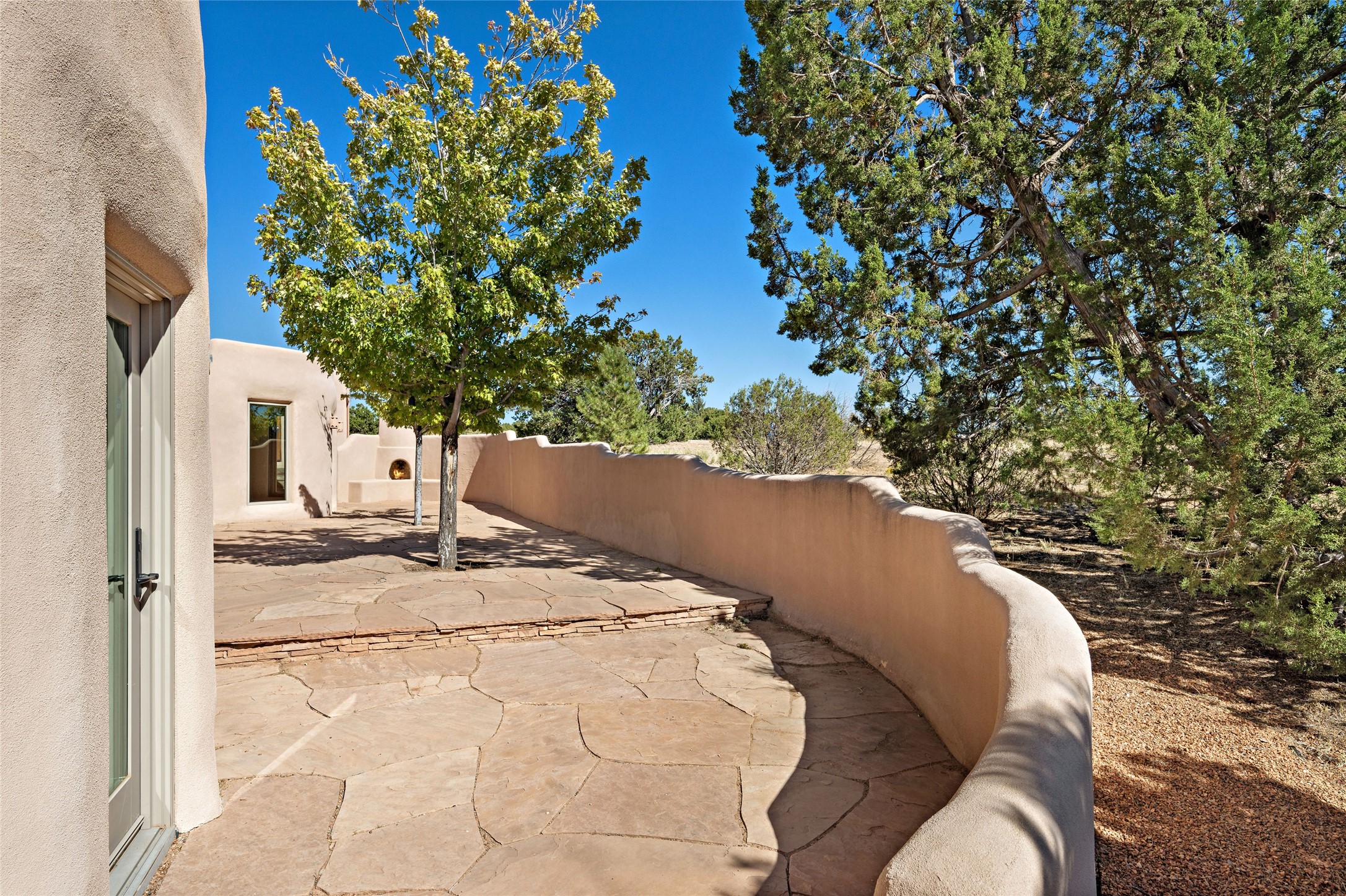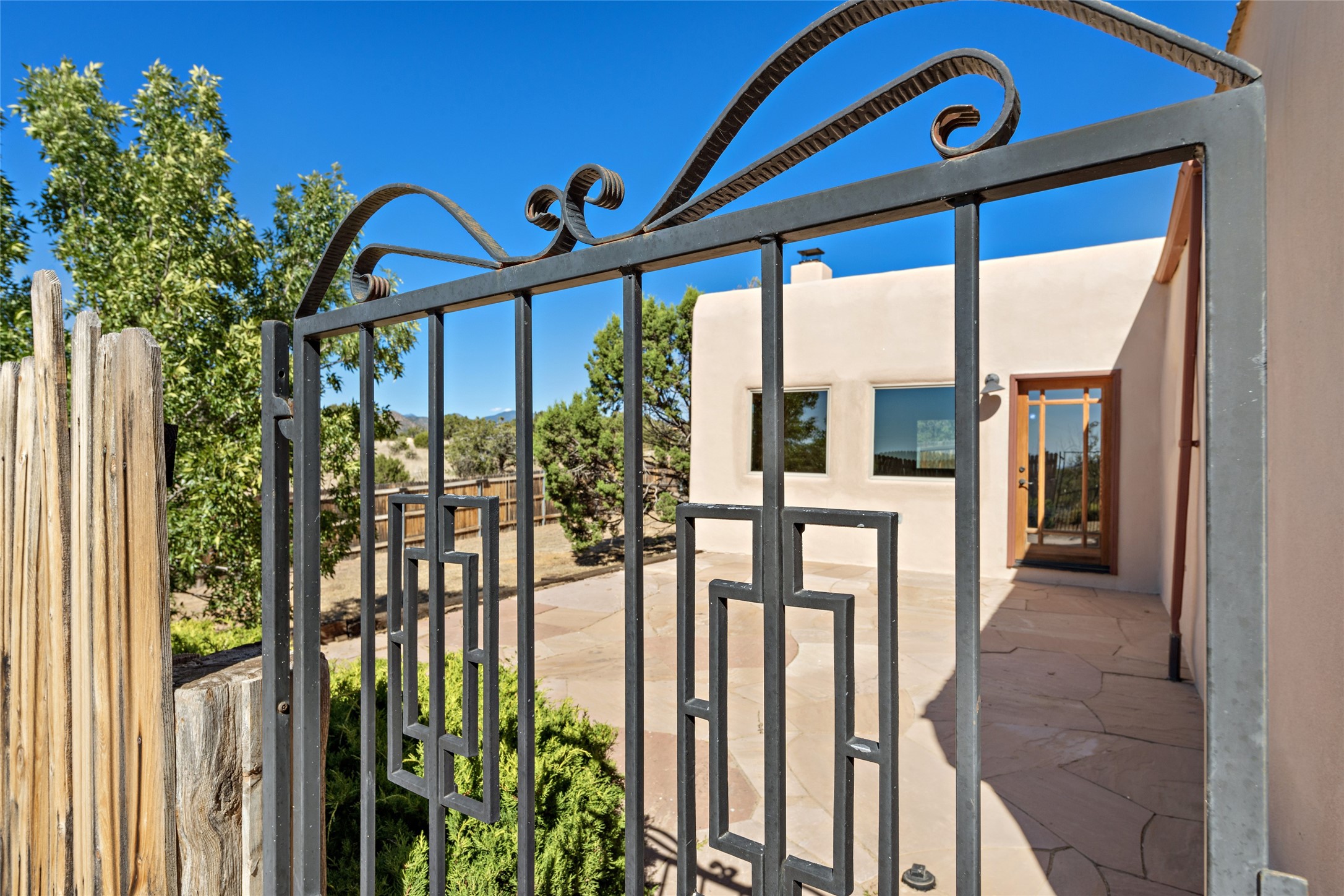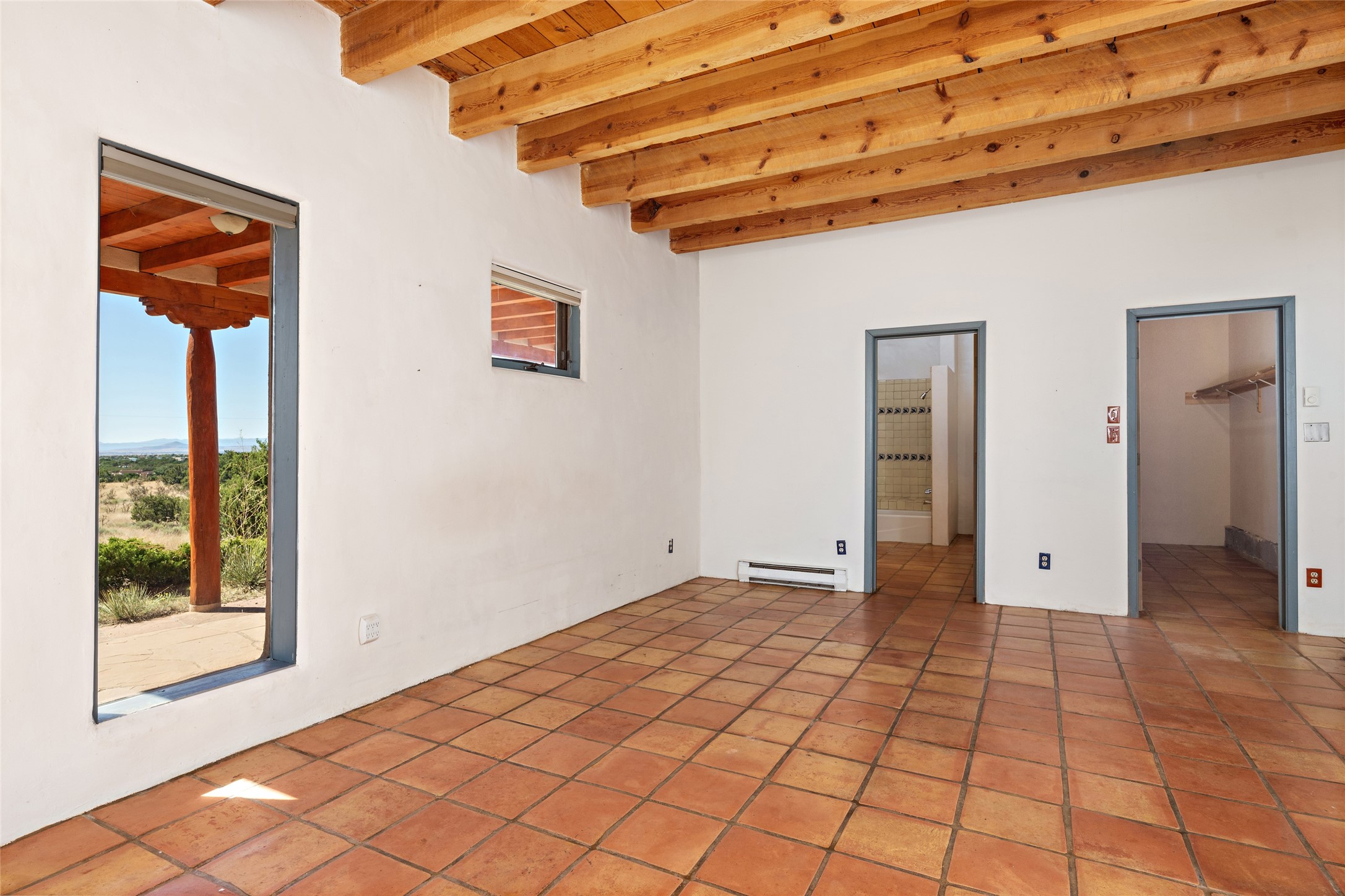 GRAB THIS DEAL! SINGLE OWNER - "As Is" passive solar charmer with views, privacy, wide open floorplan all located on a cul-de-sac and near a greenbelt. Spacious kitchen with great storage and two generous living areas, one opens to living and dining rooms and the other behind french doors with a stacked stone wood-burning fireplace. Beautiful beamed ceilings and Saltillo tile throughout. Nice bedroom separation. Primary bedroom has large walk-in closet. Updated guest bath. Walled front courtyard with Kiva fireplace and large fully fenced backyard. Lot corners have been flagged. Septic inspection in supplements. Two steps down to primary bedroom, one step down to den. Two woodstoves - one in primary bedroom and one in great room. New water heater in 2017. There is an evaporative cooler - seller does not guarantee functionality. Most exterior walls and some interior walls are Adobe or block. If of material interest, buyer is encouraged to determine. Super clean and ready to go!