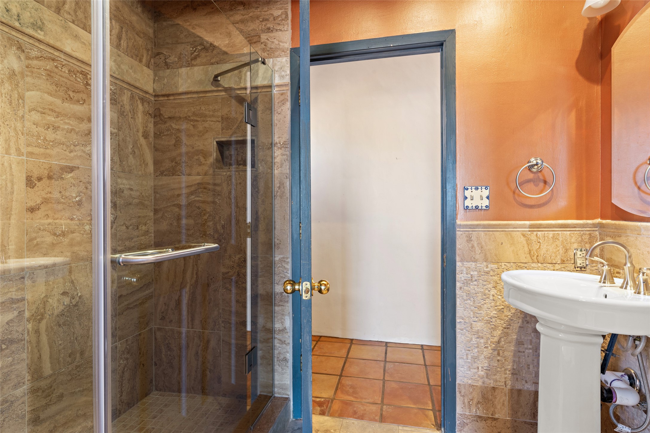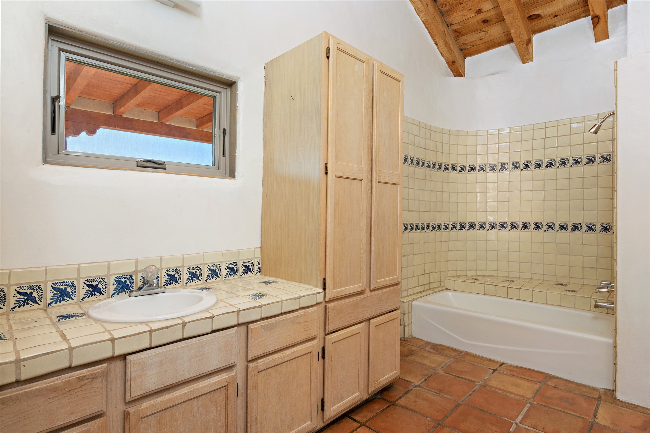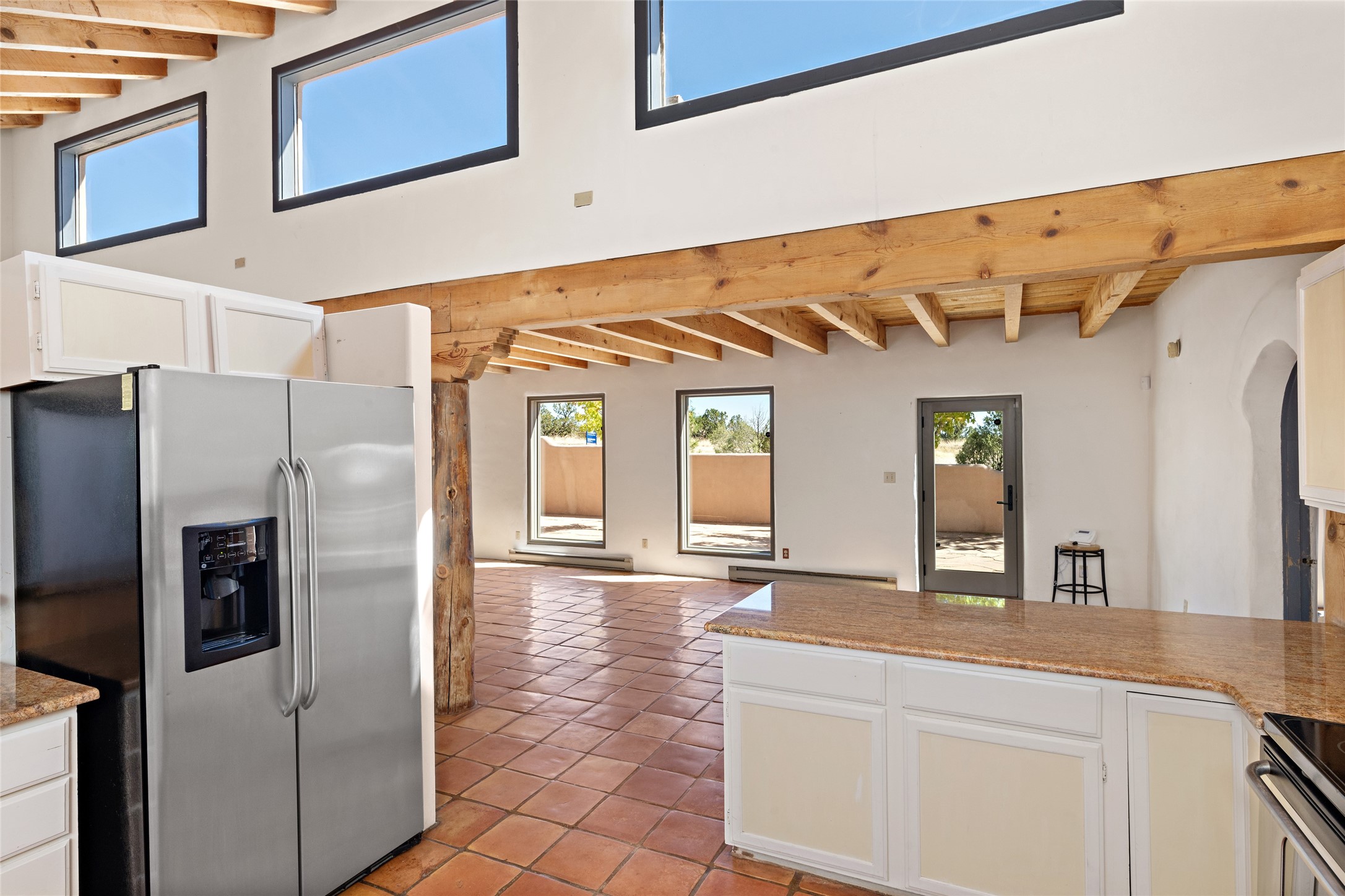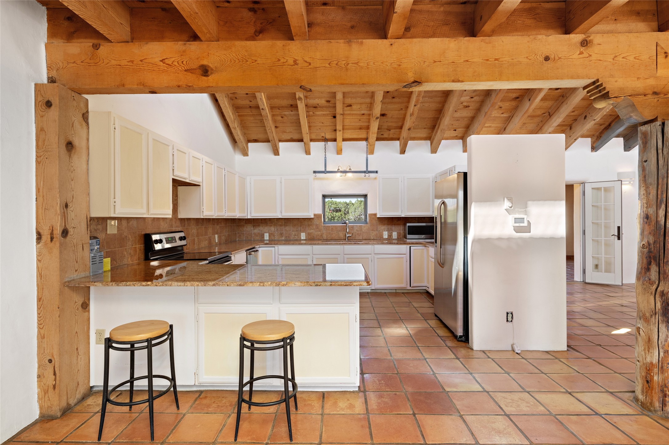 GRAB THIS DEAL! SINGLE OWNER - "As Is" passive solar charmer with views, privacy, wide open floorplan all located on a cul-de-sac and near a greenbelt. Spacious kitchen with great storage and two generous living areas, one opens to living and dining rooms and the other behind french doors with a stacked stone wood-burning fireplace. Beautiful beamed ceilings and Saltillo tile throughout. Nice bedroom separation. Primary bedroom has large walk-in closet. Updated guest bath. Walled front courtyard with Kiva fireplace and large fully fenced backyard. Lot corners have been flagged. Septic inspection in supplements. Two steps down to primary bedroom, one step down to den. Two woodstoves - one in primary bedroom and one in great room. New water heater in 2017. There is an evaporative cooler - seller does not guarantee functionality. Most exterior walls and some interior walls are Adobe or block. If of material interest, buyer is encouraged to determine. Super clean and ready to go!