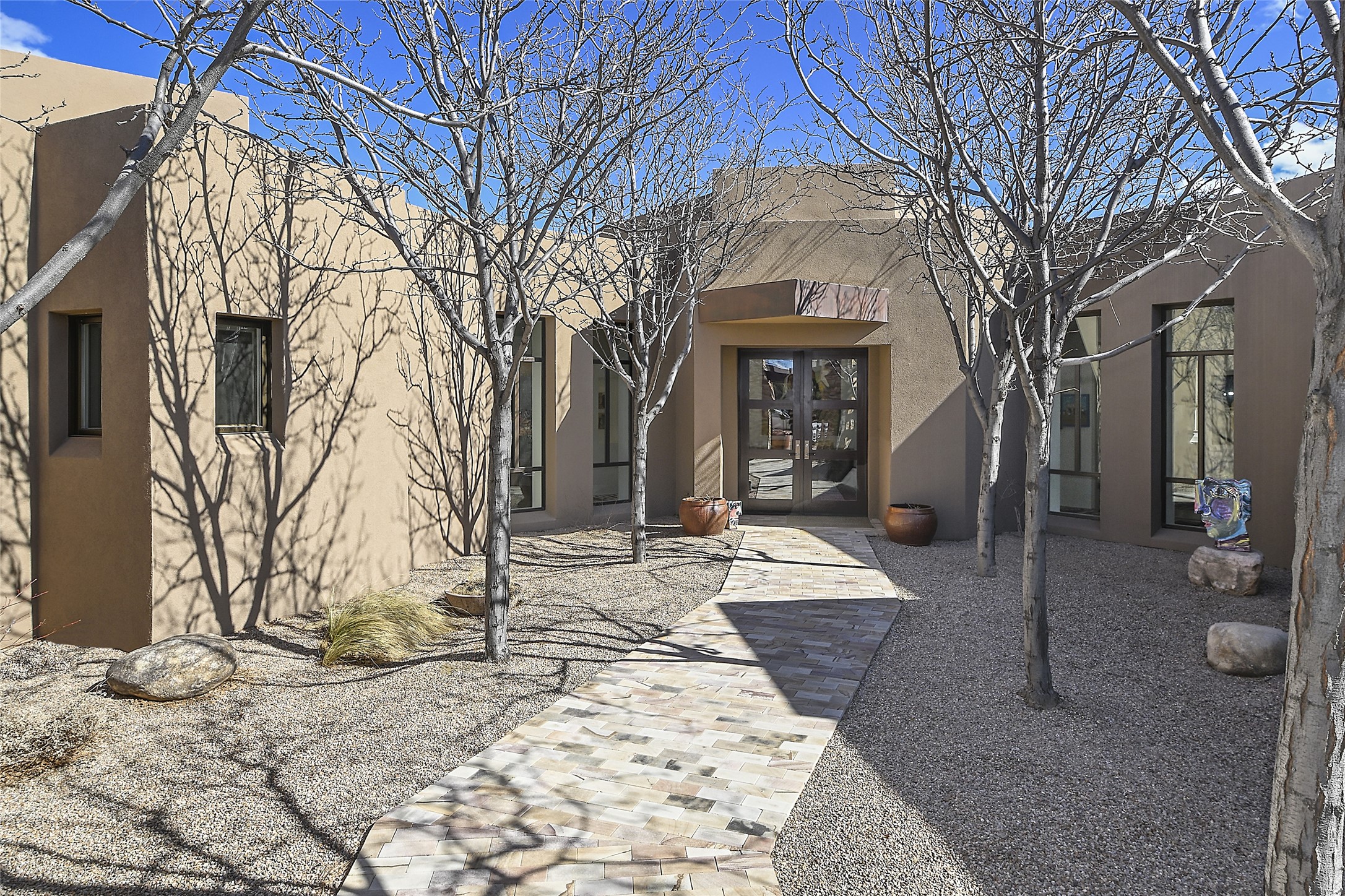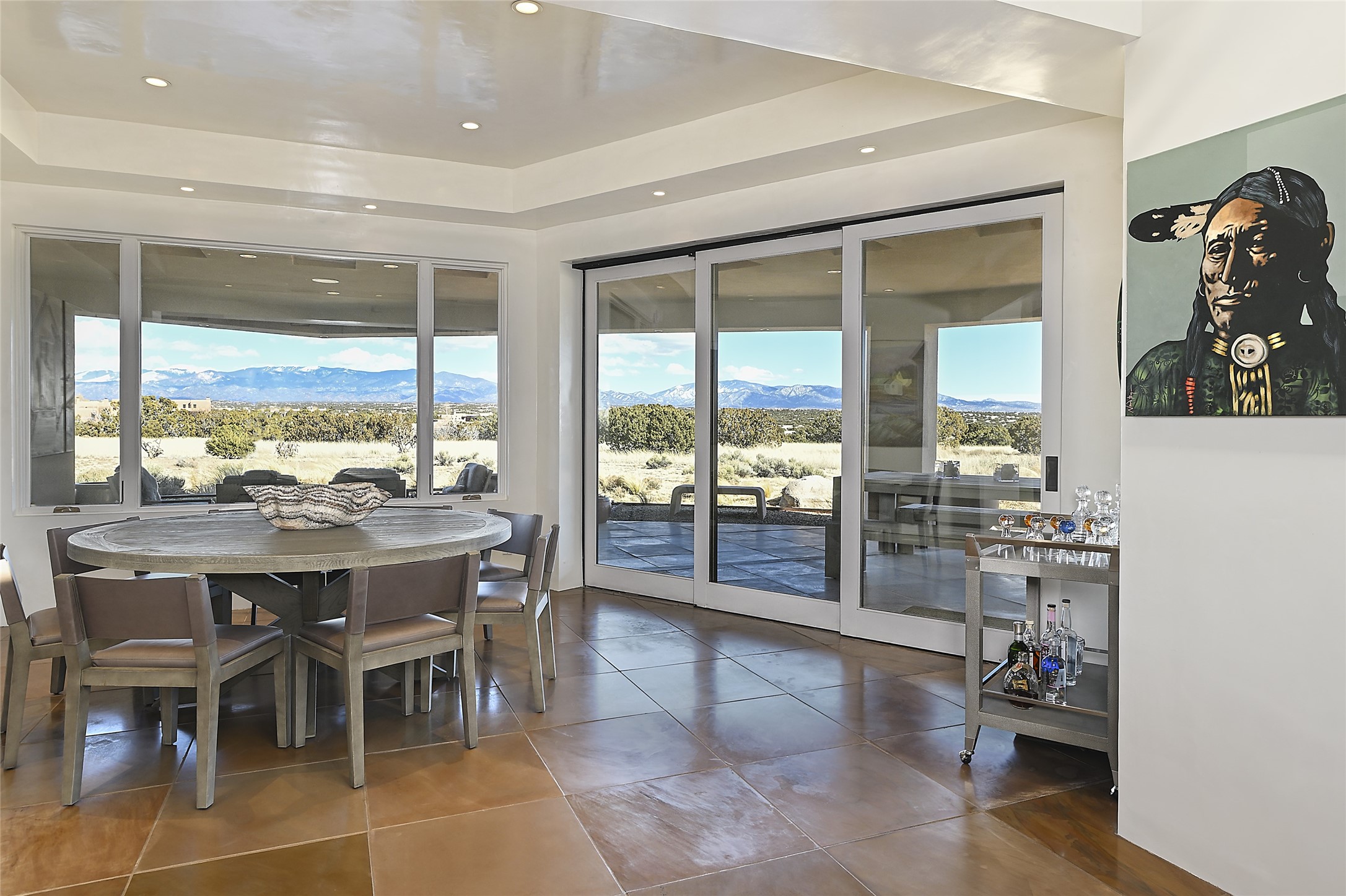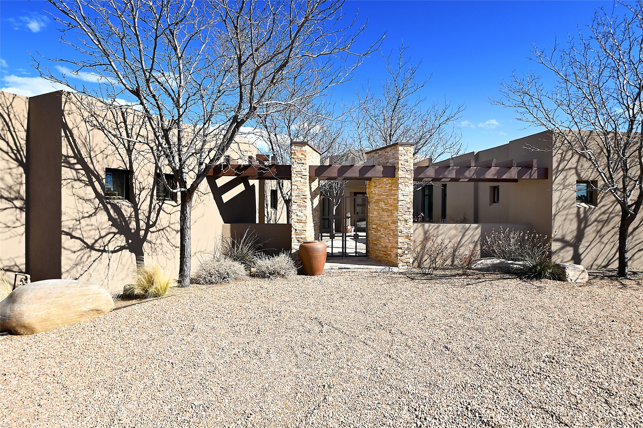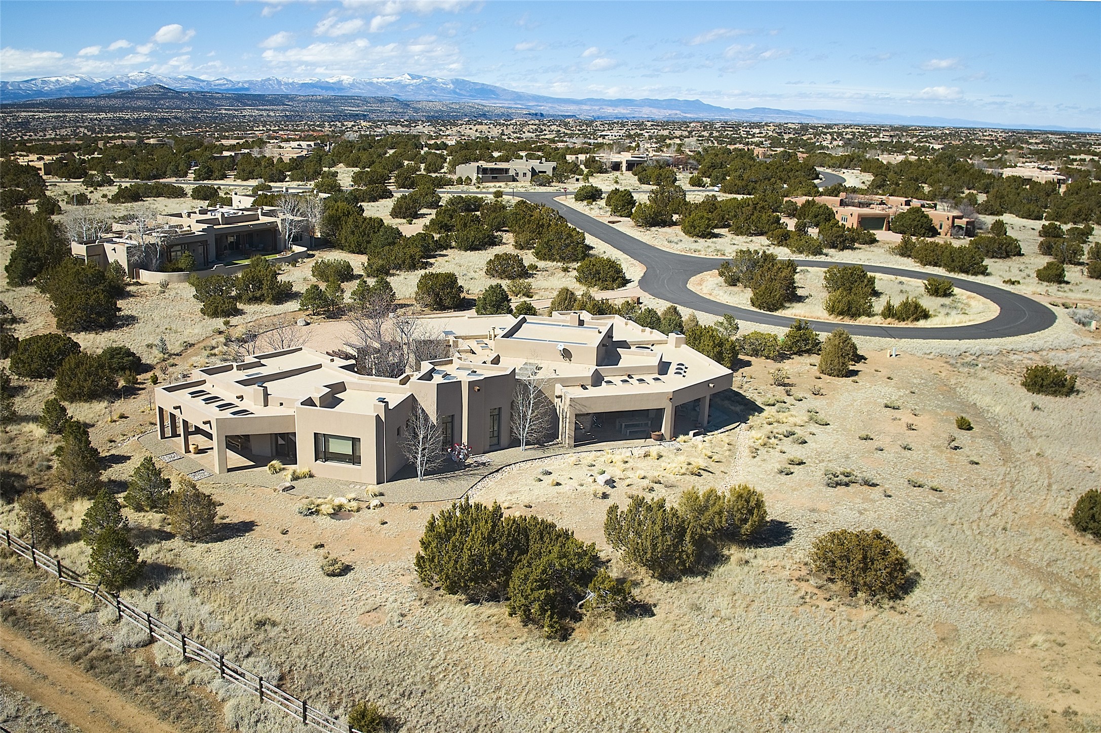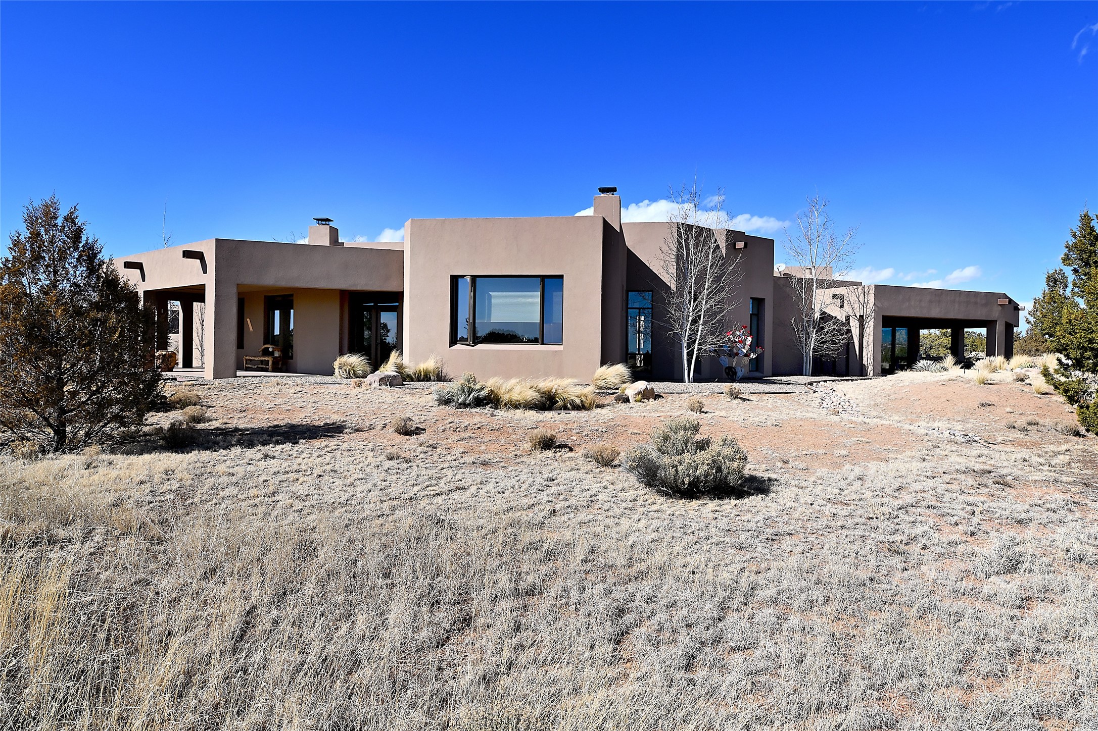 One-of-a kind chic 3 bed 3.5 bath custom contemporary home with a Southwest aesthetic on 1.6 + acres in Las Campanas. This single level home was specifically sited to capture the sweeping vistas of the Sangre de Cristo, Ortiz, and Sandia mountains. Ideal home for art collectors with high ceilings and generous wall spaces throughout. Open floor plan seamlessly merges interior spaces with outdoor areas creating an easy flow for everyday living and entertaining. Grand great room with 14' ceiling, rusted steel beams, long skylight, bronzed metal-clad fireplace, and sleek custom cabinetry. Gourmet kitchen is appointed with high end appliances (2 new 2020 Bosch dishwashers and Bosch microwave), pot filler, wine cooler, oversized center island with prep sink, and walk-in fitted pantry. The luxurious owner's suite has its own fireplace, wet bar, fitted walk-in closet redone by California Closets (2020), and spa-like bath with Stone Forest limestone soaking tub and glass tile shower. Study/media room with bleached oak floors, double desks, and fireplace provides flex space and privacy for work or artistic pursuits. Separate guest wing with two guest rooms with ensuite baths. New wool carpets were installed in bedrooms in 2020. Ample utility room with new (2022) LG washer/dryer, built-in hamper, ironing board, and cedar closet. Other highlights include diamond plaster walls, built in speakers, 3 car heated garage with wall system, xeriscaping and a rainwater harvesting system.