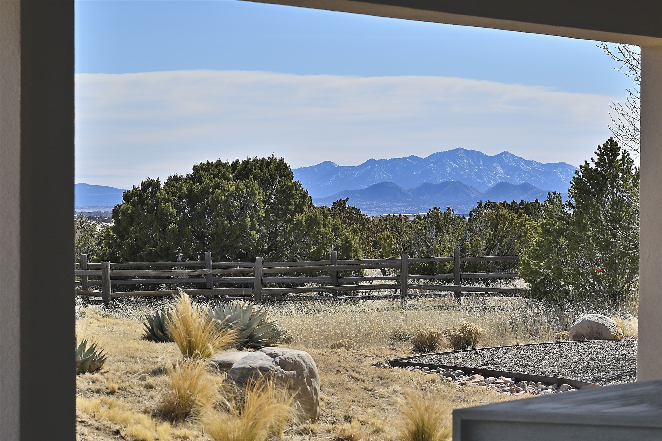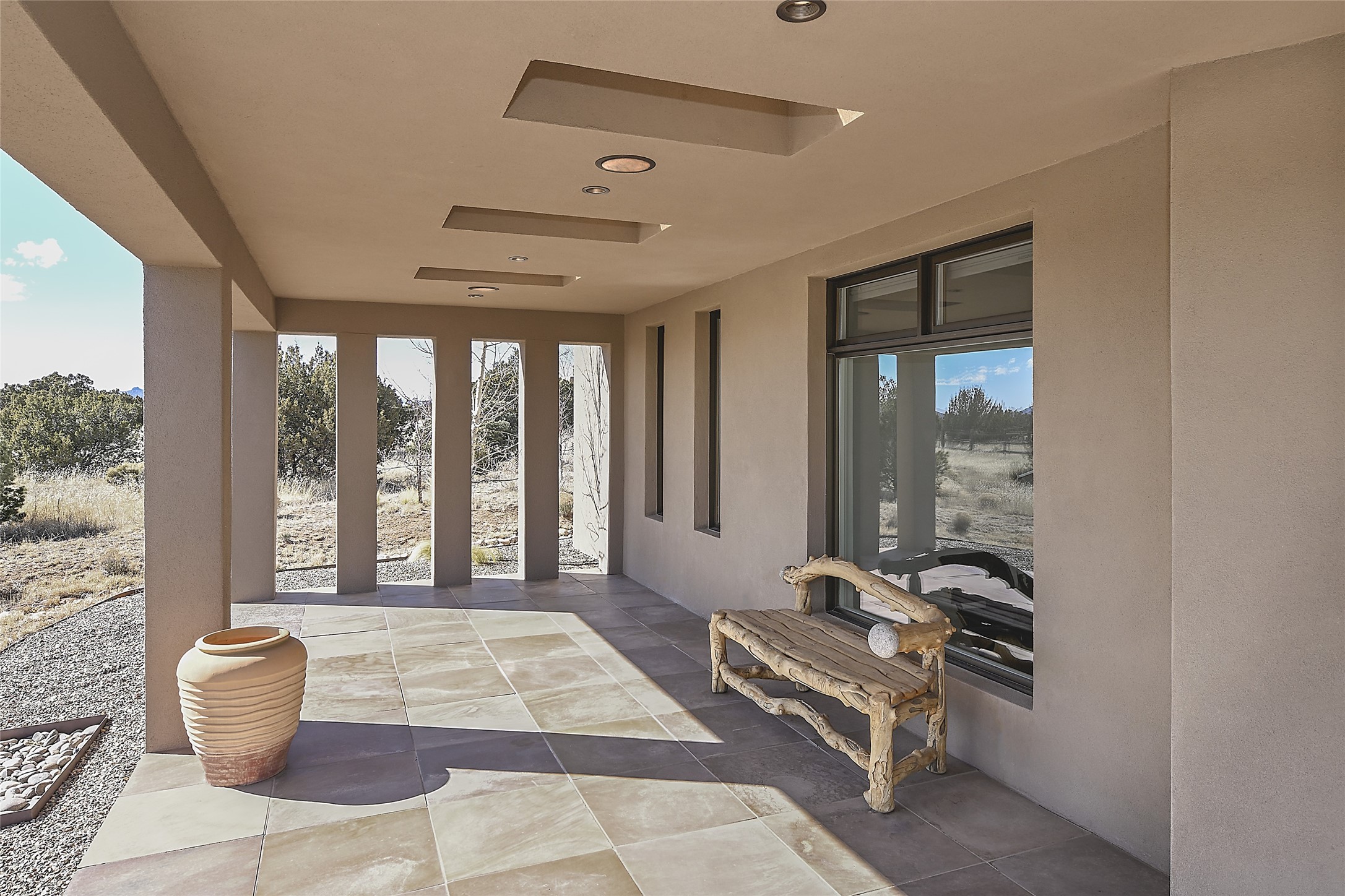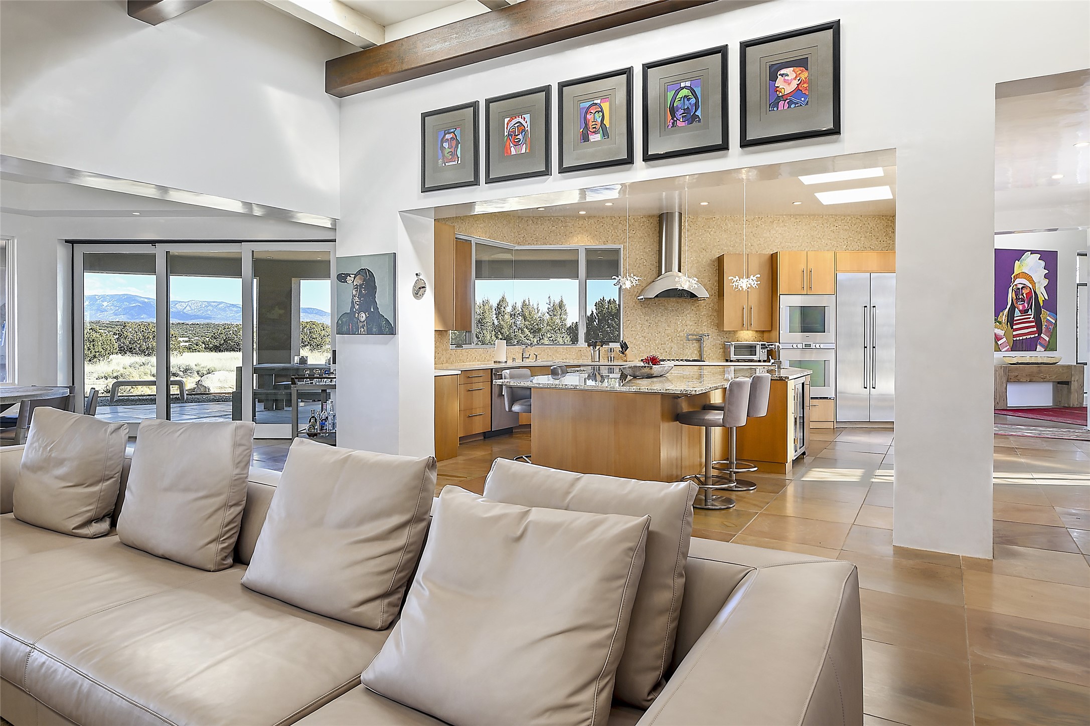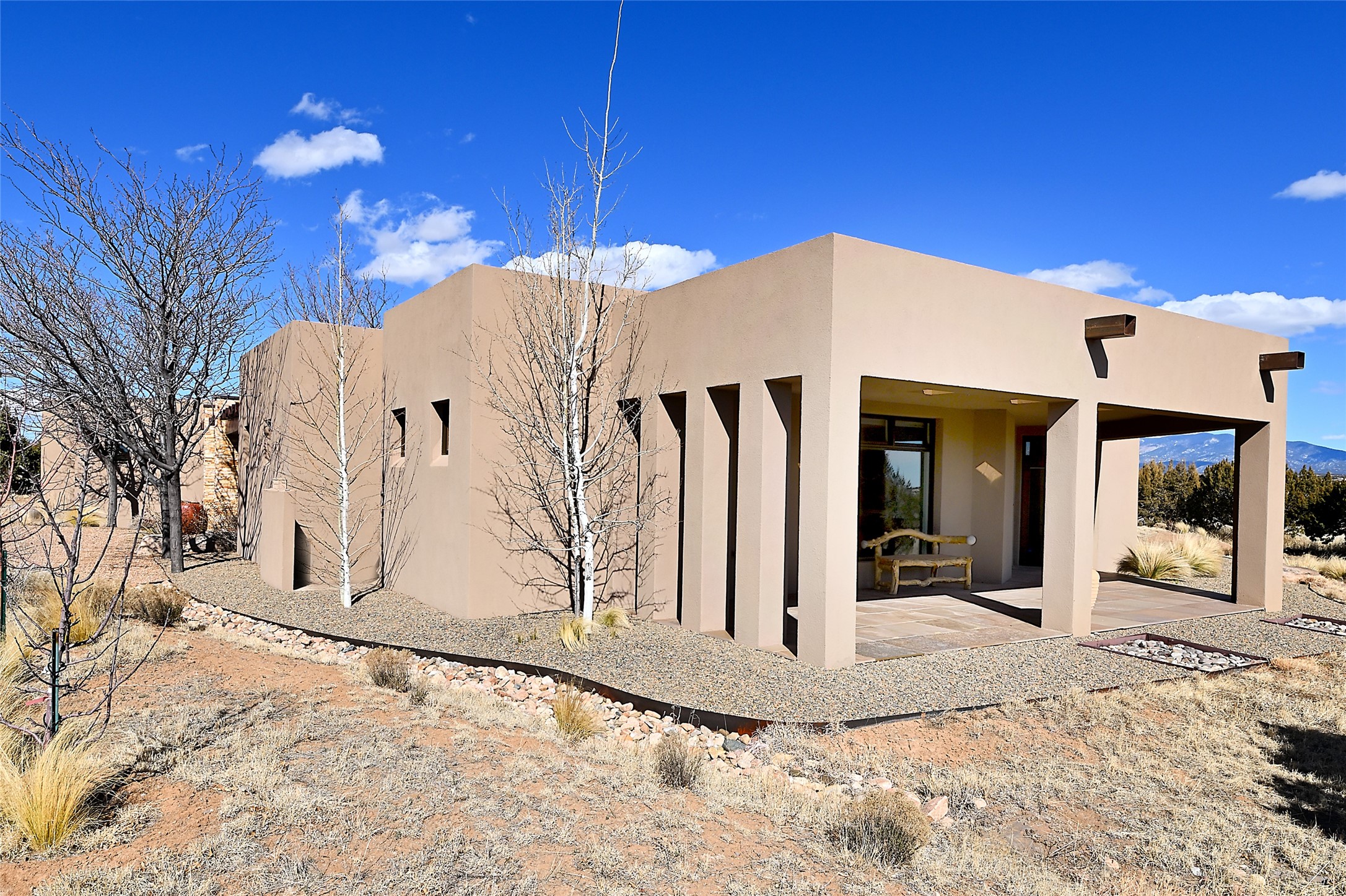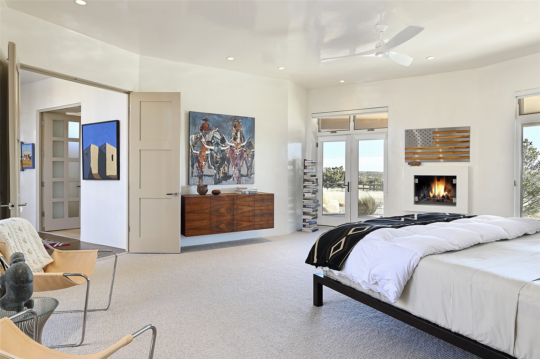 One-of-a kind chic 3 bed 3.5 bath custom contemporary home with a Southwest aesthetic on 1.6 + acres in Las Campanas. This single level home was specifically sited to capture the sweeping vistas of the Sangre de Cristo, Ortiz, and Sandia mountains. Ideal home for art collectors with high ceilings and generous wall spaces throughout. Open floor plan seamlessly merges interior spaces with outdoor areas creating an easy flow for everyday living and entertaining. Grand great room with 14' ceiling, rusted steel beams, long skylight, bronzed metal-clad fireplace, and sleek custom cabinetry. Gourmet kitchen is appointed with high end appliances (2 new 2020 Bosch dishwashers and Bosch microwave), pot filler, wine cooler, oversized center island with prep sink, and walk-in fitted pantry. The luxurious owner's suite has its own fireplace, wet bar, fitted walk-in closet redone by California Closets (2020), and spa-like bath with Stone Forest limestone soaking tub and glass tile shower. Study/media room with bleached oak floors, double desks, and fireplace provides flex space and privacy for work or artistic pursuits. Separate guest wing with two guest rooms with ensuite baths. New wool carpets were installed in bedrooms in 2020. Ample utility room with new (2022) LG washer/dryer, built-in hamper, ironing board, and cedar closet. Other highlights include diamond plaster walls, built in speakers, 3 car heated garage with wall system, xeriscaping and a rainwater harvesting system.