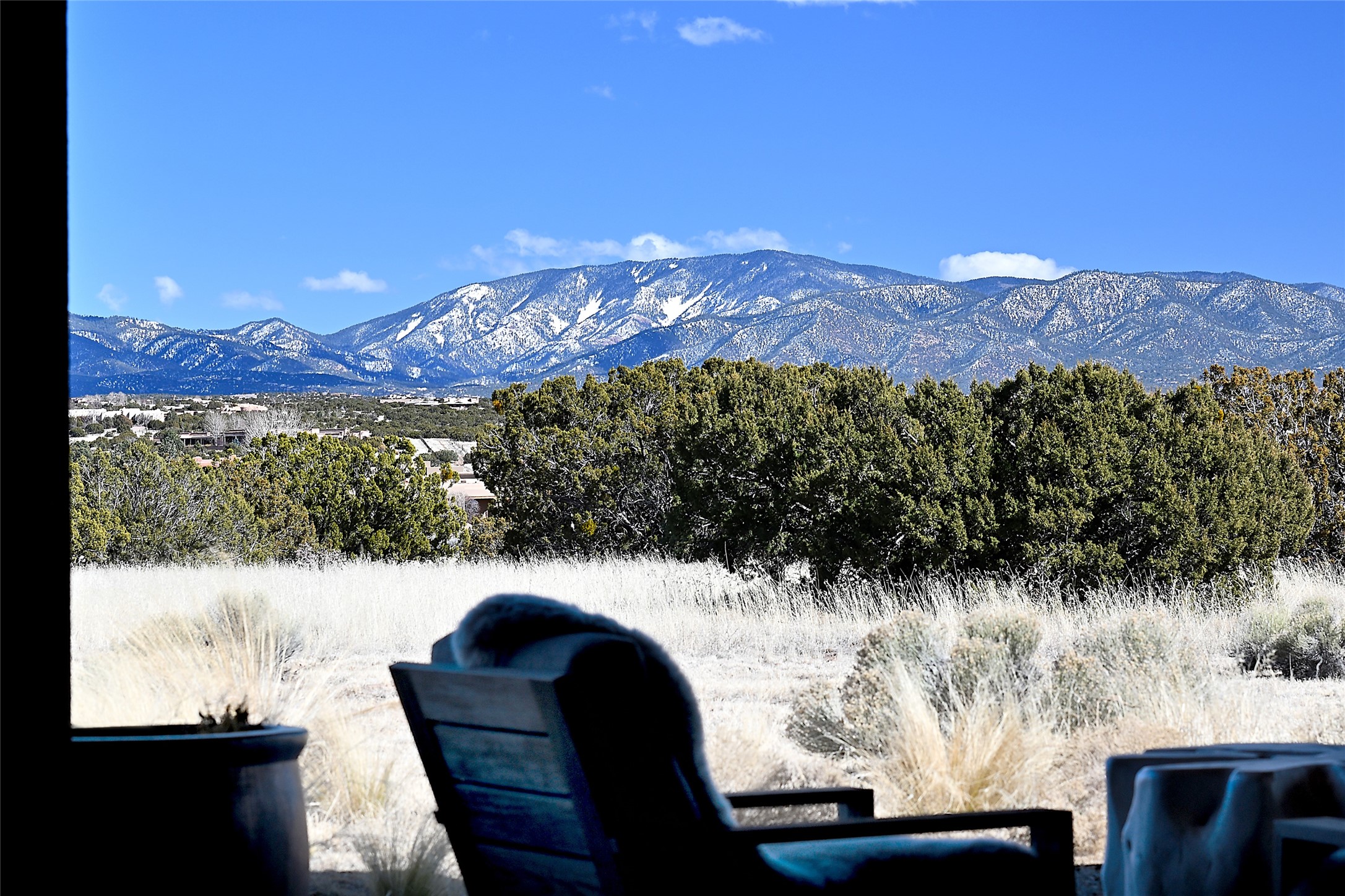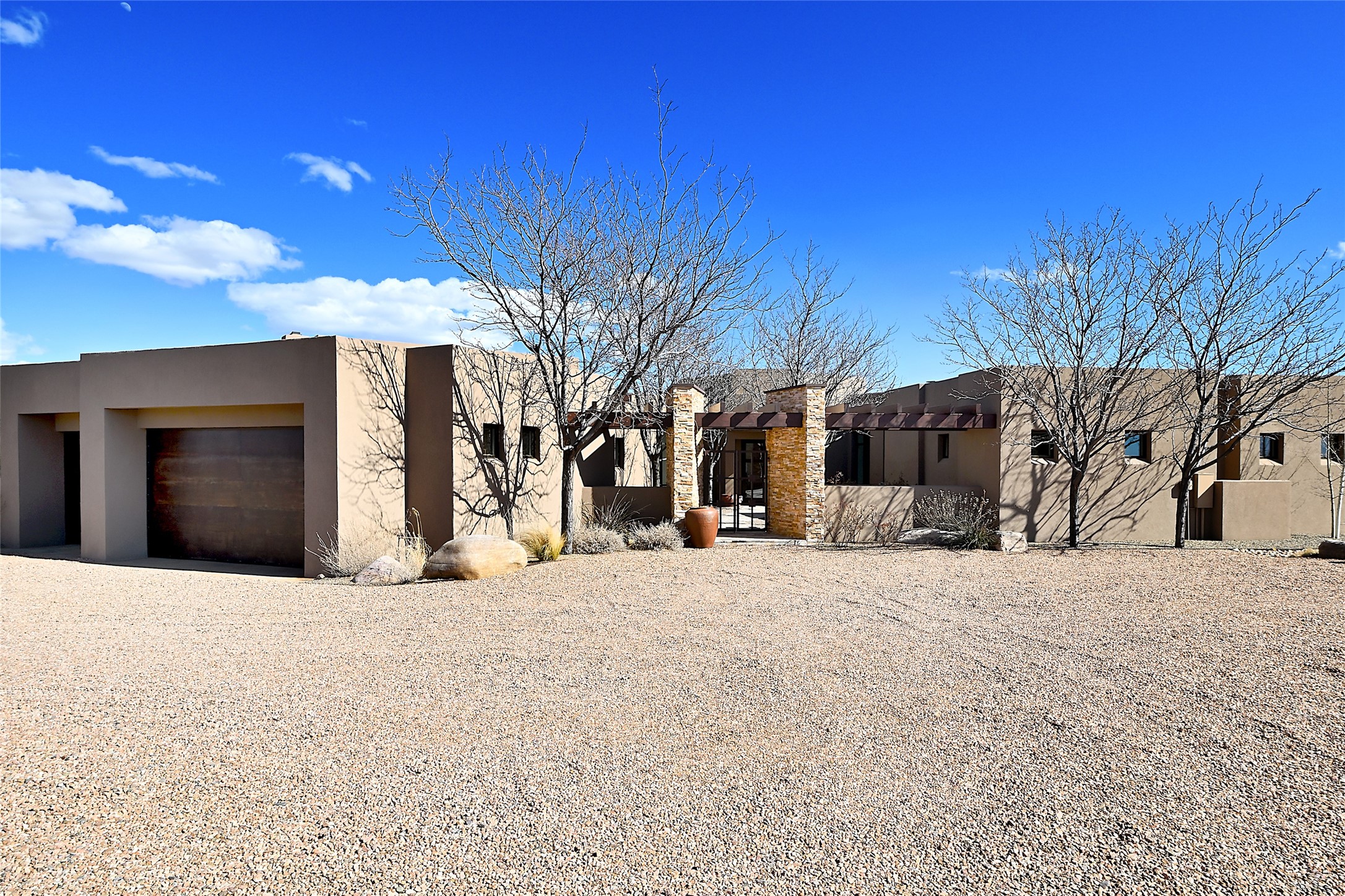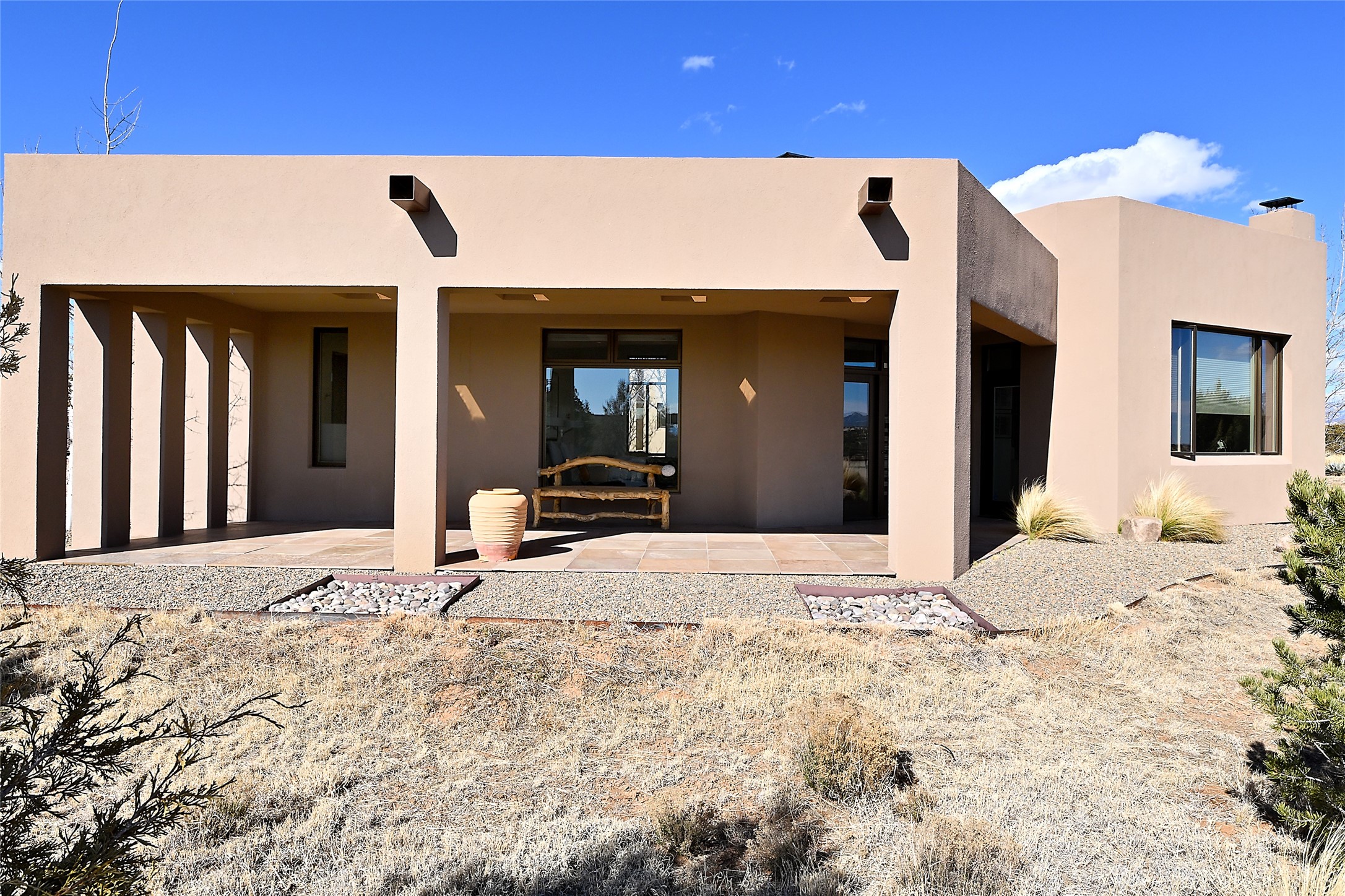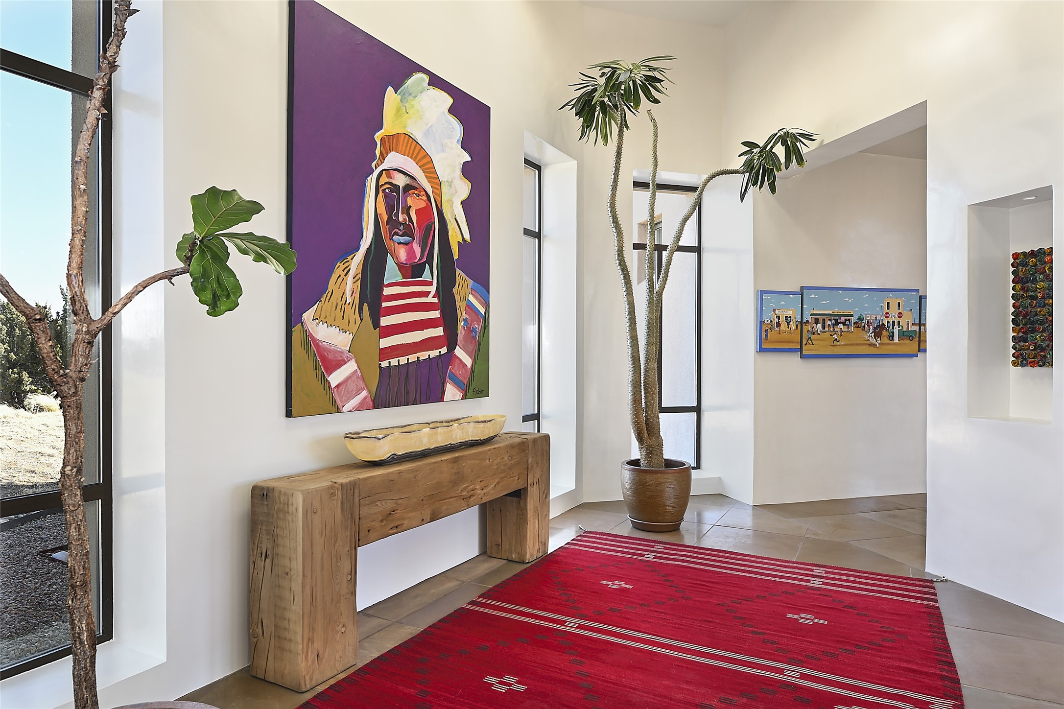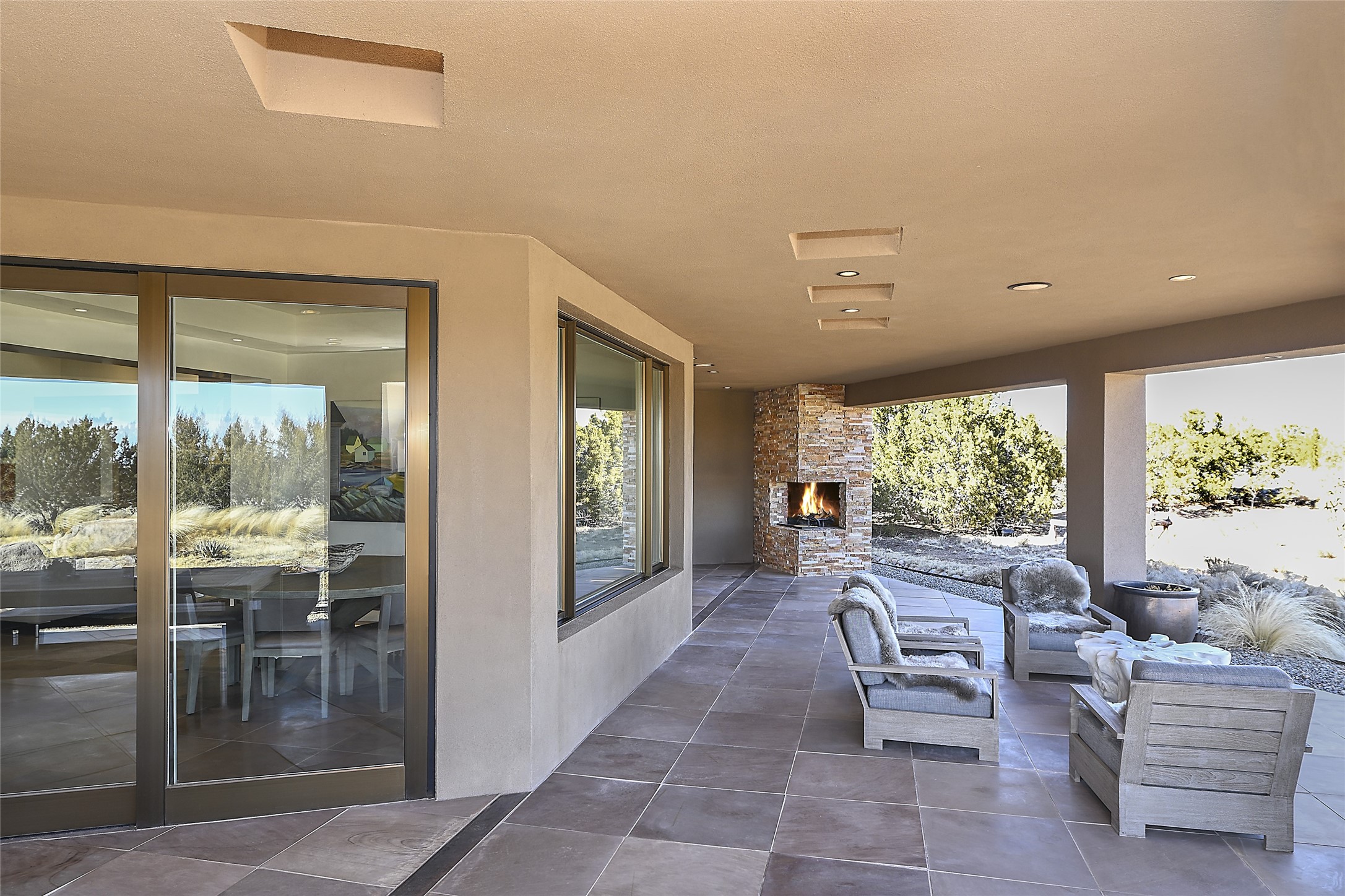 One-of-a kind chic 3 bed 3.5 bath custom contemporary home with a Southwest aesthetic on 1.6 + acres in Las Campanas. This single level home was specifically sited to capture the sweeping vistas of the Sangre de Cristo, Ortiz, and Sandia mountains. Ideal home for art collectors with high ceilings and generous wall spaces throughout. Open floor plan seamlessly merges interior spaces with outdoor areas creating an easy flow for everyday living and entertaining. Grand great room with 14' ceiling, rusted steel beams, long skylight, bronzed metal-clad fireplace, and sleek custom cabinetry. Gourmet kitchen is appointed with high end appliances (2 new 2020 Bosch dishwashers and Bosch microwave), pot filler, wine cooler, oversized center island with prep sink, and walk-in fitted pantry. The luxurious owner's suite has its own fireplace, wet bar, fitted walk-in closet redone by California Closets (2020), and spa-like bath with Stone Forest limestone soaking tub and glass tile shower. Study/media room with bleached oak floors, double desks, and fireplace provides flex space and privacy for work or artistic pursuits. Separate guest wing with two guest rooms with ensuite baths. New wool carpets were installed in bedrooms in 2020. Ample utility room with new (2022) LG washer/dryer, built-in hamper, ironing board, and cedar closet. Other highlights include diamond plaster walls, built in speakers, 3 car heated garage with wall system, xeriscaping and a rainwater harvesting system.