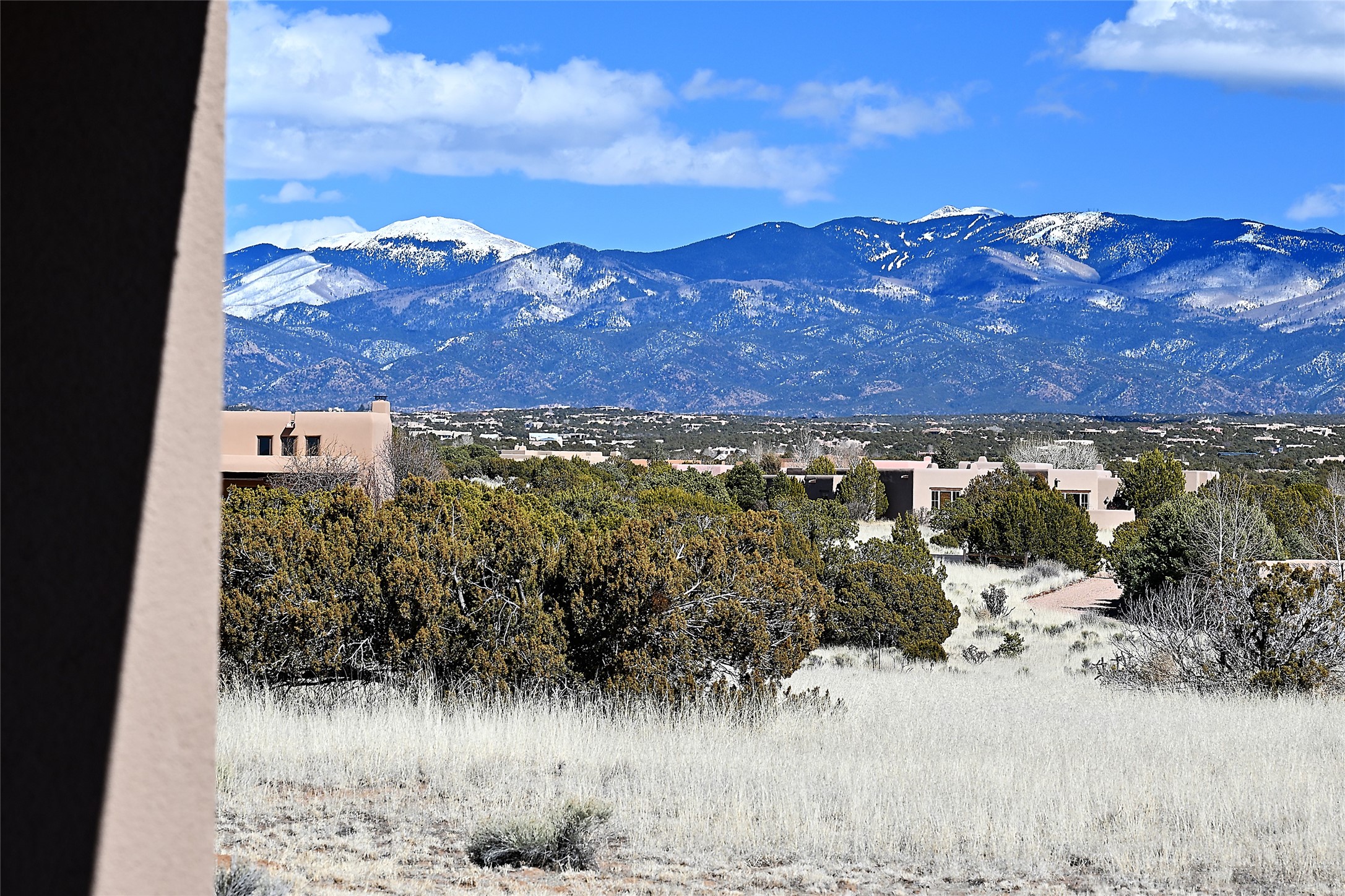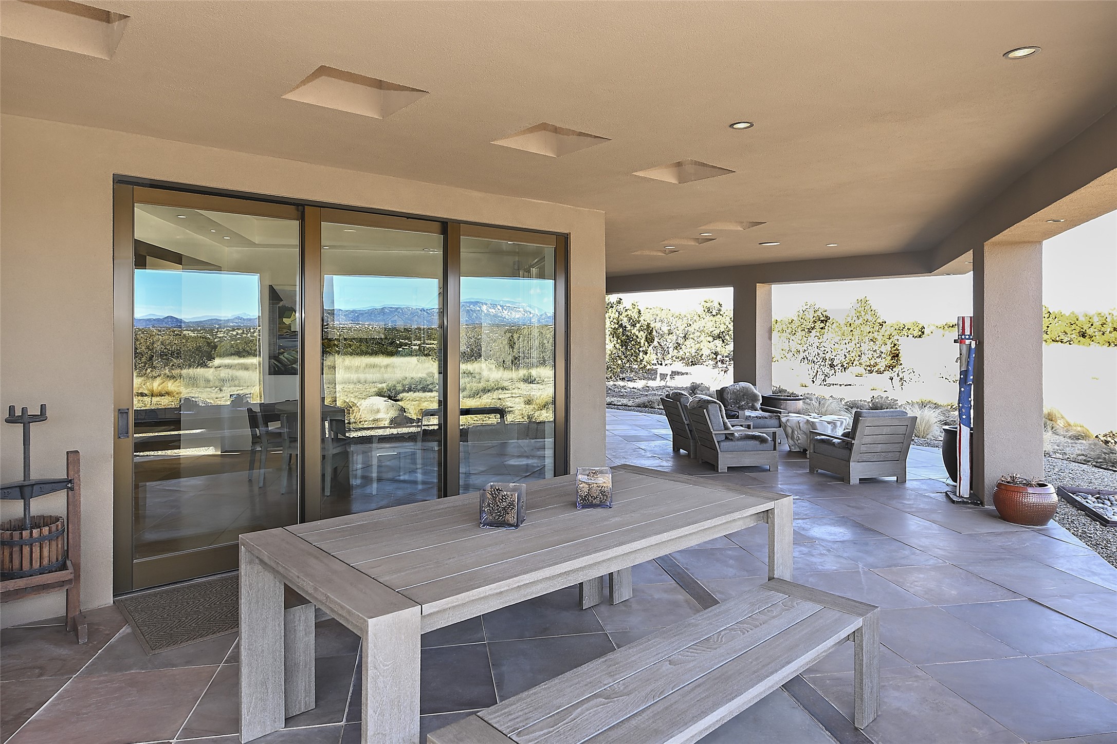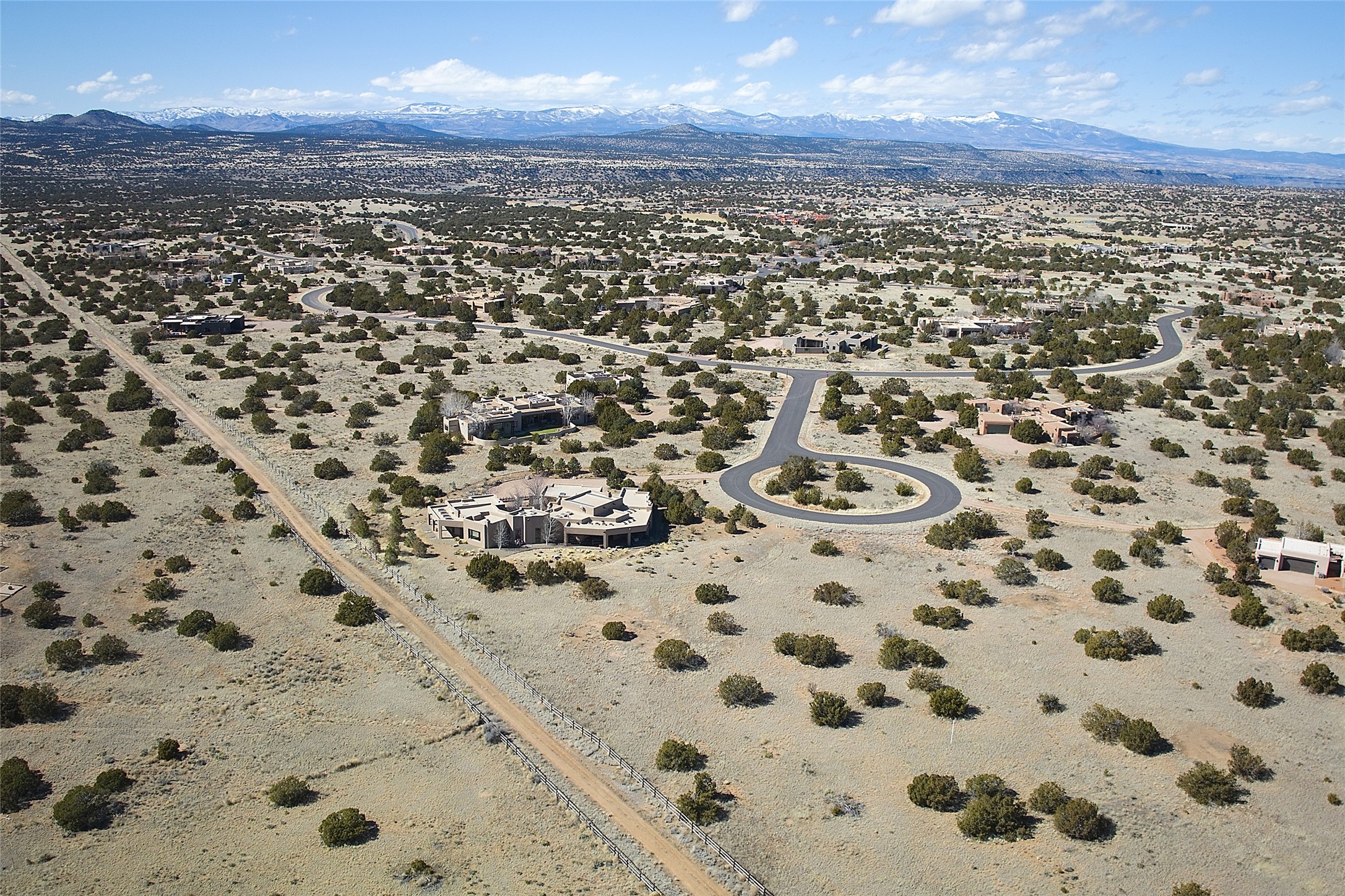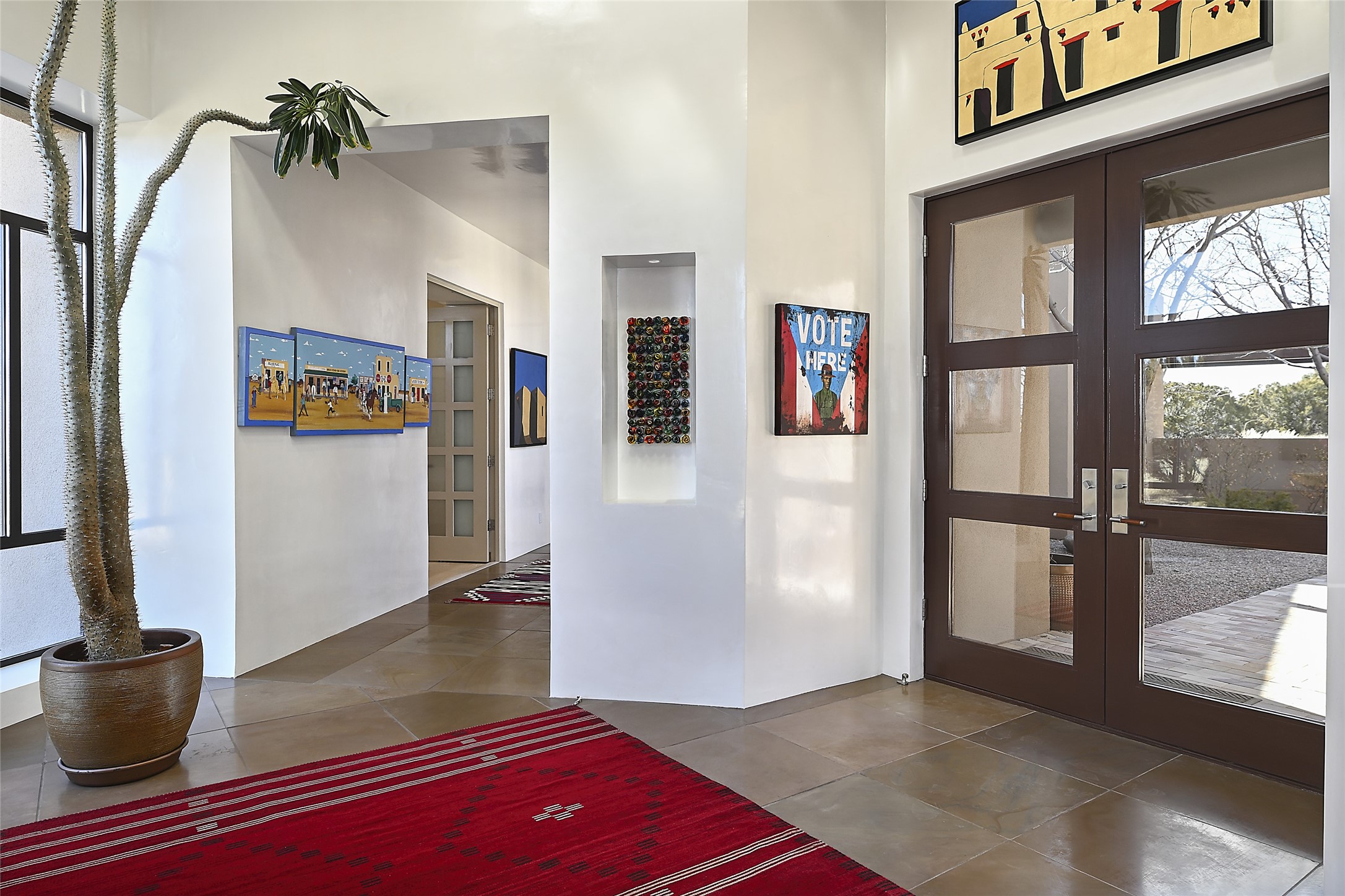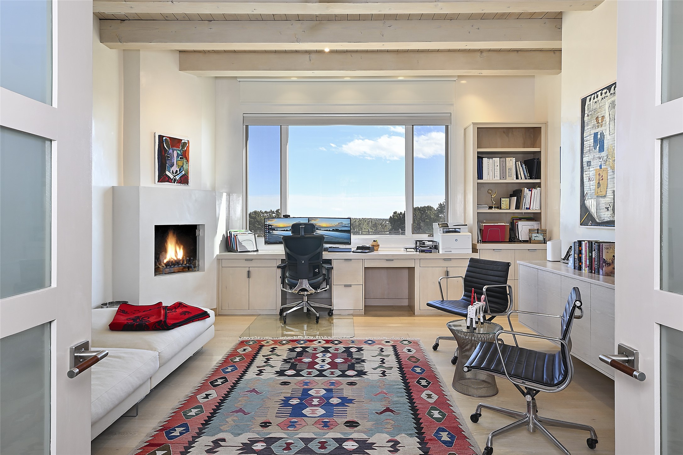 One-of-a kind chic 3 bed 3.5 bath custom contemporary home with a Southwest aesthetic on 1.6 + acres in Las Campanas. This single level home was specifically sited to capture the sweeping vistas of the Sangre de Cristo, Ortiz, and Sandia mountains. Ideal home for art collectors with high ceilings and generous wall spaces throughout. Open floor plan seamlessly merges interior spaces with outdoor areas creating an easy flow for everyday living and entertaining. Grand great room with 14' ceiling, rusted steel beams, long skylight, bronzed metal-clad fireplace, and sleek custom cabinetry. Gourmet kitchen is appointed with high end appliances (2 new 2020 Bosch dishwashers and Bosch microwave), pot filler, wine cooler, oversized center island with prep sink, and walk-in fitted pantry. The luxurious owner's suite has its own fireplace, wet bar, fitted walk-in closet redone by California Closets (2020), and spa-like bath with Stone Forest limestone soaking tub and glass tile shower. Study/media room with bleached oak floors, double desks, and fireplace provides flex space and privacy for work or artistic pursuits. Separate guest wing with two guest rooms with ensuite baths. New wool carpets were installed in bedrooms in 2020. Ample utility room with new (2022) LG washer/dryer, built-in hamper, ironing board, and cedar closet. Other highlights include diamond plaster walls, built in speakers, 3 car heated garage with wall system, xeriscaping and a rainwater harvesting system.