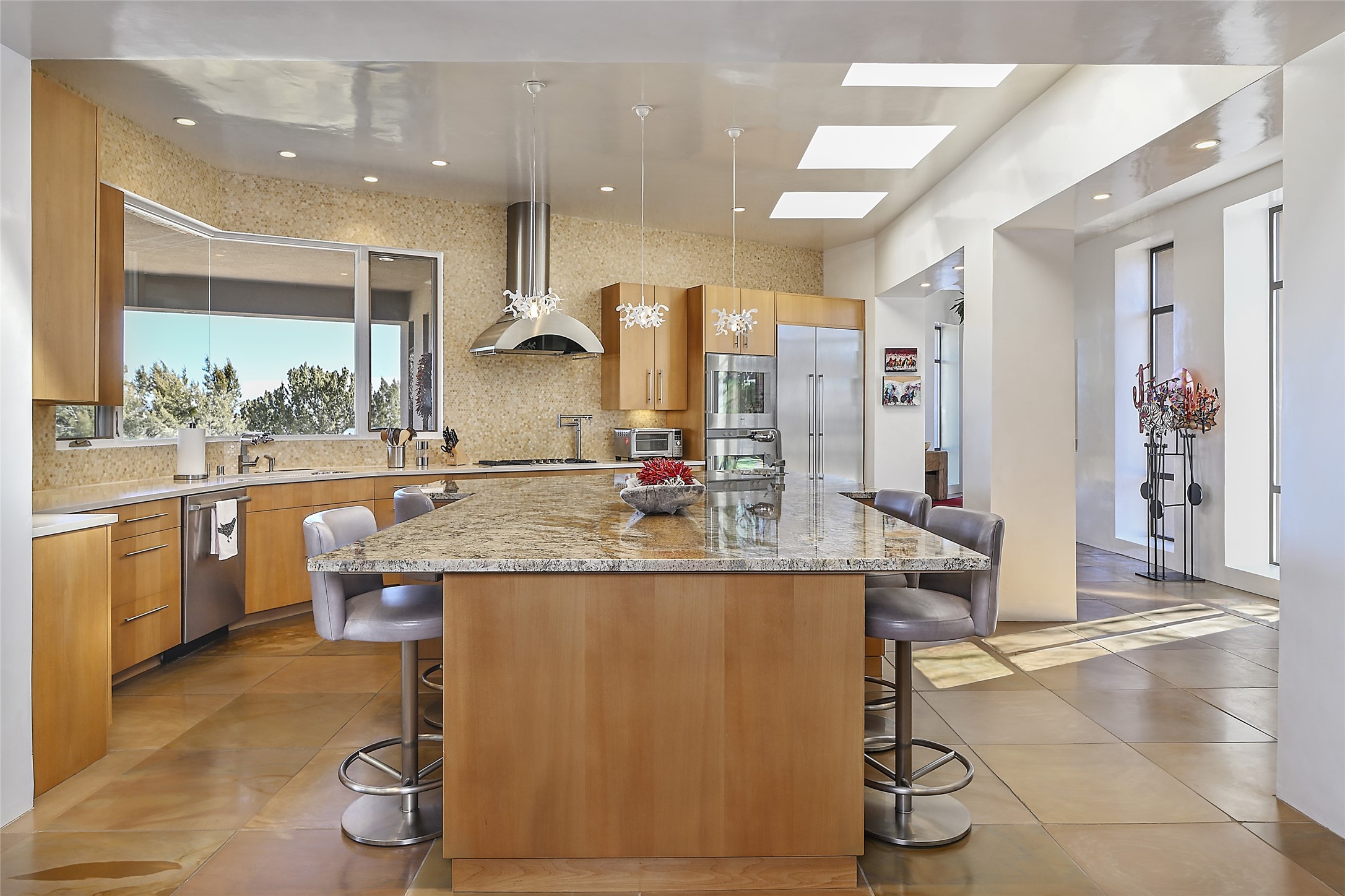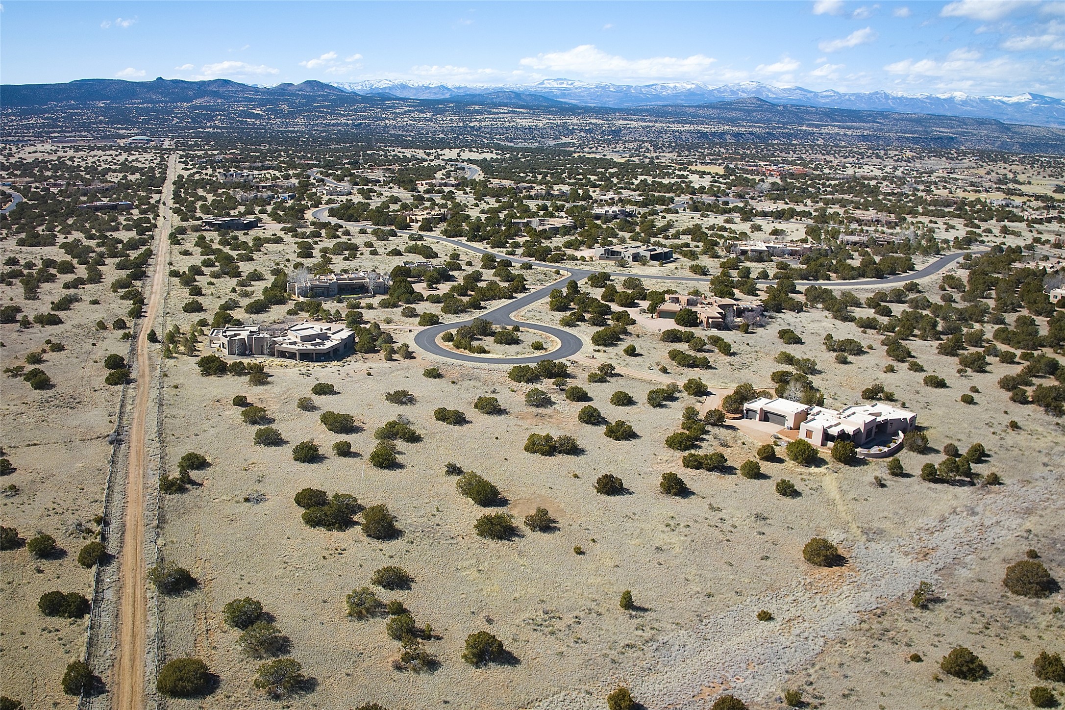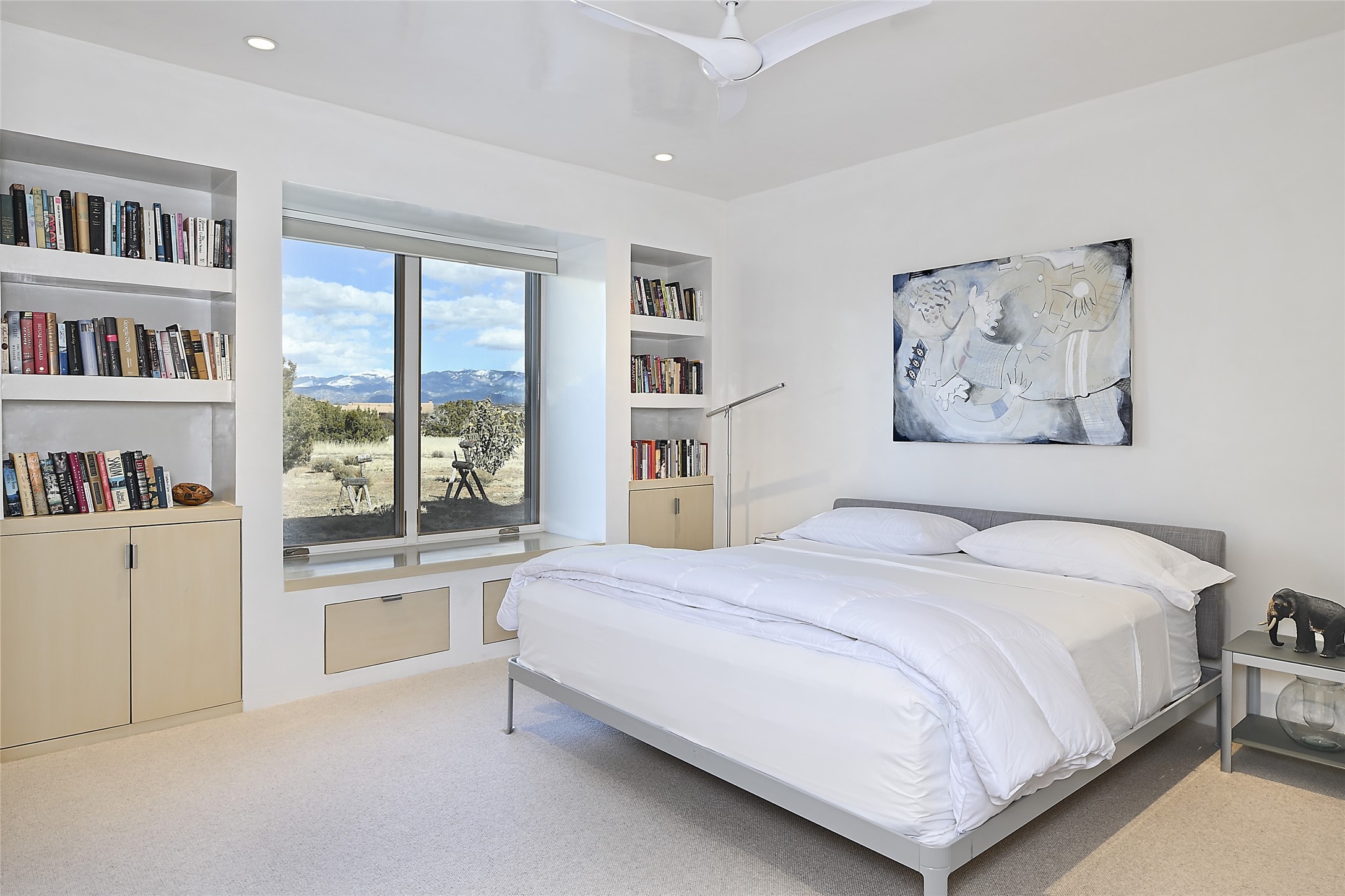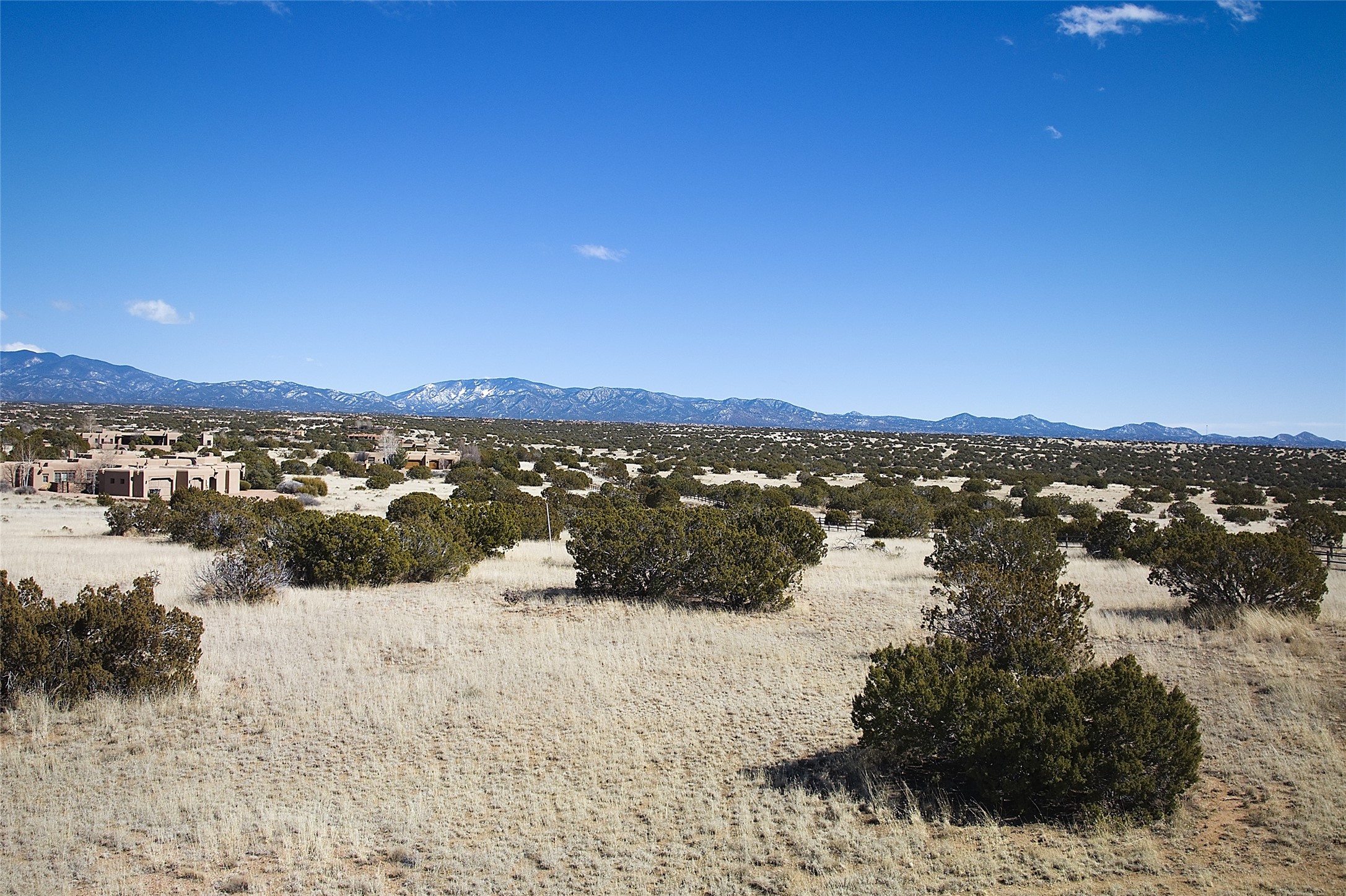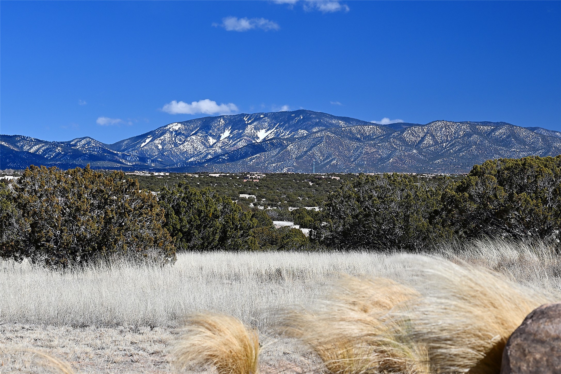 One-of-a kind chic 3 bed 3.5 bath custom contemporary home with a Southwest aesthetic on 1.6 + acres in Las Campanas. This single level home was specifically sited to capture the sweeping vistas of the Sangre de Cristo, Ortiz, and Sandia mountains. Ideal home for art collectors with high ceilings and generous wall spaces throughout. Open floor plan seamlessly merges interior spaces with outdoor areas creating an easy flow for everyday living and entertaining. Grand great room with 14' ceiling, rusted steel beams, long skylight, bronzed metal-clad fireplace, and sleek custom cabinetry. Gourmet kitchen is appointed with high end appliances (2 new 2020 Bosch dishwashers and Bosch microwave), pot filler, wine cooler, oversized center island with prep sink, and walk-in fitted pantry. The luxurious owner's suite has its own fireplace, wet bar, fitted walk-in closet redone by California Closets (2020), and spa-like bath with Stone Forest limestone soaking tub and glass tile shower. Study/media room with bleached oak floors, double desks, and fireplace provides flex space and privacy for work or artistic pursuits. Separate guest wing with two guest rooms with ensuite baths. New wool carpets were installed in bedrooms in 2020. Ample utility room with new (2022) LG washer/dryer, built-in hamper, ironing board, and cedar closet. Other highlights include diamond plaster walls, built in speakers, 3 car heated garage with wall system, xeriscaping and a rainwater harvesting system.