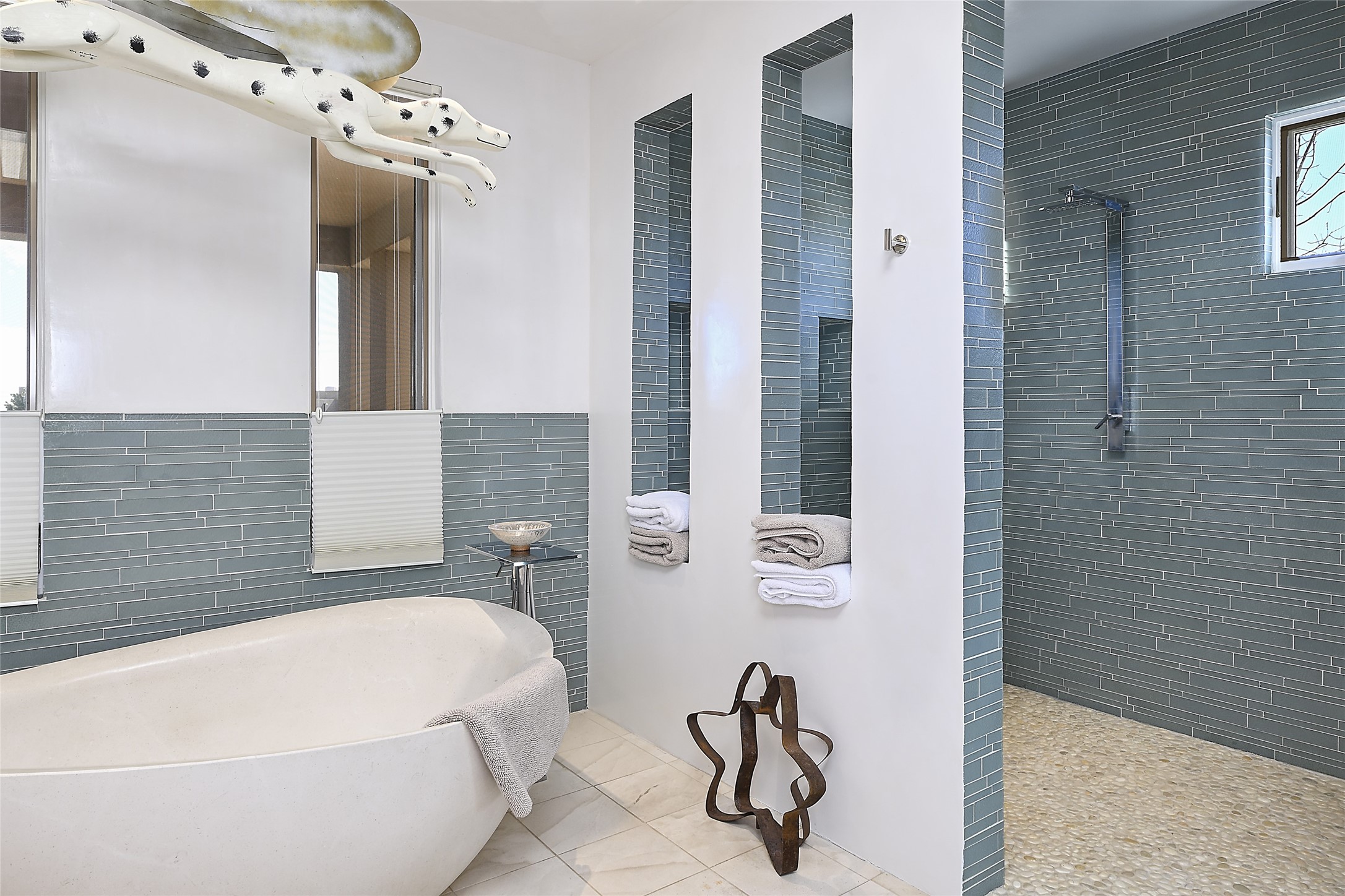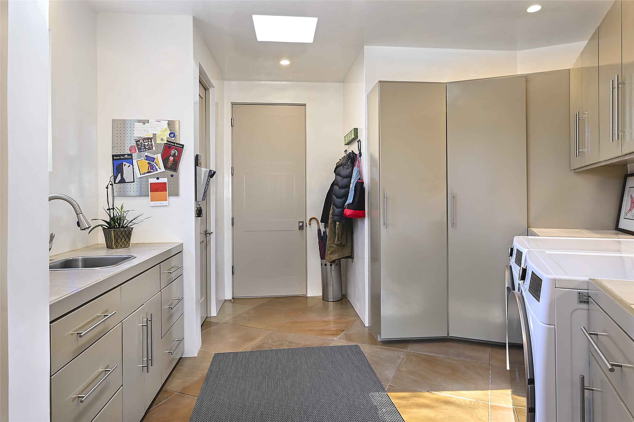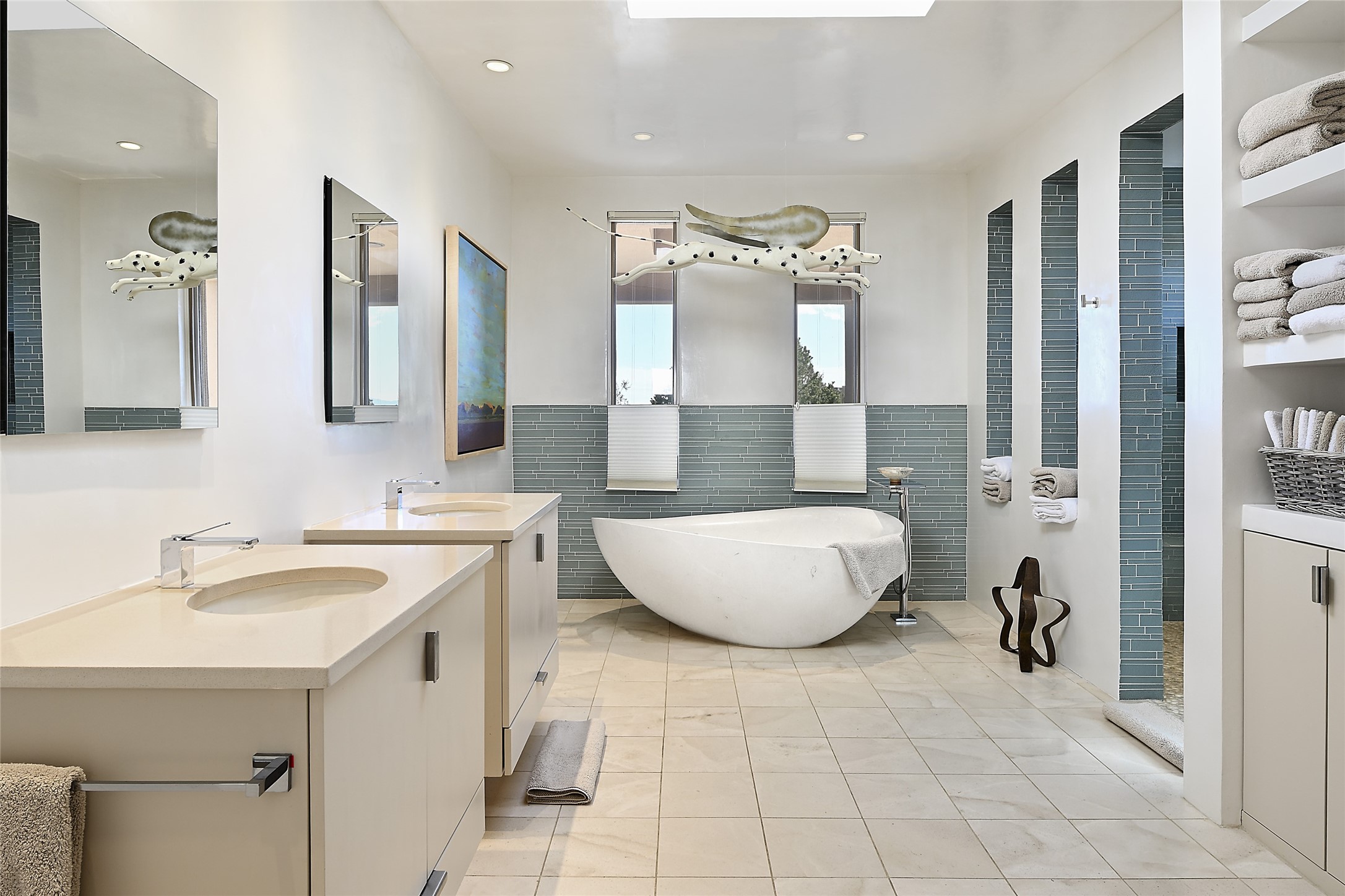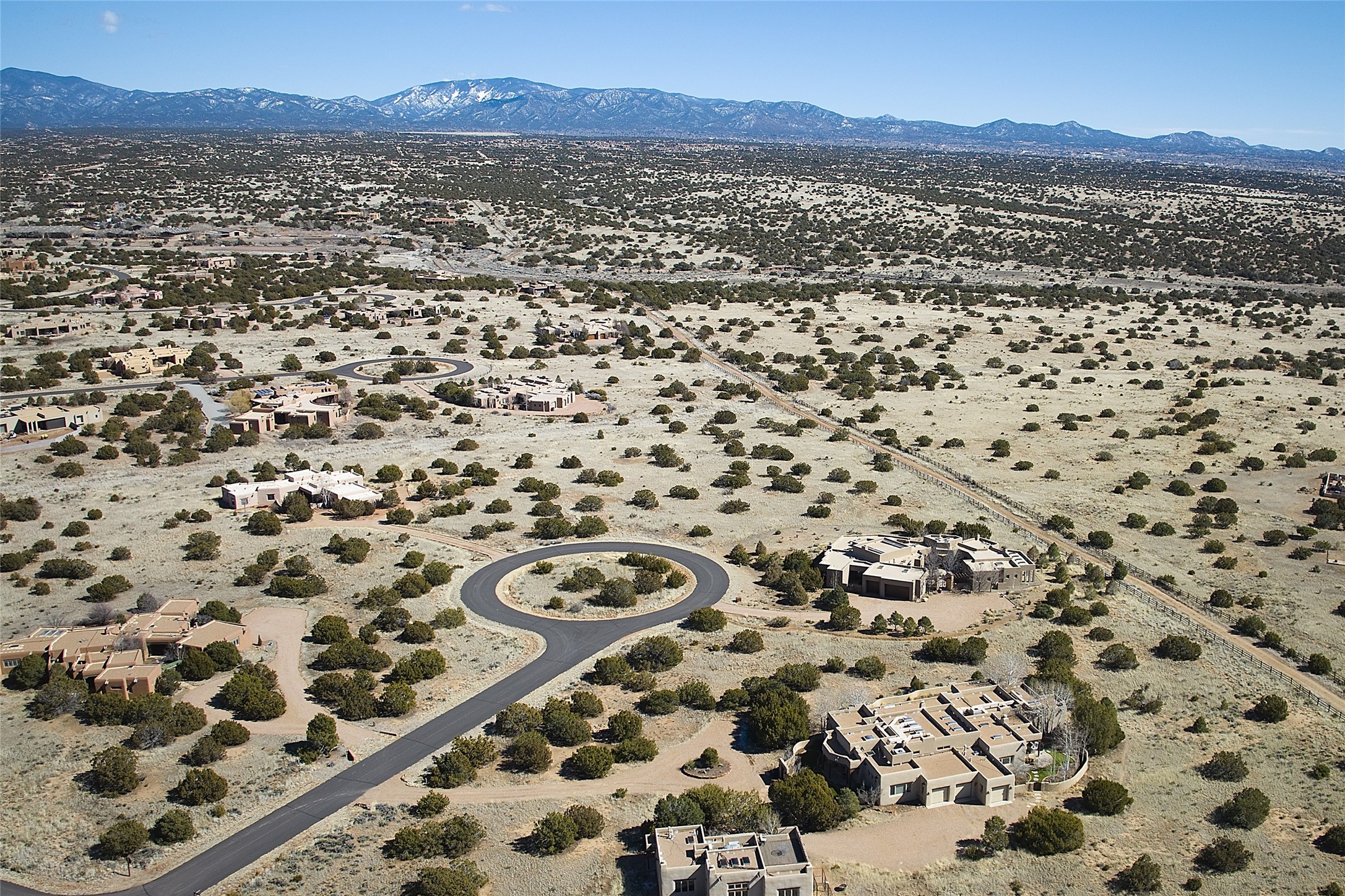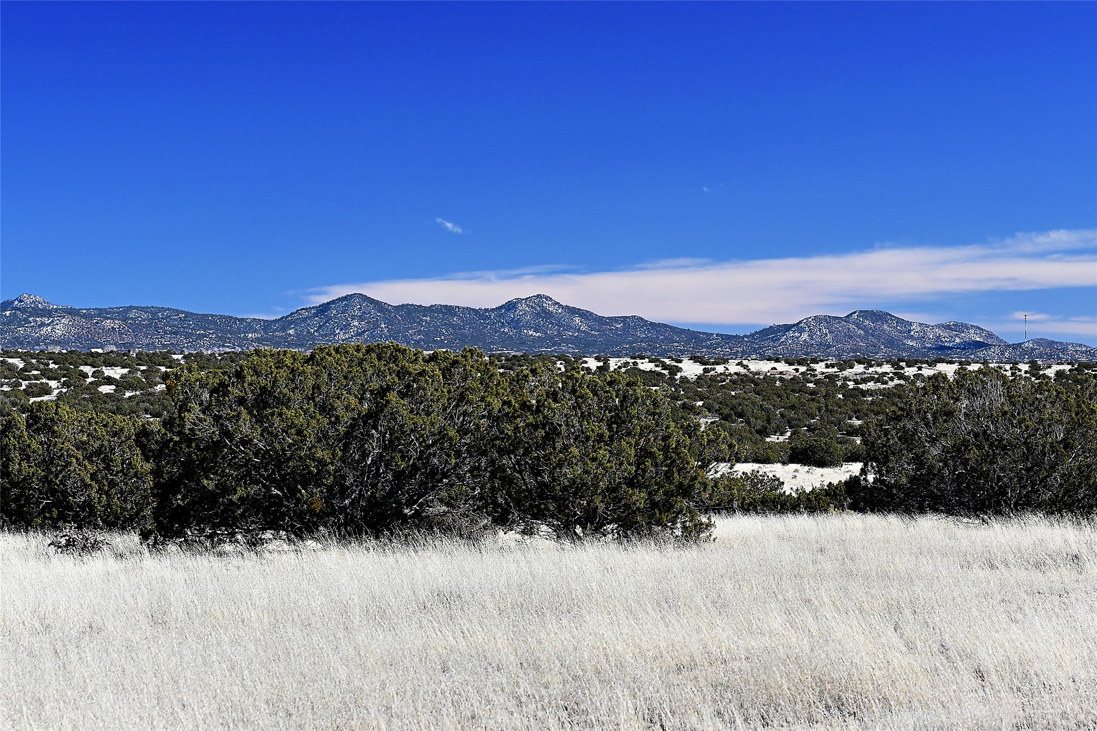 One-of-a kind chic 3 bed 3.5 bath custom contemporary home with a Southwest aesthetic on 1.6 + acres in Las Campanas. This single level home was specifically sited to capture the sweeping vistas of the Sangre de Cristo, Ortiz, and Sandia mountains. Ideal home for art collectors with high ceilings and generous wall spaces throughout. Open floor plan seamlessly merges interior spaces with outdoor areas creating an easy flow for everyday living and entertaining. Grand great room with 14' ceiling, rusted steel beams, long skylight, bronzed metal-clad fireplace, and sleek custom cabinetry. Gourmet kitchen is appointed with high end appliances (2 new 2020 Bosch dishwashers and Bosch microwave), pot filler, wine cooler, oversized center island with prep sink, and walk-in fitted pantry. The luxurious owner's suite has its own fireplace, wet bar, fitted walk-in closet redone by California Closets (2020), and spa-like bath with Stone Forest limestone soaking tub and glass tile shower. Study/media room with bleached oak floors, double desks, and fireplace provides flex space and privacy for work or artistic pursuits. Separate guest wing with two guest rooms with ensuite baths. New wool carpets were installed in bedrooms in 2020. Ample utility room with new (2022) LG washer/dryer, built-in hamper, ironing board, and cedar closet. Other highlights include diamond plaster walls, built in speakers, 3 car heated garage with wall system, xeriscaping and a rainwater harvesting system.