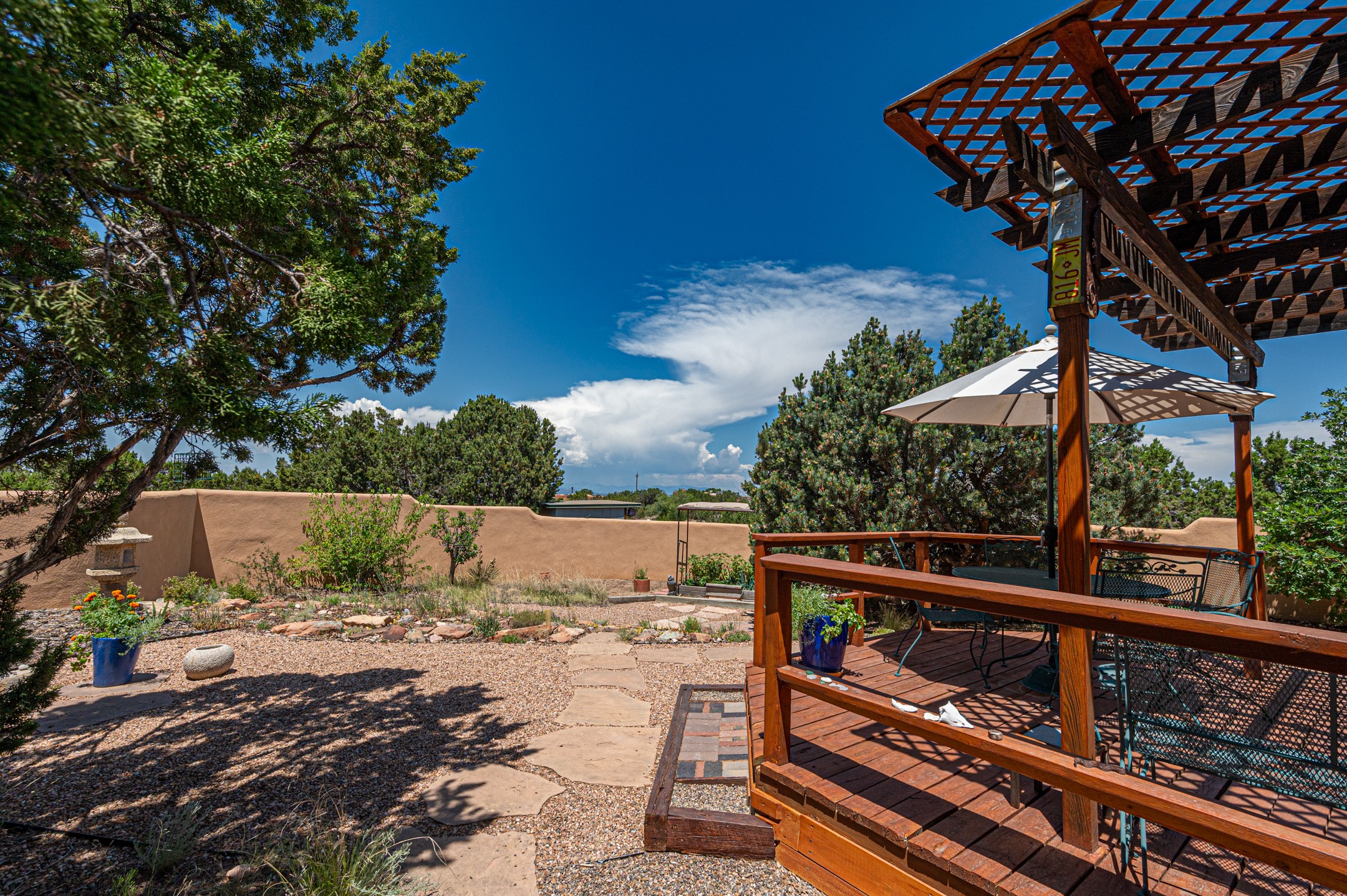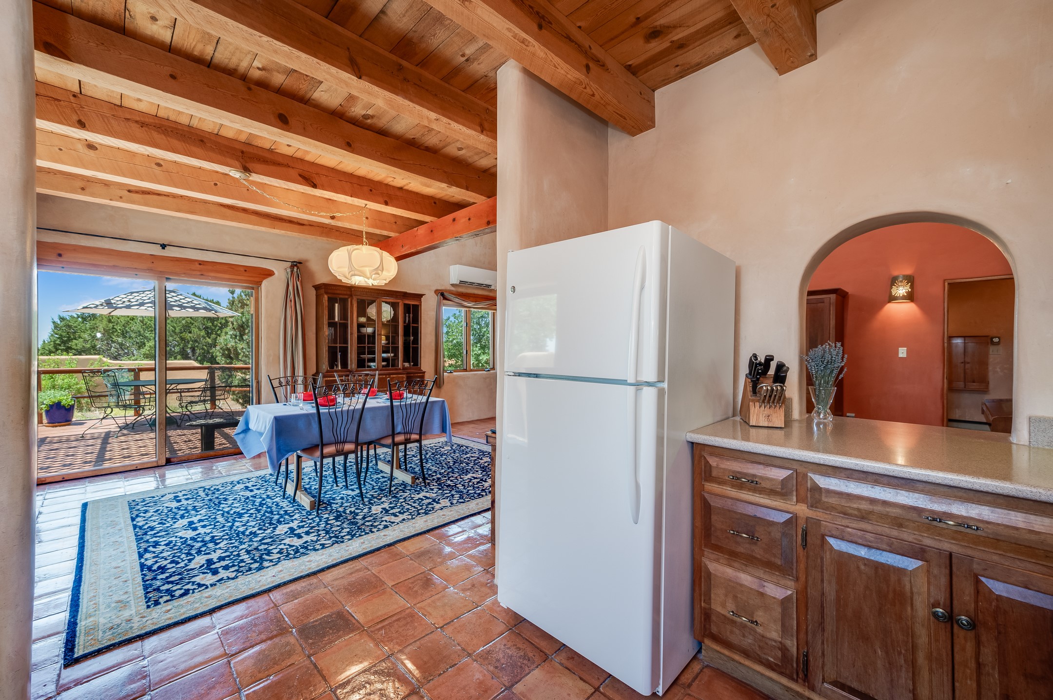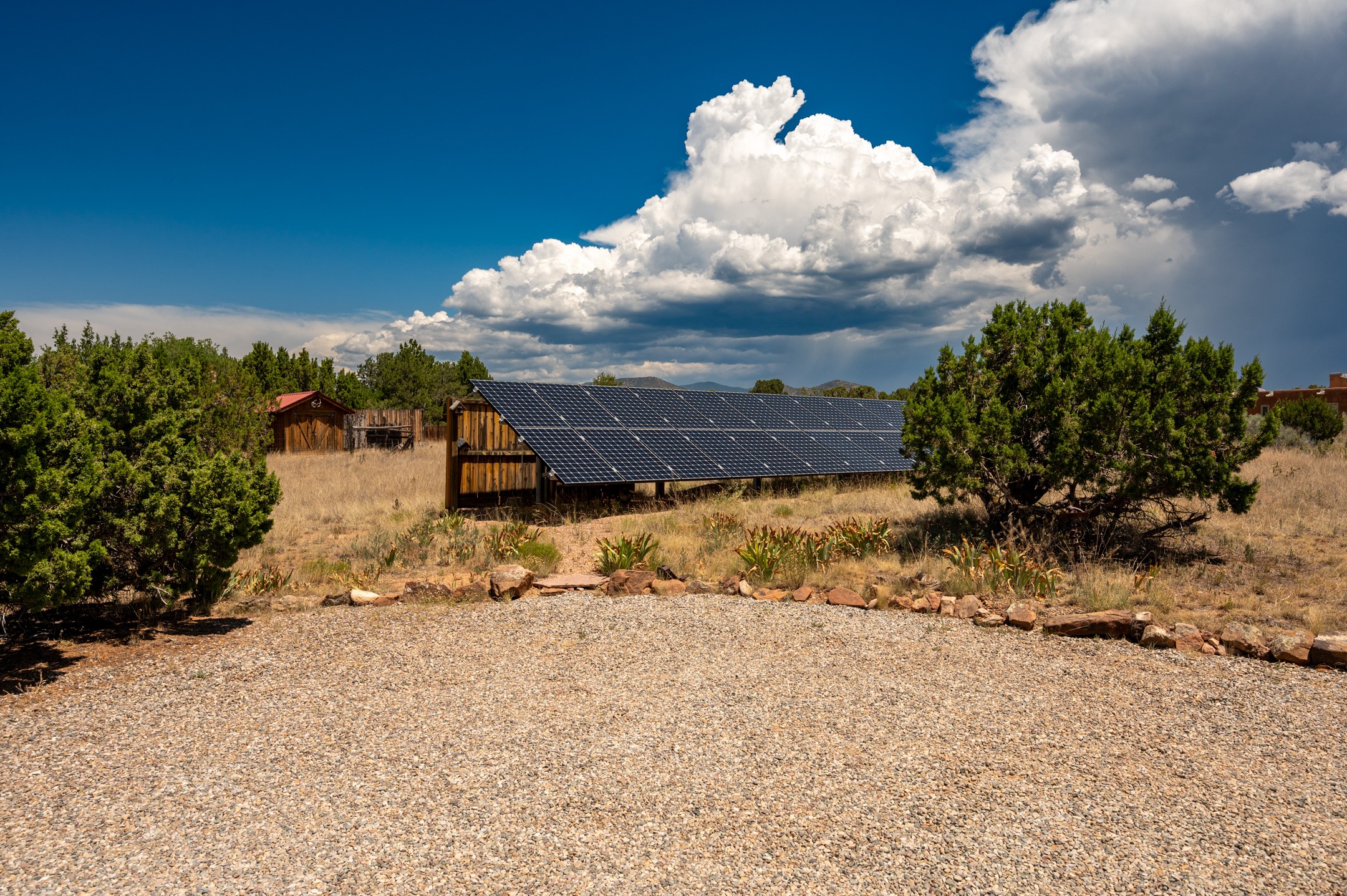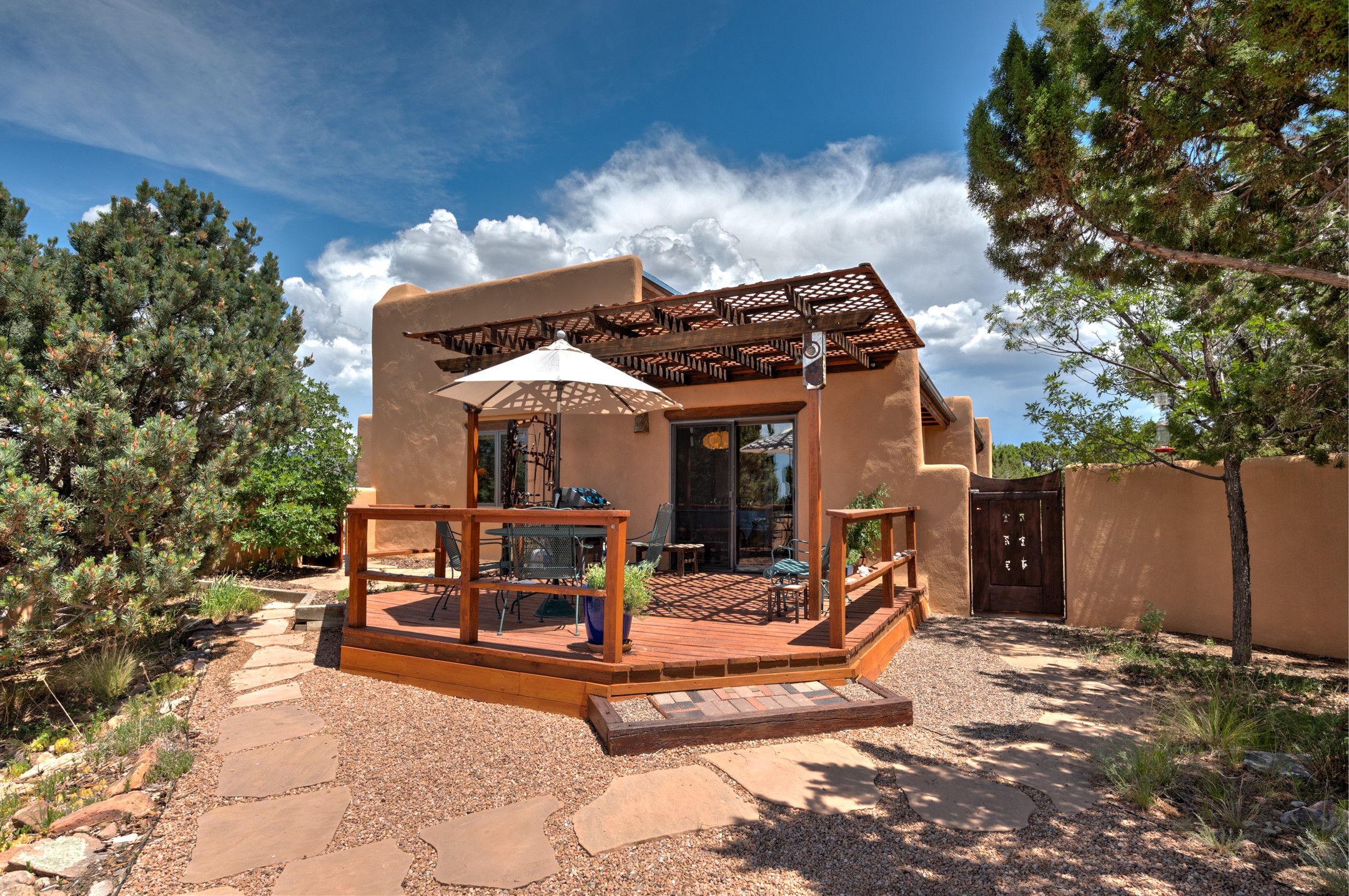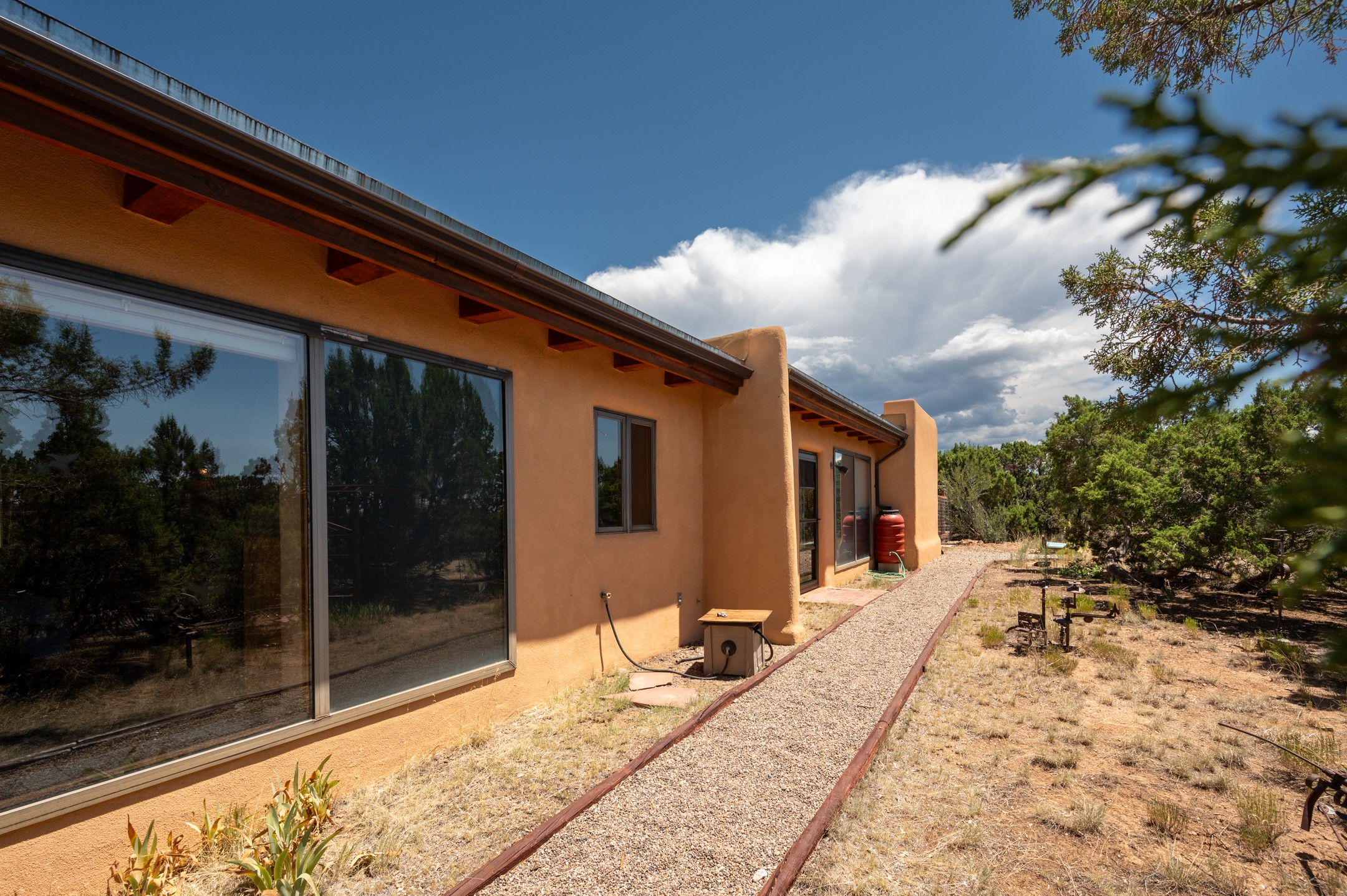 True pride of ownership is reflected in every inch of this wonderfully maintained Eldorado classic. This charming pueblo style home with clerestory windows and Trombe walls was built with passive solar gain in mind, and now with the addition of a solar panel system you can comfortably say goodbye to those pesky high electric bills and enjoy year-round comfort in this all-electric home with heat pumps for AC and heat. Upon entering this lovely home, you will instantly feel the timelessness of the traditional Santa Fe style including beautiful Saltillo tile floors, warm tinted plaster walls, kiva fireplace, and gorgeous wood ceilings and beams. This, along with the very flexible floorplan, allows you to create your perfect living spaces to suit your lifestyle. Currently this 4-bedroom 3 bath home is set up as a 3-bedroom with a media room and a generously sized office off the primary bedroom. Outside, you get glorious western sunsets and mountain views off your wood deck with a walled yard for your four-legged friends, and a delightful private area with the best chicken facilities in Eldorado. Also includes an attached oversized 2-car garage with shop area and lots of storage space. The Eldorado community offers miles of trails and paved bike paths, a public library, a fantastic community center with pool, tennis, pickleball, volleyball, disc golf, athletic fields, dog park and more. It also has The Agora Shopping center with grocery store, and so much more! Did I mention the community preserve and the starry night skies?