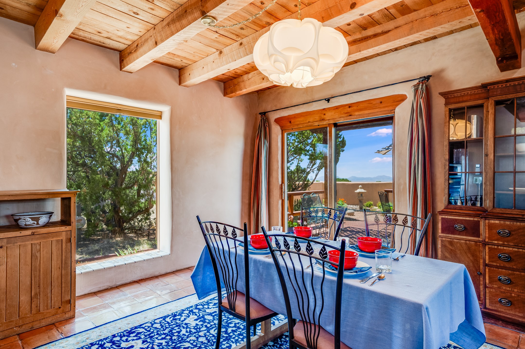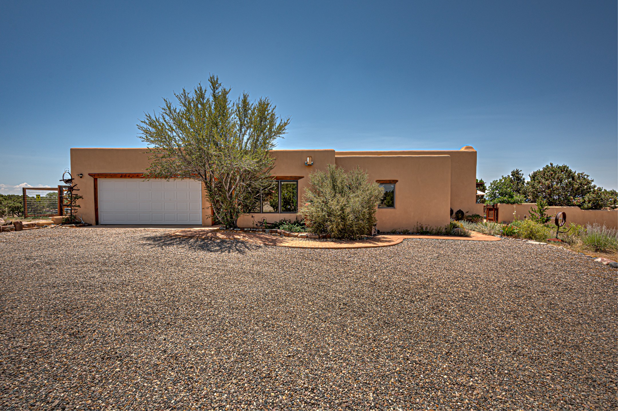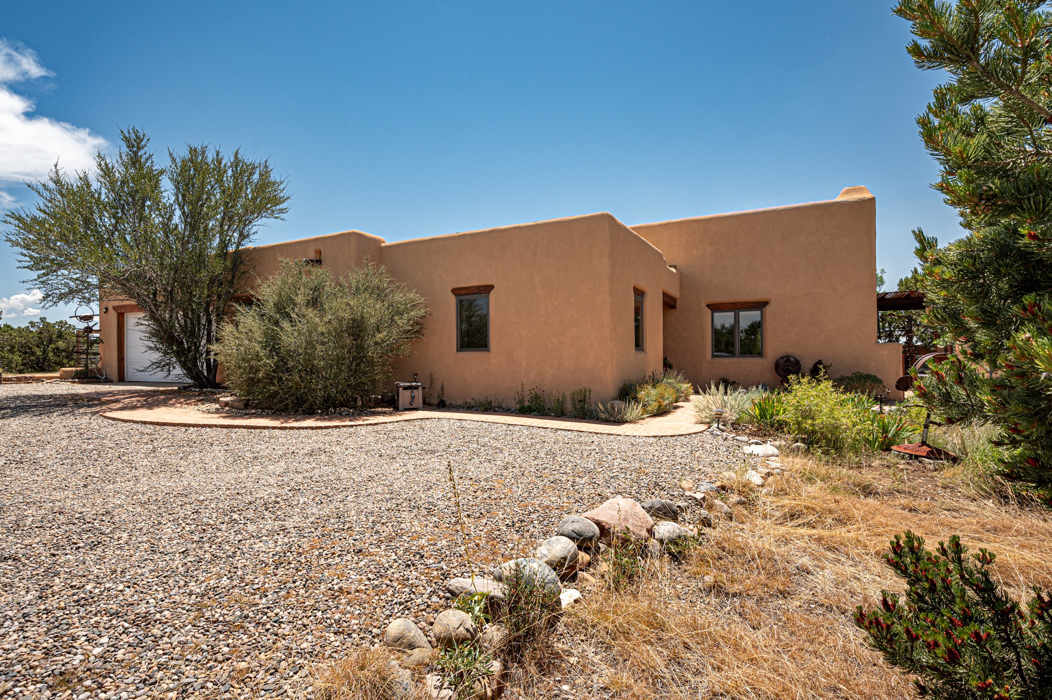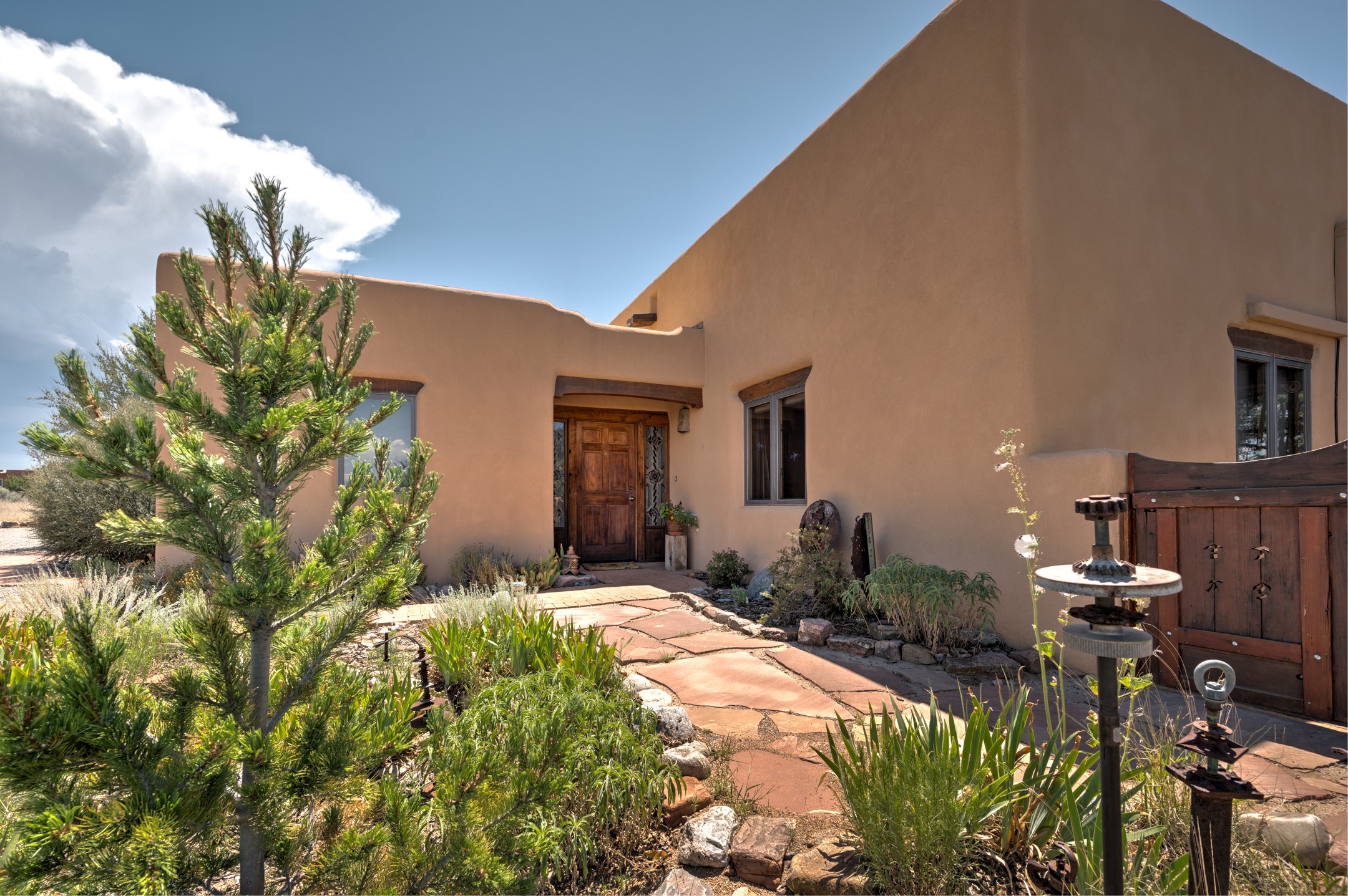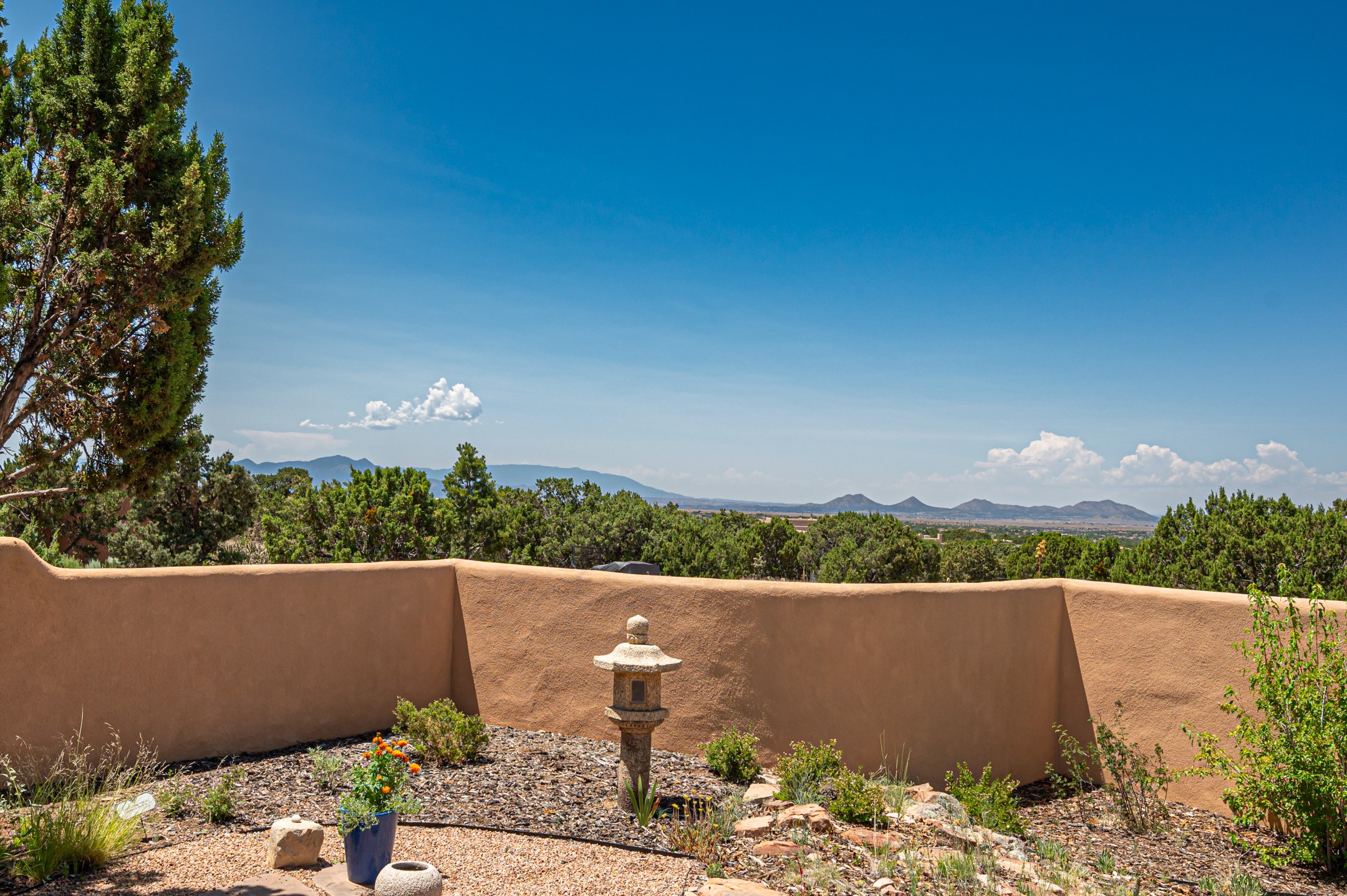 True pride of ownership is reflected in every inch of this wonderfully maintained Eldorado classic. This charming pueblo style home with clerestory windows and Trombe walls was built with passive solar gain in mind, and now with the addition of a solar panel system you can comfortably say goodbye to those pesky high electric bills and enjoy year-round comfort in this all-electric home with heat pumps for AC and heat. Upon entering this lovely home, you will instantly feel the timelessness of the traditional Santa Fe style including beautiful Saltillo tile floors, warm tinted plaster walls, kiva fireplace, and gorgeous wood ceilings and beams. This, along with the very flexible floorplan, allows you to create your perfect living spaces to suit your lifestyle. Currently this 4-bedroom 3 bath home is set up as a 3-bedroom with a media room and a generously sized office off the primary bedroom. Outside, you get glorious western sunsets and mountain views off your wood deck with a walled yard for your four-legged friends, and a delightful private area with the best chicken facilities in Eldorado. Also includes an attached oversized 2-car garage with shop area and lots of storage space. The Eldorado community offers miles of trails and paved bike paths, a public library, a fantastic community center with pool, tennis, pickleball, volleyball, disc golf, athletic fields, dog park and more. It also has The Agora Shopping center with grocery store, and so much more! Did I mention the community preserve and the starry night skies?
