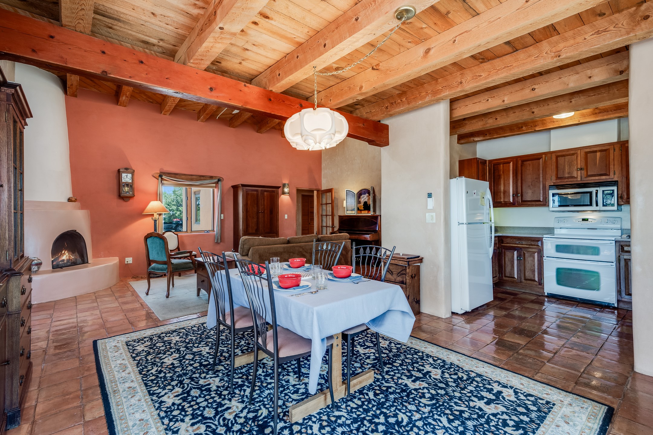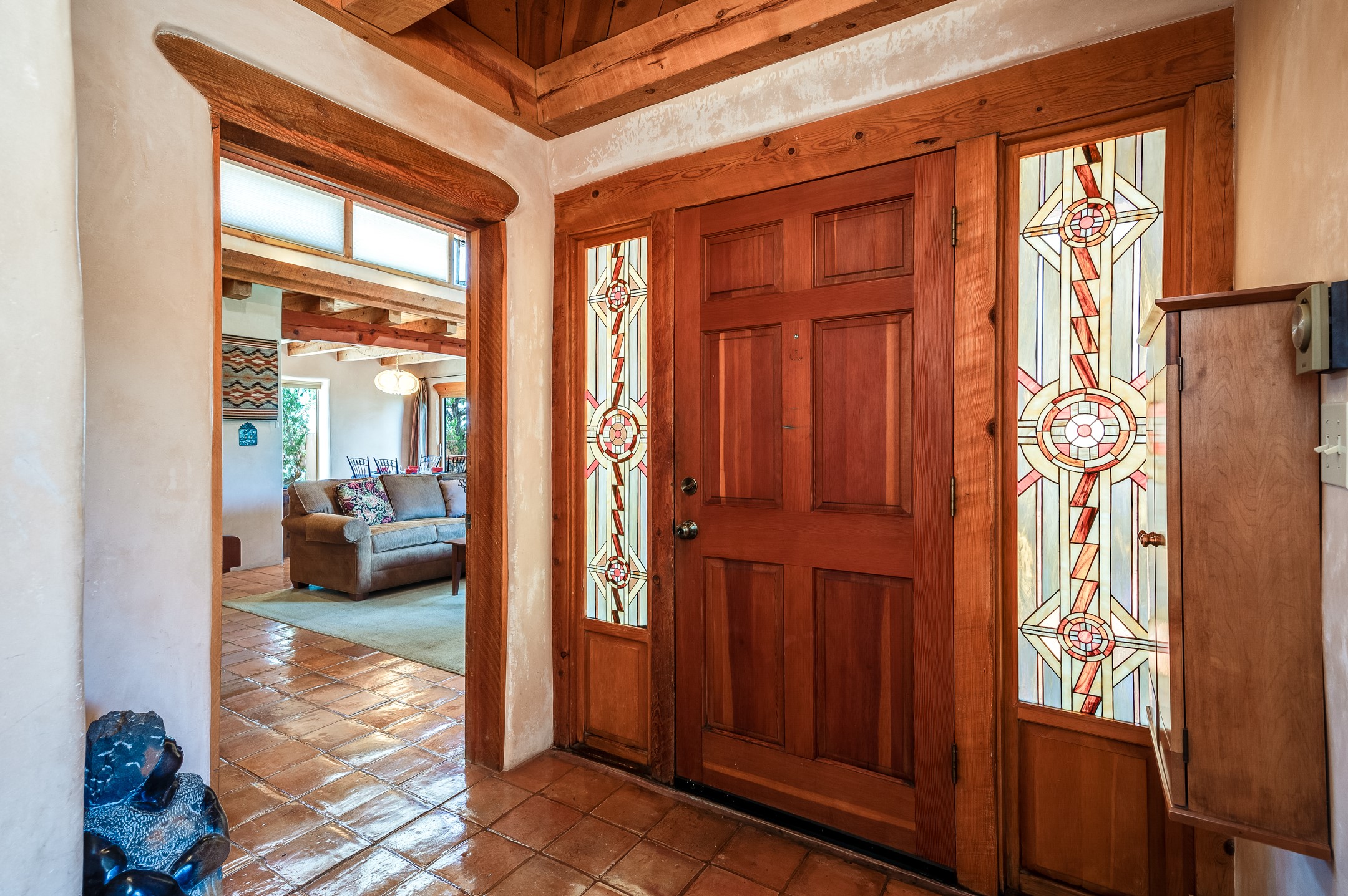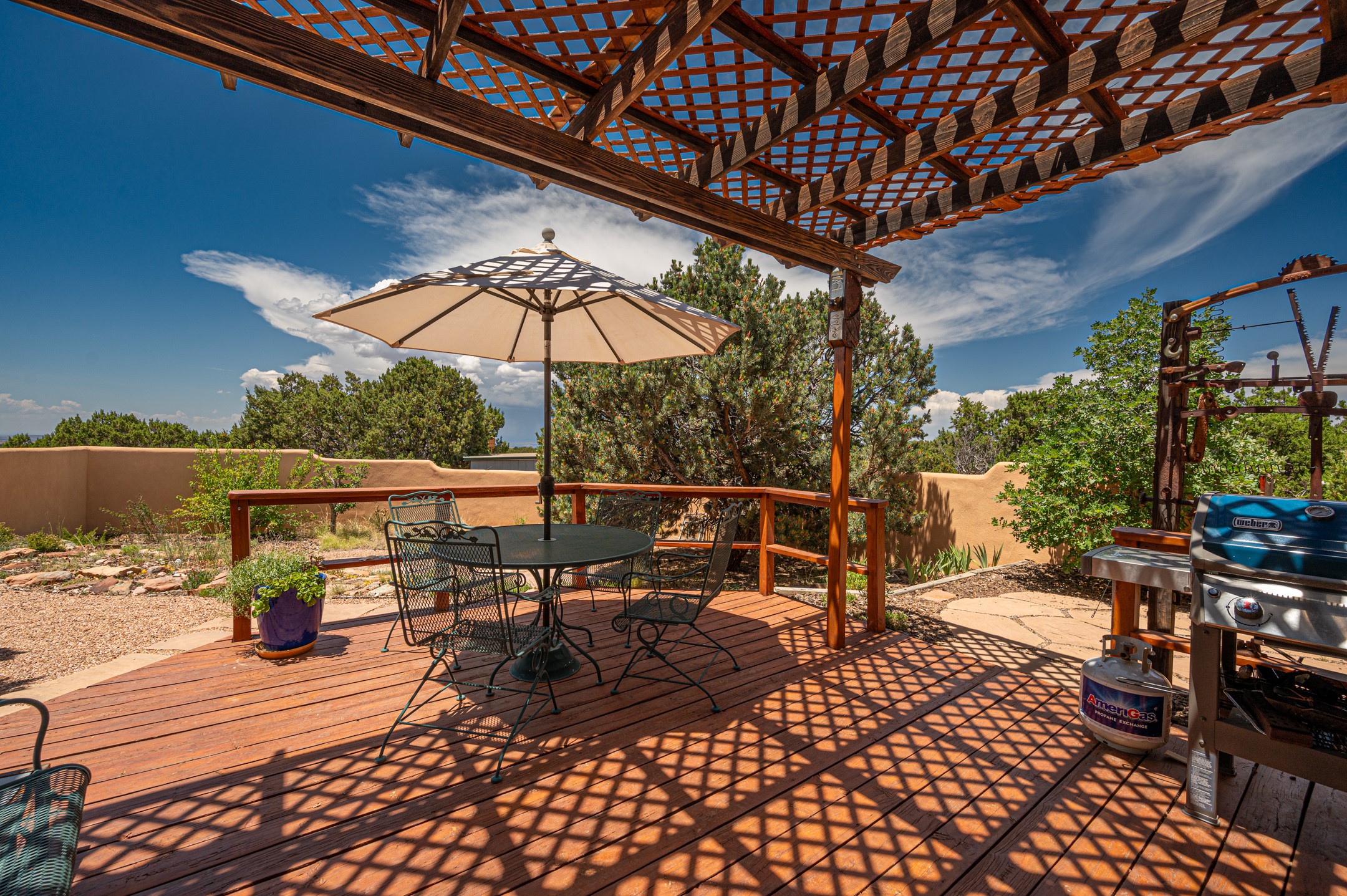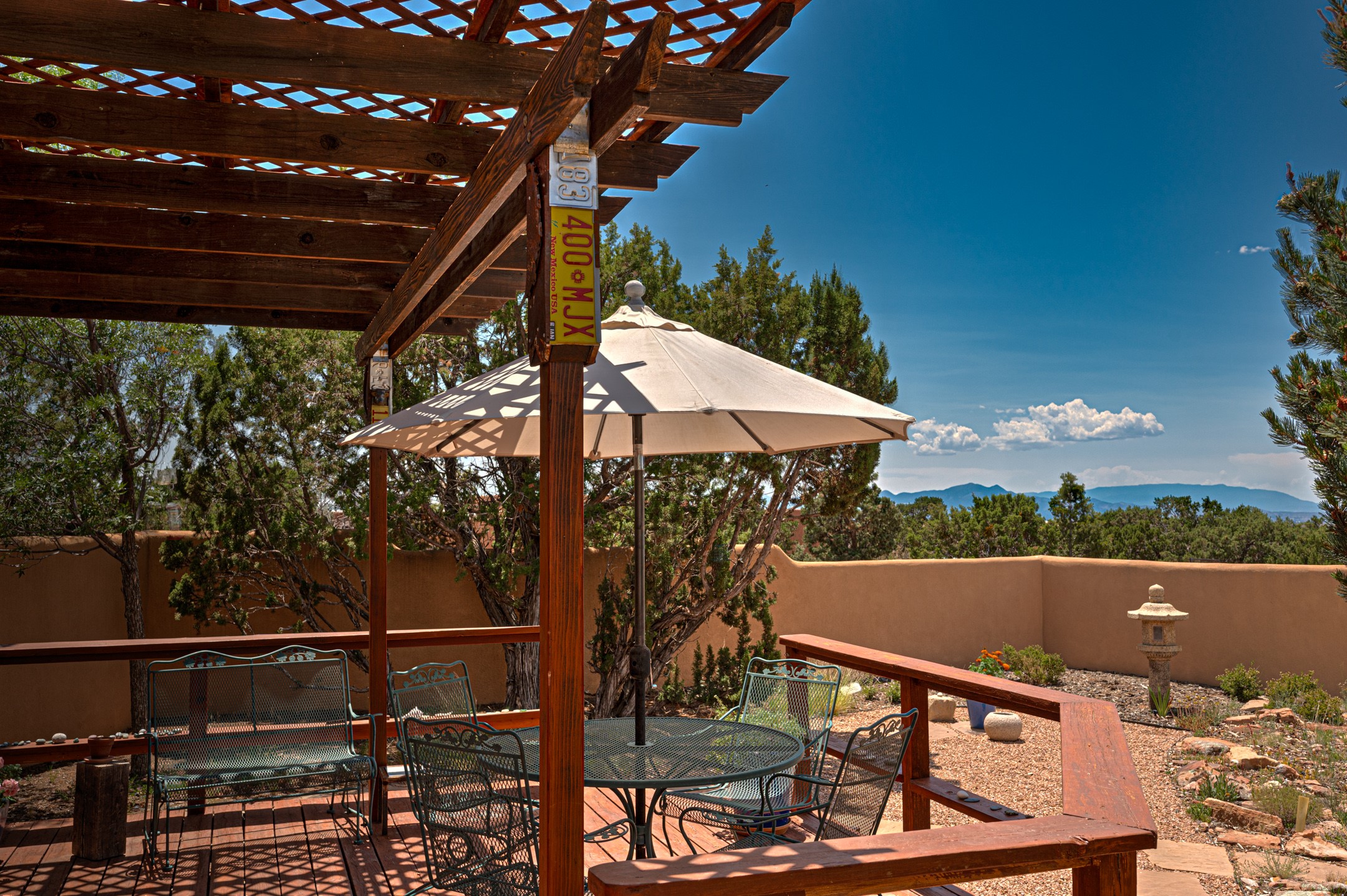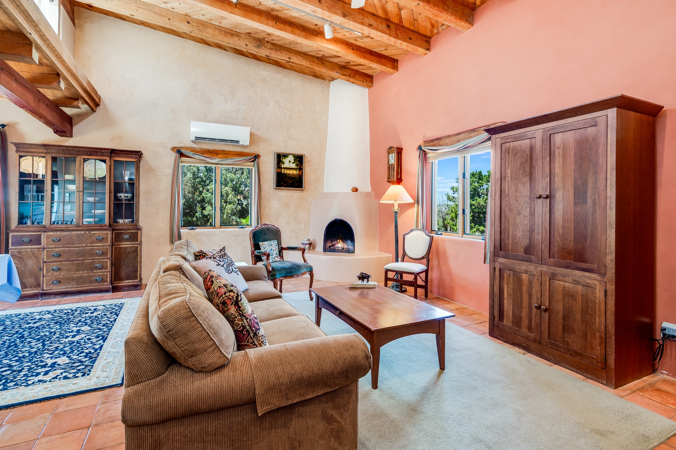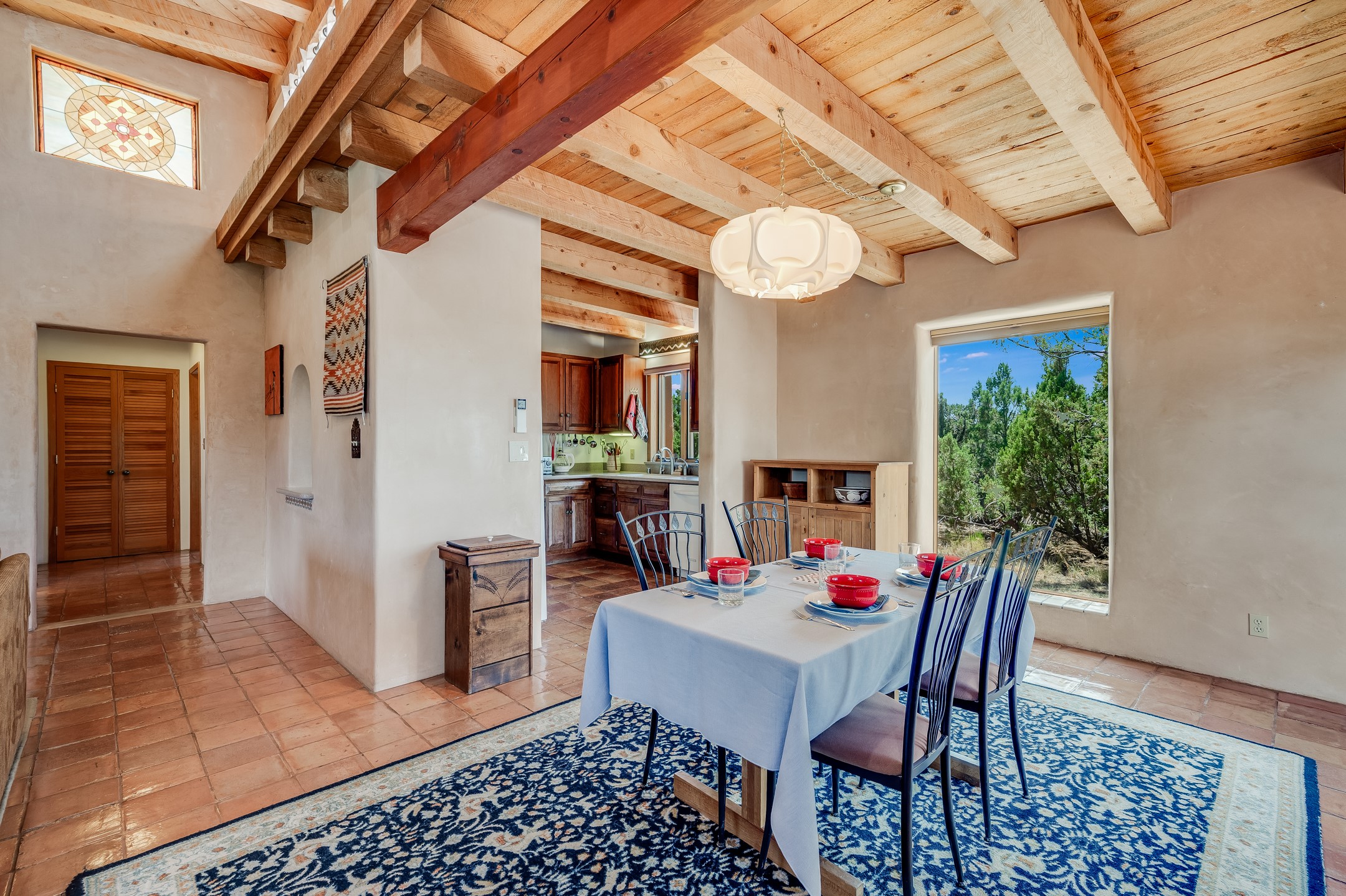 True pride of ownership is reflected in every inch of this wonderfully maintained Eldorado classic. This charming pueblo style home with clerestory windows and Trombe walls was built with passive solar gain in mind, and now with the addition of a solar panel system you can comfortably say goodbye to those pesky high electric bills and enjoy year-round comfort in this all-electric home with heat pumps for AC and heat. Upon entering this lovely home, you will instantly feel the timelessness of the traditional Santa Fe style including beautiful Saltillo tile floors, warm tinted plaster walls, kiva fireplace, and gorgeous wood ceilings and beams. This, along with the very flexible floorplan, allows you to create your perfect living spaces to suit your lifestyle. Currently this 4-bedroom 3 bath home is set up as a 3-bedroom with a media room and a generously sized office off the primary bedroom. Outside, you get glorious western sunsets and mountain views off your wood deck with a walled yard for your four-legged friends, and a delightful private area with the best chicken facilities in Eldorado. Also includes an attached oversized 2-car garage with shop area and lots of storage space. The Eldorado community offers miles of trails and paved bike paths, a public library, a fantastic community center with pool, tennis, pickleball, volleyball, disc golf, athletic fields, dog park and more. It also has The Agora Shopping center with grocery store, and so much more! Did I mention the community preserve and the starry night skies?