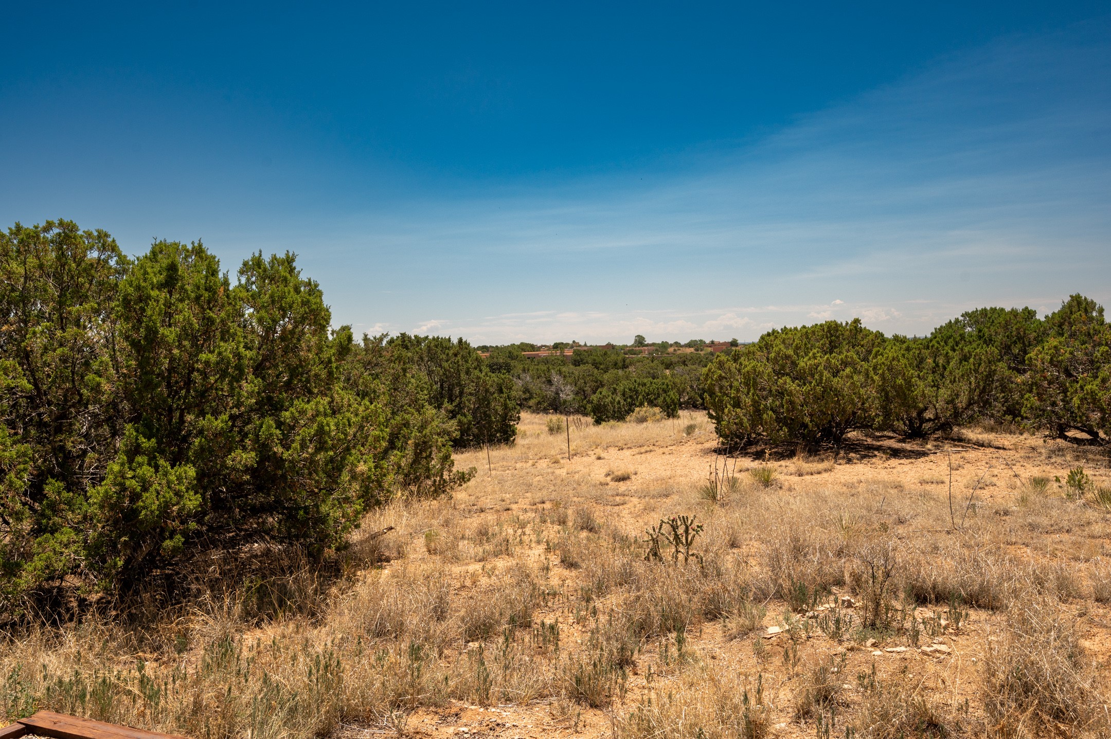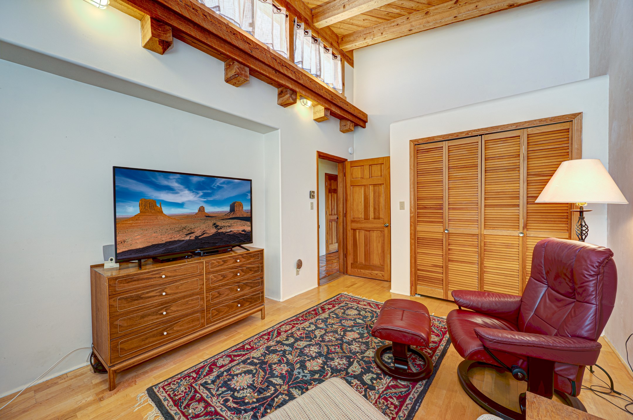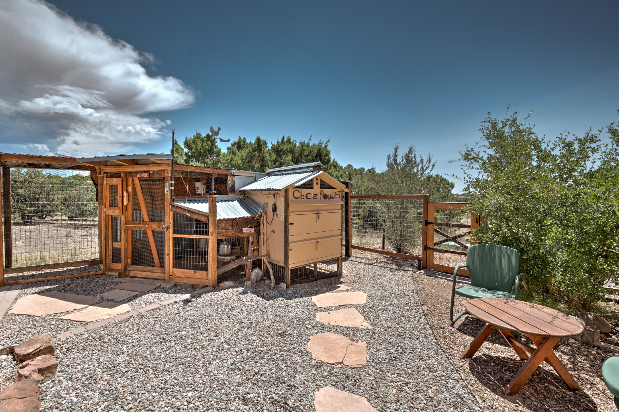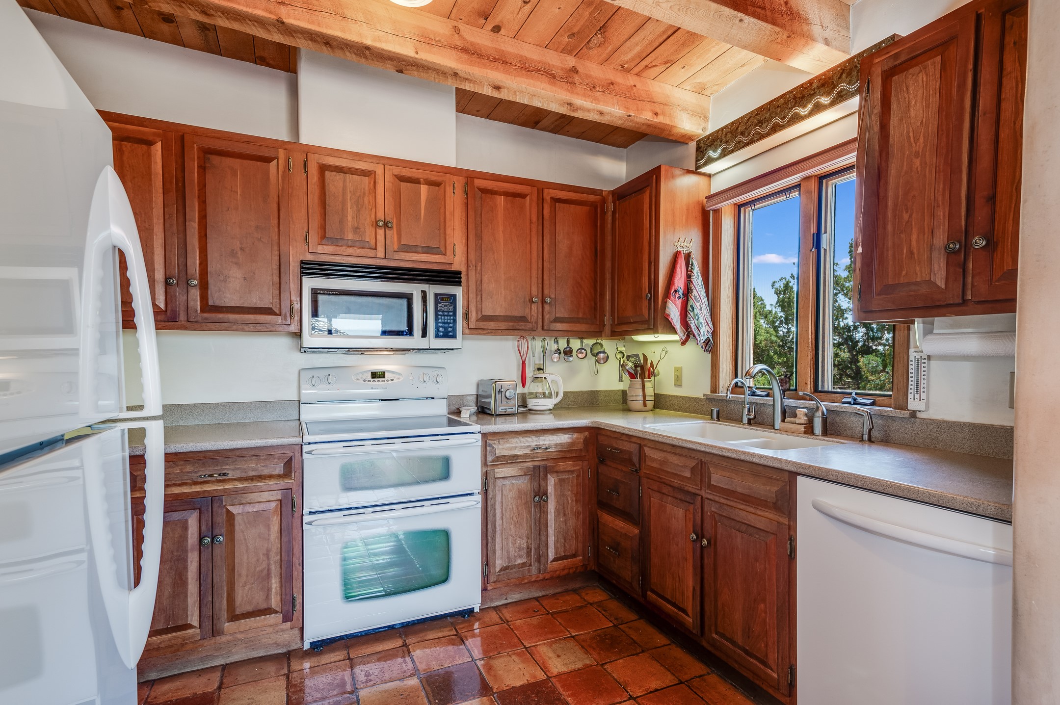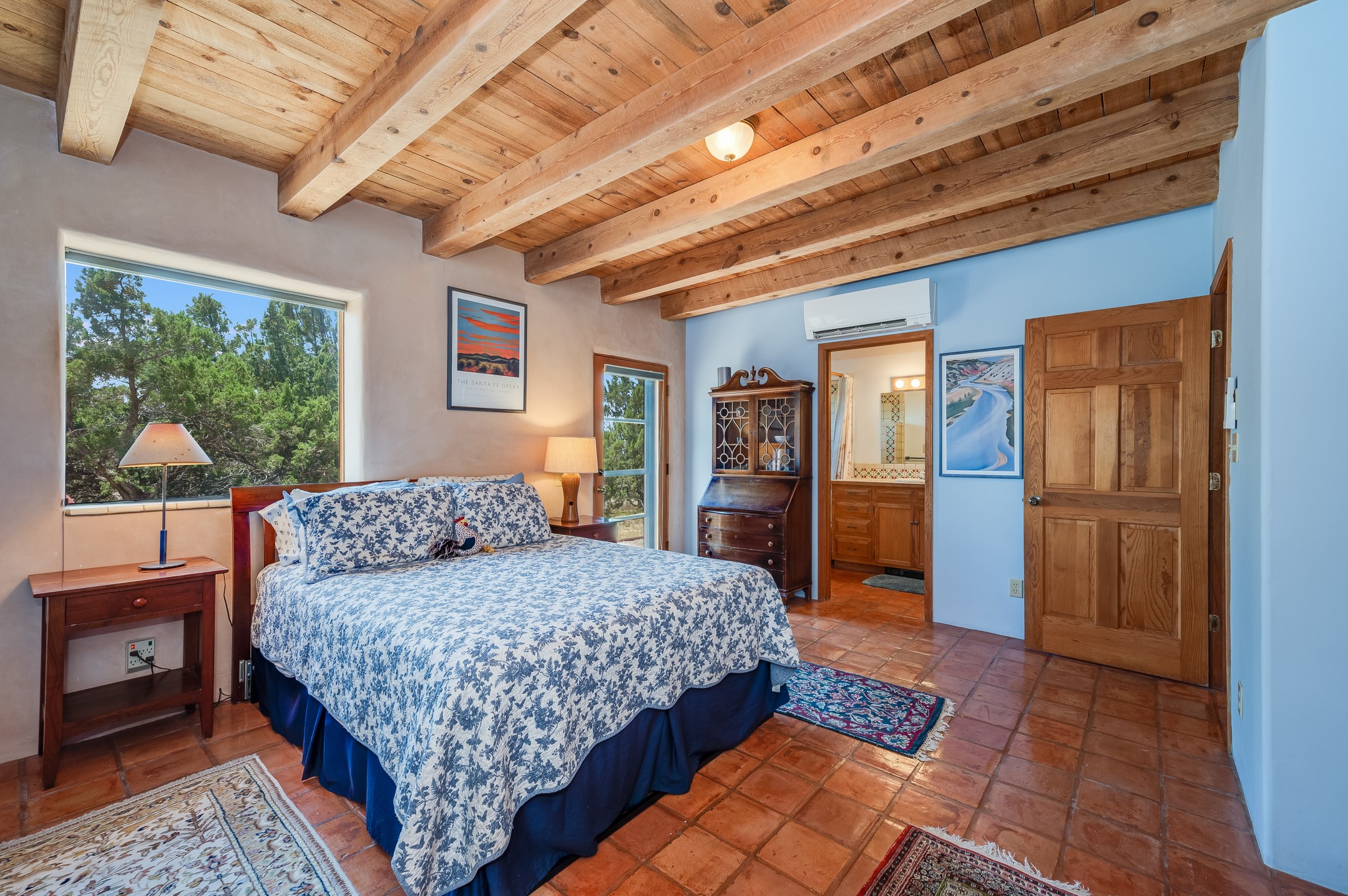 True pride of ownership is reflected in every inch of this wonderfully maintained Eldorado classic. This charming pueblo style home with clerestory windows and Trombe walls was built with passive solar gain in mind, and now with the addition of a solar panel system you can comfortably say goodbye to those pesky high electric bills and enjoy year-round comfort in this all-electric home with heat pumps for AC and heat. Upon entering this lovely home, you will instantly feel the timelessness of the traditional Santa Fe style including beautiful Saltillo tile floors, warm tinted plaster walls, kiva fireplace, and gorgeous wood ceilings and beams. This, along with the very flexible floorplan, allows you to create your perfect living spaces to suit your lifestyle. Currently this 4-bedroom 3 bath home is set up as a 3-bedroom with a media room and a generously sized office off the primary bedroom. Outside, you get glorious western sunsets and mountain views off your wood deck with a walled yard for your four-legged friends, and a delightful private area with the best chicken facilities in Eldorado. Also includes an attached oversized 2-car garage with shop area and lots of storage space. The Eldorado community offers miles of trails and paved bike paths, a public library, a fantastic community center with pool, tennis, pickleball, volleyball, disc golf, athletic fields, dog park and more. It also has The Agora Shopping center with grocery store, and so much more! Did I mention the community preserve and the starry night skies?