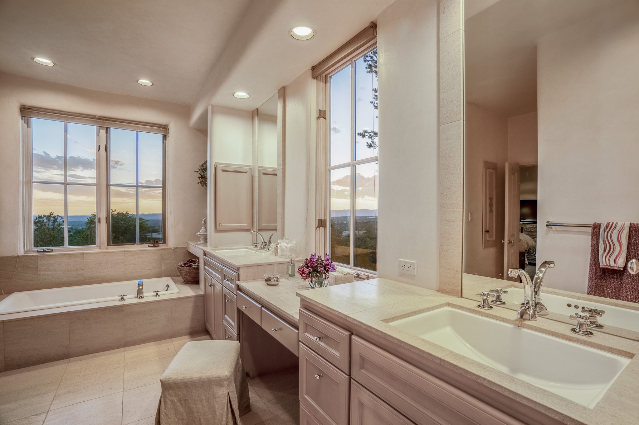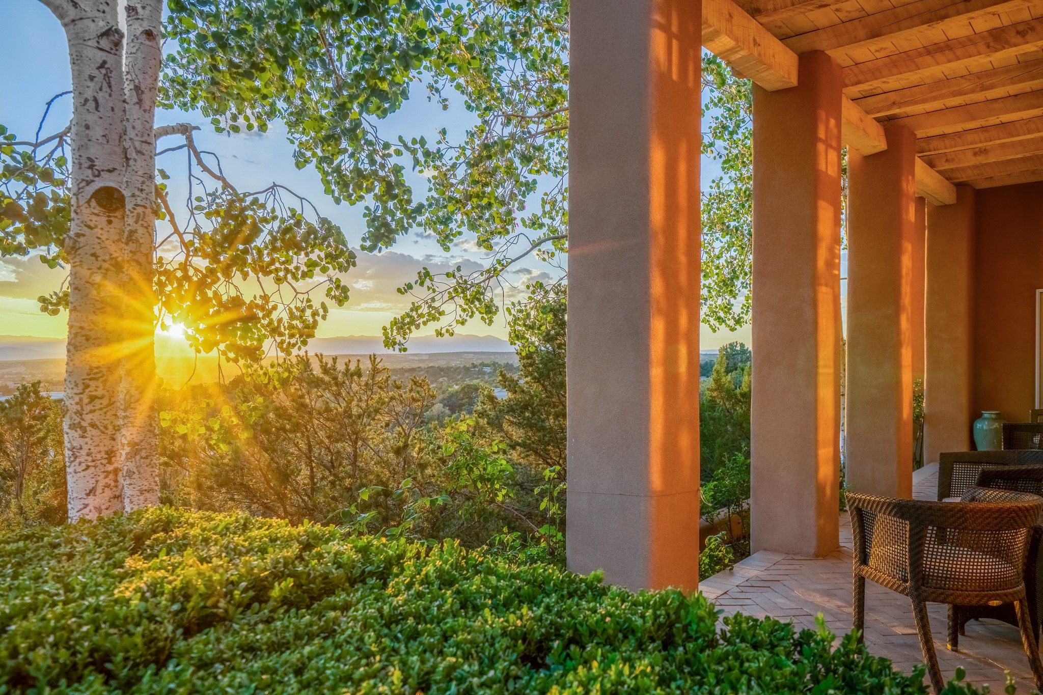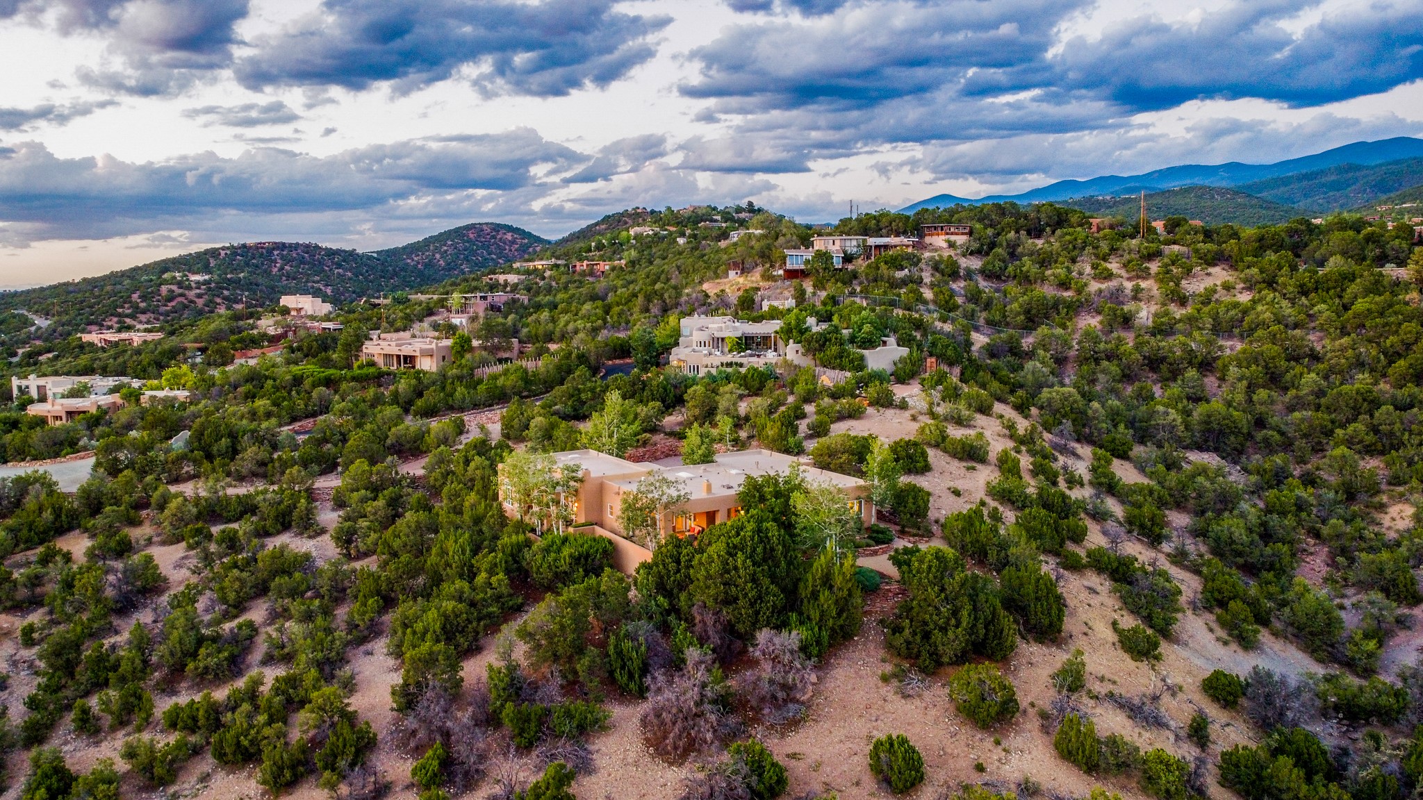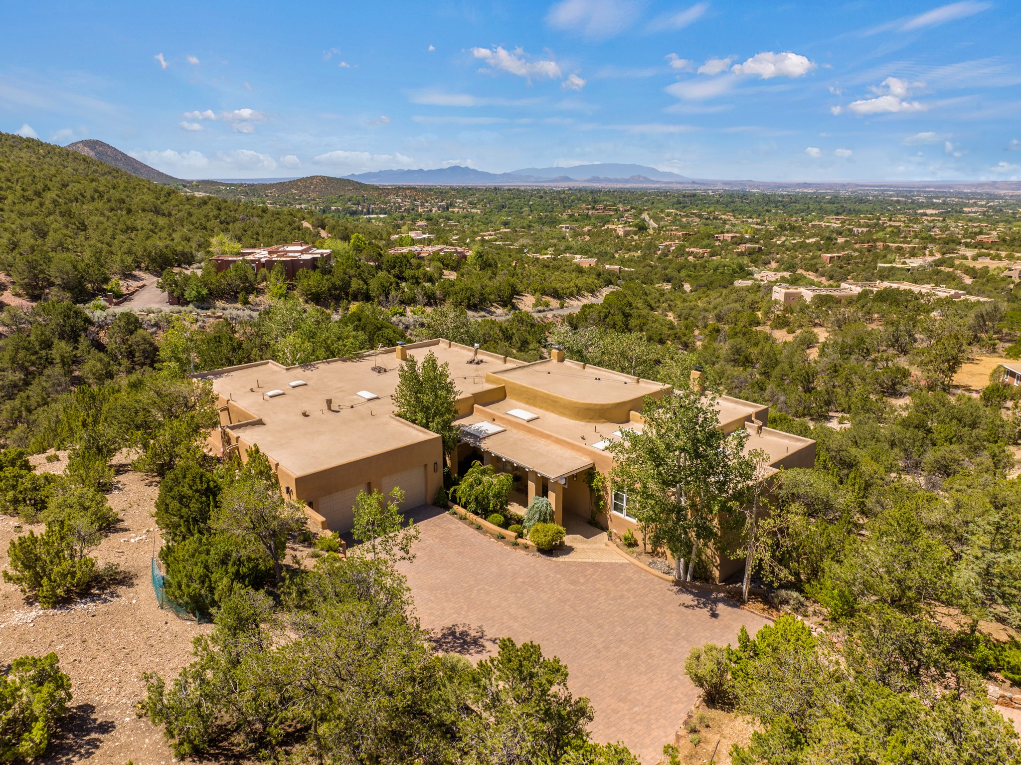 Perched in the hills above the Santa Fe Plaza, this timeless masterpiece with panoramic views of the town was expertly built in the 1990s by Jim Satzinger and flawlessly polished by the discerning eye of the interior designer who called it home. The mostly single level, +/- 3500 square foot floor plan is sited at the rear of a cul-de-sac parcel that looks much larger and feels much more private than the acreage would imply. Its central living space is bookended by the owners' suite and personal office in the North wing, and the two guest bedroom suites in the South wing. With lushly landscaped surroundings and deep portals to lure you through the numerous French doors, it is not only the uninterrupted view that will captivate. Some of the features include polished French limestone floors, recently renovated custom cabinetry, mini-splits, custom solid doors throughout, Dornbracht plumbing fixtures, imported Turkish tile accents, beamed ceilings, gleaming plaster walls, numerous fireplaces to cozy up to, a heated driveway, and new roof in 2021 to round it out. A near endless list of refined finishes, high end appliances, and immaculate maintenance record are testament to the meticulous care this property has received. With a curated furniture package that is negotiable, this home is truly one-of-a-kind and completely move-in ready.
