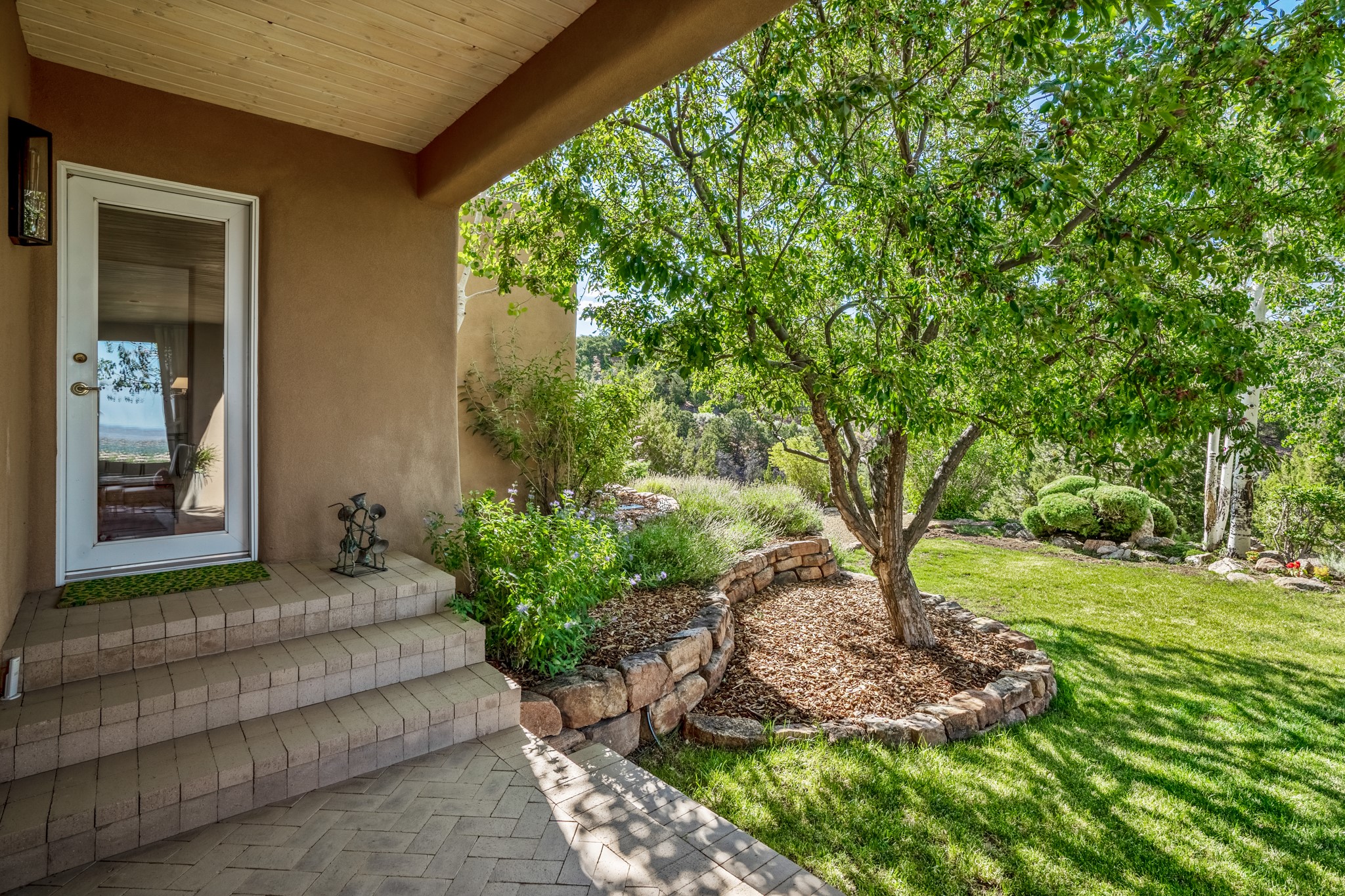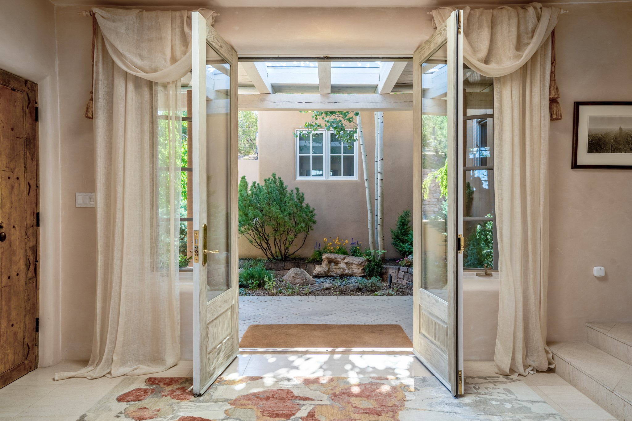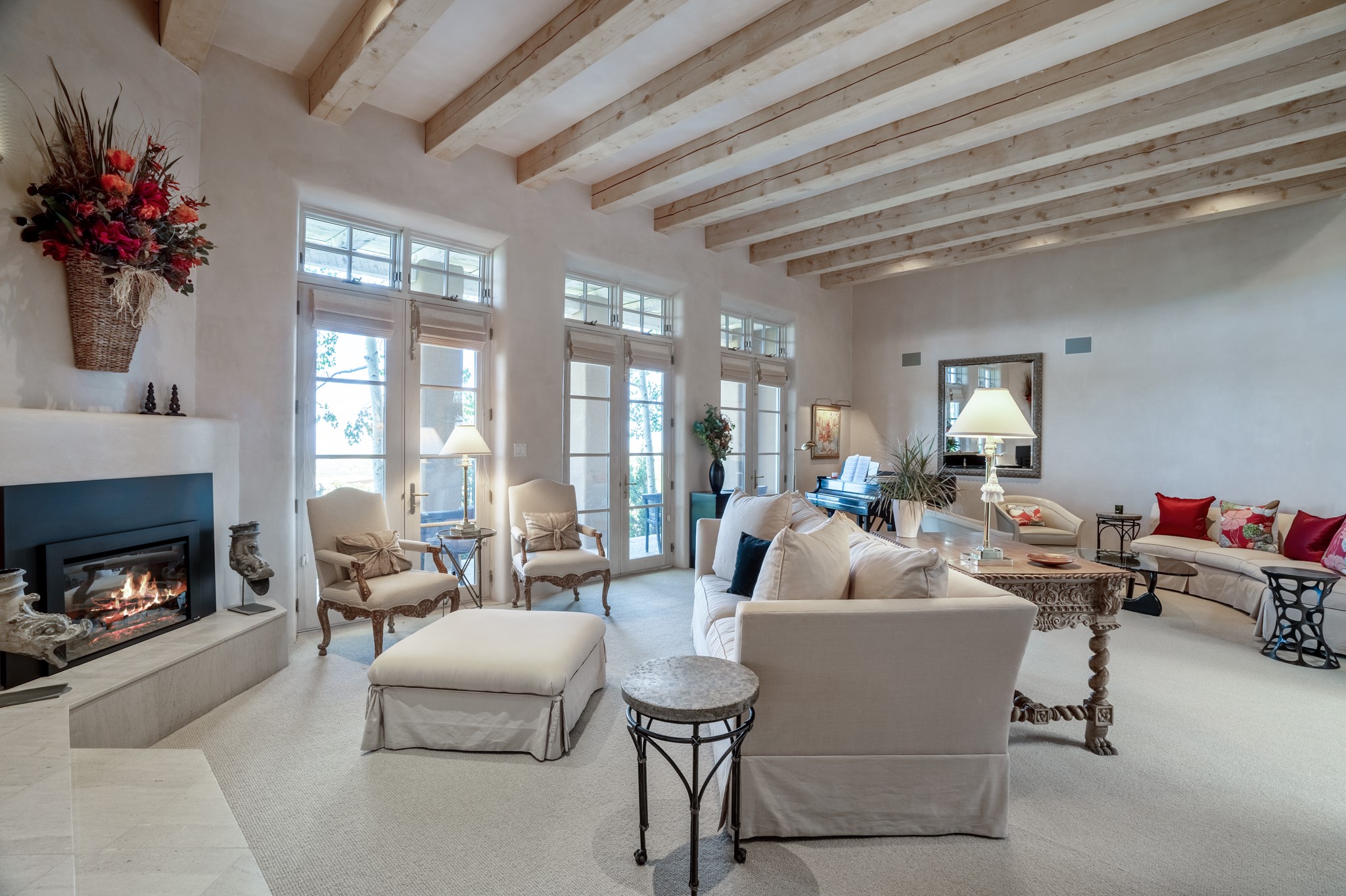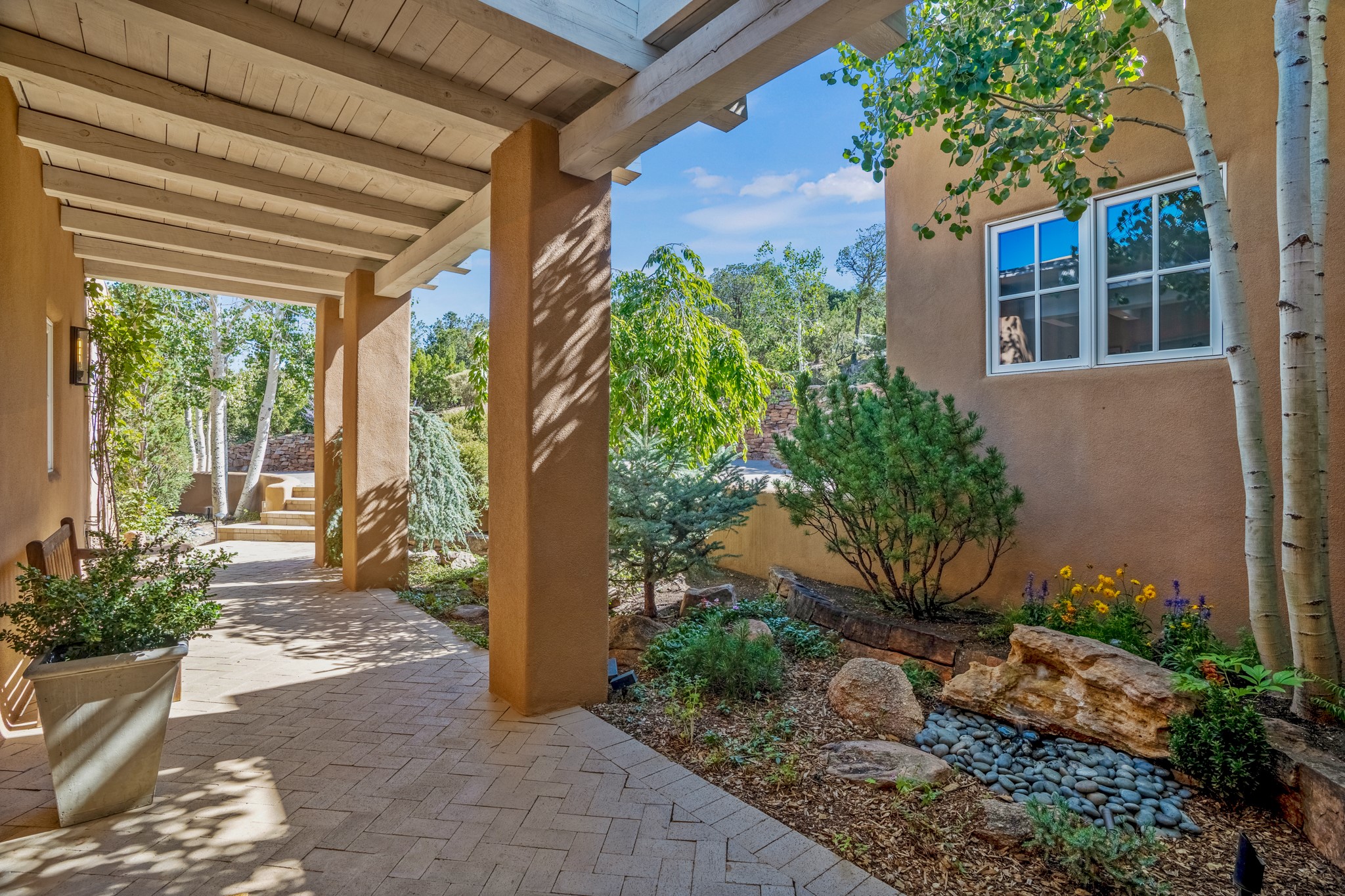 Perched in the hills above the Santa Fe Plaza, this timeless masterpiece with panoramic views of the town was expertly built in the 1990s by Jim Satzinger and flawlessly polished by the discerning eye of the interior designer who called it home. The mostly single level, +/- 3500 square foot floor plan is sited at the rear of a cul-de-sac parcel that looks much larger and feels much more private than the acreage would imply. Its central living space is bookended by the owners' suite and personal office in the North wing, and the two guest bedroom suites in the South wing. With lushly landscaped surroundings and deep portals to lure you through the numerous French doors, it is not only the uninterrupted view that will captivate. Some of the features include polished French limestone floors, recently renovated custom cabinetry, mini-splits, custom solid doors throughout, Dornbracht plumbing fixtures, imported Turkish tile accents, beamed ceilings, gleaming plaster walls, numerous fireplaces to cozy up to, a heated driveway, and new roof in 2021 to round it out. A near endless list of refined finishes, high end appliances, and immaculate maintenance record are testament to the meticulous care this property has received. With a curated furniture package that is negotiable, this home is truly one-of-a-kind and completely move-in ready.