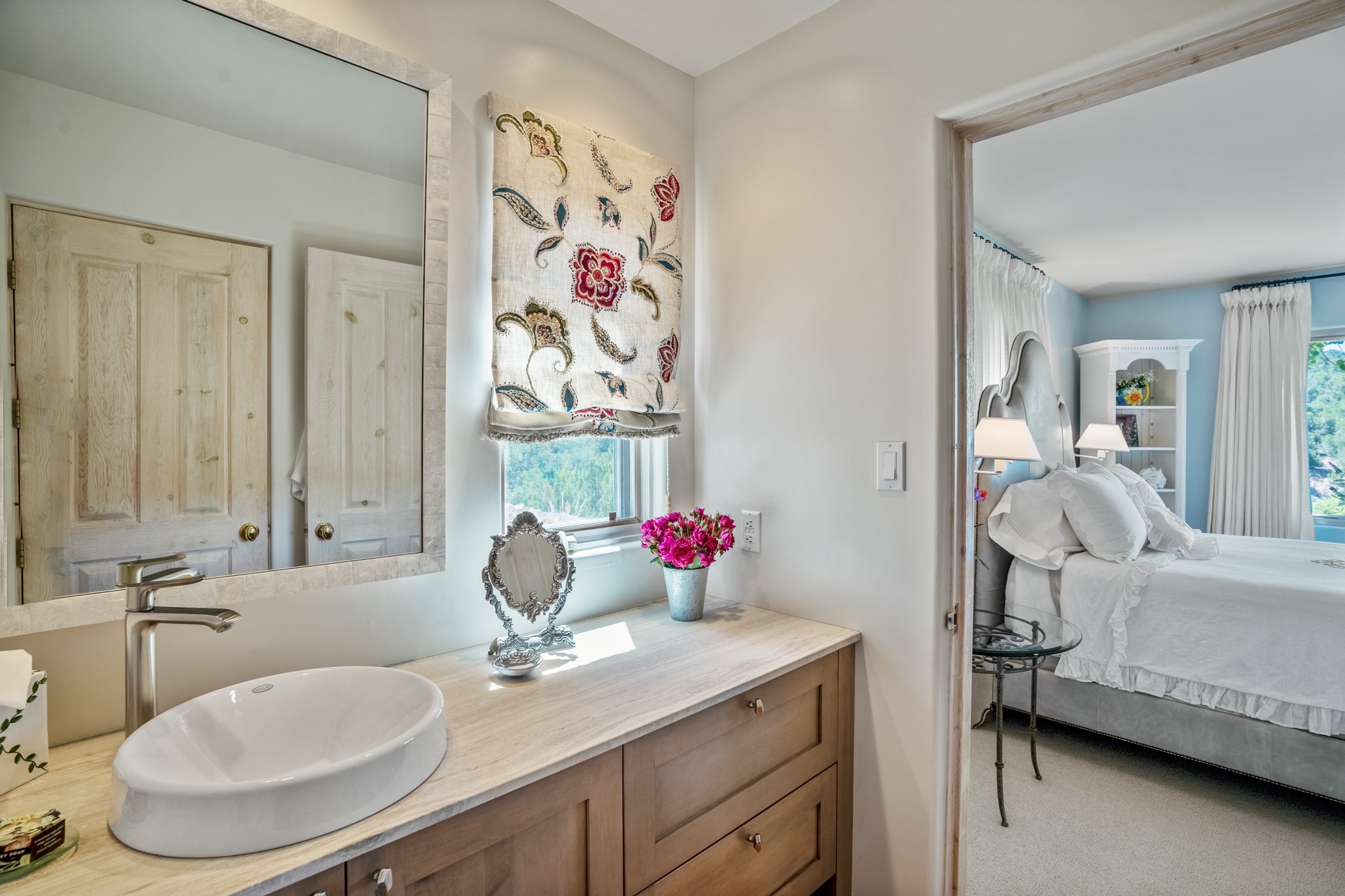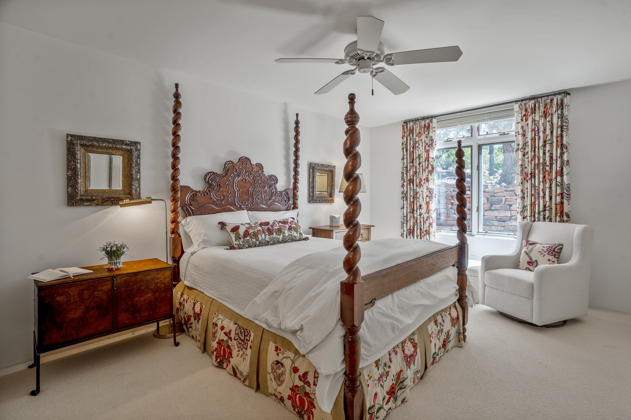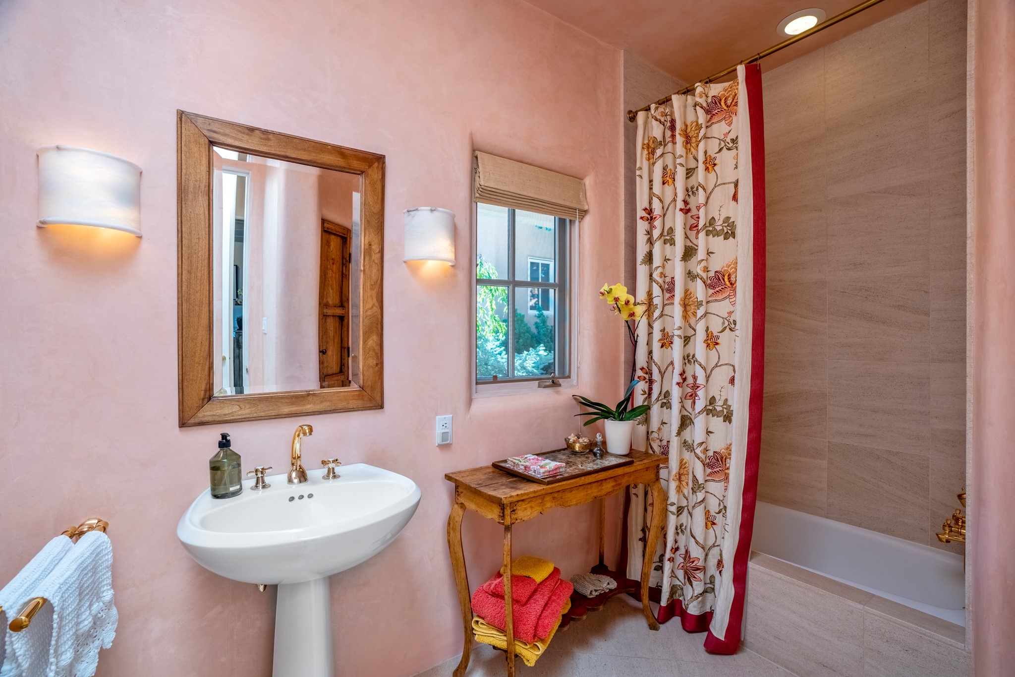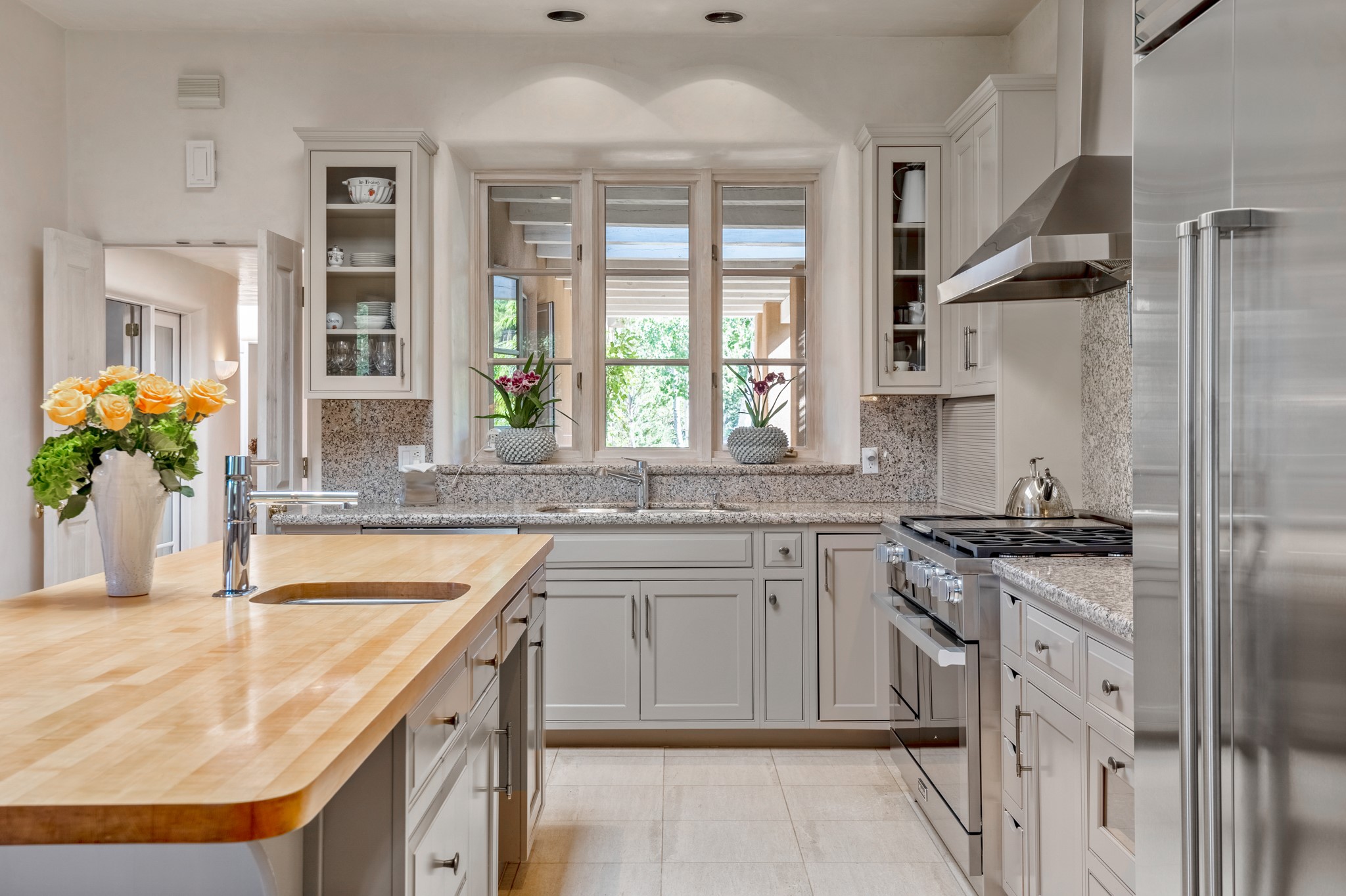 Perched in the hills above the Santa Fe Plaza, this timeless masterpiece with panoramic views of the town was expertly built in the 1990s by Jim Satzinger and flawlessly polished by the discerning eye of the interior designer who called it home. The mostly single level, +/- 3500 square foot floor plan is sited at the rear of a cul-de-sac parcel that looks much larger and feels much more private than the acreage would imply. Its central living space is bookended by the owners' suite and personal office in the North wing, and the two guest bedroom suites in the South wing. With lushly landscaped surroundings and deep portals to lure you through the numerous French doors, it is not only the uninterrupted view that will captivate. Some of the features include polished French limestone floors, recently renovated custom cabinetry, mini-splits, custom solid doors throughout, Dornbracht plumbing fixtures, imported Turkish tile accents, beamed ceilings, gleaming plaster walls, numerous fireplaces to cozy up to, a heated driveway, and new roof in 2021 to round it out. A near endless list of refined finishes, high end appliances, and immaculate maintenance record are testament to the meticulous care this property has received. With a curated furniture package that is negotiable, this home is truly one-of-a-kind and completely move-in ready.
