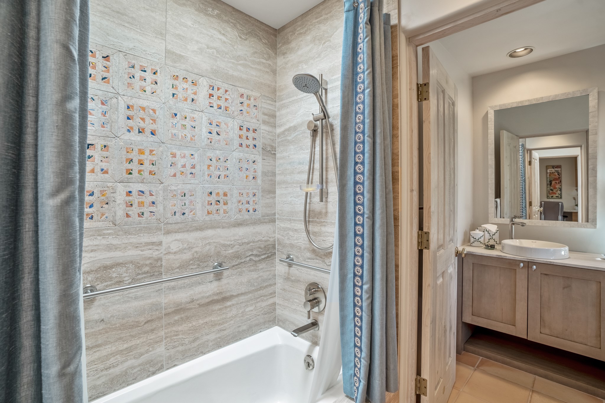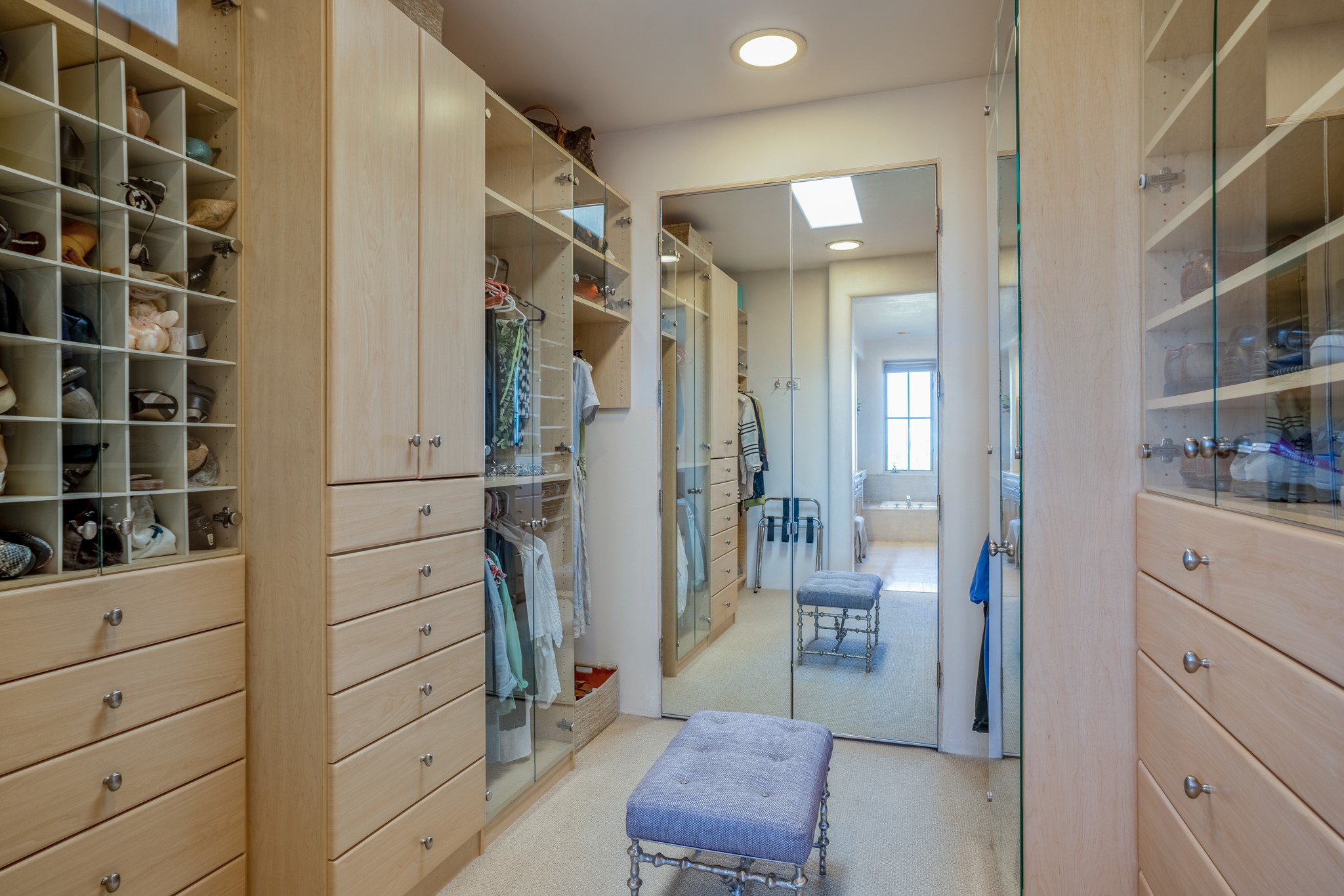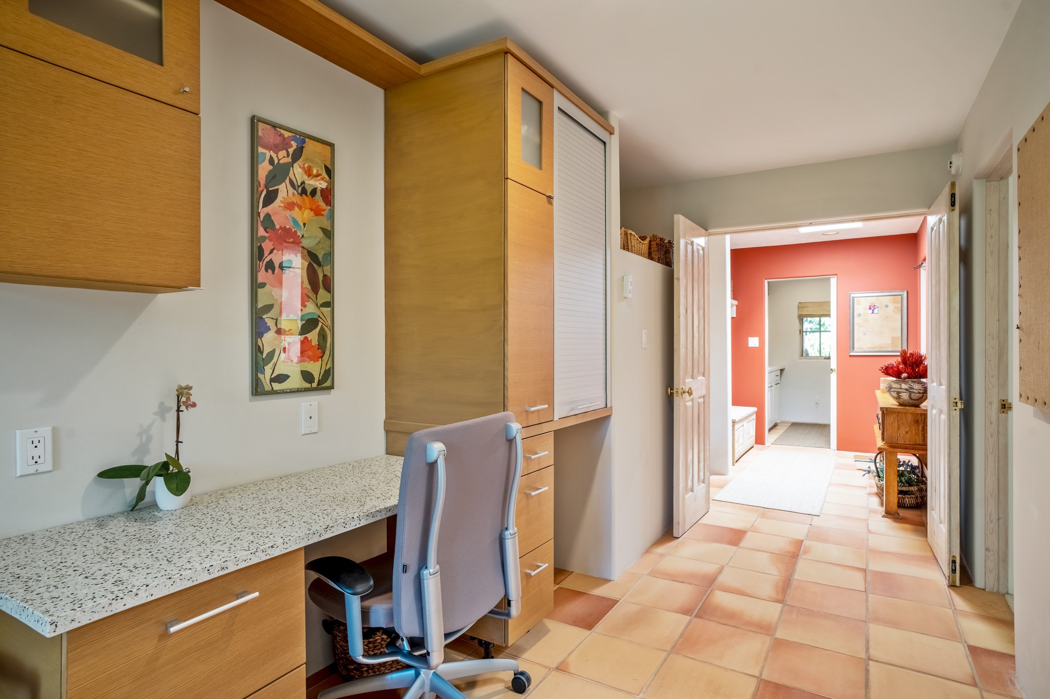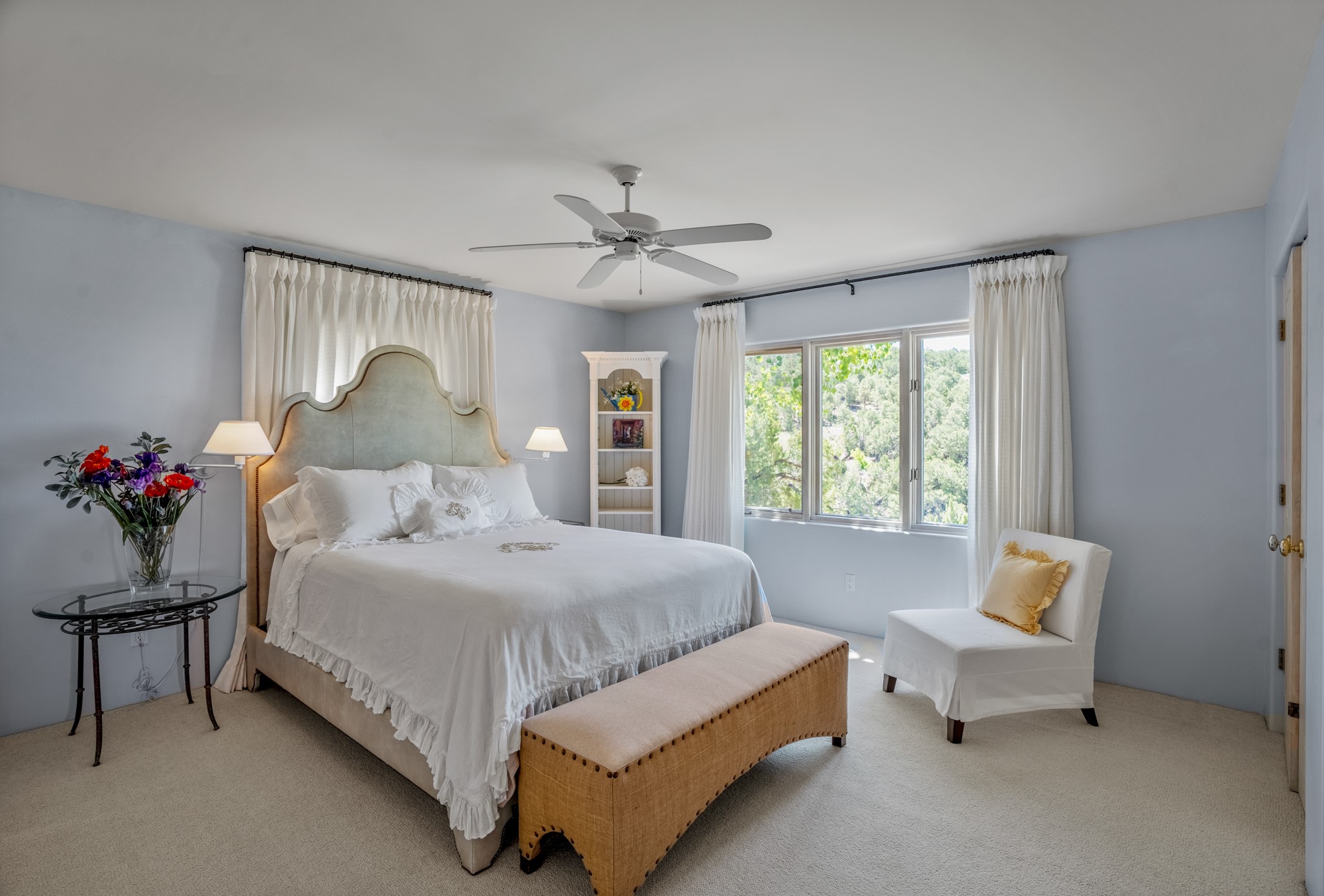 Perched in the hills above the Santa Fe Plaza, this timeless masterpiece with panoramic views of the town was expertly built in the 1990s by Jim Satzinger and flawlessly polished by the discerning eye of the interior designer who called it home. The mostly single level, +/- 3500 square foot floor plan is sited at the rear of a cul-de-sac parcel that looks much larger and feels much more private than the acreage would imply. Its central living space is bookended by the owners' suite and personal office in the North wing, and the two guest bedroom suites in the South wing. With lushly landscaped surroundings and deep portals to lure you through the numerous French doors, it is not only the uninterrupted view that will captivate. Some of the features include polished French limestone floors, recently renovated custom cabinetry, mini-splits, custom solid doors throughout, Dornbracht plumbing fixtures, imported Turkish tile accents, beamed ceilings, gleaming plaster walls, numerous fireplaces to cozy up to, a heated driveway, and new roof in 2021 to round it out. A near endless list of refined finishes, high end appliances, and immaculate maintenance record are testament to the meticulous care this property has received. With a curated furniture package that is negotiable, this home is truly one-of-a-kind and completely move-in ready.