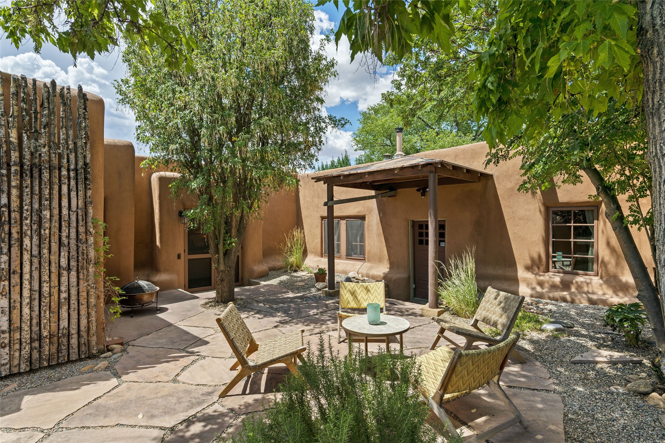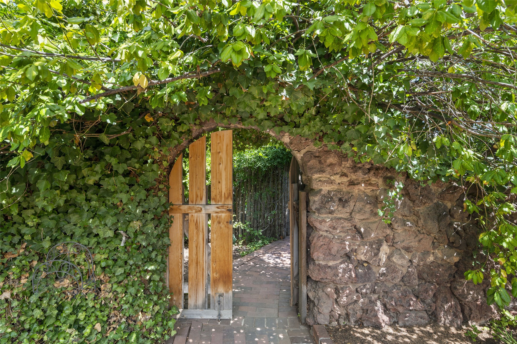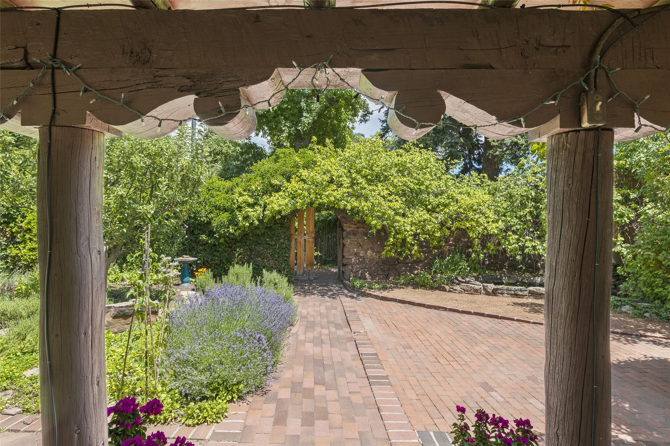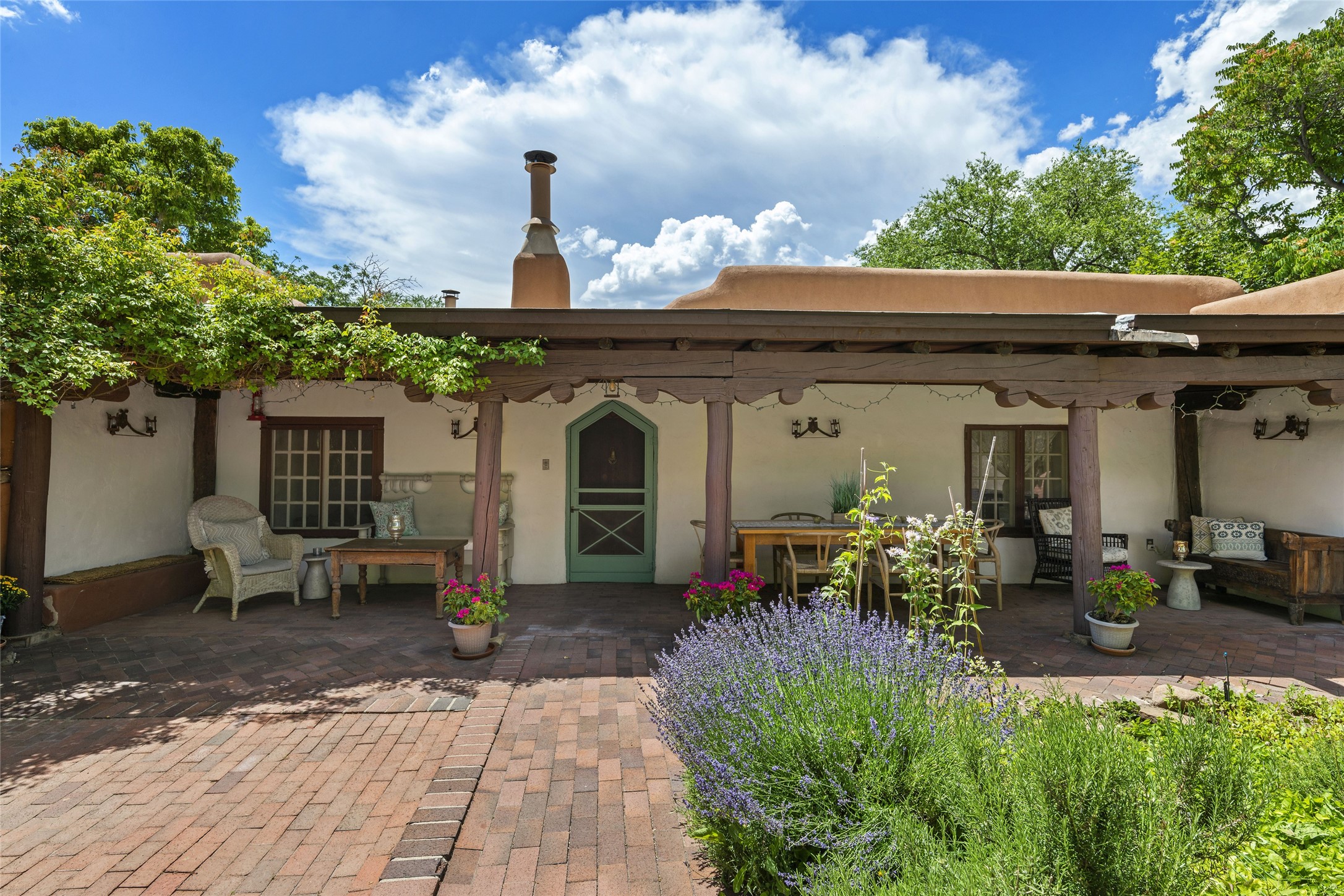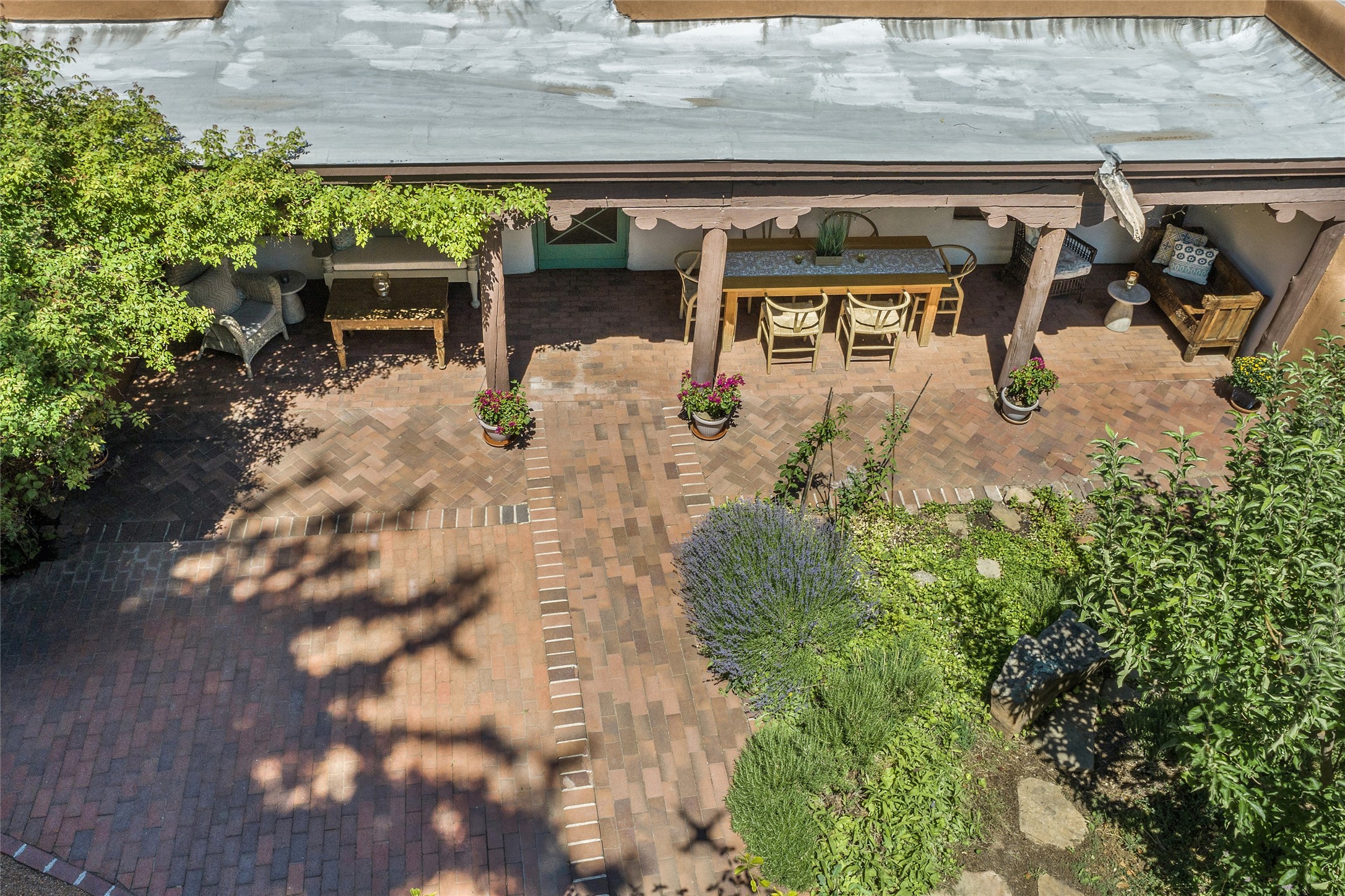 The Historically Significant "Boyle House", listed on the National Register of Historic Places as part of the Barrio de Analco historic district, appears on the earliest known map of Santa Fe, the Urrutia Map of 1767. Its charm features three foot thick adobe walls, hand peeled vigas dating to the 1720's covered with split cedar rajas and hand planed territorial style vigas, all carefully preserved over the centuries. The property is a quick walk to the Plaza, Canyon Road, and the Railyard. A private well provides irrigation for lush outdoor landscaping and patio areas, including fruit trees. The main house features two portals, three bedrooms, each with en-suite bathrooms, a spacious living room, an updated "farm kitchen" with new appliances, laundry room, and a garage. Included is an attached 2-bedroom, 1 bath apartment with garage and an additional two story, 1 bedroom, 1 bath studio. BCD zoning and separate metering of all three units allows for greater flexibility. The current owners were given an award for historic stewardship by the Historic Santa Fe Foundation in 2019. New research suggests the house belonged to Bernadino Sena, a renowned blacksmith, landowner, and fundraiser for San Miguel church in the 1700's. Based upon archeological findings, some portions of the house may possibly date before the Pueblo Revolt of 1680. For the historical purist this is a unique opportunity to become a steward of an early part of Santa Fe's history, and to sustain and preserve this historic house now and into the future..