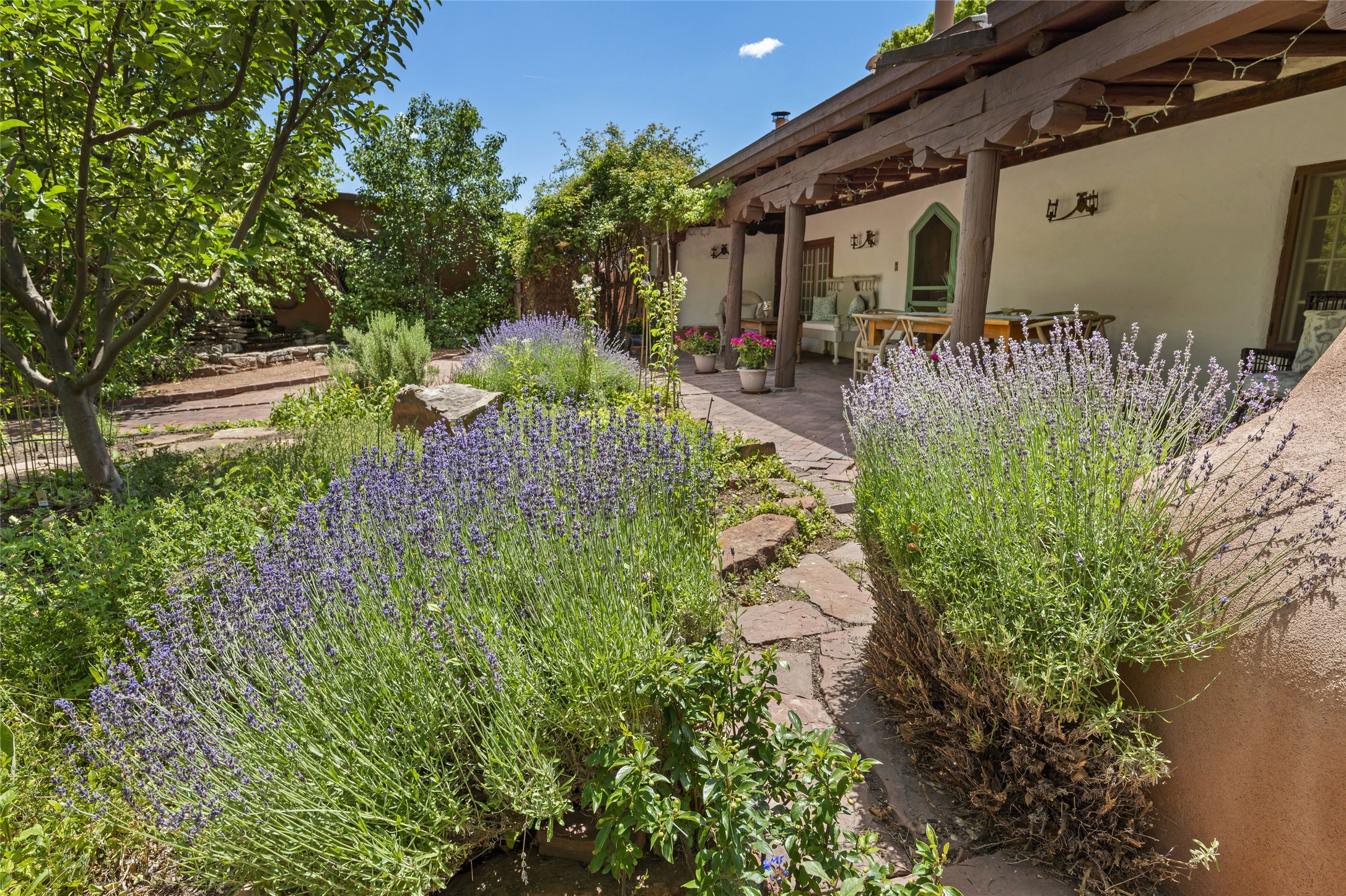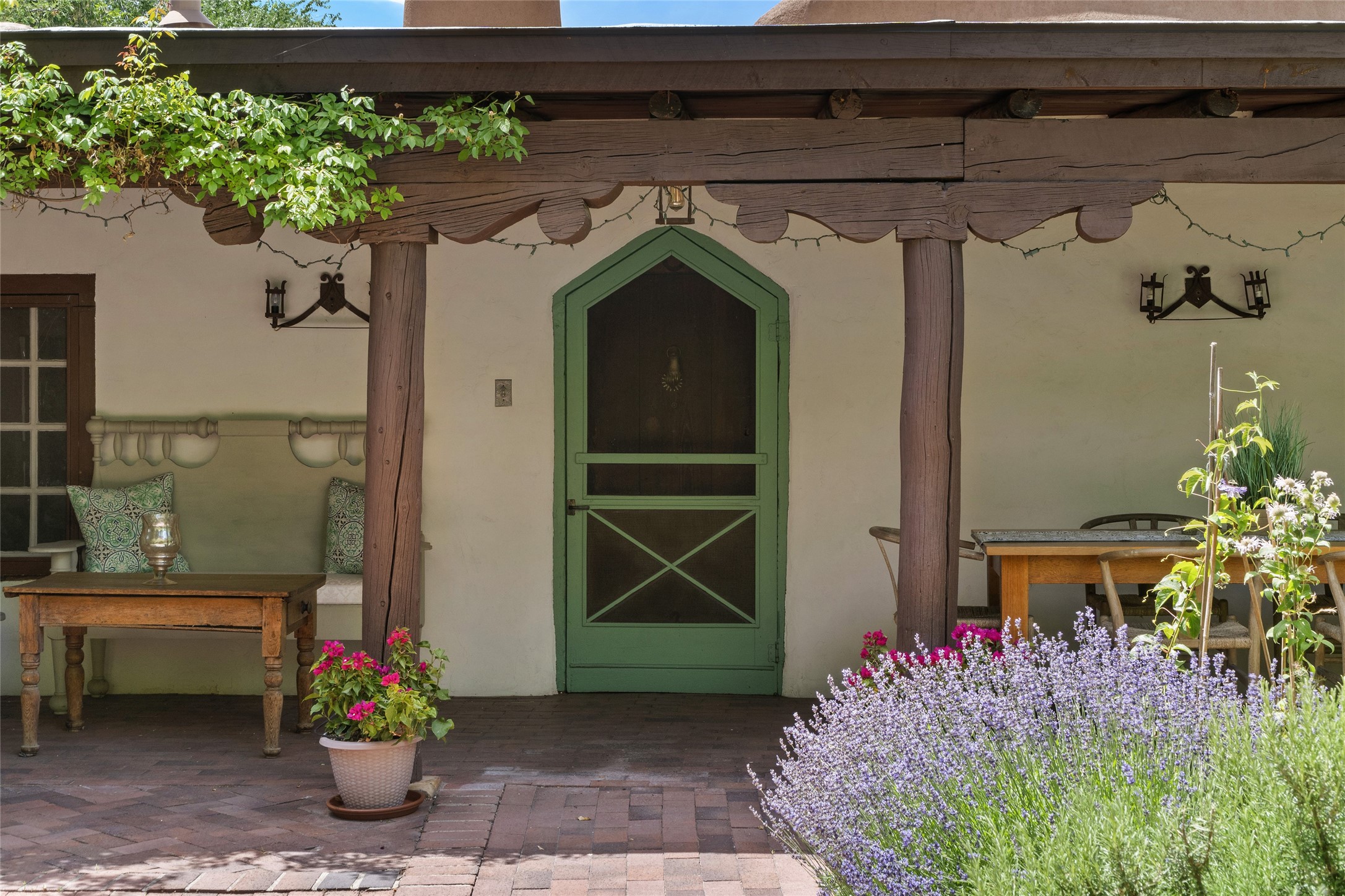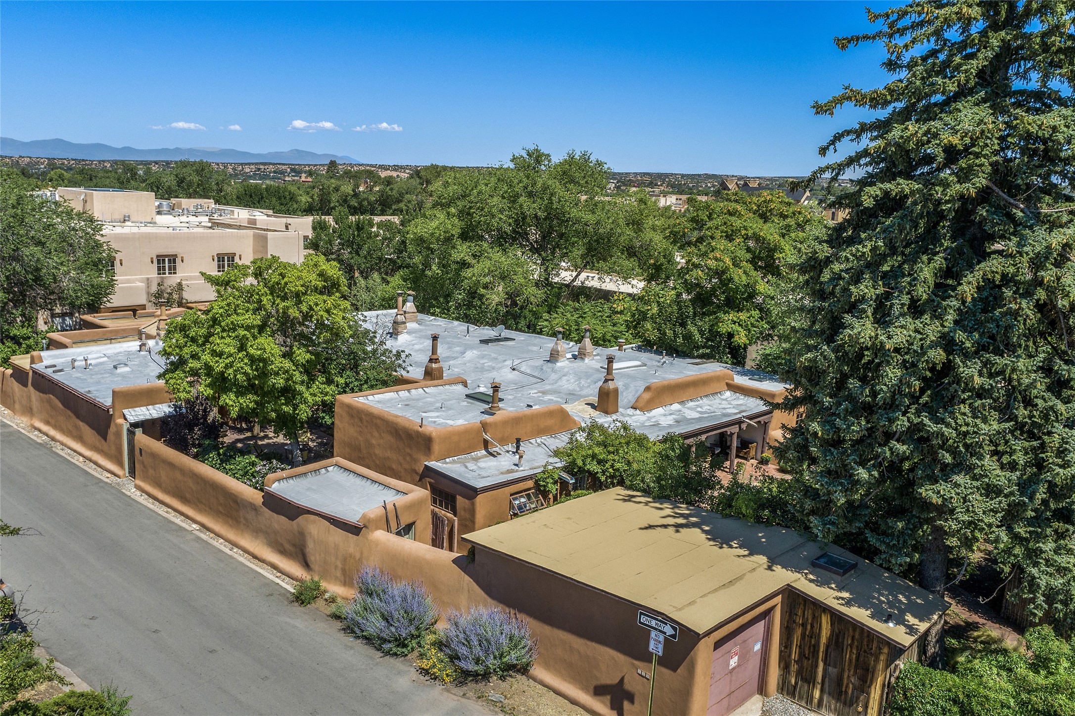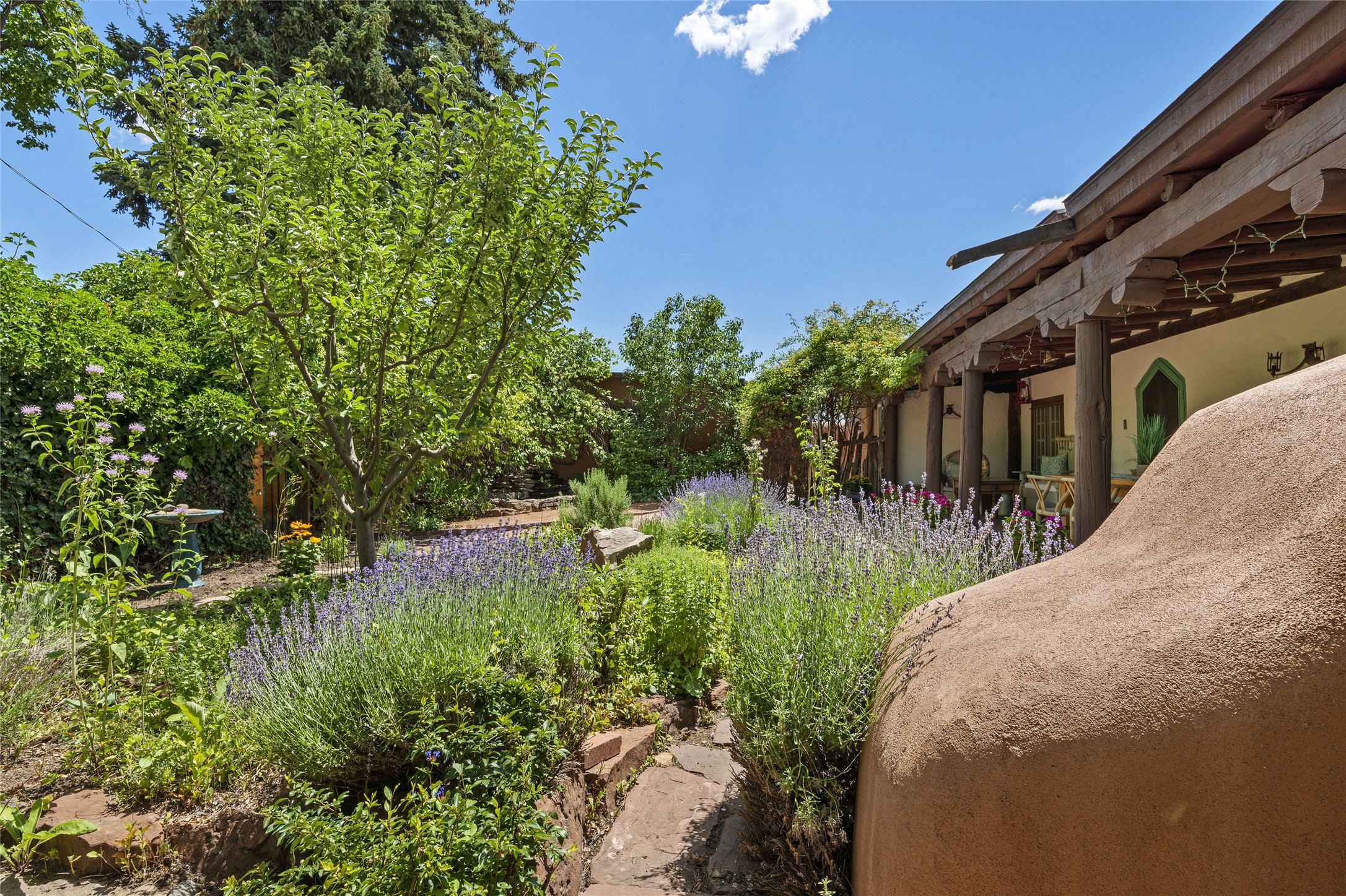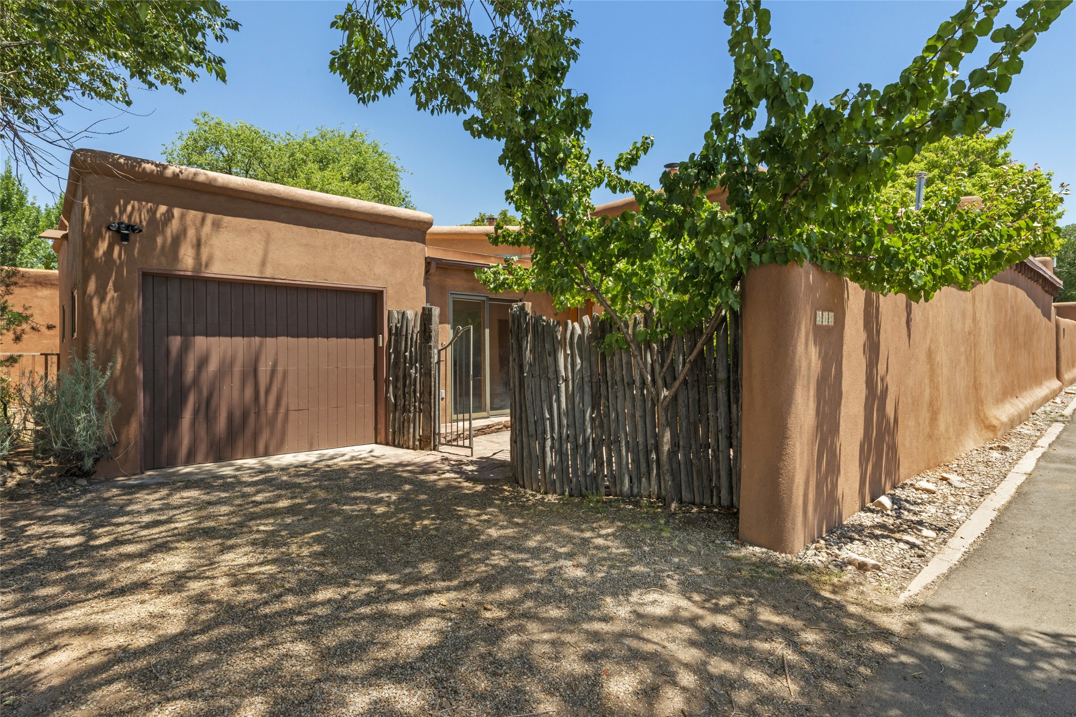 The Historically Significant "Boyle House", listed on the National Register of Historic Places as part of the Barrio de Analco historic district, appears on the earliest known map of Santa Fe, the Urrutia Map of 1767. Its charm features three foot thick adobe walls, hand peeled vigas dating to the 1720's covered with split cedar rajas and hand planed territorial style vigas, all carefully preserved over the centuries. The property is a quick walk to the Plaza, Canyon Road, and the Railyard. A private well provides irrigation for lush outdoor landscaping and patio areas, including fruit trees. The main house features two portals, three bedrooms, each with en-suite bathrooms, a spacious living room, an updated "farm kitchen" with new appliances, laundry room, and a garage. Included is an attached 2-bedroom, 1 bath apartment with garage and an additional two story, 1 bedroom, 1 bath studio. BCD zoning and separate metering of all three units allows for greater flexibility. The current owners were given an award for historic stewardship by the Historic Santa Fe Foundation in 2019. New research suggests the house belonged to Bernadino Sena, a renowned blacksmith, landowner, and fundraiser for San Miguel church in the 1700's. Based upon archeological findings, some portions of the house may possibly date before the Pueblo Revolt of 1680. For the historical purist this is a unique opportunity to become a steward of an early part of Santa Fe's history, and to sustain and preserve this historic house now and into the future..