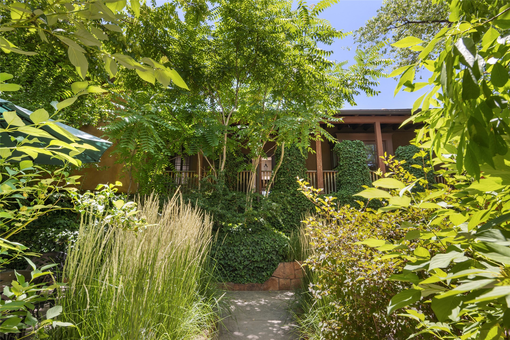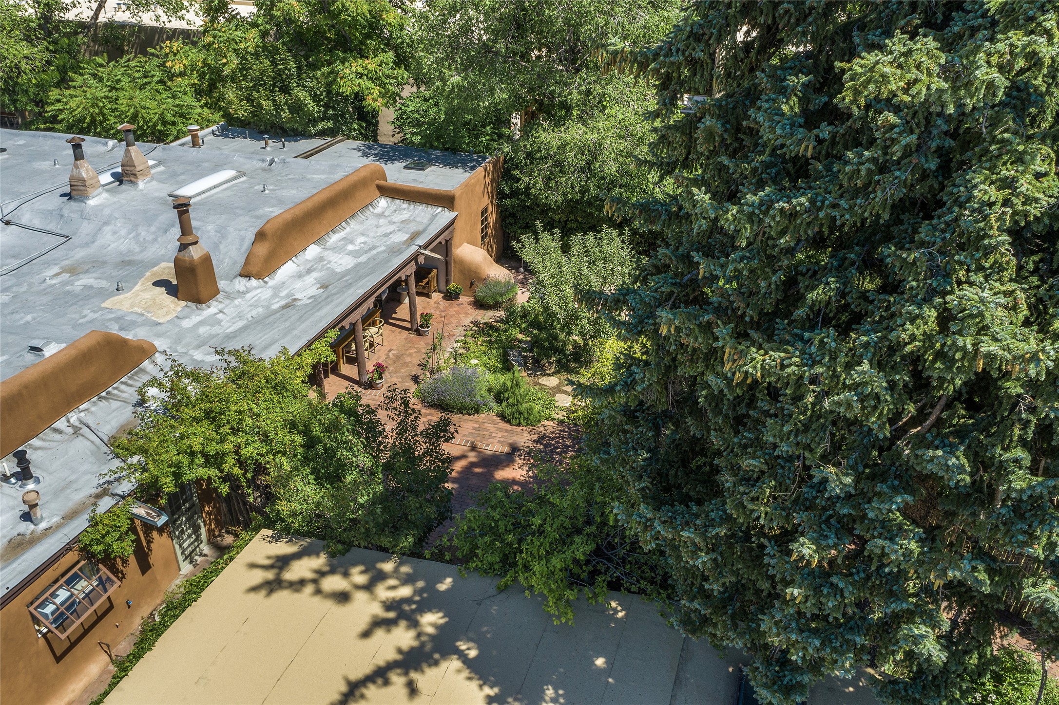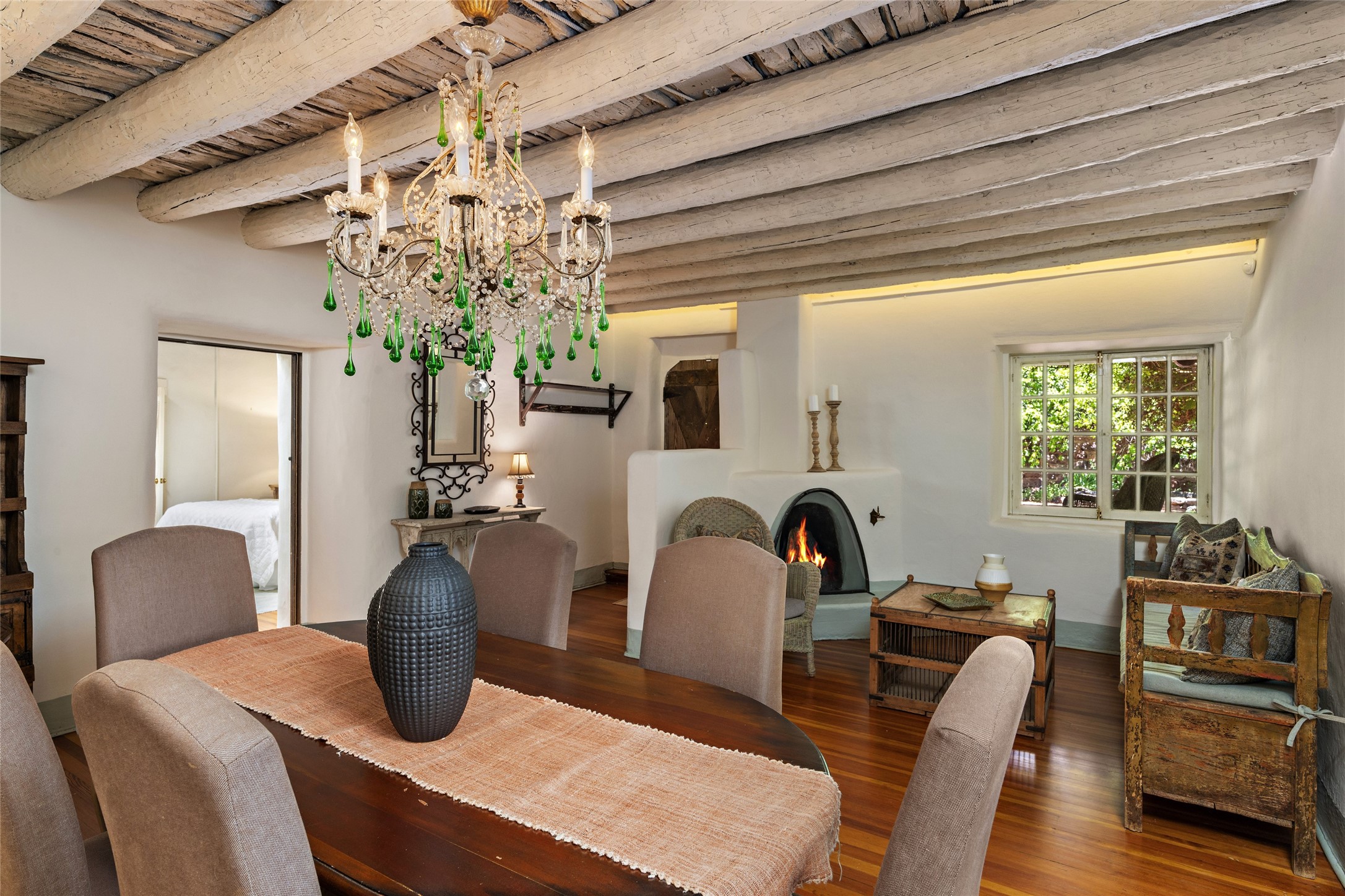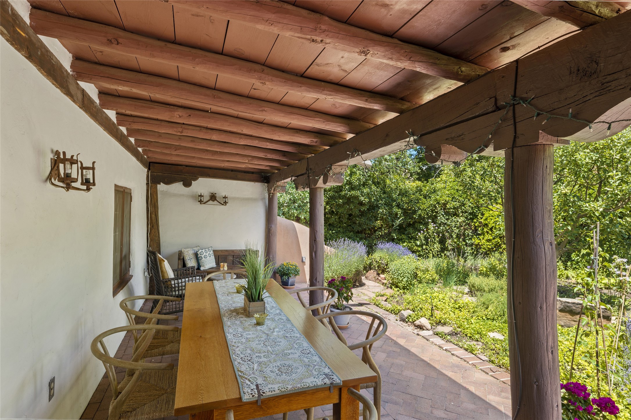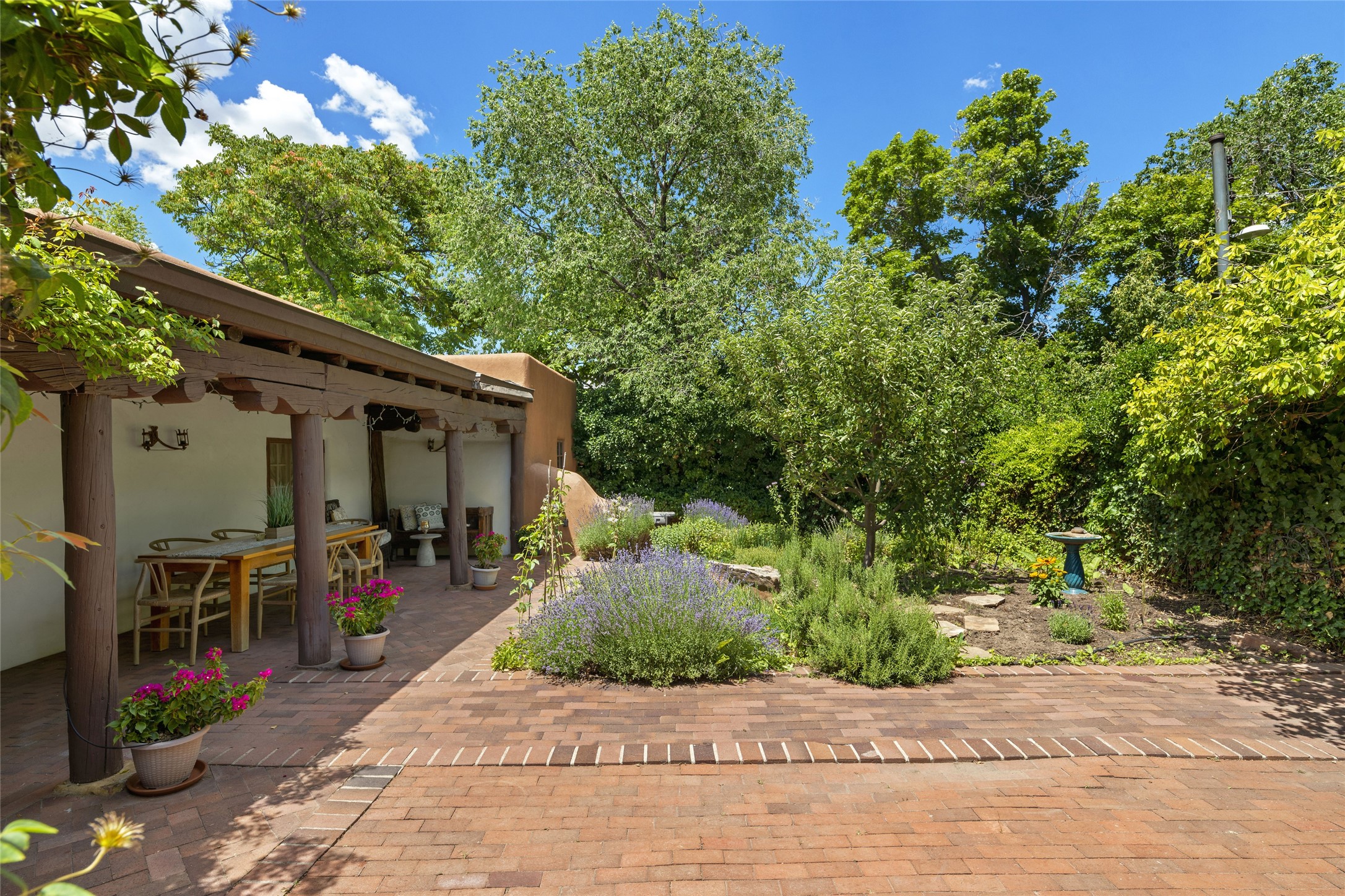 The Historically Significant "Boyle House", listed on the National Register of Historic Places as part of the Barrio de Analco historic district, appears on the earliest known map of Santa Fe, the Urrutia Map of 1767. Its charm features three foot thick adobe walls, hand peeled vigas dating to the 1720's covered with split cedar rajas and hand planed territorial style vigas, all carefully preserved over the centuries. The property is a quick walk to the Plaza, Canyon Road, and the Railyard. A private well provides irrigation for lush outdoor landscaping and patio areas, including fruit trees. The main house features two portals, three bedrooms, each with en-suite bathrooms, a spacious living room, an updated "farm kitchen" with new appliances, laundry room, and a garage. Included is an attached 2-bedroom, 1 bath apartment with garage and an additional two story, 1 bedroom, 1 bath studio. BCD zoning and separate metering of all three units allows for greater flexibility. The current owners were given an award for historic stewardship by the Historic Santa Fe Foundation in 2019. New research suggests the house belonged to Bernadino Sena, a renowned blacksmith, landowner, and fundraiser for San Miguel church in the 1700's. Based upon archeological findings, some portions of the house may possibly date before the Pueblo Revolt of 1680. For the historical purist this is a unique opportunity to become a steward of an early part of Santa Fe's history, and to sustain and preserve this historic house now and into the future..