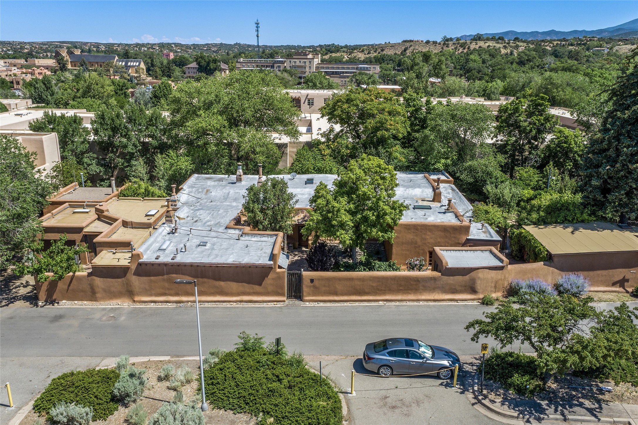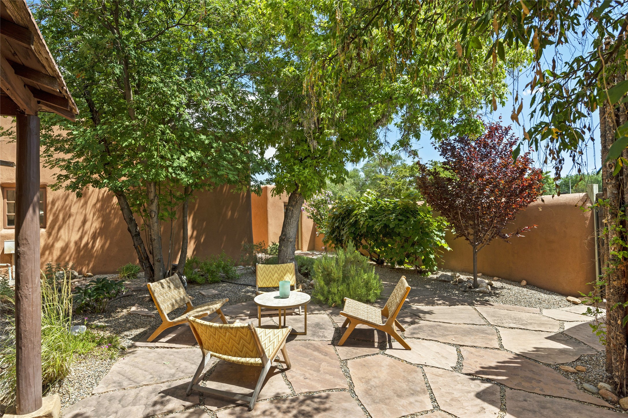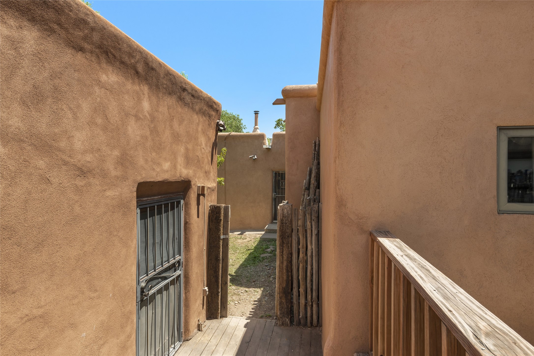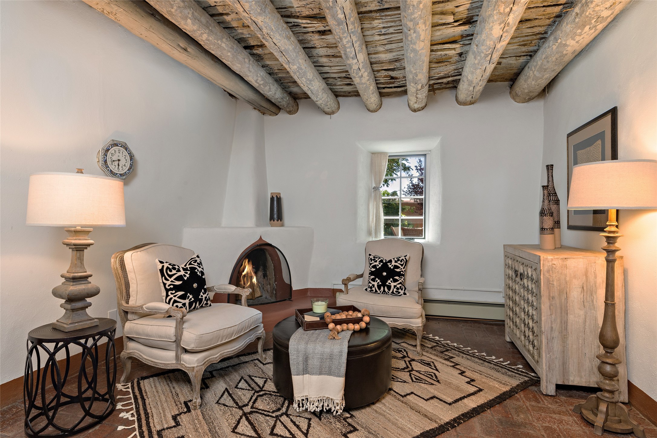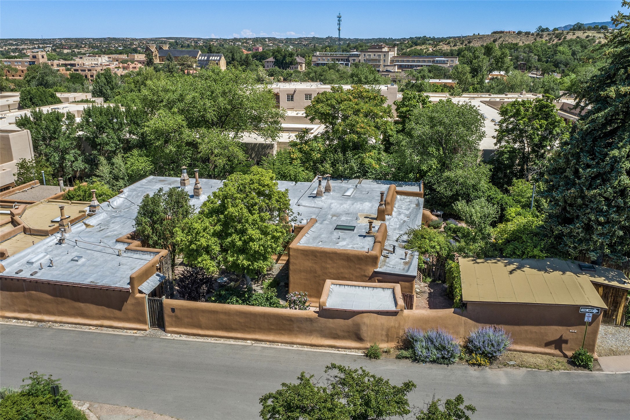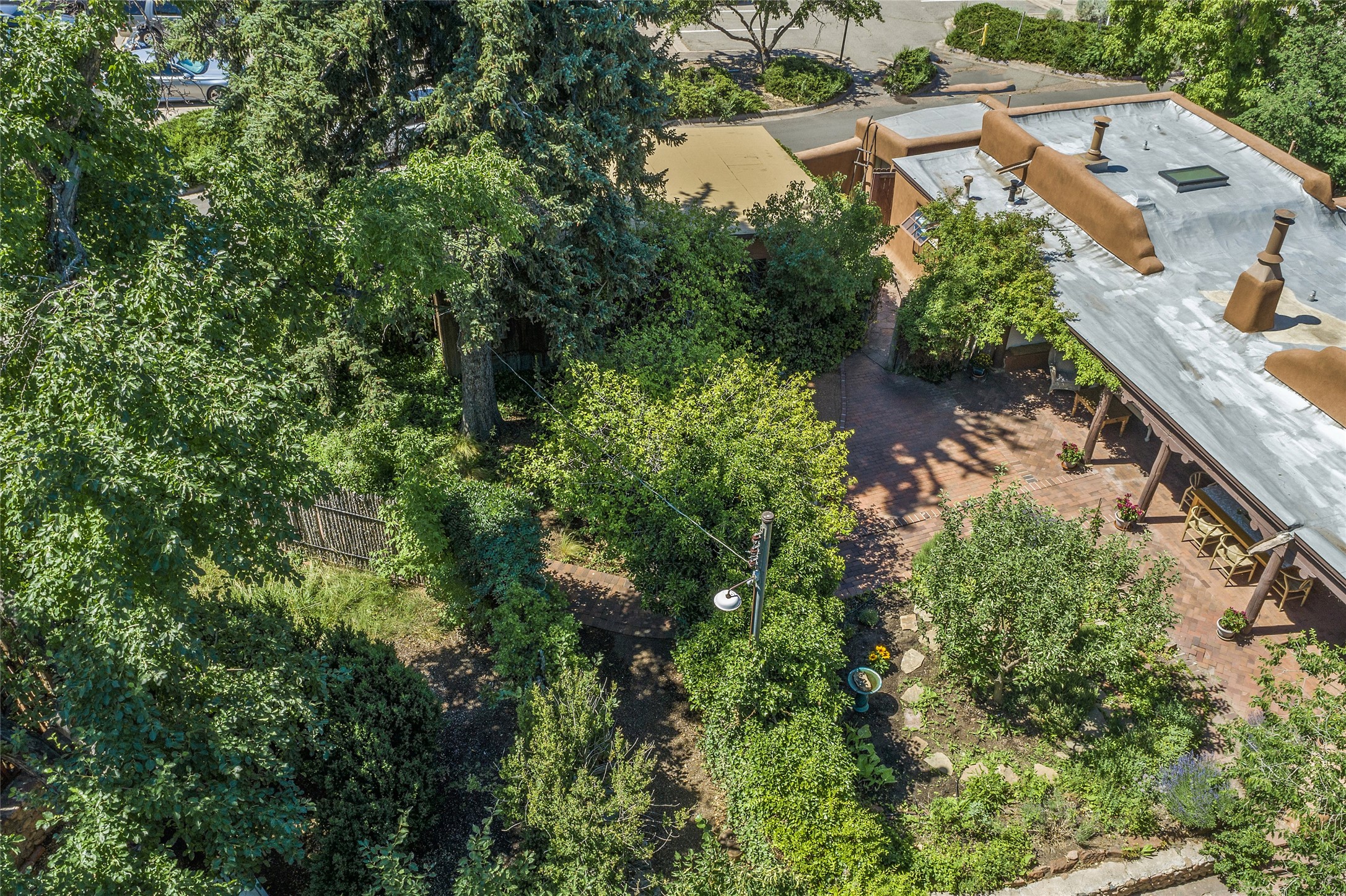The Historically Significant "Boyle House", listed on the National Register of Historic Places as part of the Barrio de Analco historic district, appears on the earliest known map of Santa Fe, the Urrutia Map of 1767. Its charm features three foot thick adobe walls, hand peeled vigas dating to the 1720's covered with split cedar rajas and hand planed territorial style vigas, all carefully preserved over the centuries. The property is a quick walk to the Plaza, Canyon Road, and the Railyard. A private well provides irrigation for lush outdoor landscaping and patio areas, including fruit trees. The main house features two portals, three bedrooms, each with en-suite bathrooms, a spacious living room, an updated "farm kitchen" with new appliances, laundry room, and a garage. Included is an attached 2-bedroom, 1 bath apartment with garage and an additional two story, 1 bedroom, 1 bath studio. BCD zoning and separate metering of all three units allows for greater flexibility. The current owners were given an award for historic stewardship by the Historic Santa Fe Foundation in 2019. New research suggests the house belonged to Bernadino Sena, a renowned blacksmith, landowner, and fundraiser for San Miguel church in the 1700's. Based upon archeological findings, some portions of the house may possibly date before the Pueblo Revolt of 1680. For the historical purist this is a unique opportunity to become a steward of an early part of Santa Fe's history, and to sustain and preserve this historic house now and into the future..