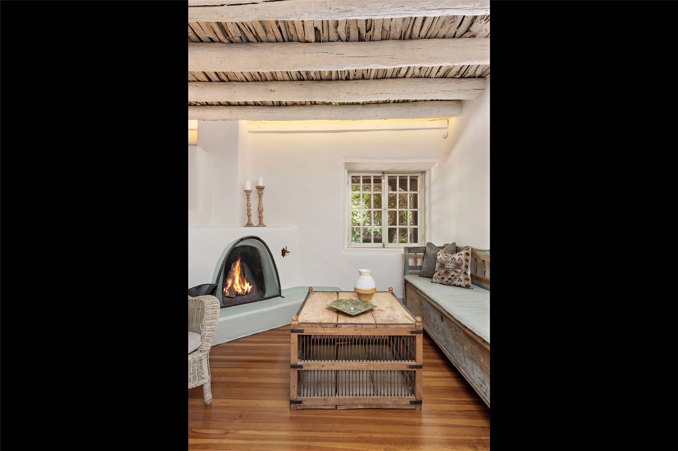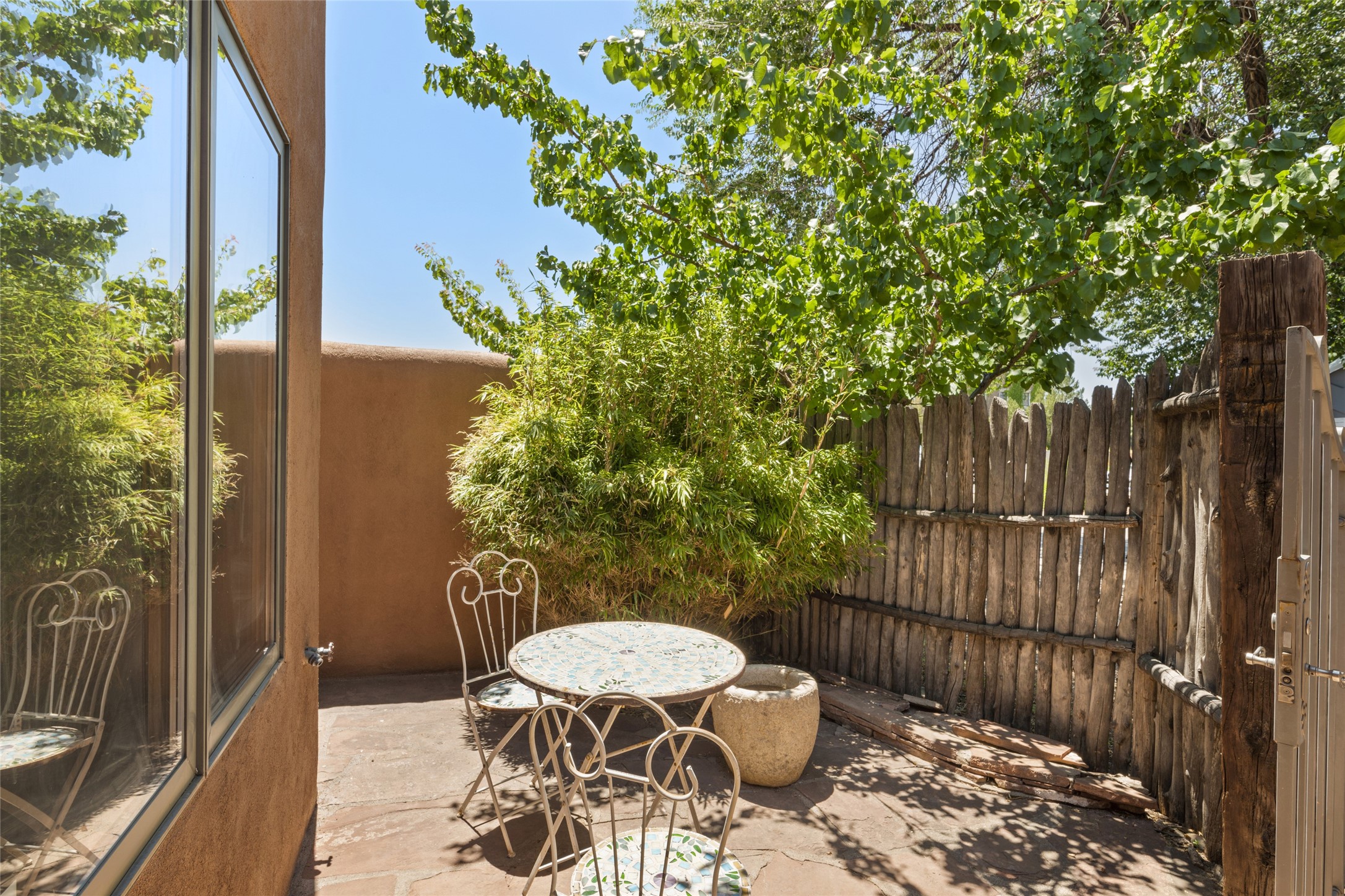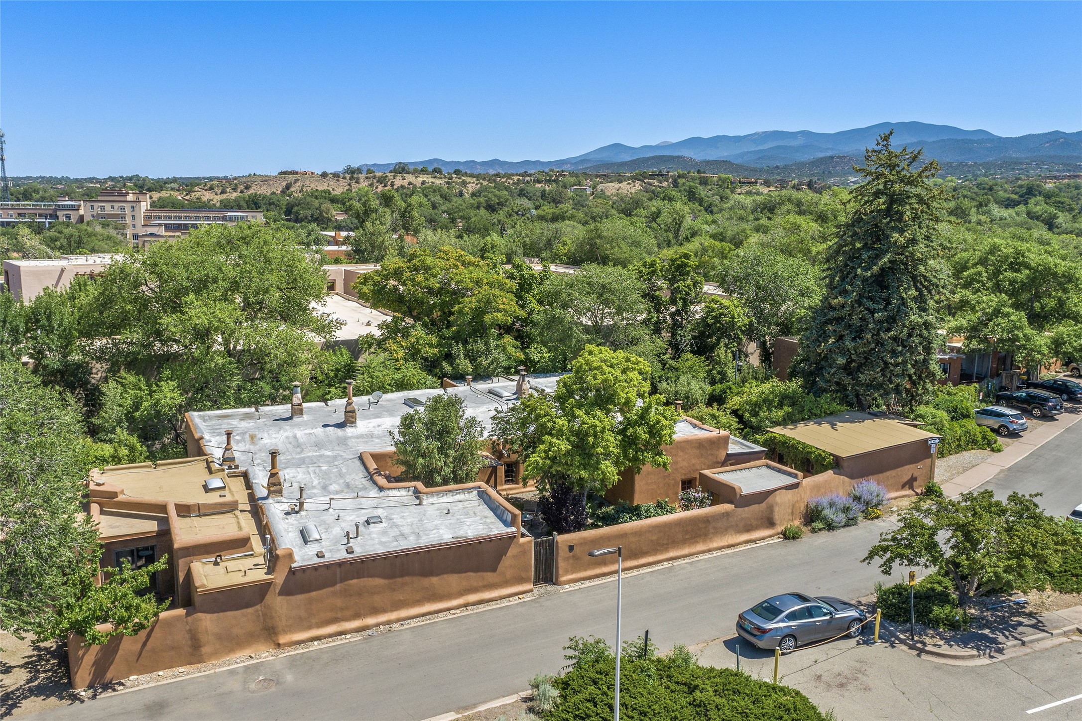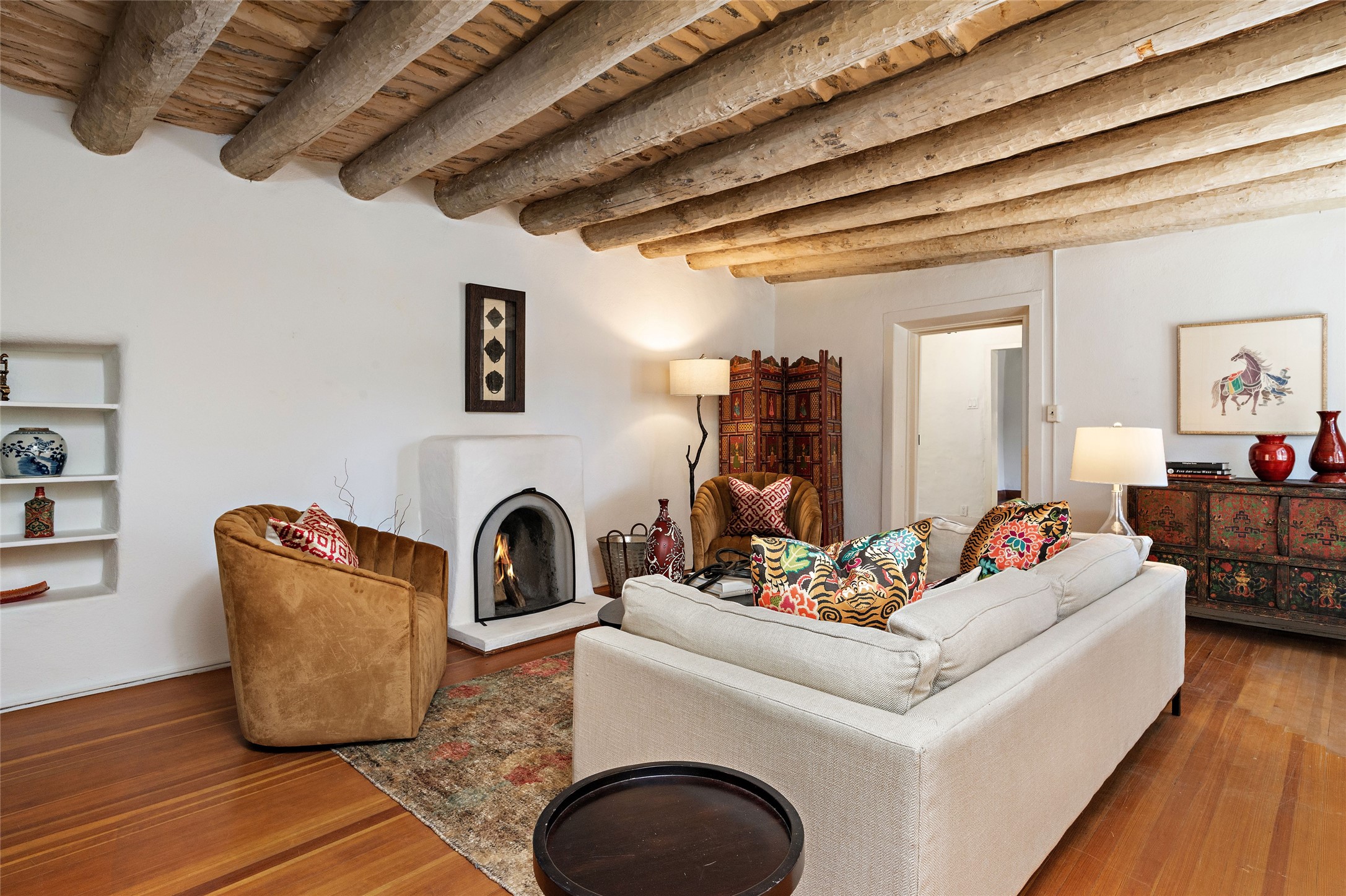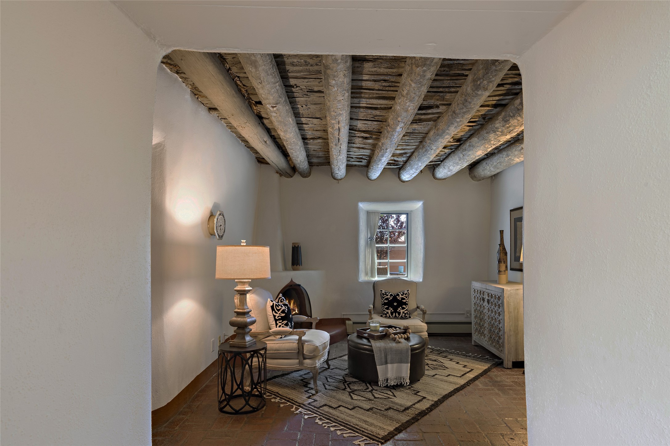 The Historically Significant "Boyle House", listed on the National Register of Historic Places as part of the Barrio de Analco historic district, appears on the earliest known map of Santa Fe, the Urrutia Map of 1767. Its charm features three foot thick adobe walls, hand peeled vigas dating to the 1720's covered with split cedar rajas and hand planed territorial style vigas, all carefully preserved over the centuries. The property is a quick walk to the Plaza, Canyon Road, and the Railyard. A private well provides irrigation for lush outdoor landscaping and patio areas, including fruit trees. The main house features two portals, three bedrooms, each with en-suite bathrooms, a spacious living room, an updated "farm kitchen" with new appliances, laundry room, and a garage. Included is an attached 2-bedroom, 1 bath apartment with garage and an additional two story, 1 bedroom, 1 bath studio. BCD zoning and separate metering of all three units allows for greater flexibility. The current owners were given an award for historic stewardship by the Historic Santa Fe Foundation in 2019. New research suggests the house belonged to Bernadino Sena, a renowned blacksmith, landowner, and fundraiser for San Miguel church in the 1700's. Based upon archeological findings, some portions of the house may possibly date before the Pueblo Revolt of 1680. For the historical purist this is a unique opportunity to become a steward of an early part of Santa Fe's history, and to sustain and preserve this historic house now and into the future..