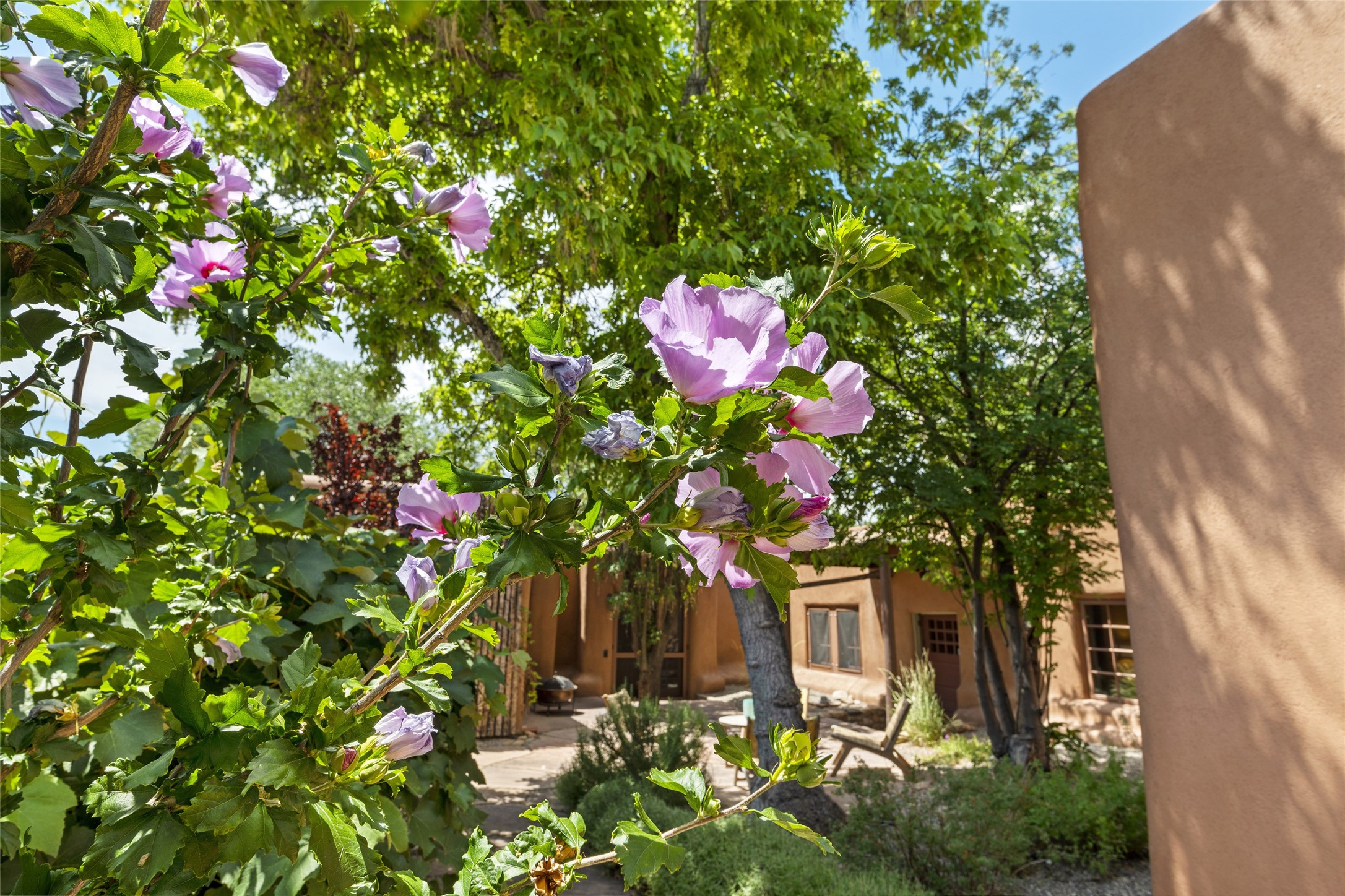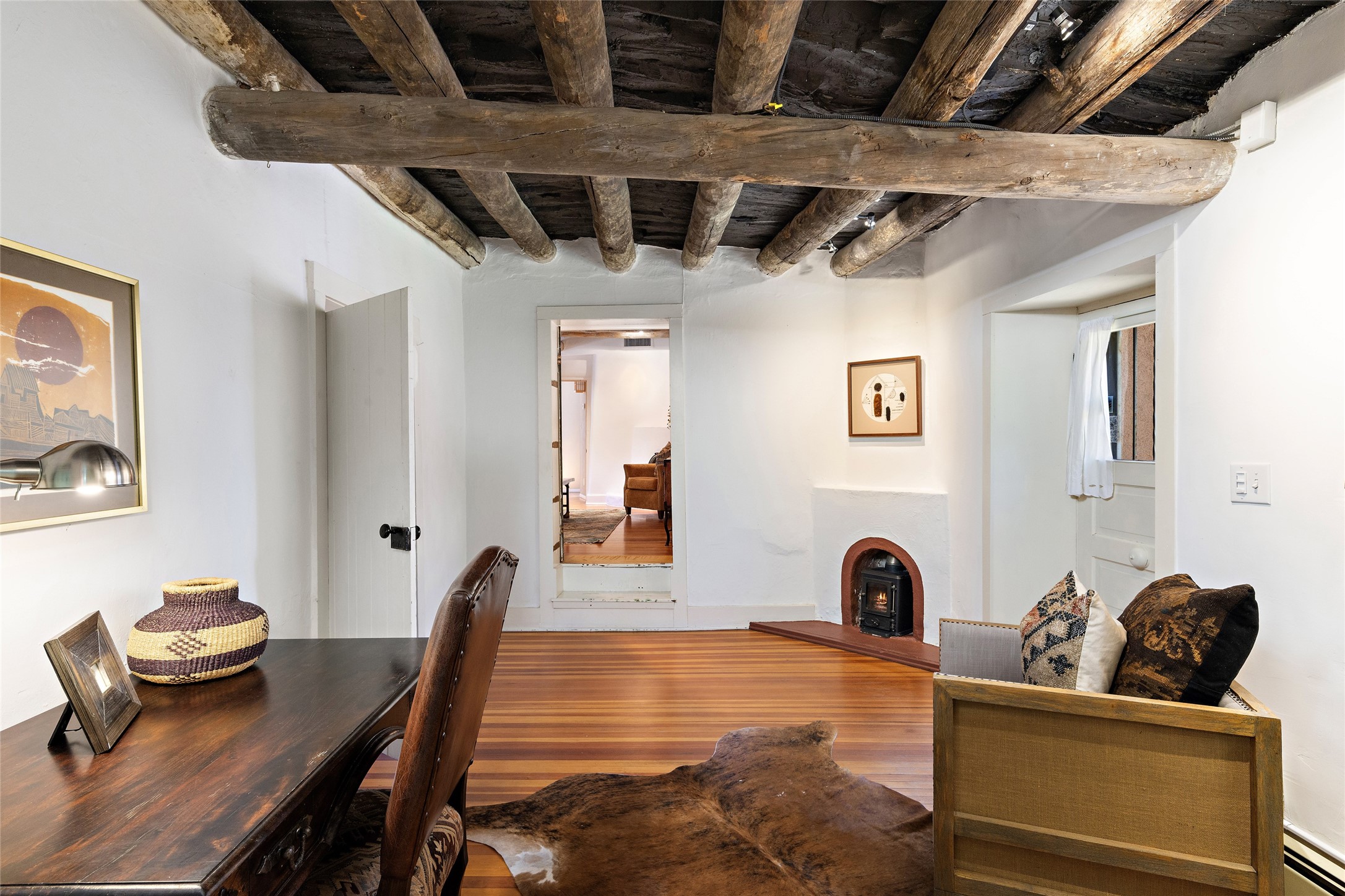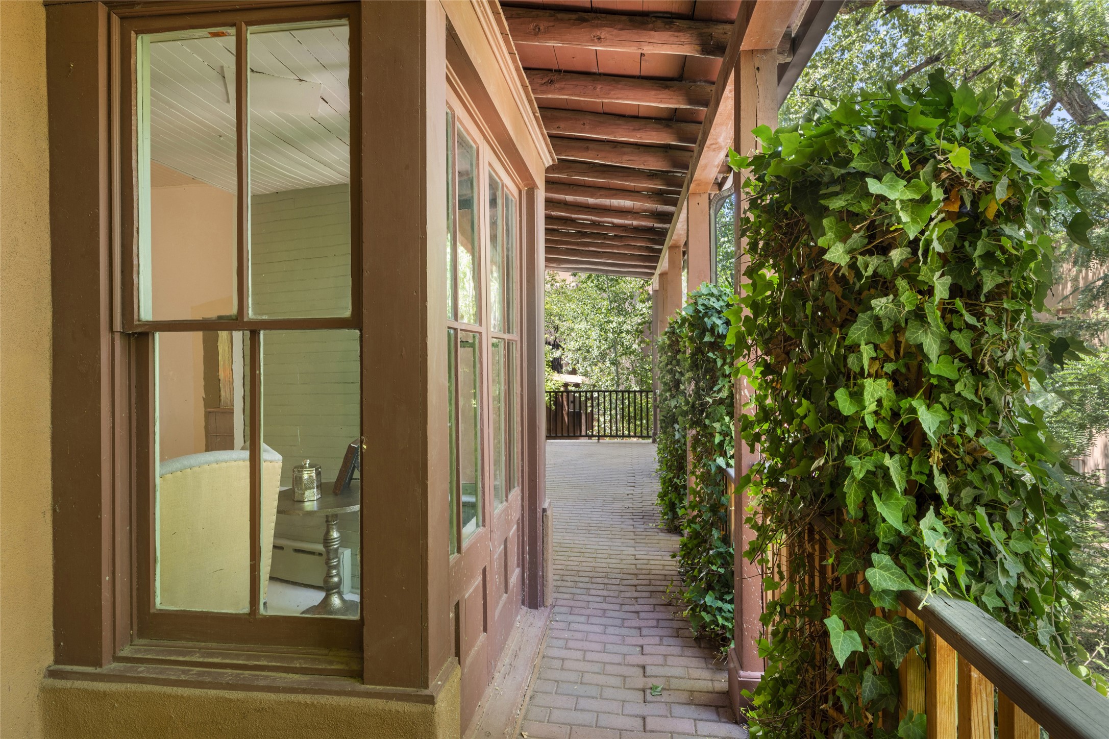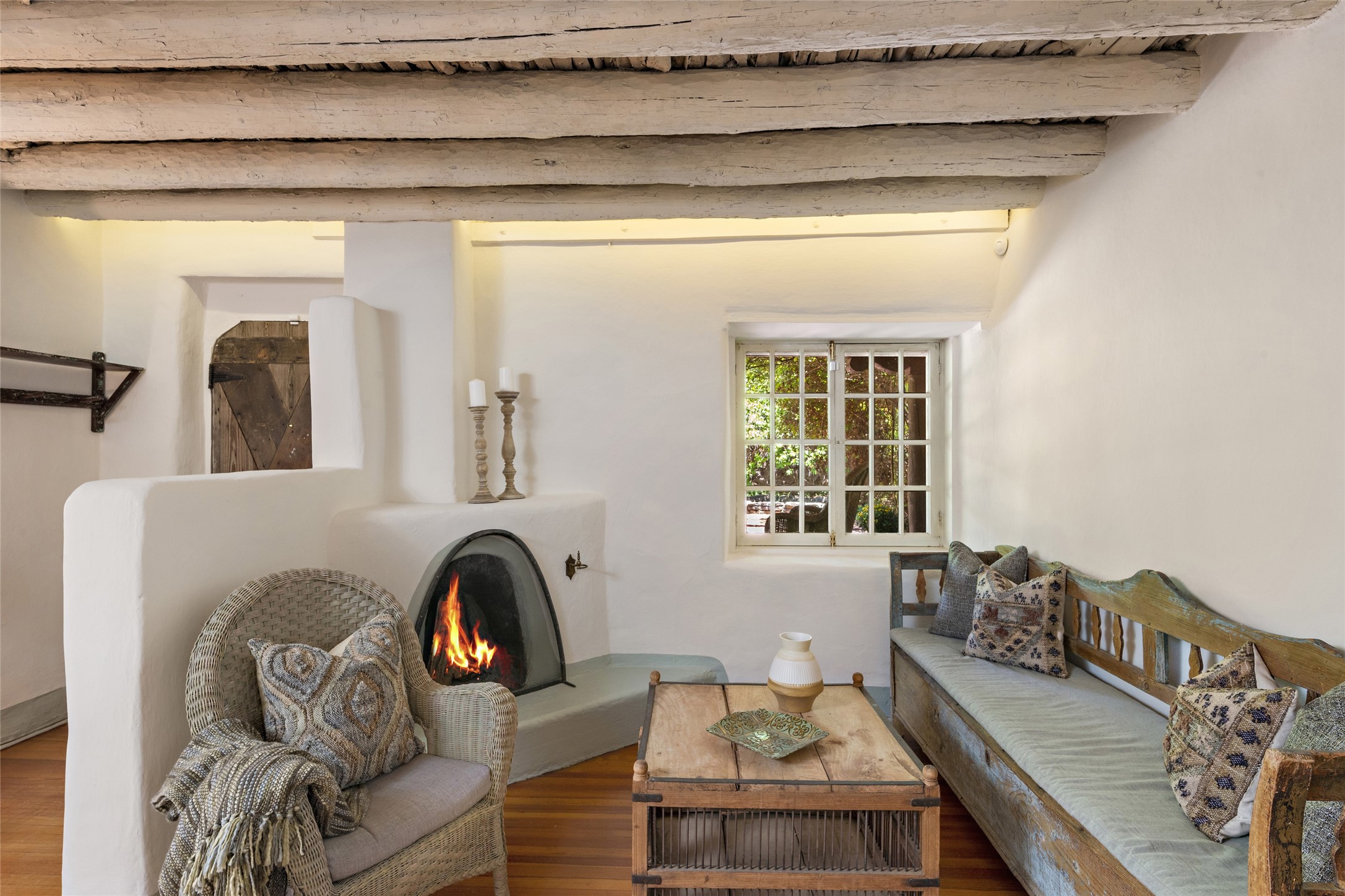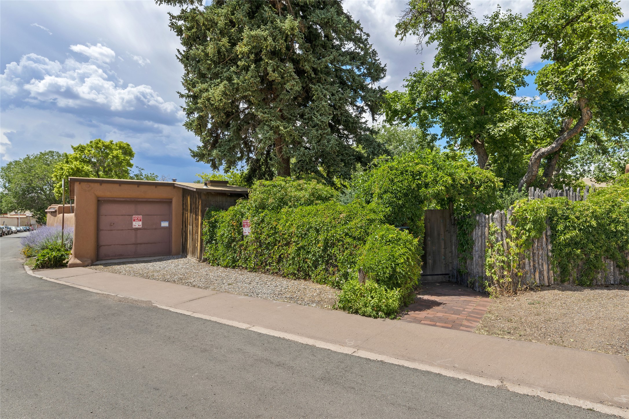 The Historically Significant "Boyle House", listed on the National Register of Historic Places as part of the Barrio de Analco historic district, appears on the earliest known map of Santa Fe, the Urrutia Map of 1767. Its charm features three foot thick adobe walls, hand peeled vigas dating to the 1720's covered with split cedar rajas and hand planed territorial style vigas, all carefully preserved over the centuries. The property is a quick walk to the Plaza, Canyon Road, and the Railyard. A private well provides irrigation for lush outdoor landscaping and patio areas, including fruit trees. The main house features two portals, three bedrooms, each with en-suite bathrooms, a spacious living room, an updated "farm kitchen" with new appliances, laundry room, and a garage. Included is an attached 2-bedroom, 1 bath apartment with garage and an additional two story, 1 bedroom, 1 bath studio. BCD zoning and separate metering of all three units allows for greater flexibility. The current owners were given an award for historic stewardship by the Historic Santa Fe Foundation in 2019. New research suggests the house belonged to Bernadino Sena, a renowned blacksmith, landowner, and fundraiser for San Miguel church in the 1700's. Based upon archeological findings, some portions of the house may possibly date before the Pueblo Revolt of 1680. For the historical purist this is a unique opportunity to become a steward of an early part of Santa Fe's history, and to sustain and preserve this historic house now and into the future..